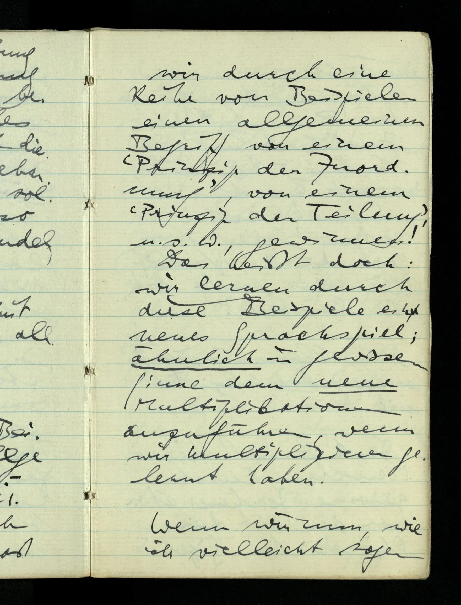 07.01.1943 Aber es ist doch kein Zweifel, daß wir durch eine Reihe von Beispielen einen allgemeinen Begriff von einem ‘Prinzip der Zuordnung’, von einem ‘Prinzip der Teilung’, u.s.w., gewinnen! Das heißt doch: wir lernen durch diese Beispiele ein neues Sprachspiel; ähnlich in gewissem Sinne dem neue Multiplikationen auszuführen, wenn wir multiplizieren gelernt haben.
