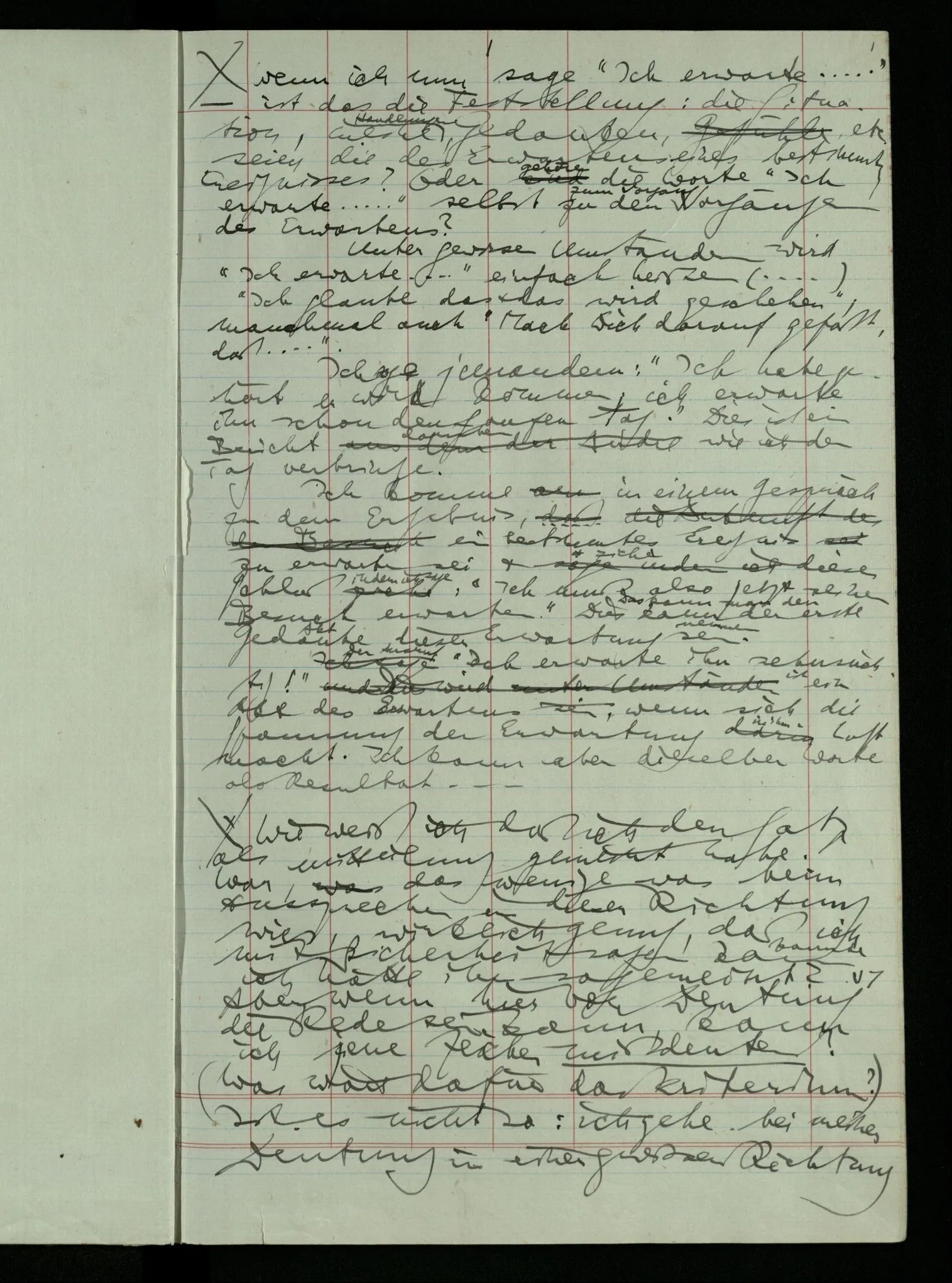 Wenn ich nun sage “Ich erwarte …” – ist das die Feststellung: die Situation, meine Handlungen, Gedanken, etc. seien die des Erwartens eines bestimmten Ereignisses? Oder gehören die Worte “Ich erwarte …” selbst zu den Vorgängen des Erwartens? Unter gewissen Umständen wird “Ich erwarte …” einfach heißen ( …) “Ich glaube das & das wird geschehen.” manchmal auch “Mach Dich darauf gefaßt, daß …”. Ich sage jemandem: “Ich habe gehört er wird kommen; ich erwarte ihn schon den ganzen Tag.” Dies ist ein Bericht darüber wie ich den Tag verbringe. Ich komme in einem Gespräch zu dem Ergebnis, daß ein bestimmtes Ereignis zu erwarten sei & ziehe diesen Schluß indem ich sage: “Ich muß also jetzt seinen Besuch erwarten.” Dies kann der erste Gedanke dieser Erwartung sein Der Ausruf “Ich erwarte ihn sehnsüchtig!” ist ein Akt des Erwartens, wenn sich die Spannung der Erwartung in ihm Luft macht. Ich kann aber dieselben Worte als Resultat – – –