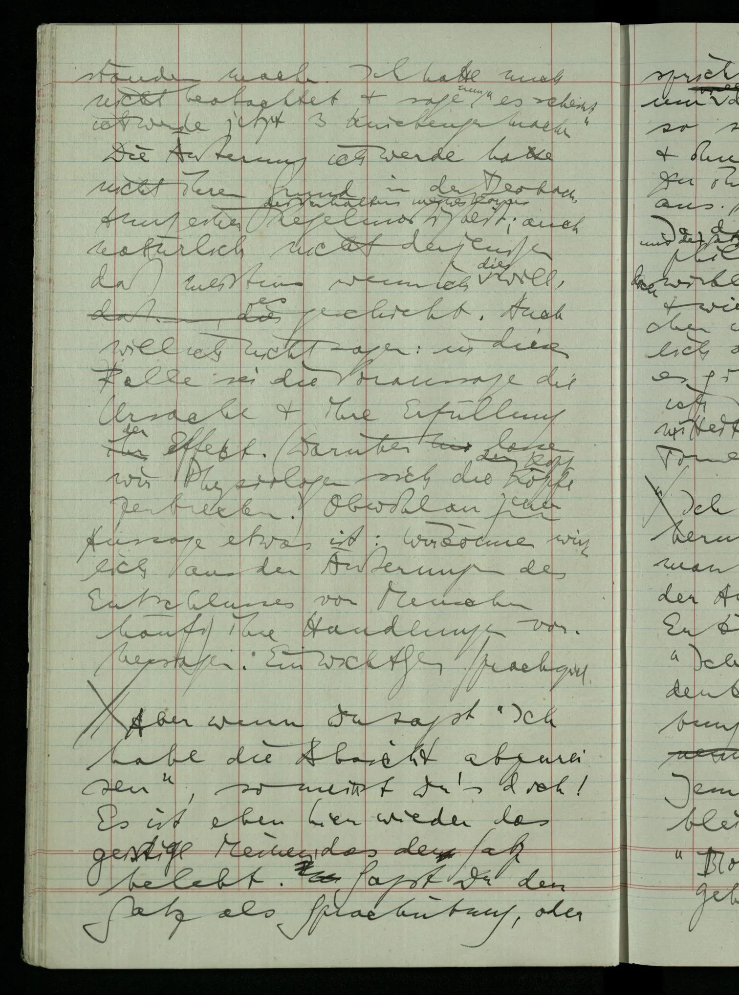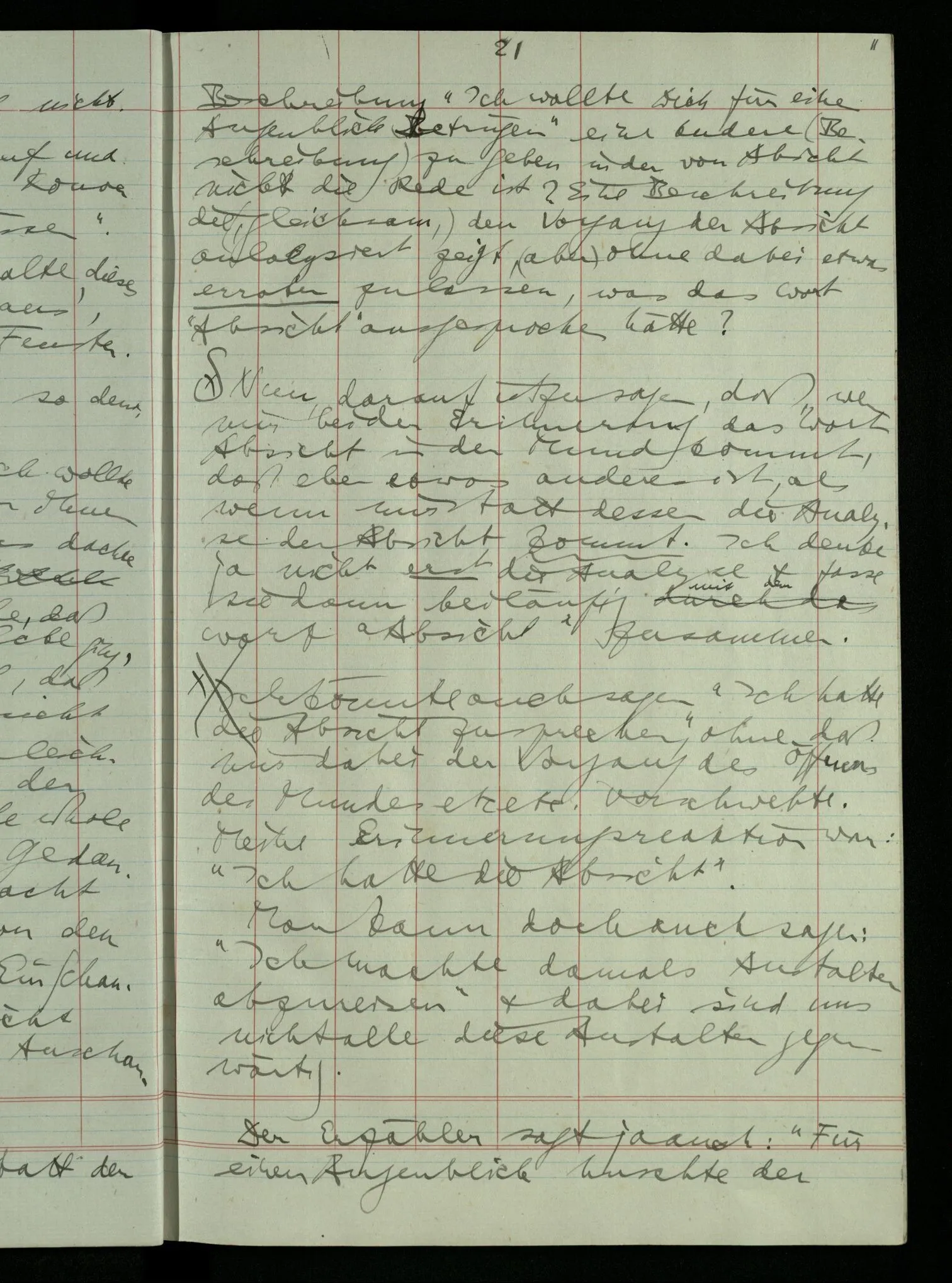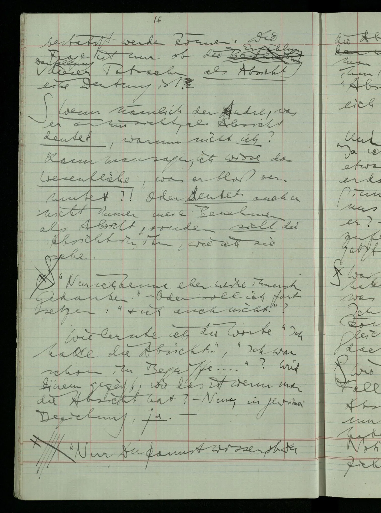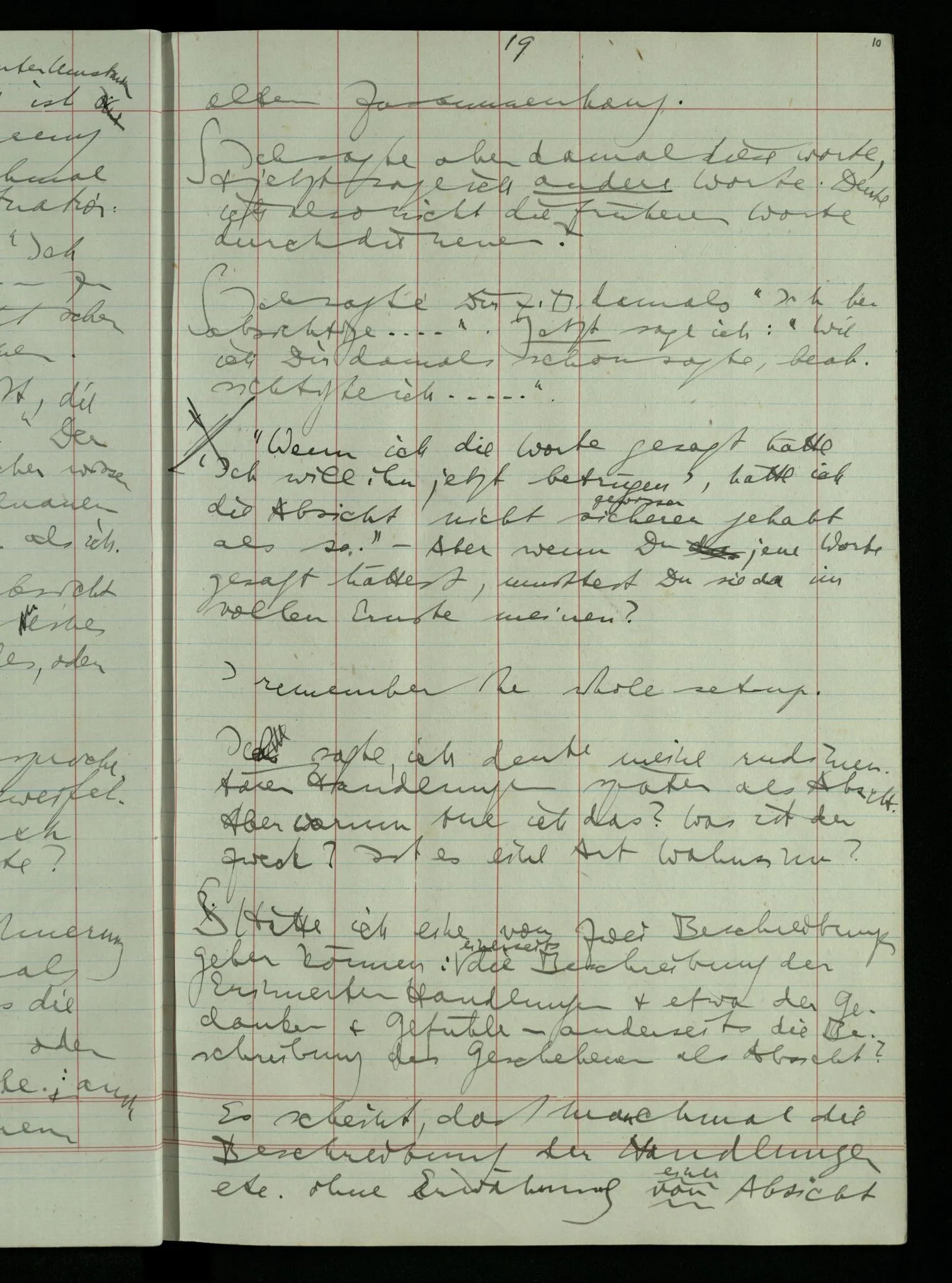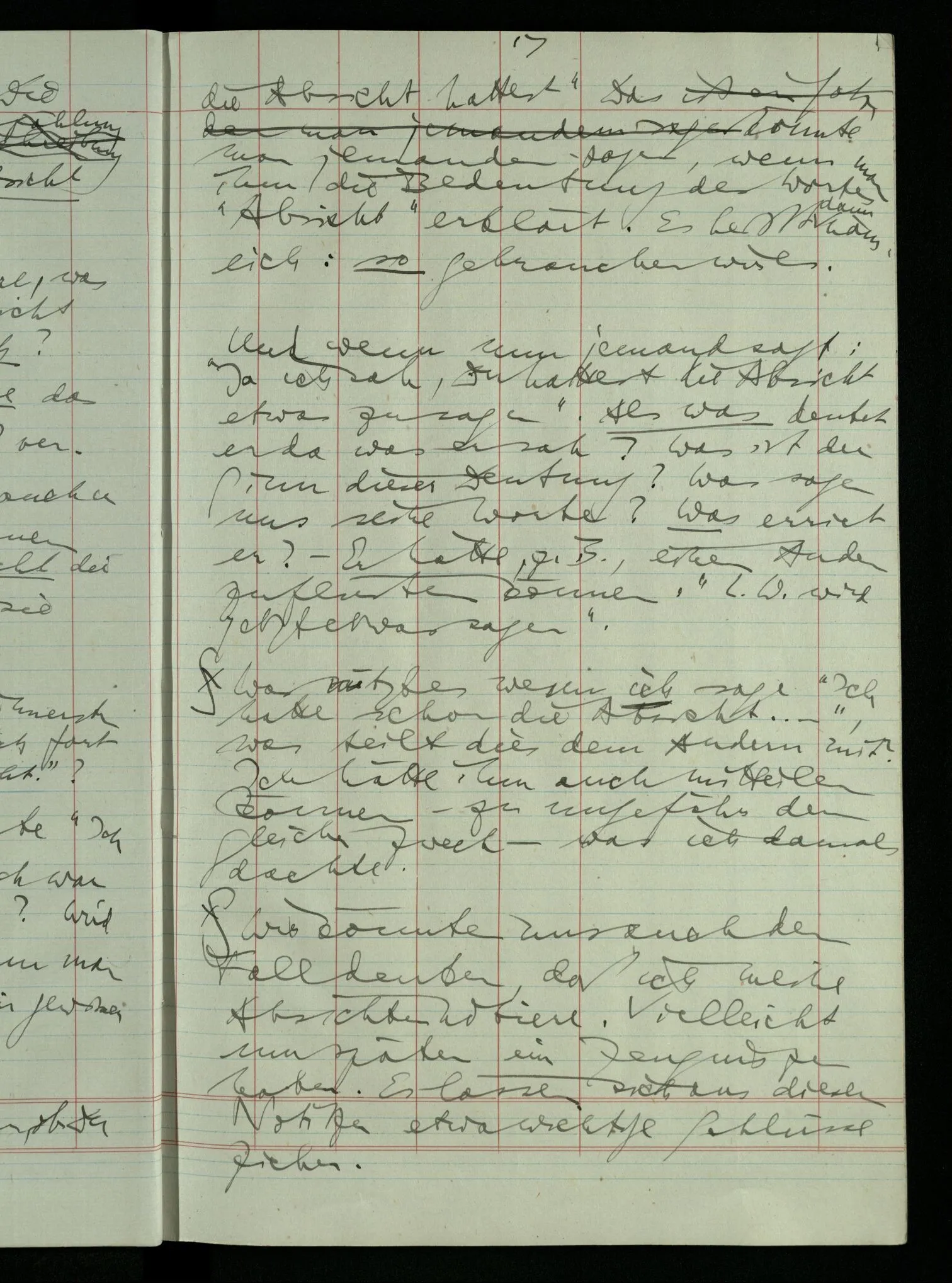 “Ich schäme mich nicht dessen was ich damals tat, sondern der Absicht die ich hatte.” – Aber lag die Absicht nicht auch in dem, was ich tat? Worin bestand das Beabsichtigen? Nur in dem was ich damals dachte, zu mir selber sagte? Wodurch ist die Absicht gegeben? Durch die ganze Geschichte –.