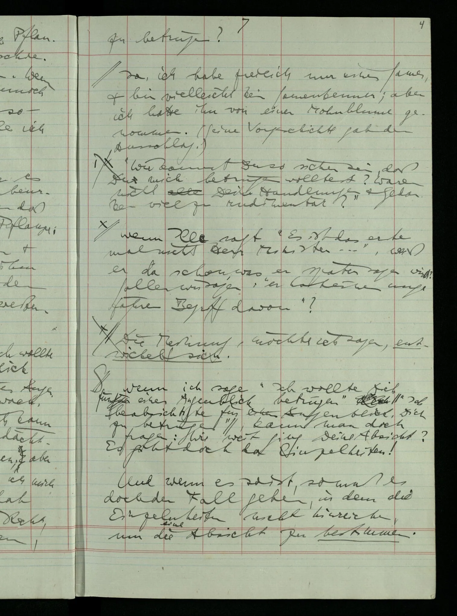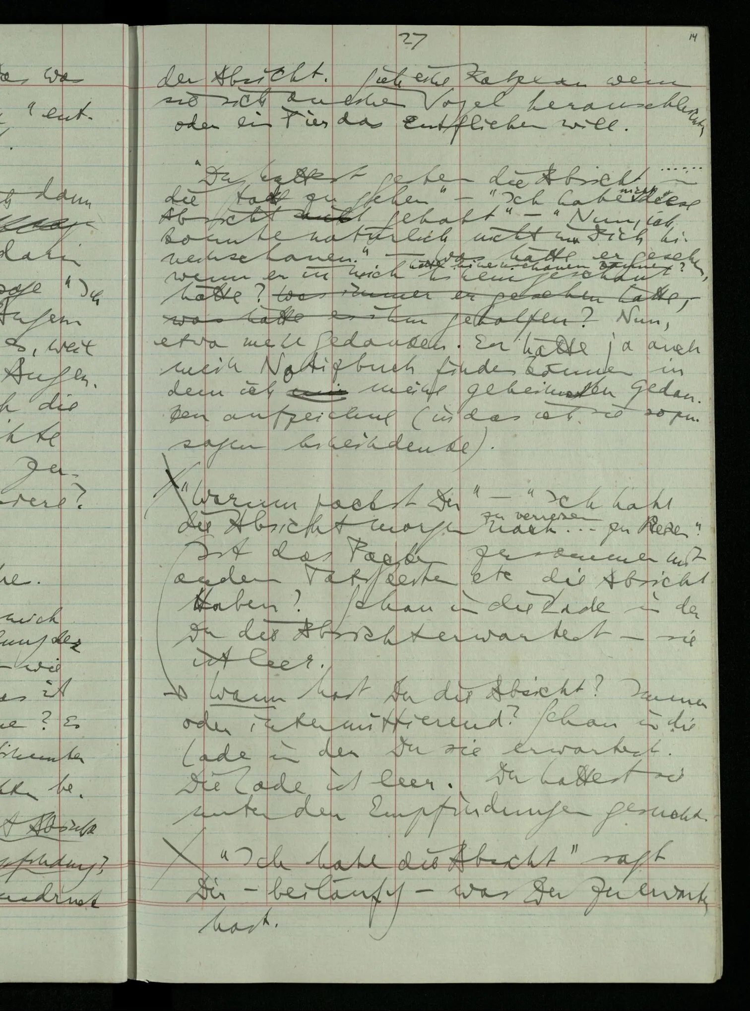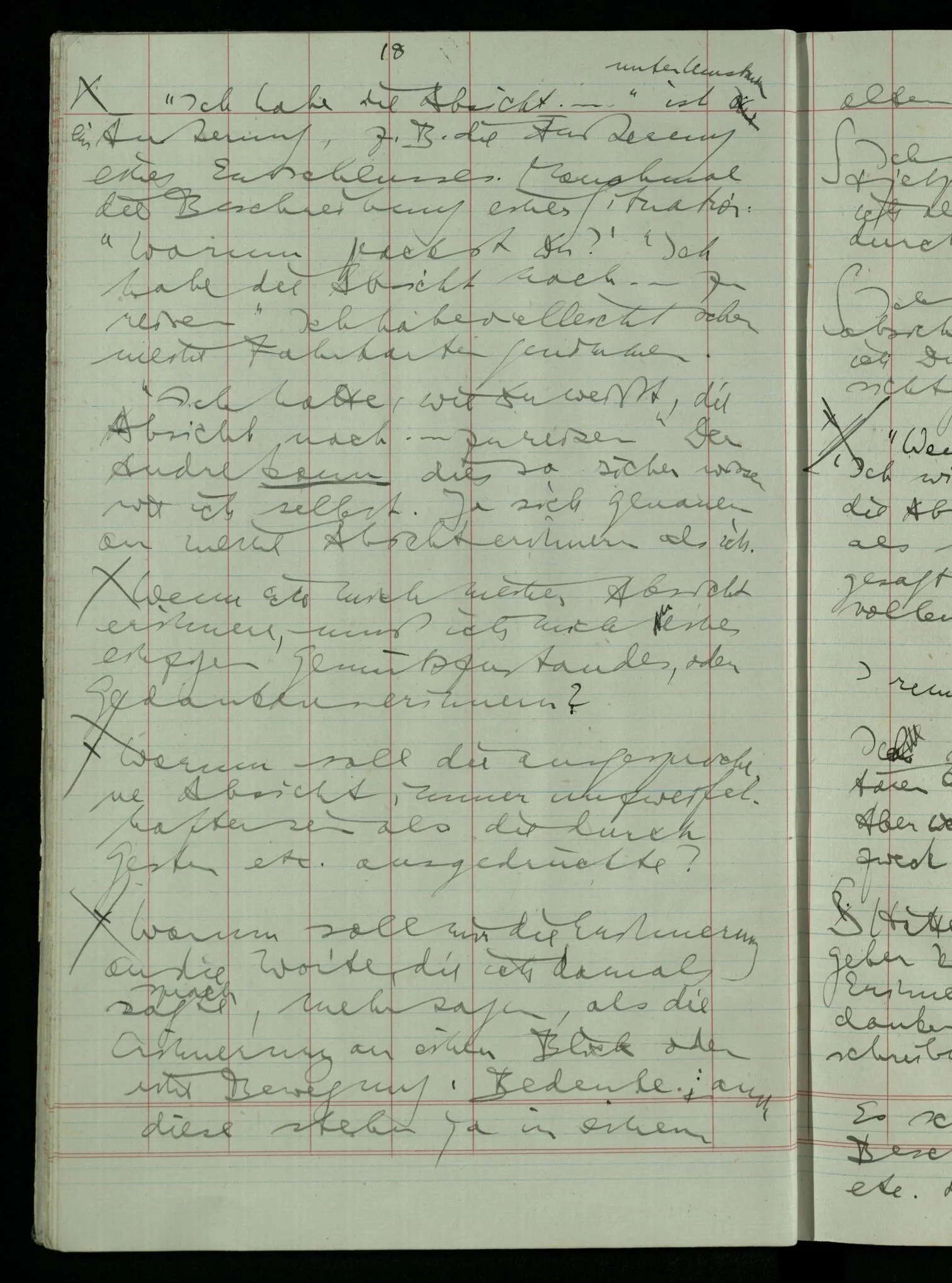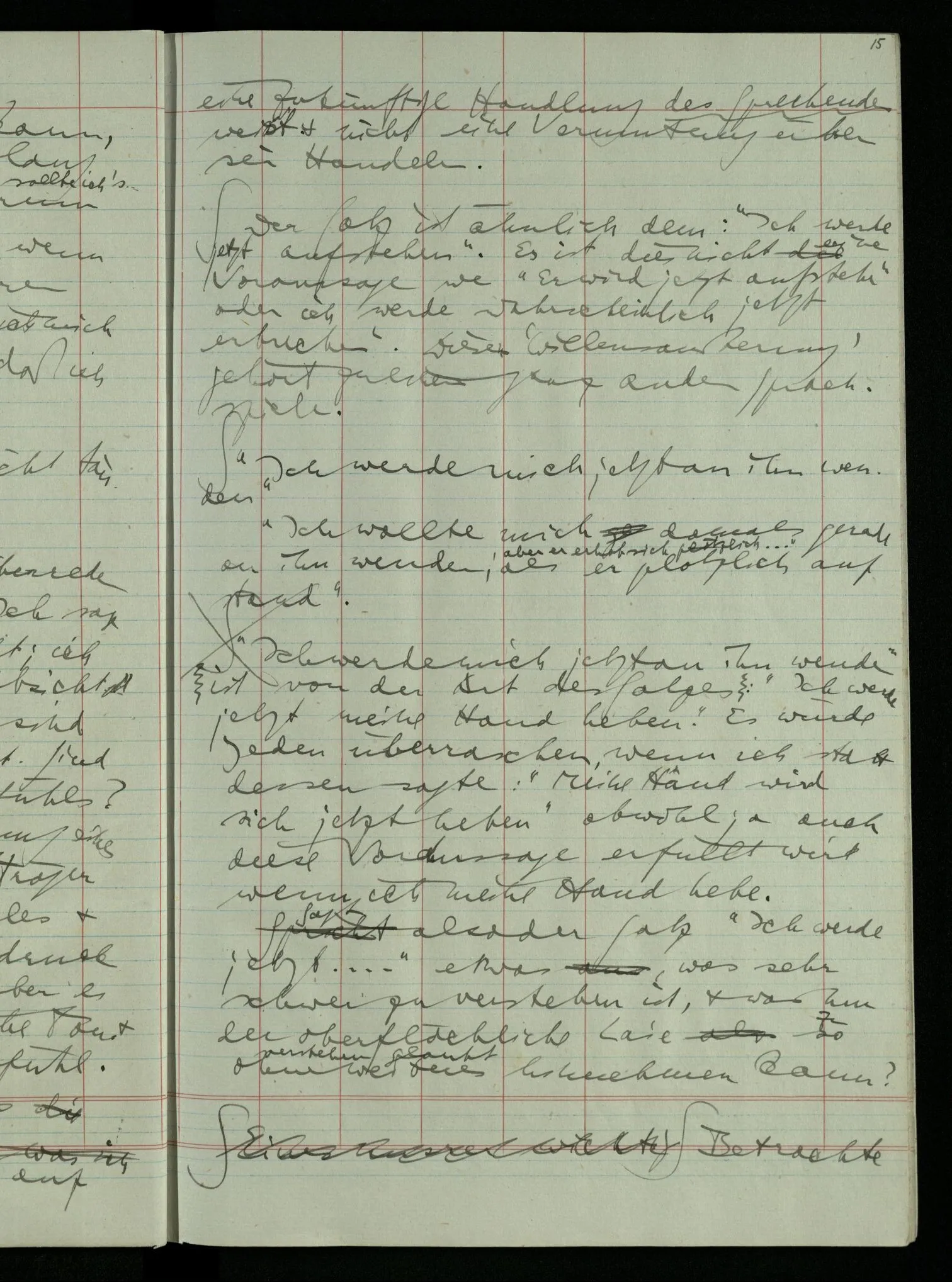 “Ich schäme mich nicht dessen was ich damals tat, sondern der Absicht die ich hatte.” – Aber lag die Absicht nicht auch in dem, was ich tat? Worin bestand das Beabsichtigen? Nur in dem was ich damals dachte, zu mir selber sagte? Wodurch ist die Absicht gegeben? Durch die ganze Geschichte –.