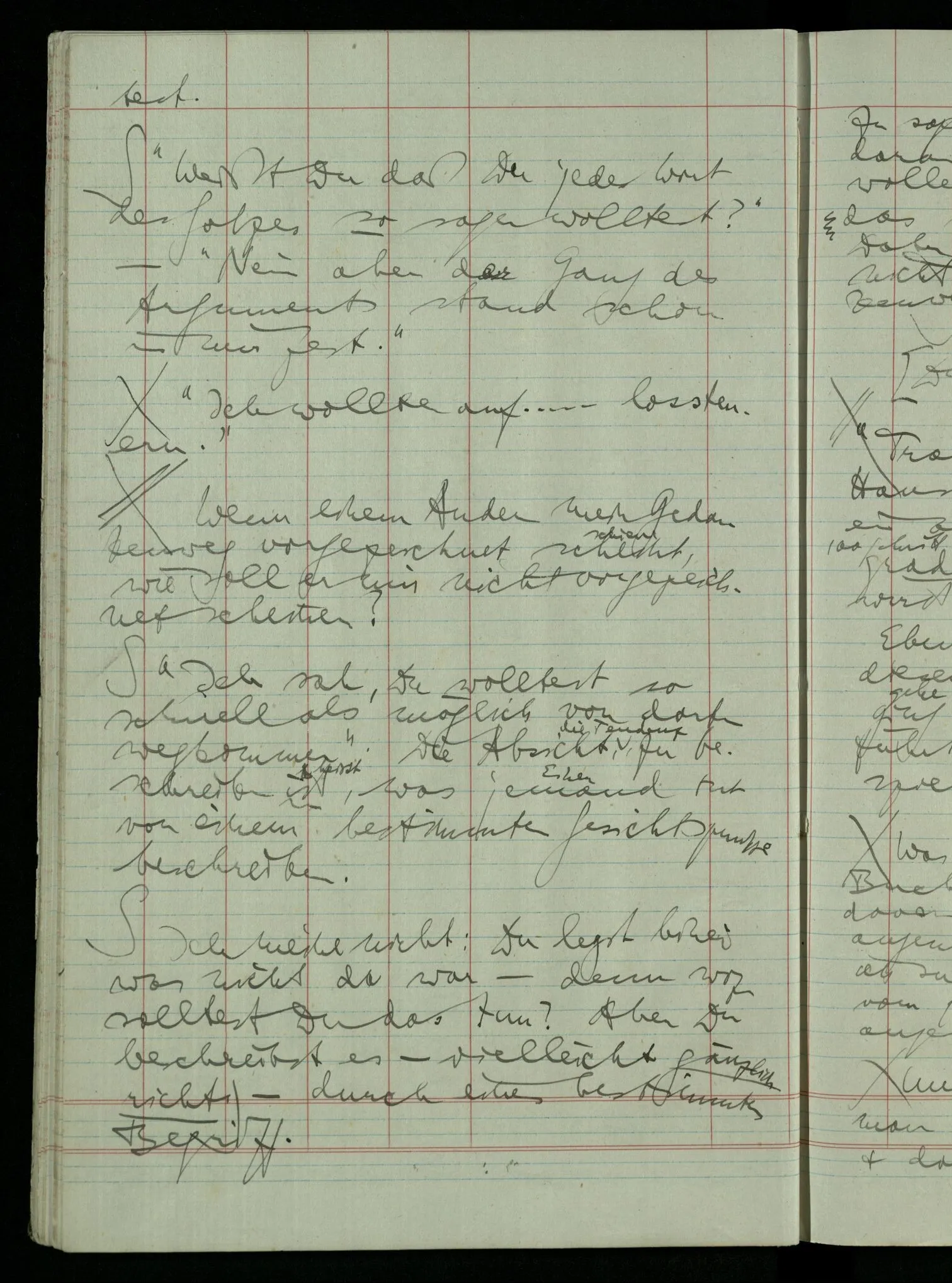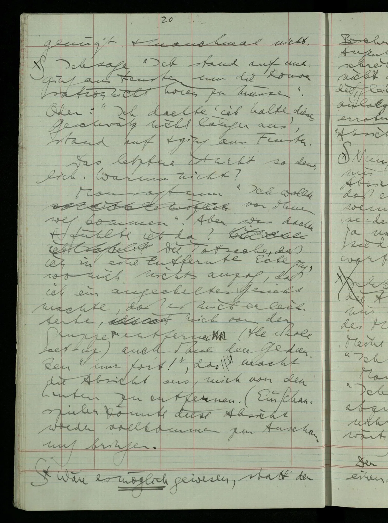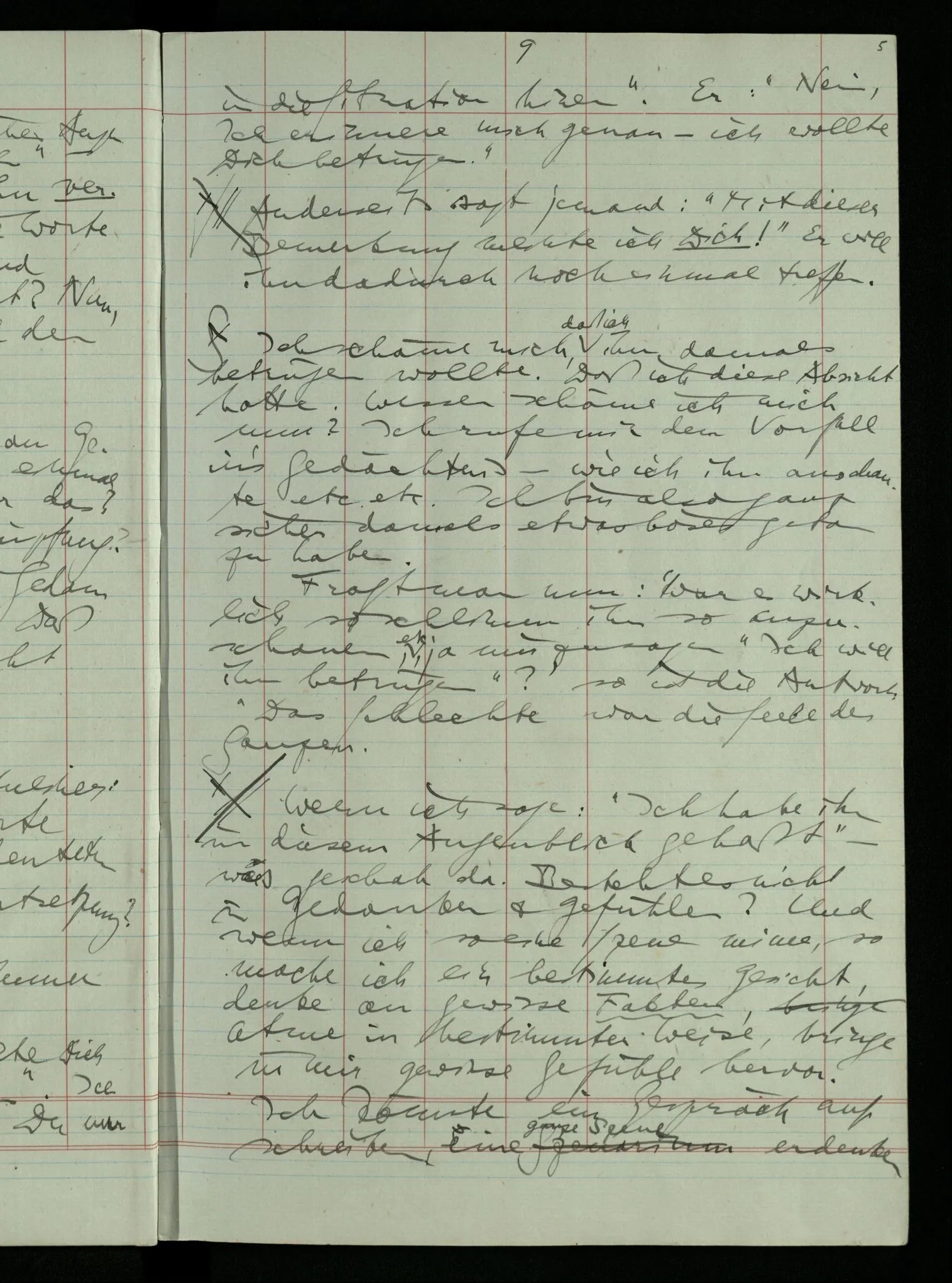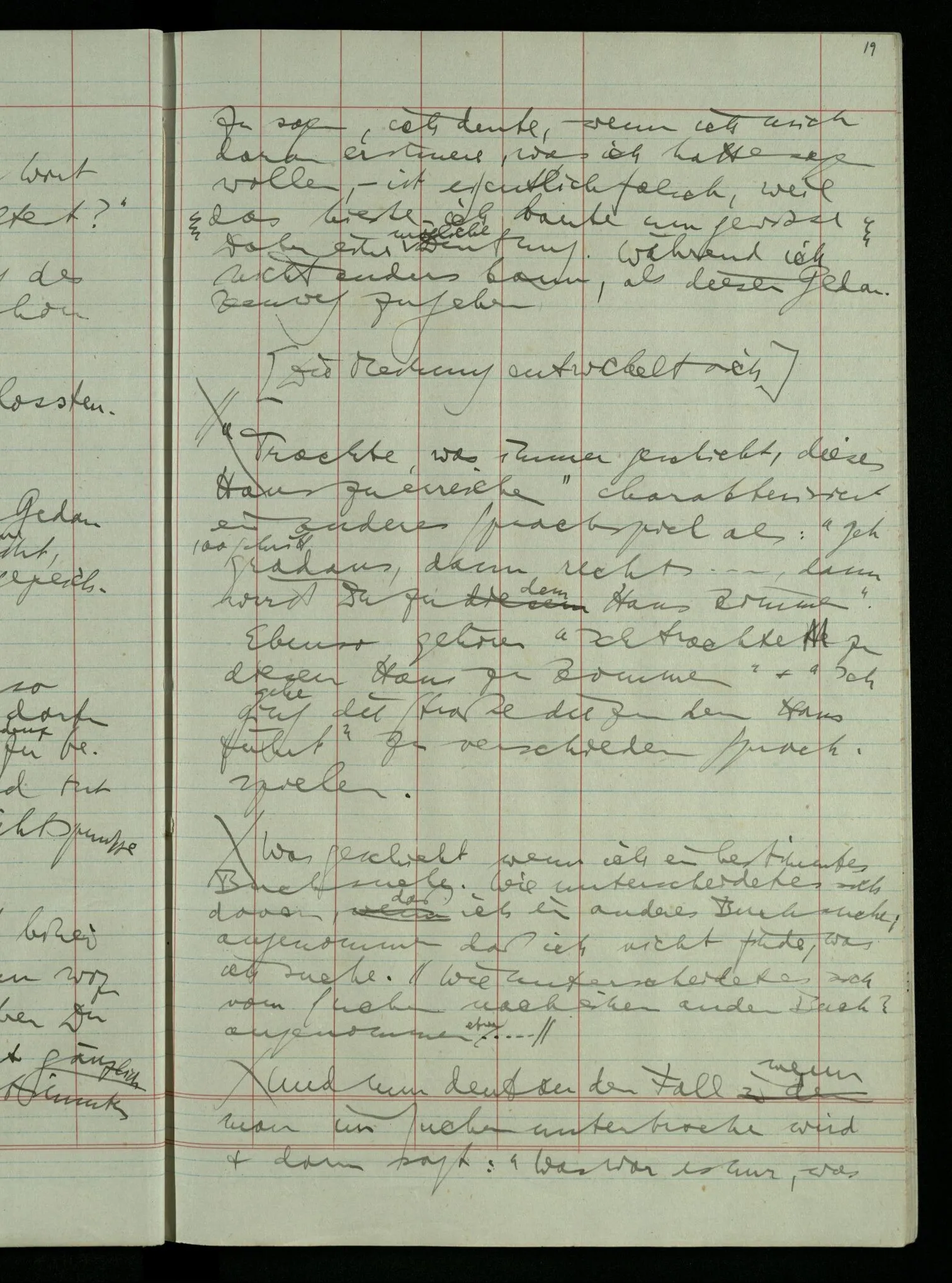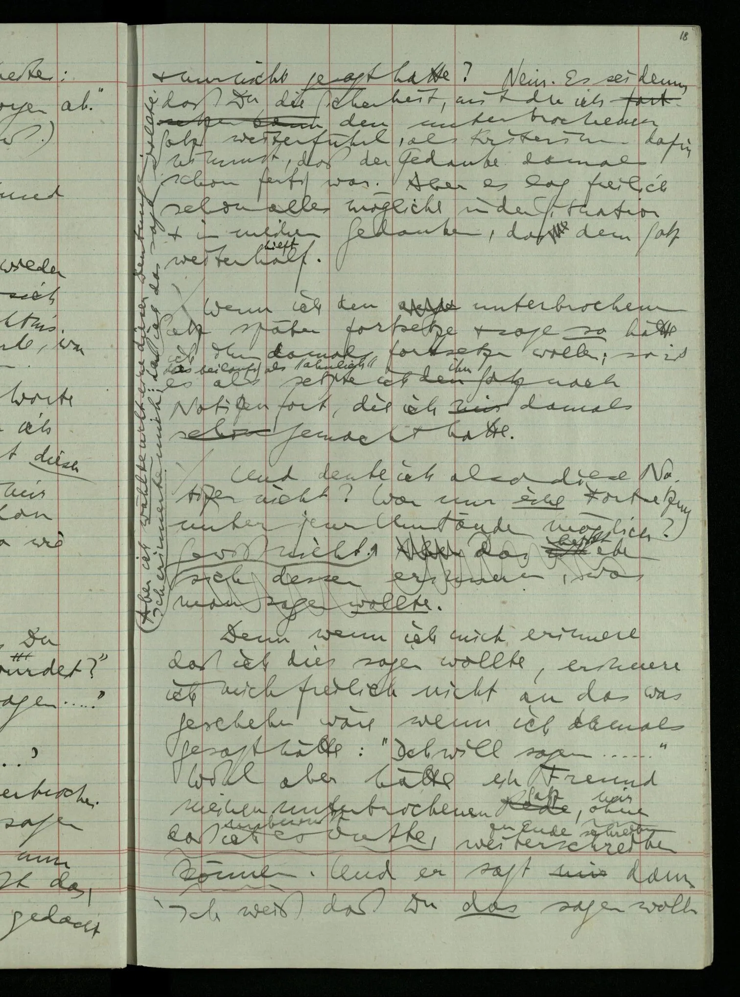 “Ich schäme mich nicht dessen was ich damals tat, sondern der Absicht die ich hatte.” – Aber lag die Absicht nicht auch in dem, was ich tat? Worin bestand das Beabsichtigen? Nur in dem was ich damals dachte, zu mir selber sagte? Wodurch ist die Absicht gegeben? Durch die ganze Geschichte –.