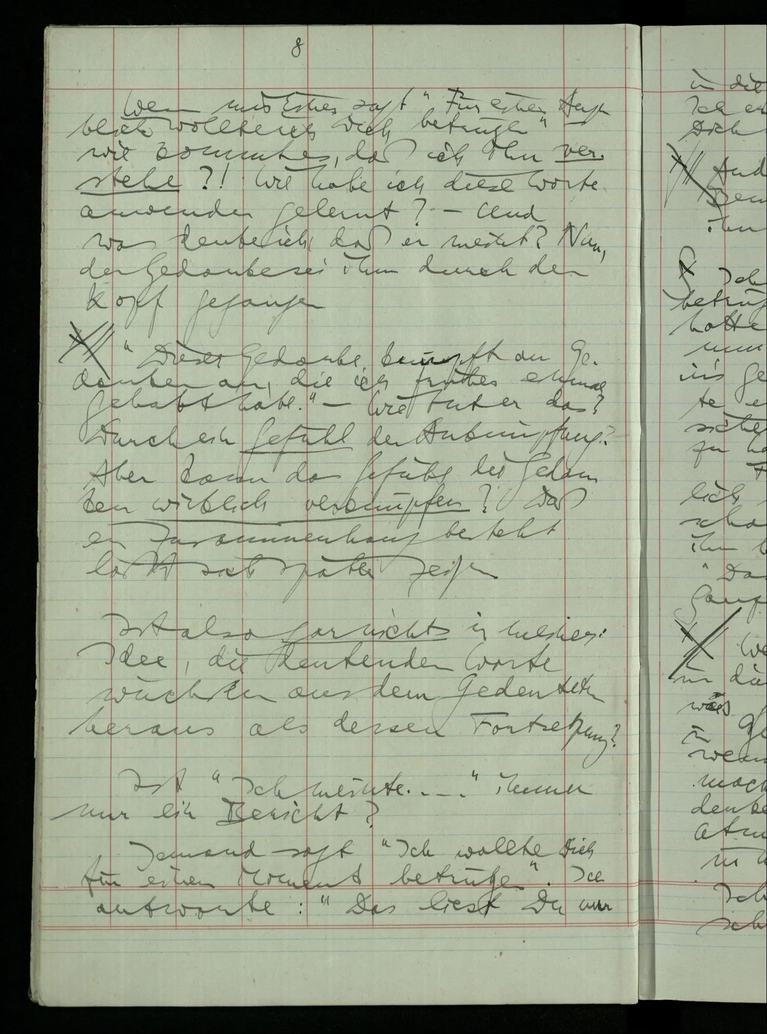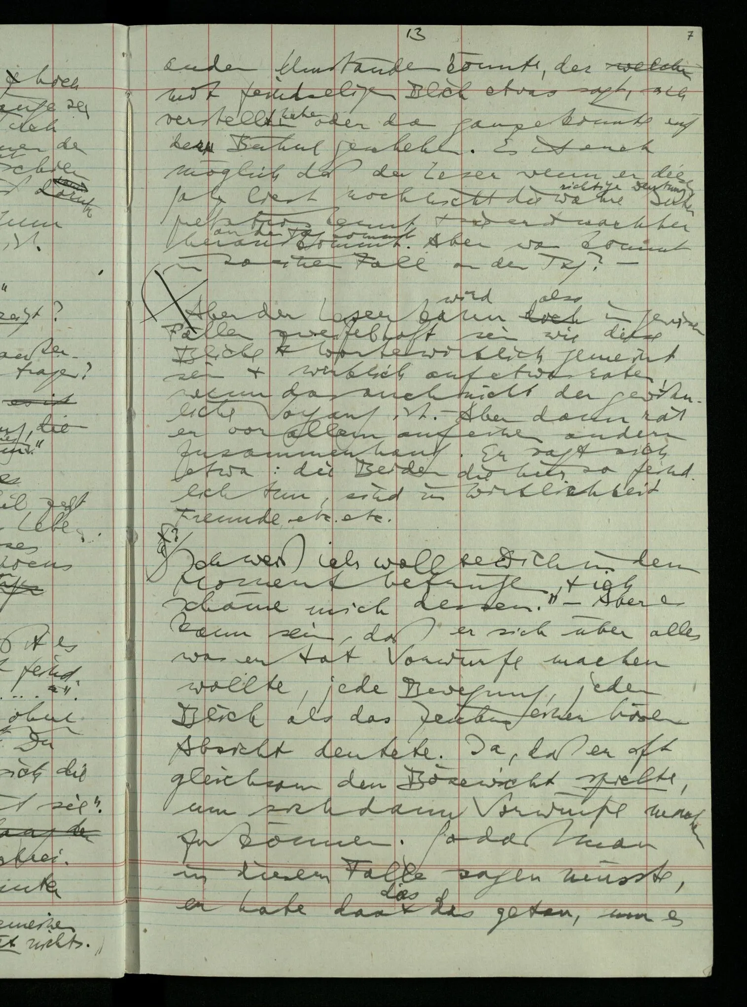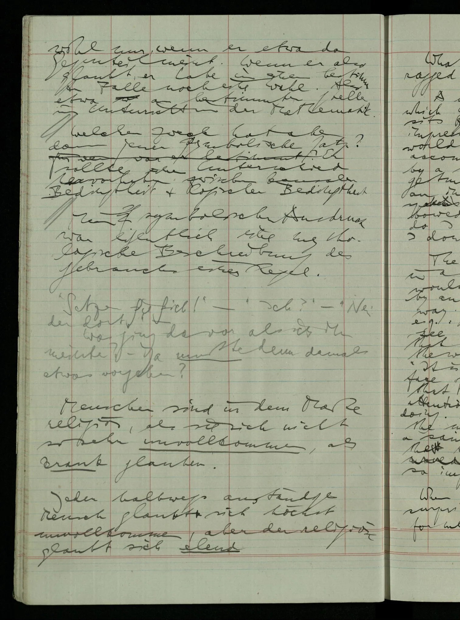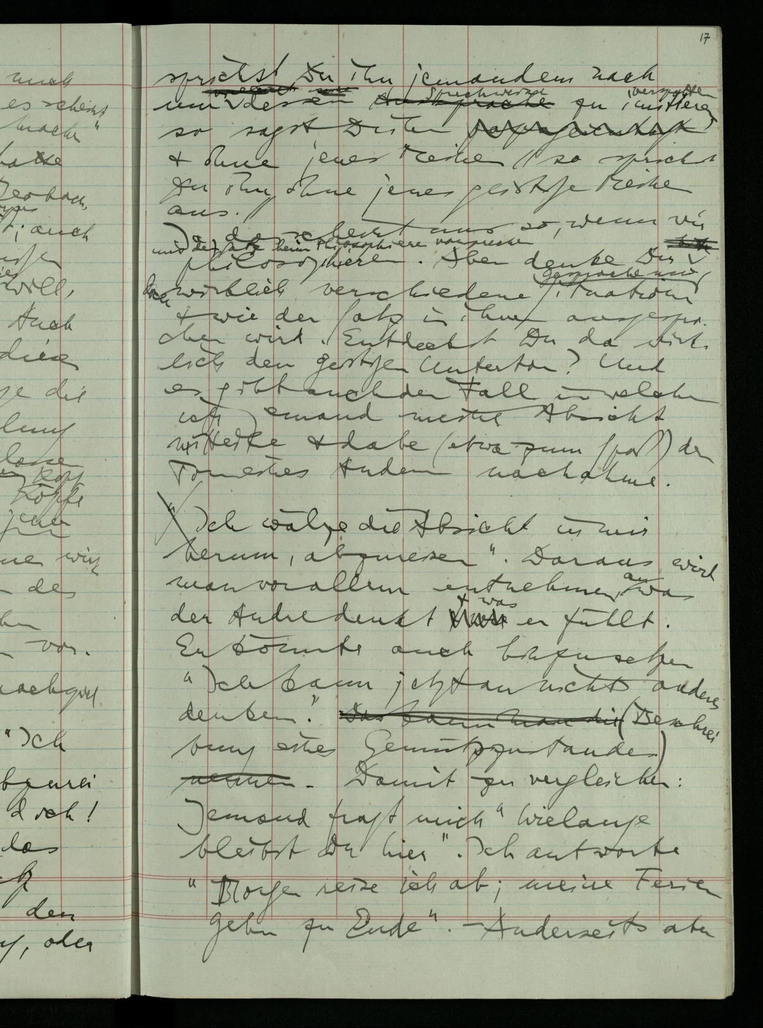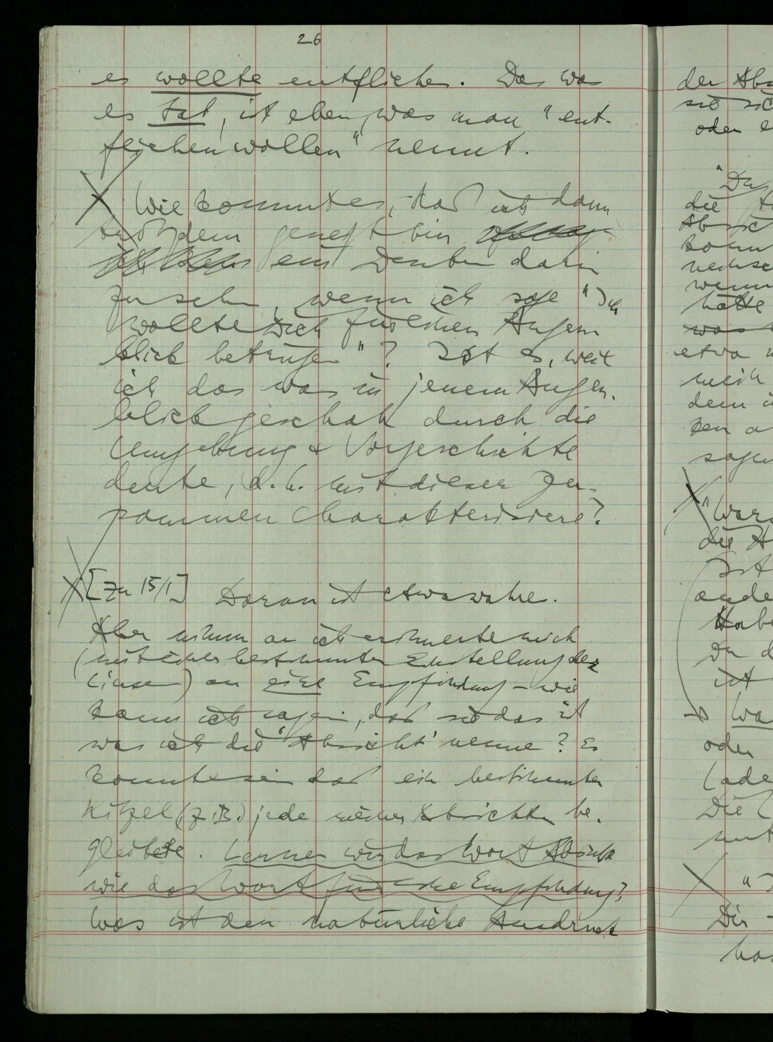 “Ich schäme mich nicht dessen was ich damals tat, sondern der Absicht die ich hatte.” – Aber lag die Absicht nicht auch in dem, was ich tat? Worin bestand das Beabsichtigen? Nur in dem was ich damals dachte, zu mir selber sagte? Wodurch ist die Absicht gegeben? Durch die ganze Geschichte –.
