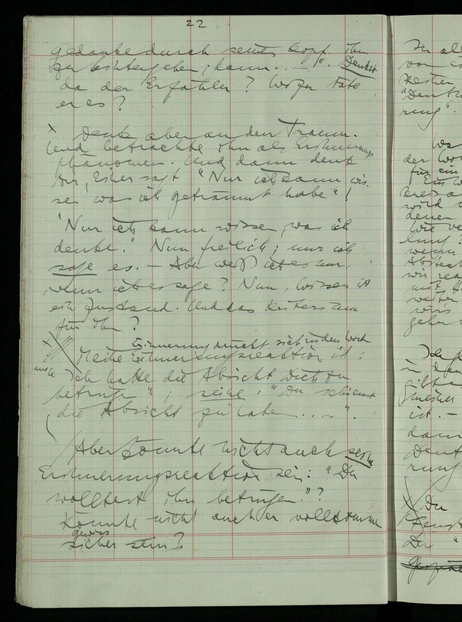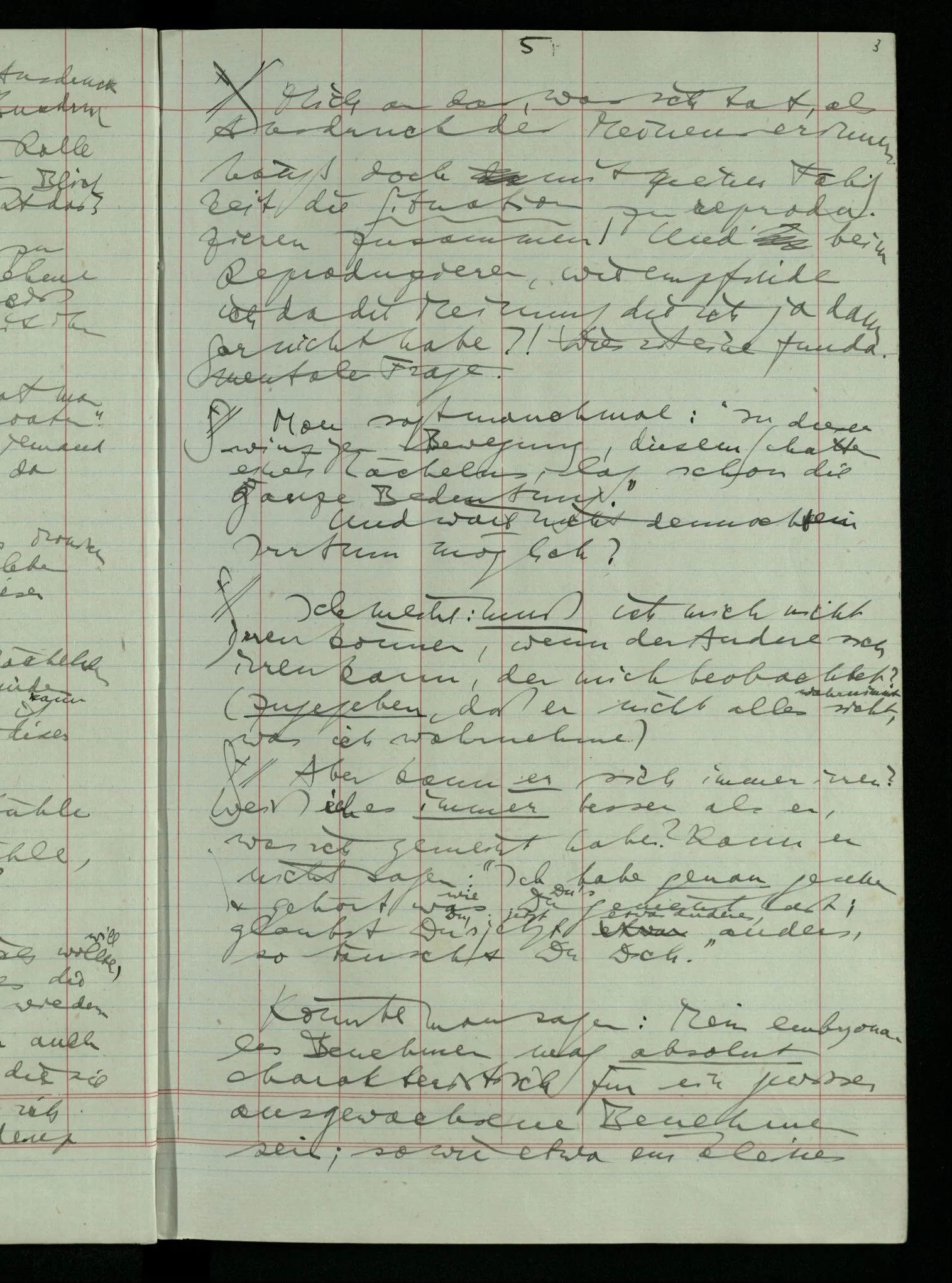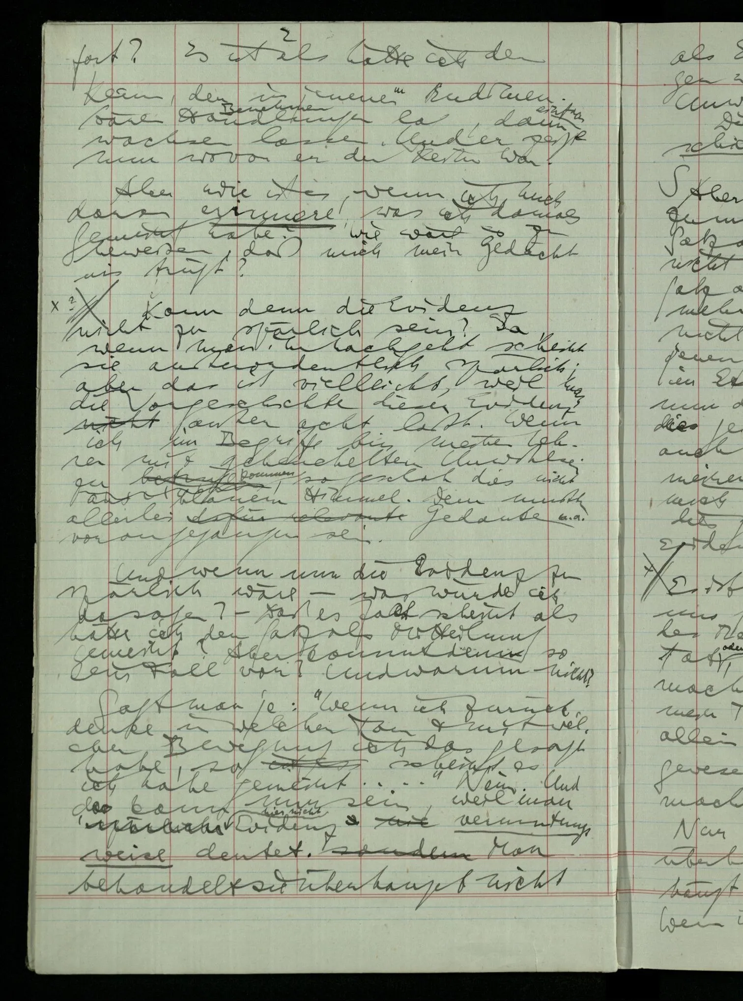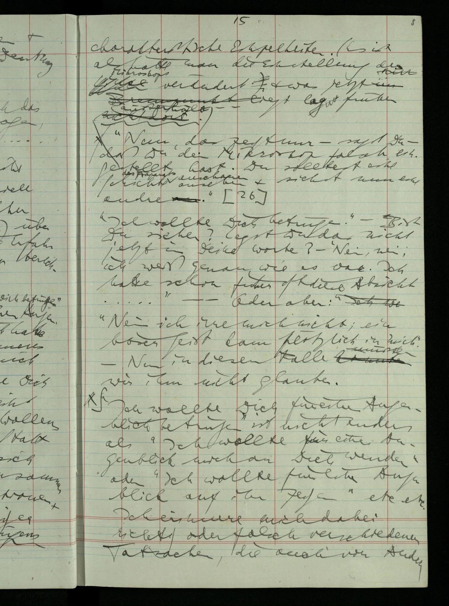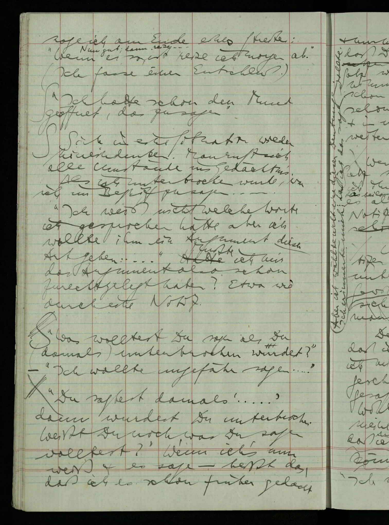 “Ich schäme mich nicht dessen was ich damals tat, sondern der Absicht die ich hatte.” – Aber lag die Absicht nicht auch in dem, was ich tat? Worin bestand das Beabsichtigen? Nur in dem was ich damals dachte, zu mir selber sagte? Wodurch ist die Absicht gegeben? Durch die ganze Geschichte –.