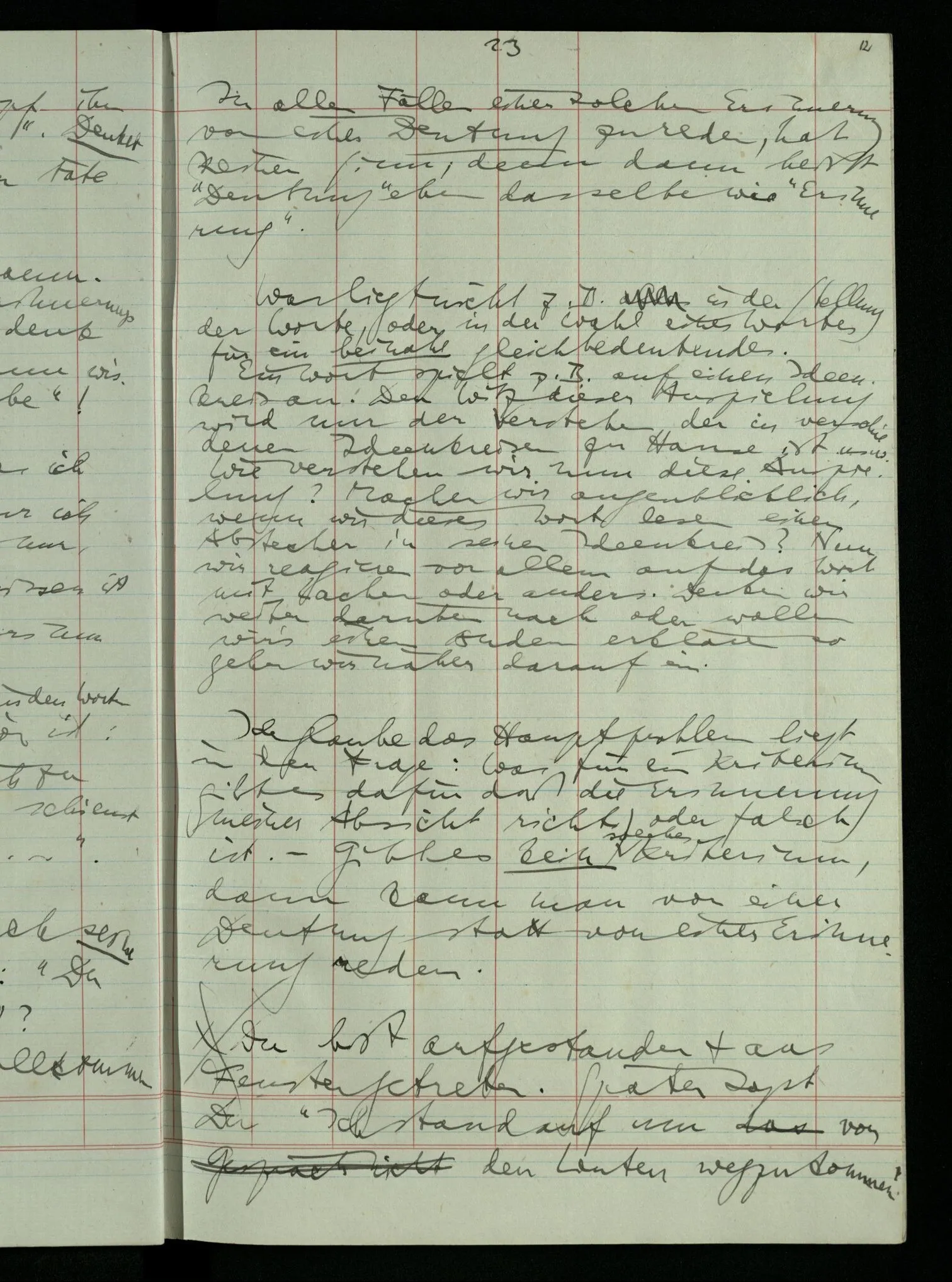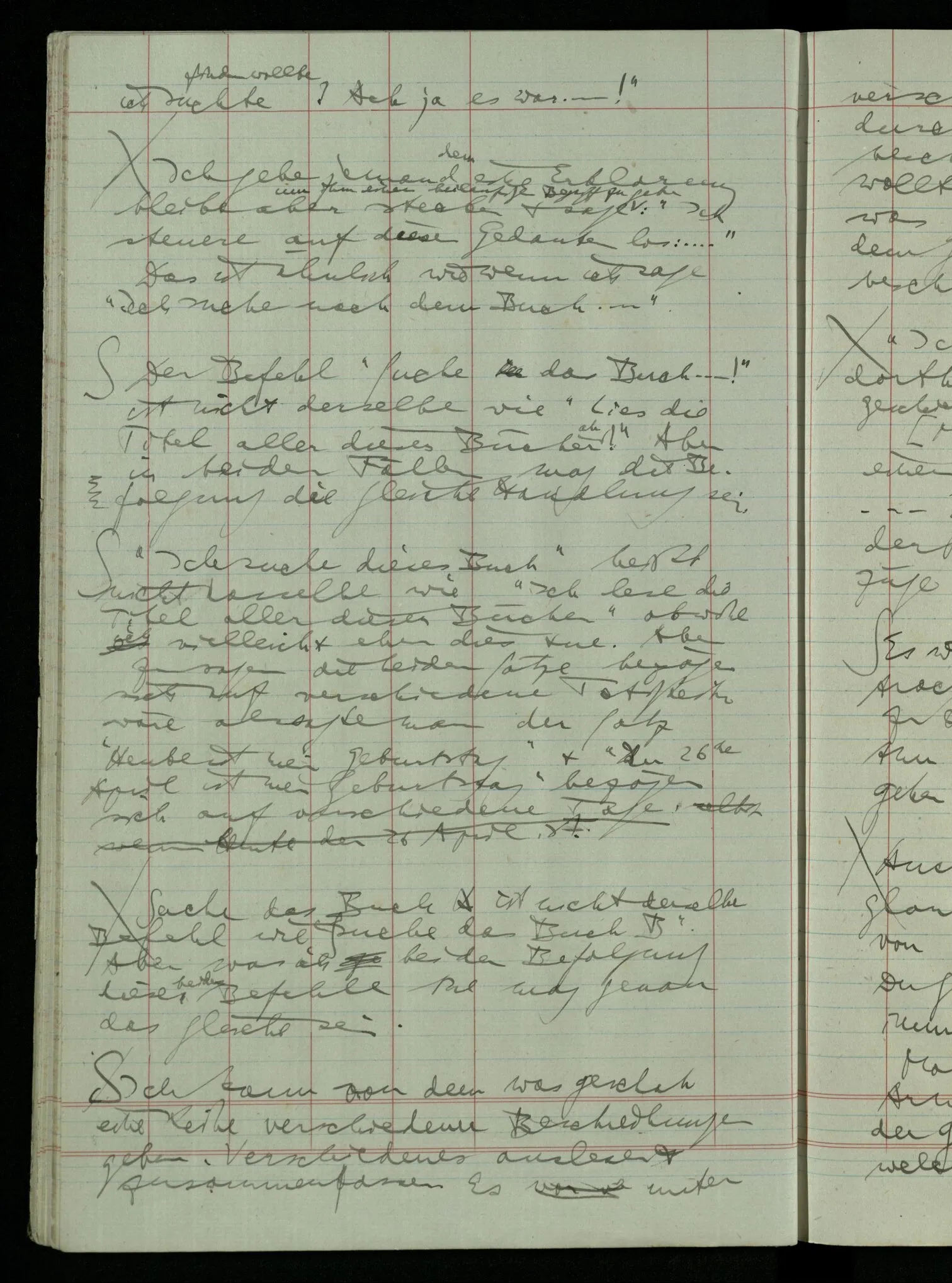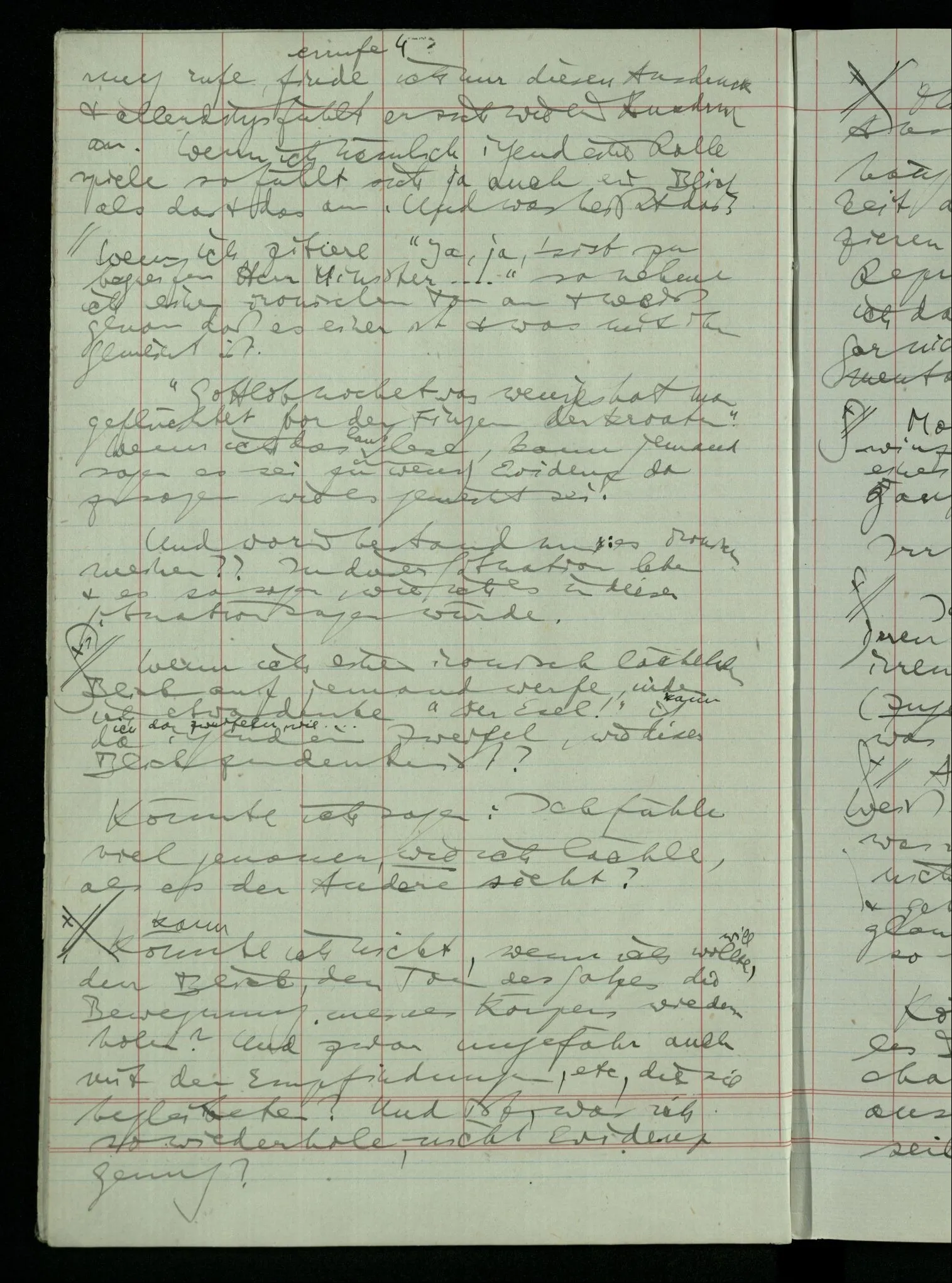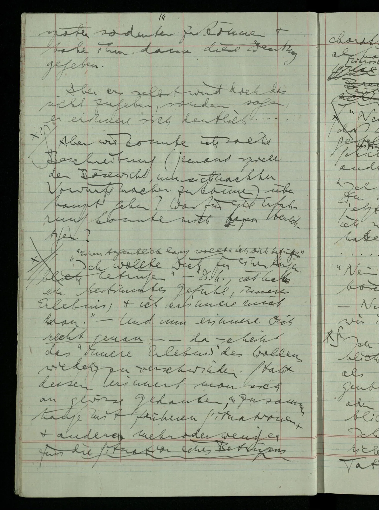 “Ich schäme mich nicht dessen was ich damals tat, sondern der Absicht die ich hatte.” – Aber lag die Absicht nicht auch in dem, was ich tat? Worin bestand das Beabsichtigen? Nur in dem was ich damals dachte, zu mir selber sagte? Wodurch ist die Absicht gegeben? Durch die ganze Geschichte –.