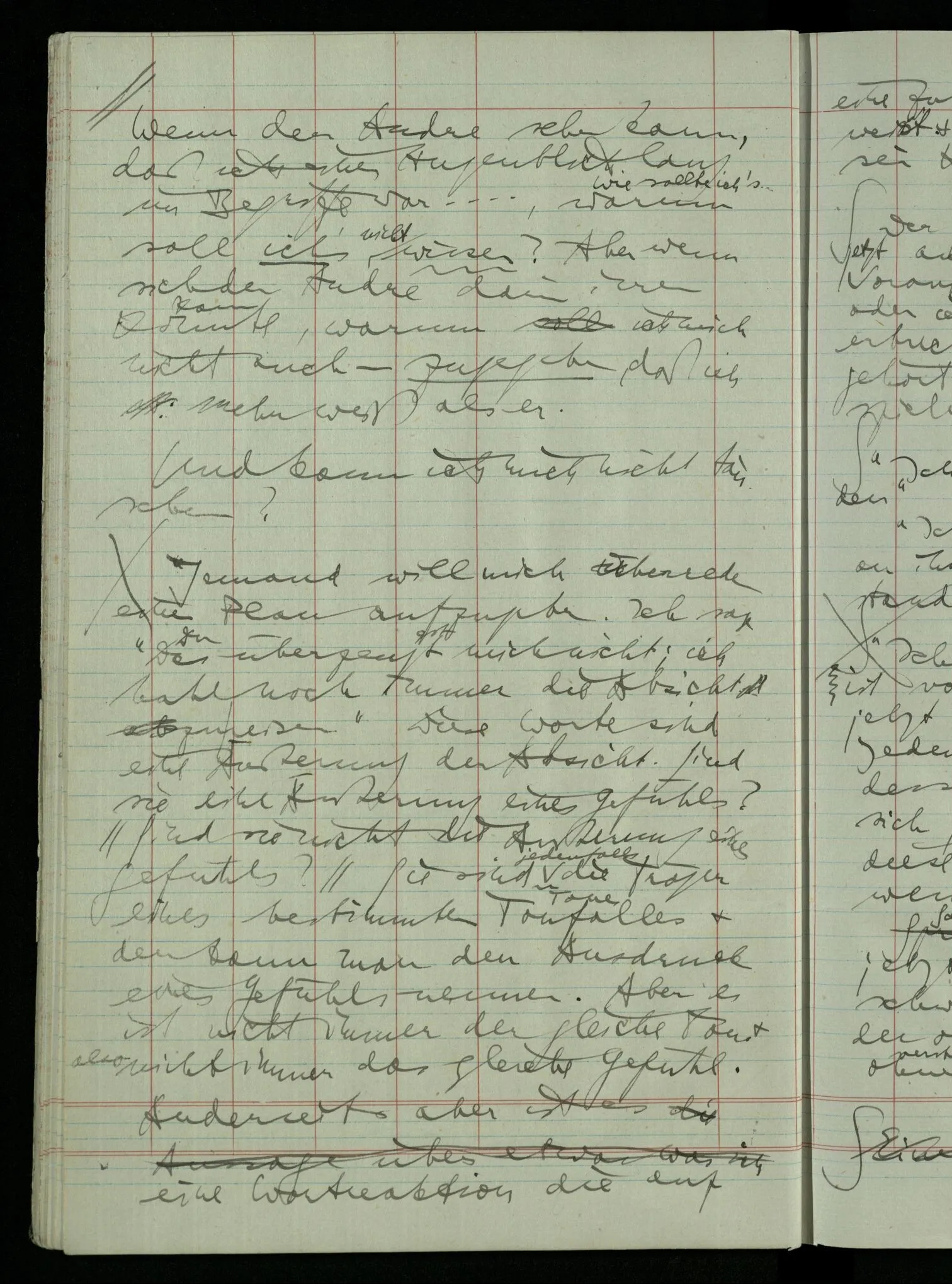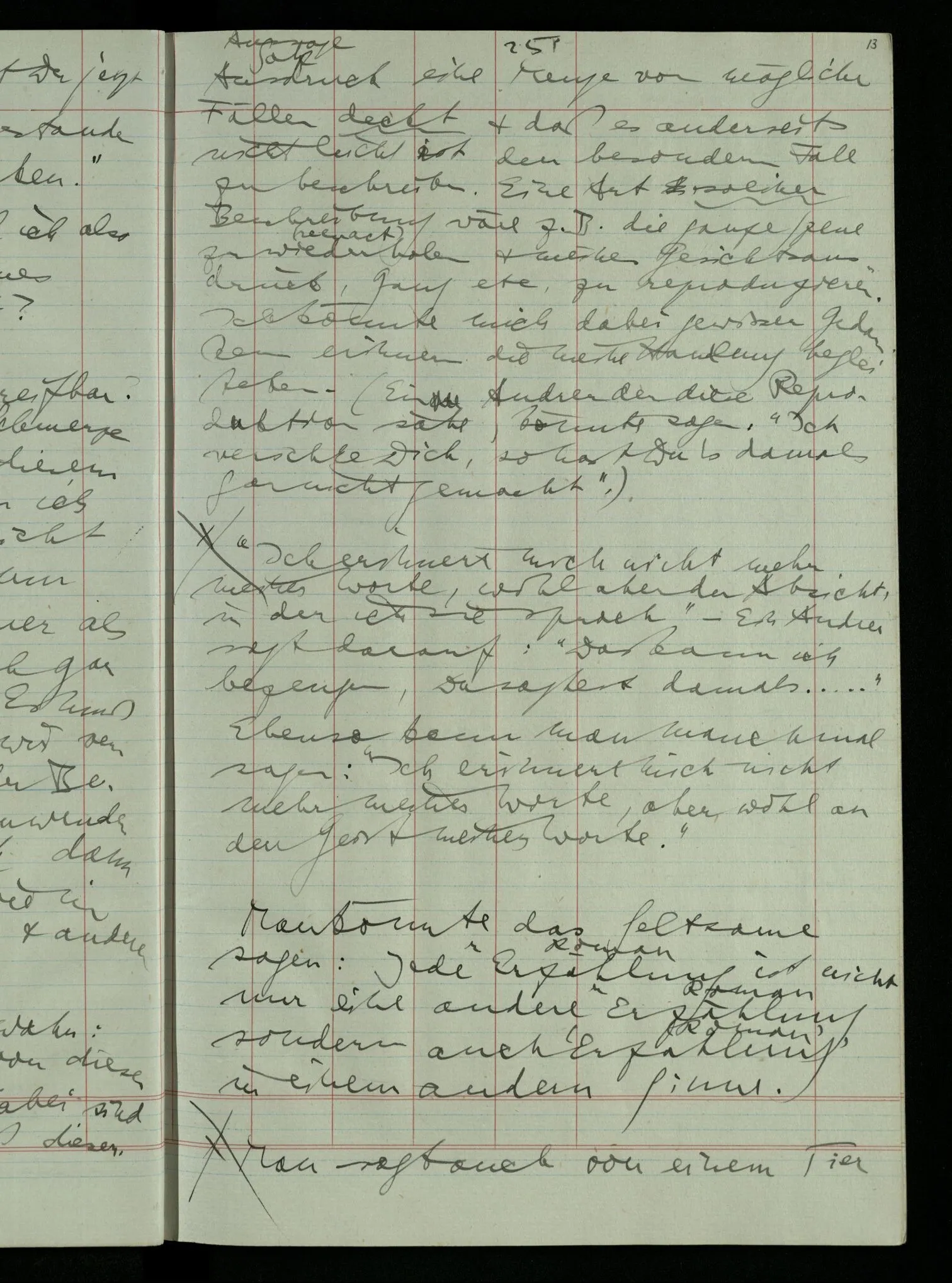 Es ist hier wieder, als erinnern wir uns jener feinen Gefühlsnuance des Meinens die erst, was immer ich tat oder sagte, zum Ausdruck des Meinens machte. Meine Bewegung, Miene, mein Tonfall wären allerdings allein keine Evidenz des Meinens gewesen, fühlt man; zum Meinen machte sie erst das Meinen. Nur sonderbar daß man sich überhaupt an diesen ‘Ausdruck’ hängt. Und noch sonderbarer: Wenn ich mir was geschah in die Erinnerung rufe finde ich nur diesen Ausdruck & allerdings fühlt er sich wie ein Ausdruck an. Wenn ich nämlich irgendeine Rolle spiele so fühlt sich ja auch ein Blick als das & das an. Und was heißt das?