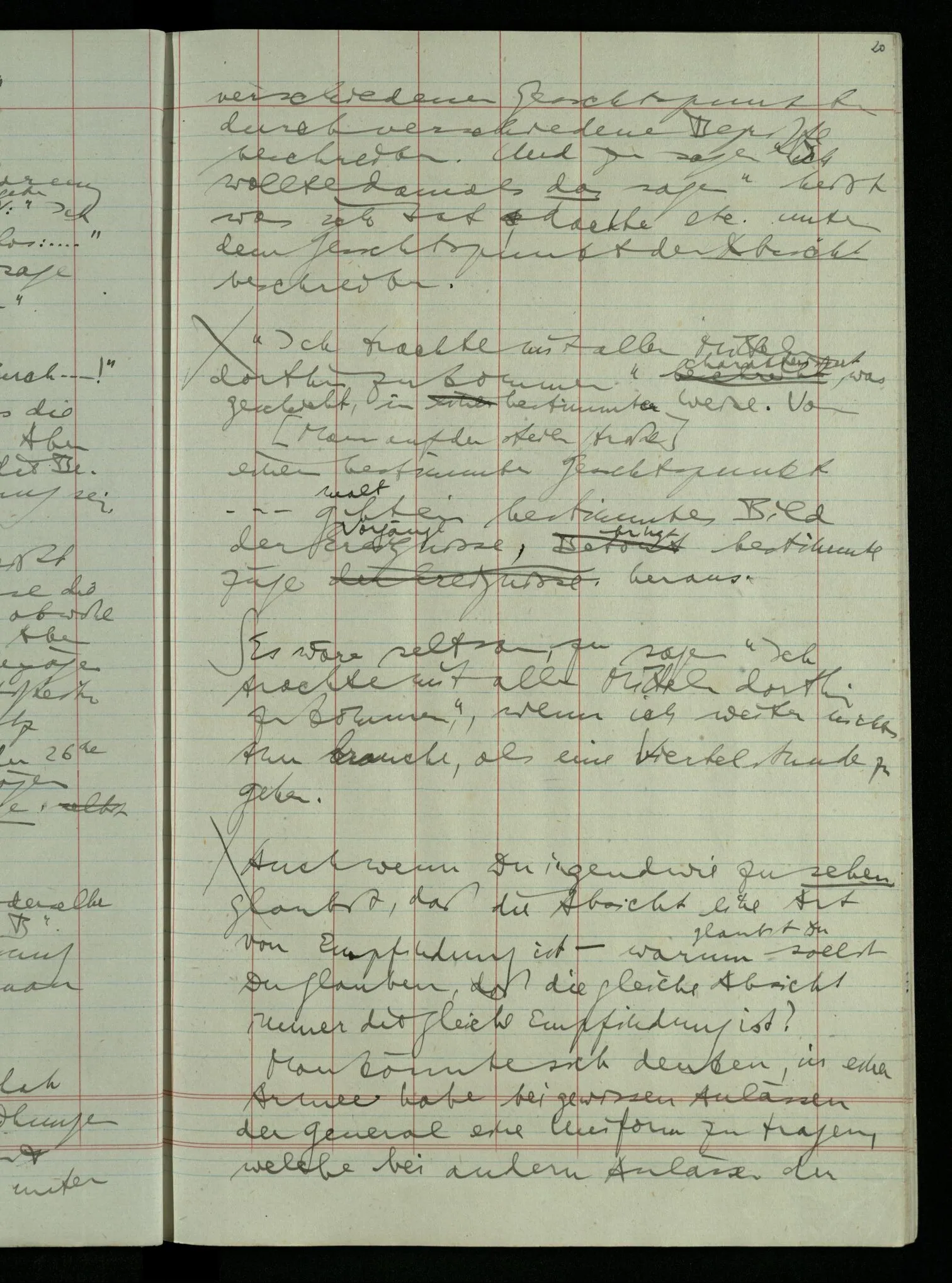 “Wenn Einer beabsichtigt die Straße zu kreuzen so ist er in einem gewissen seelischen Zustand, den wir alle wohl kennen.” Du wirst mir doch nicht sagen, du wissest nicht wie das ist wenn man beabsichtigt etwa die Straße zu kreuzen. Aber könnten wir nicht alle das sagen & doch gänzlich verschiedenes meinen?