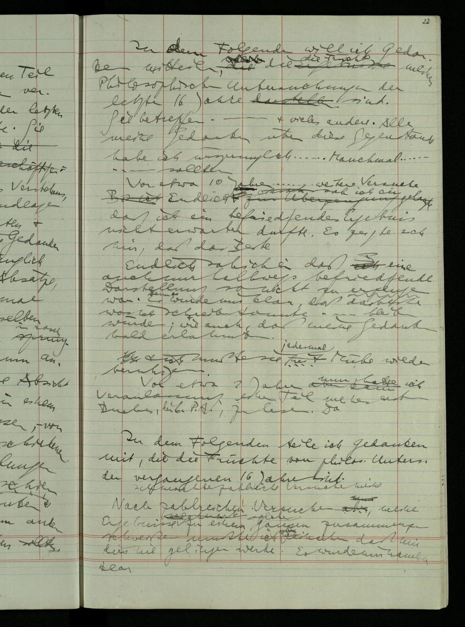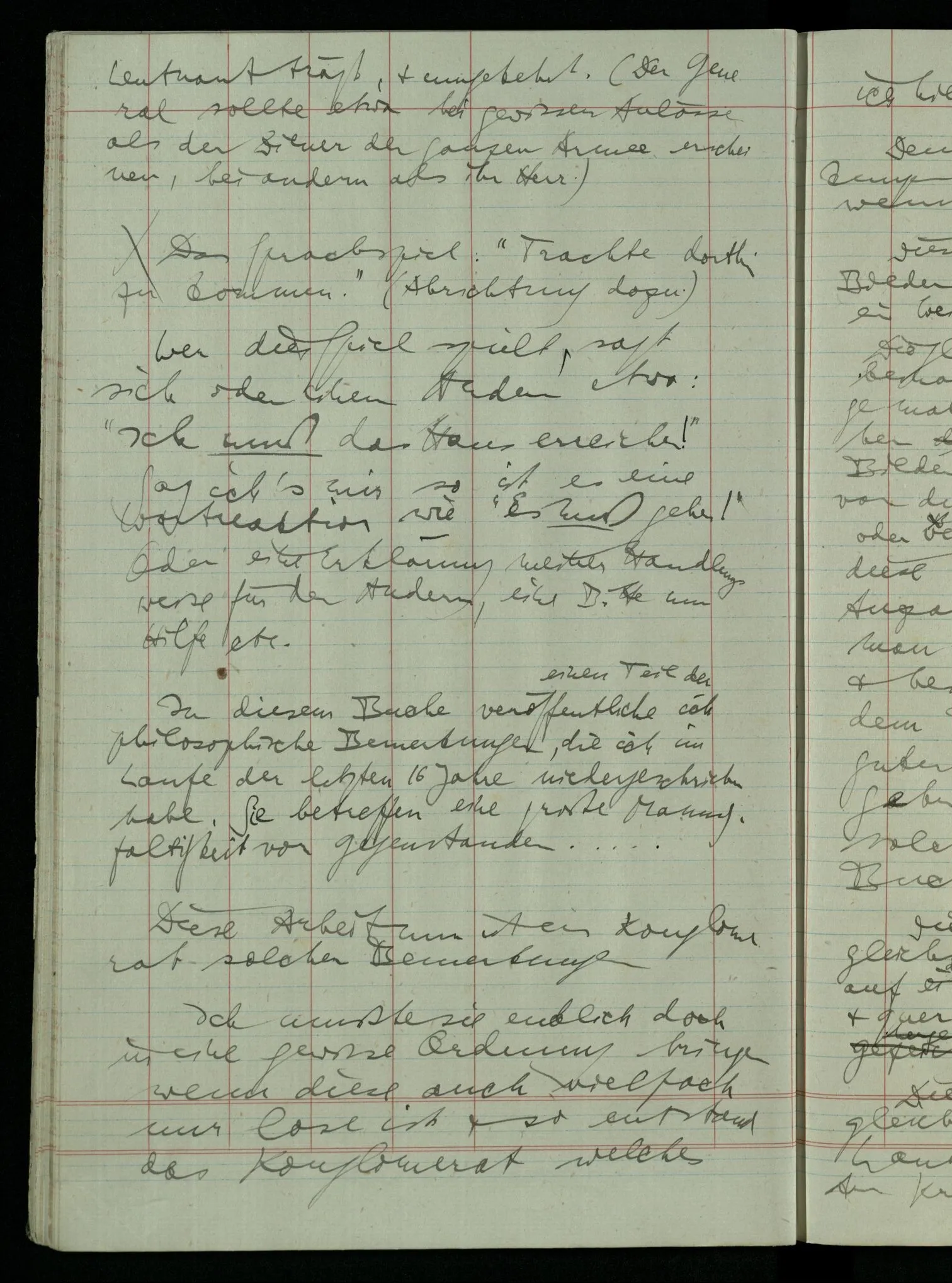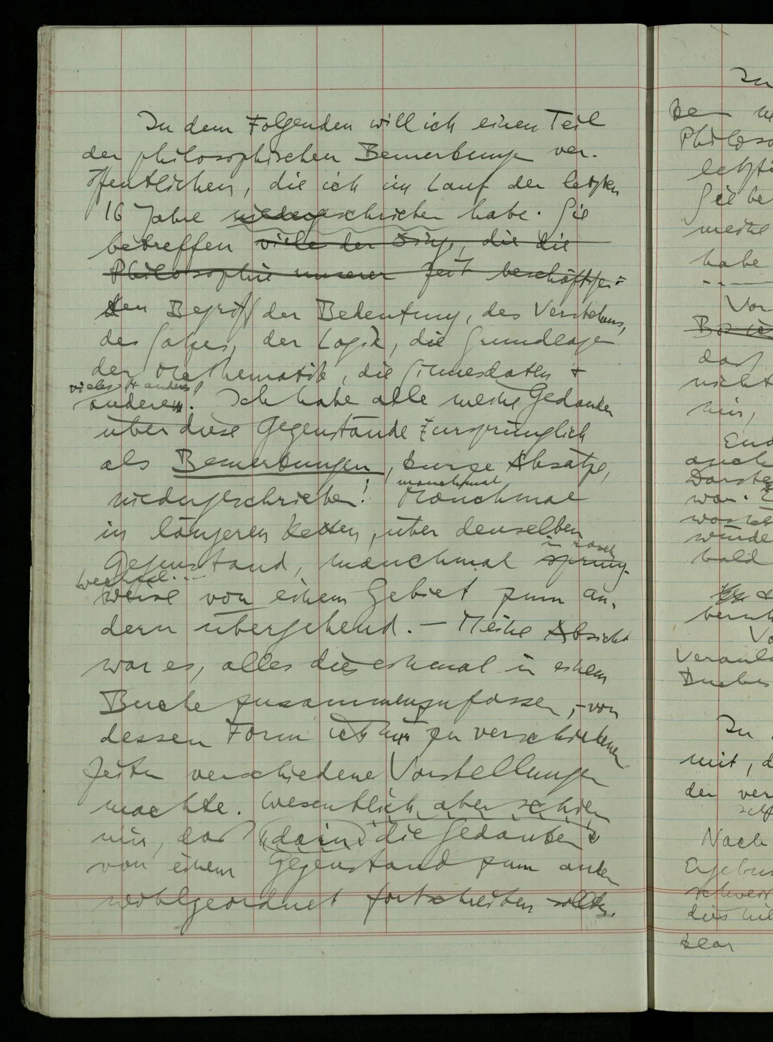 In dem Folgenden teile ich Gedanken mit, die die Früchte von philosophischen Untersuchungen der vergangenen 16 Jahre sind. Ich machte zahlreiche Versuche meine … Nach zahlreichen Versuchen aber meine Ergebnisse zu einem solchen Ganzen zusammenzuschweißen mußte ich einsehen daß mir dies nie gelingen werde. Es wurde mir nämlich klar …