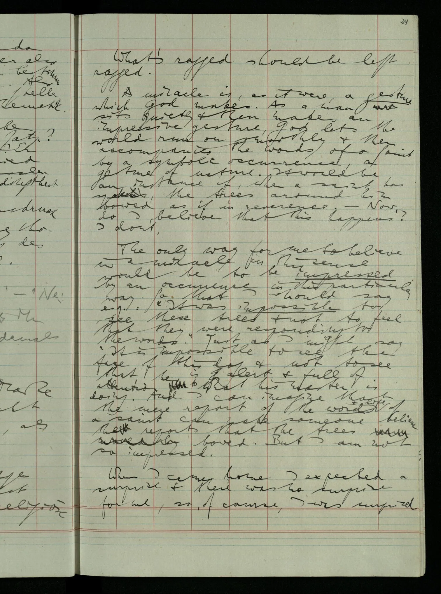 A miracle is, as it were, a gesture which God makes. As a man sits quietly & then makes an impressive gesture, God lets the world run on smoothly & then accompanies the words of a saint by a symbolic occurrence, a gesture of nature. It would be an instance if, when a saint has spoken, the trees around him bowed as if in reverence. – Now do I believe that this happens? I don’t.