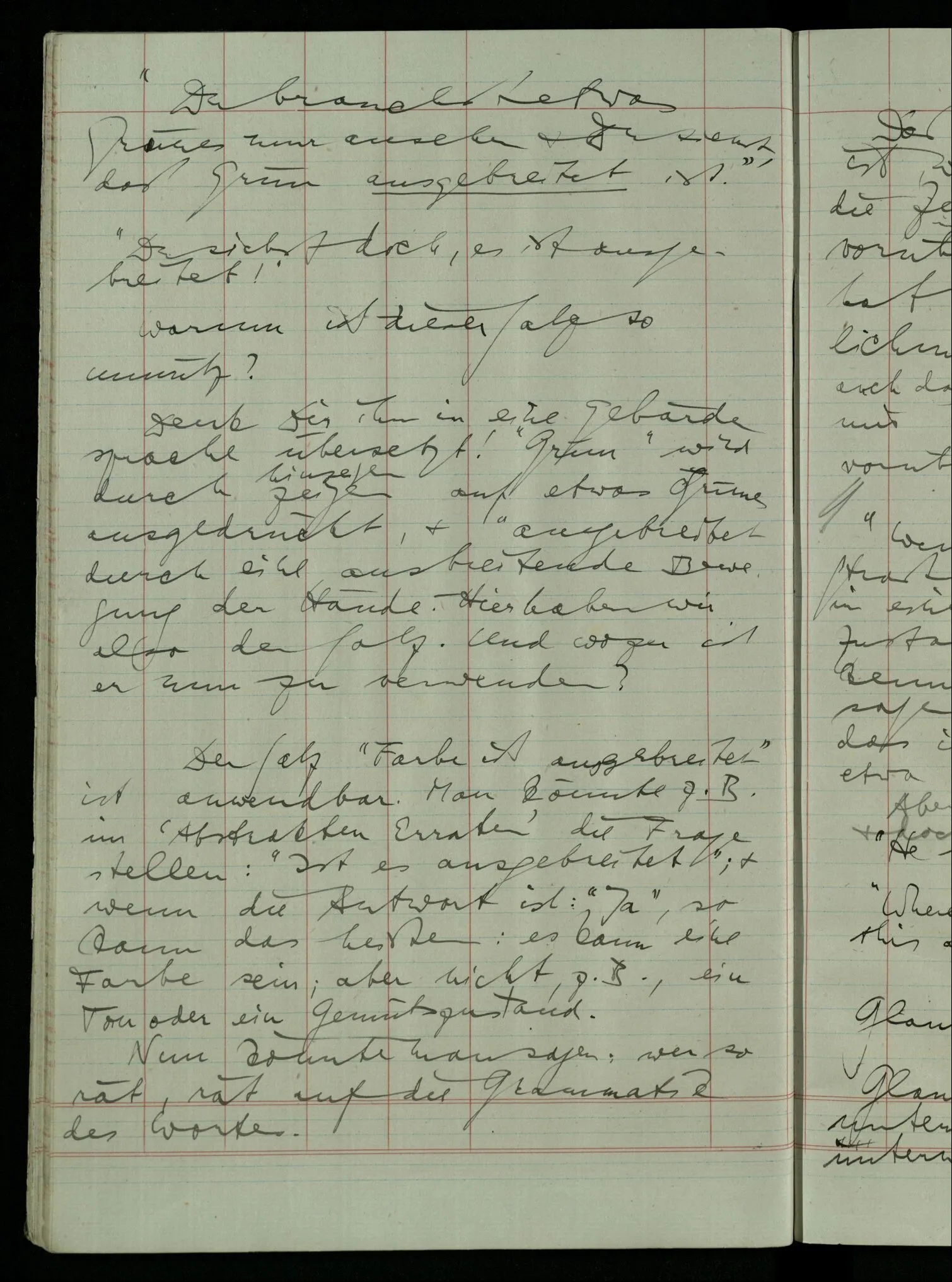 Der Satz “Farbe ist ausgebreitet” ist anwendbar. Man könnte z.B. im ‘Abstrakten Erraten’ die Frage stellen: “Ist es ausgebreitet”; & wenn die Antwort ist: “Ja”, so kann das heißen: es kann eine Farbe sein; aber nicht, z.B., ein Ton oder ein Gemütszustand.