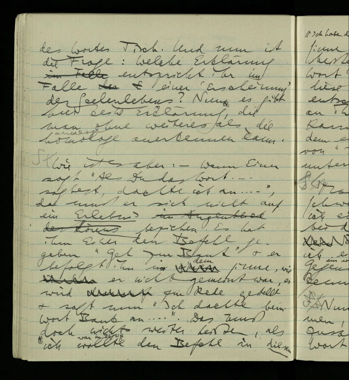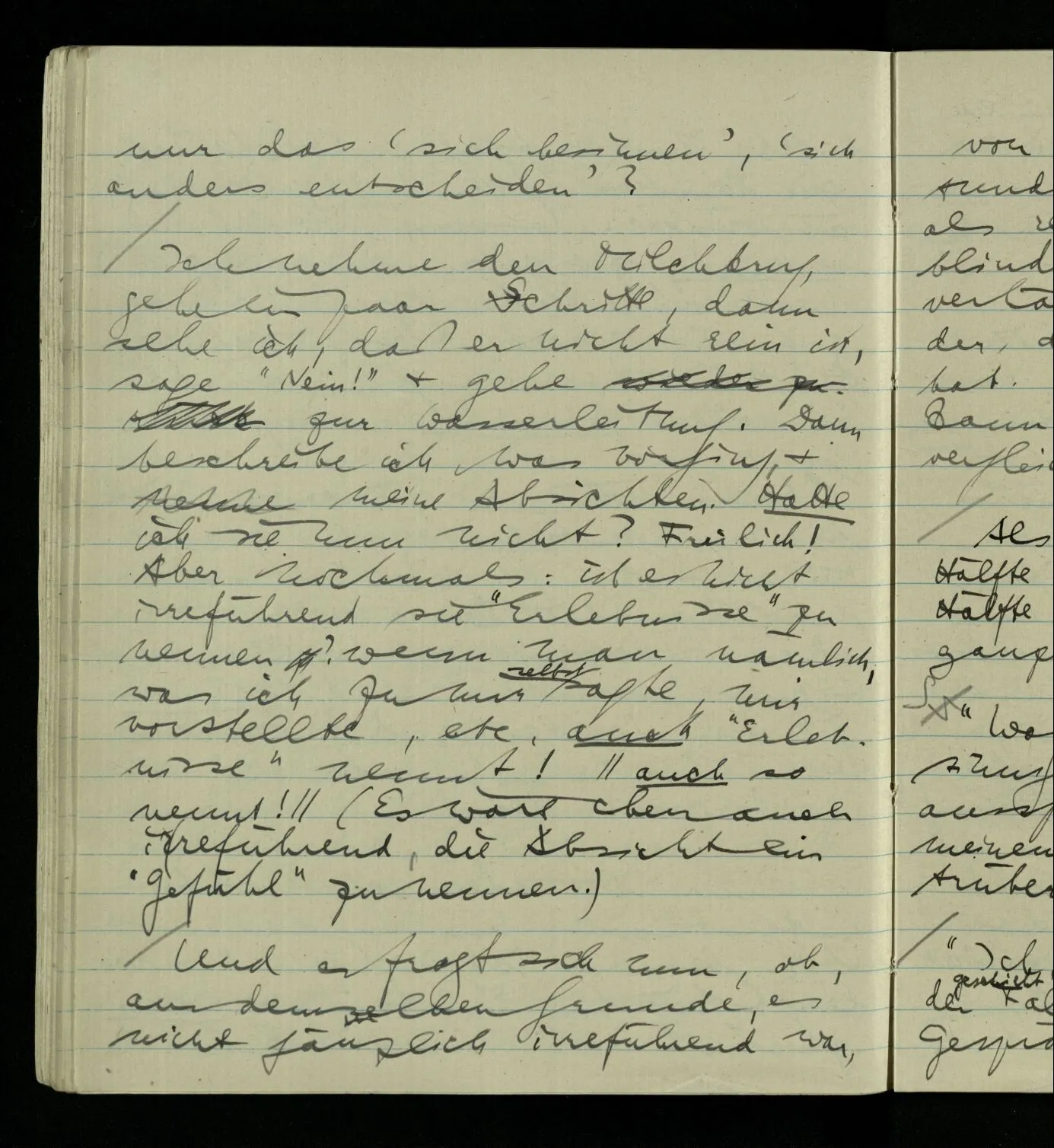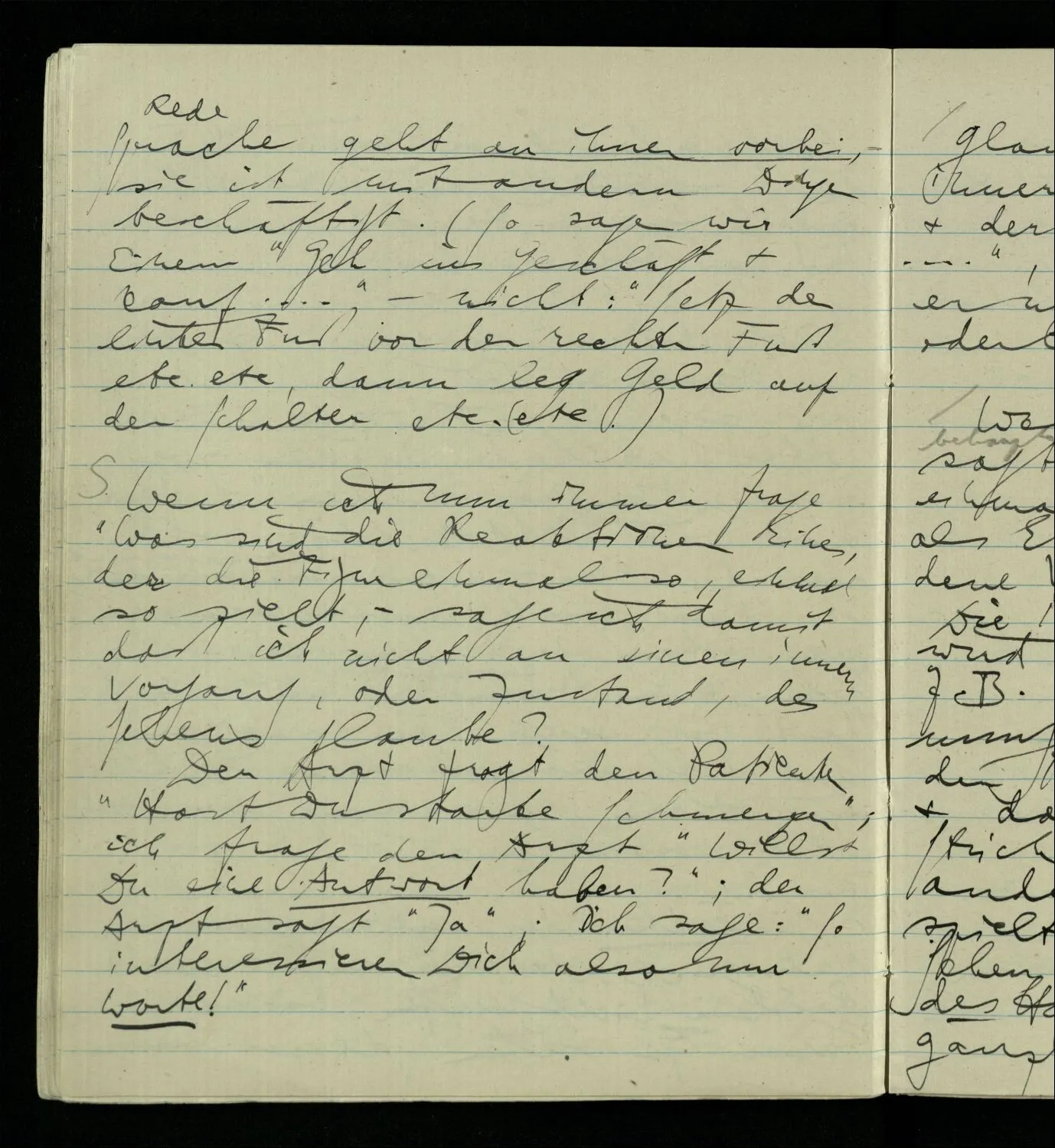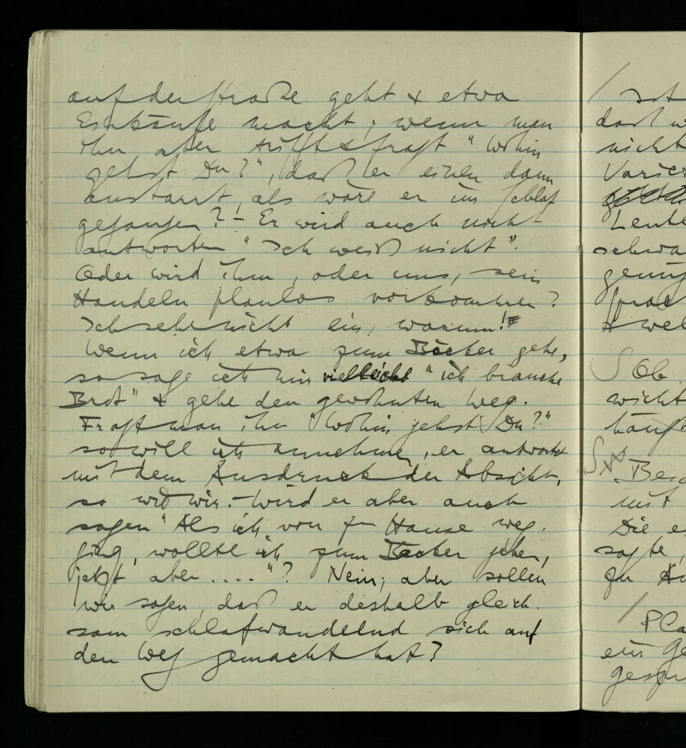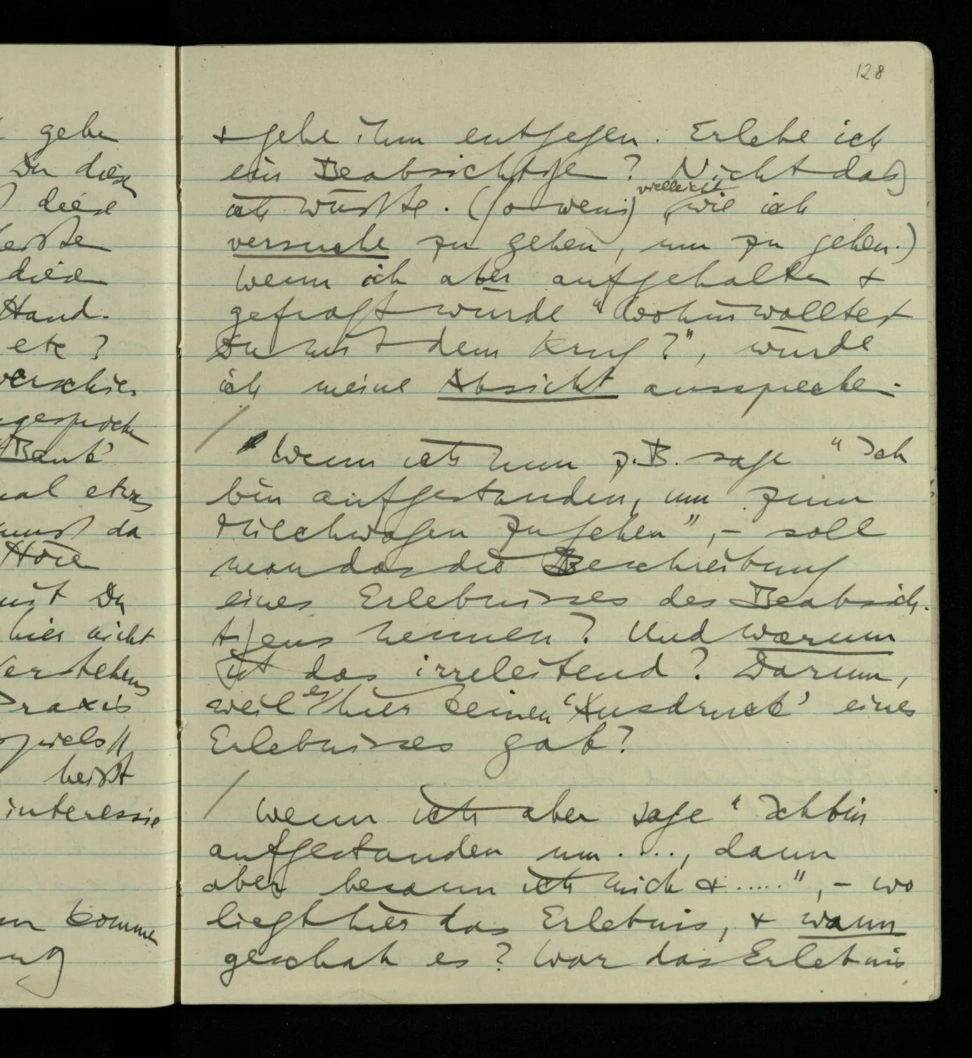 Im Gerichtssaal: “Hatten Sie die Absicht, zu ihm zu gehen, oder gingst Du nur zufällig an seinem Hause vorbei?” Wann hatte ich nun die Absicht? Auf dem ganzen Wege? Oder als ich mir sagte ‘ich will zu ihm gehen’? – Und als ich mir’s sagte, was geschah da in meinem Innern? Oder geschah nichts? – Wie sieht das aus, wenn nichts geschieht?