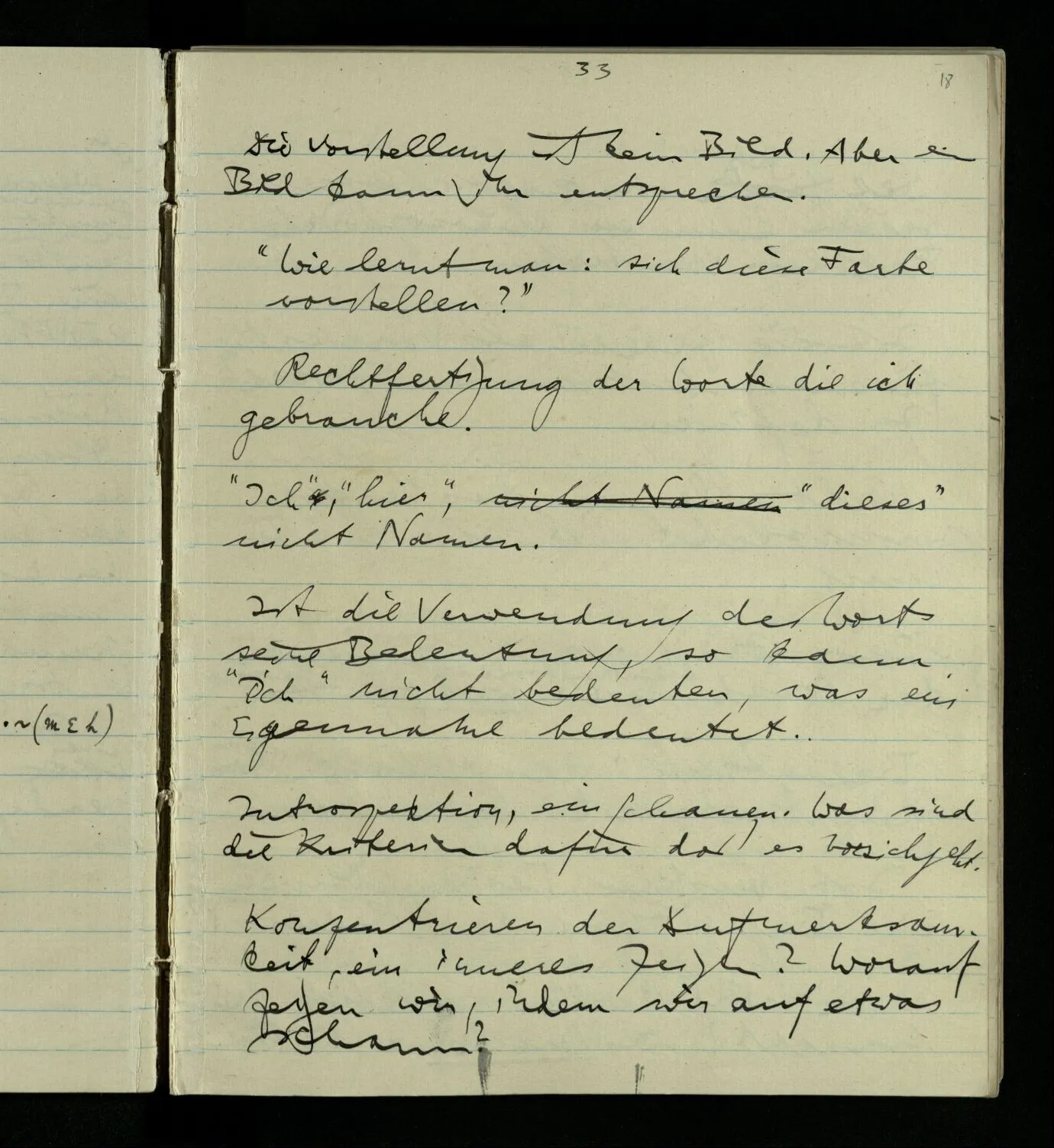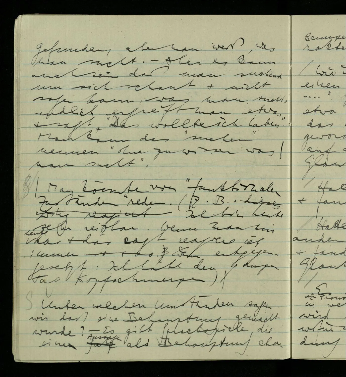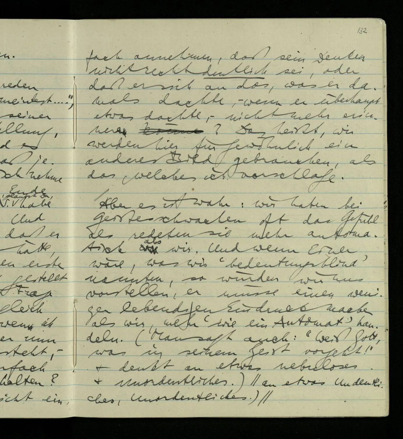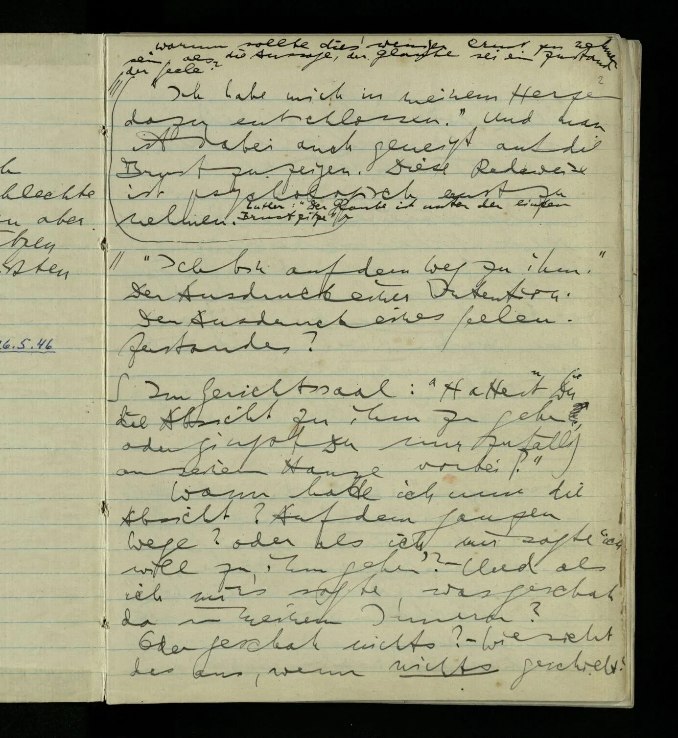 Im Gerichtssaal: “Hatten Sie die Absicht, zu ihm zu gehen, oder gingst Du nur zufällig an seinem Hause vorbei?” Wann hatte ich nun die Absicht? Auf dem ganzen Wege? Oder als ich mir sagte ‘ich will zu ihm gehen’? – Und als ich mir’s sagte, was geschah da in meinem Innern? Oder geschah nichts? – Wie sieht das aus, wenn nichts geschieht?