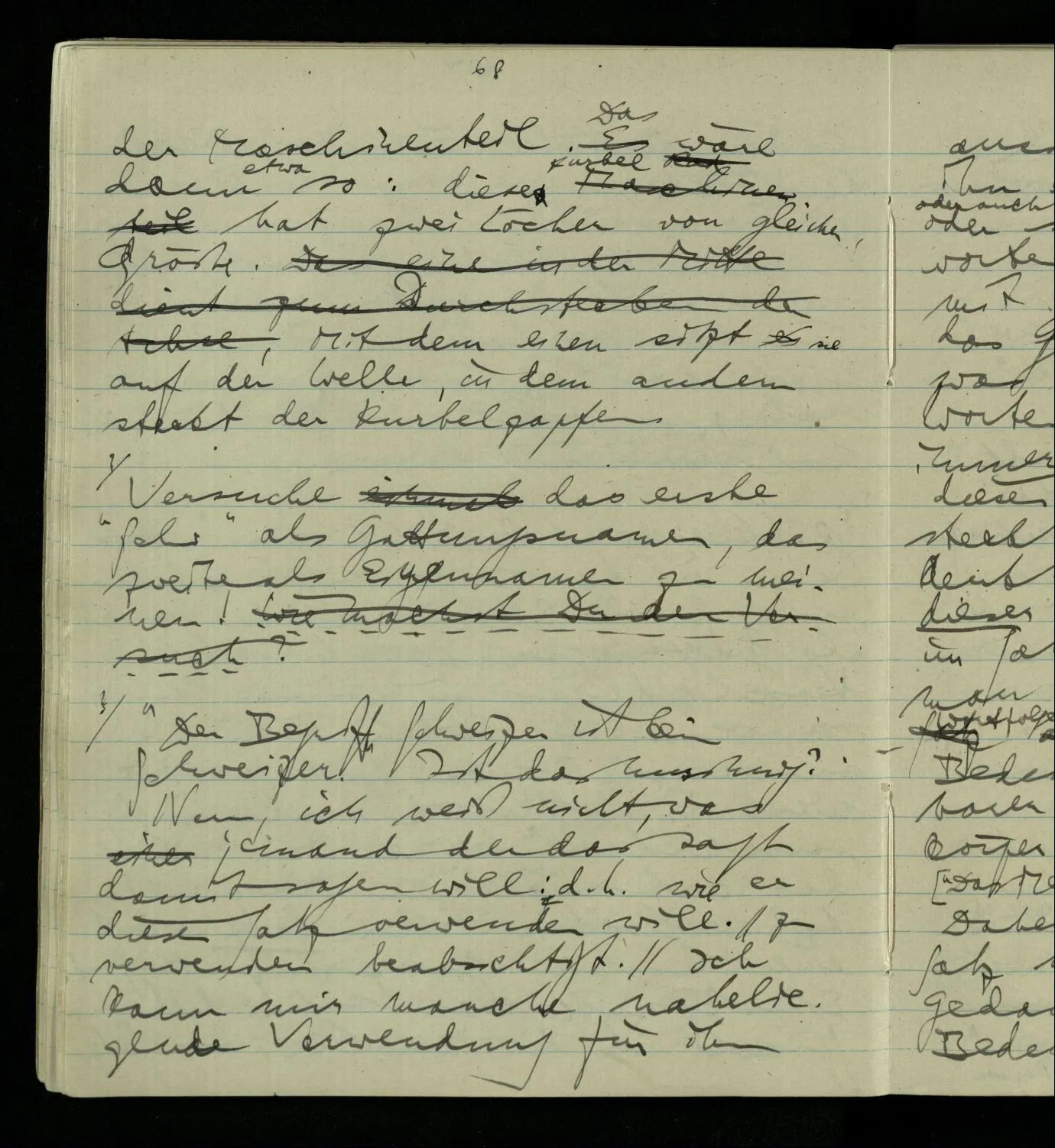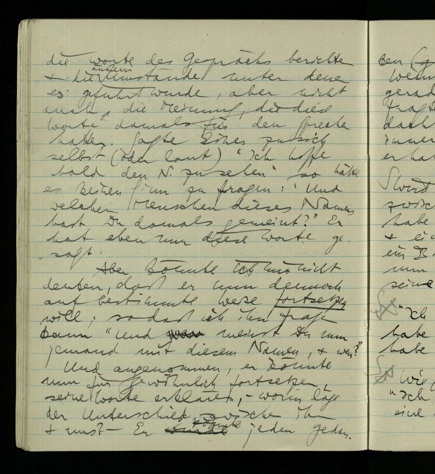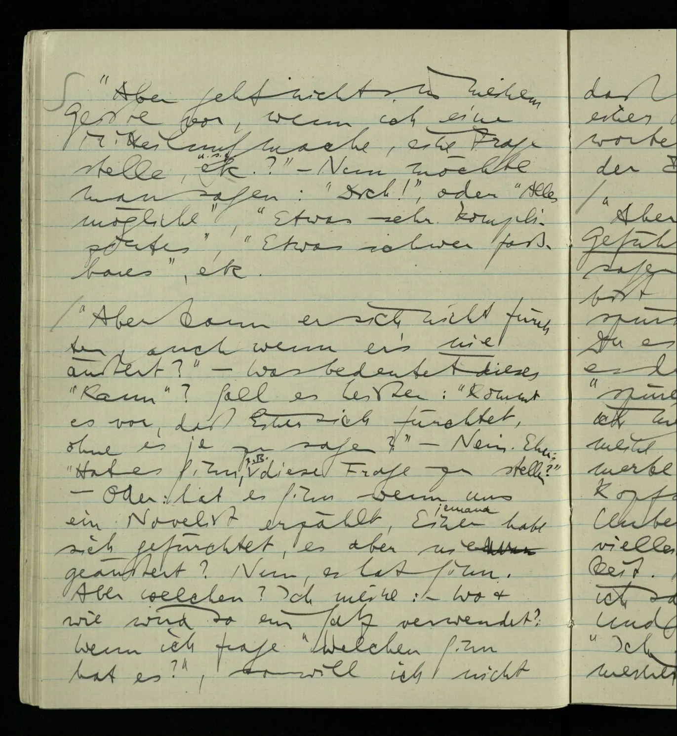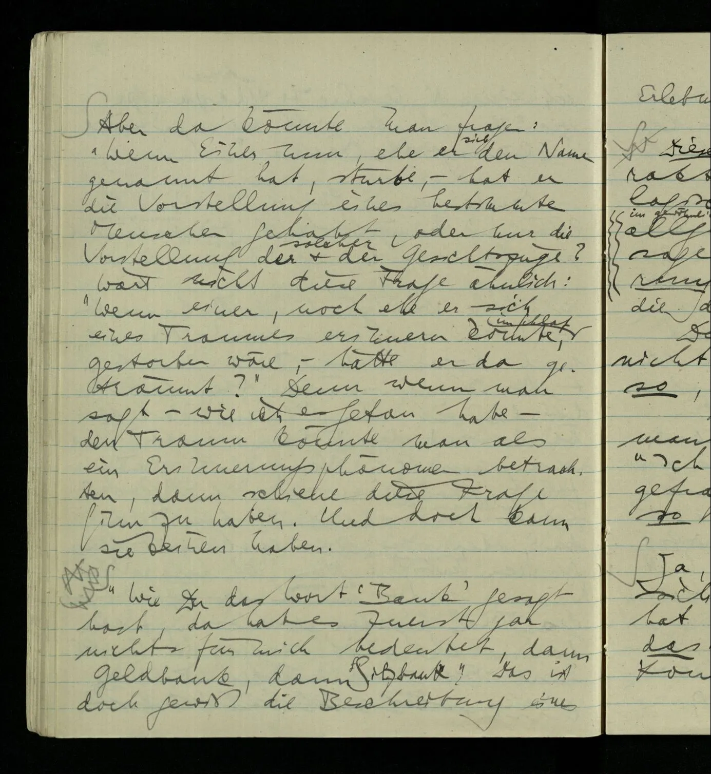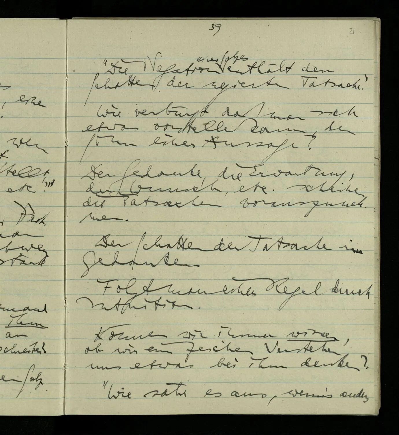 Im Gerichtssaal: “Hatten Sie die Absicht, zu ihm zu gehen, oder gingst Du nur zufällig an seinem Hause vorbei?” Wann hatte ich nun die Absicht? Auf dem ganzen Wege? Oder als ich mir sagte ‘ich will zu ihm gehen’? – Und als ich mir’s sagte, was geschah da in meinem Innern? Oder geschah nichts? – Wie sieht das aus, wenn nichts geschieht?