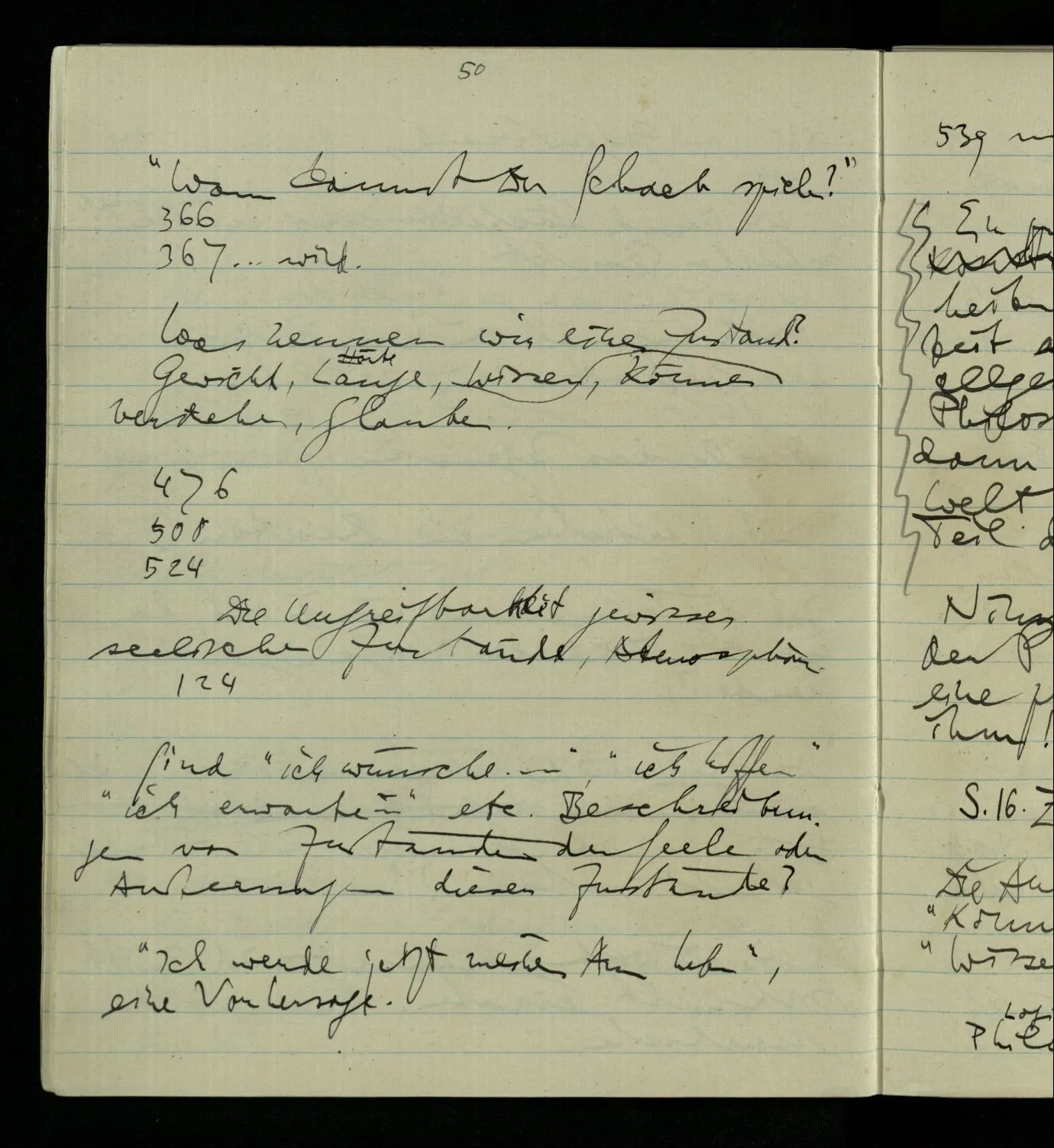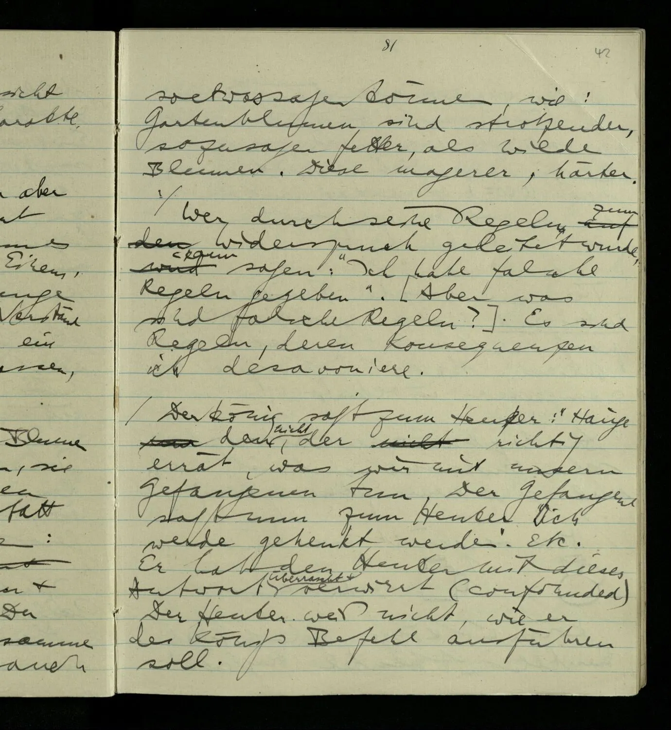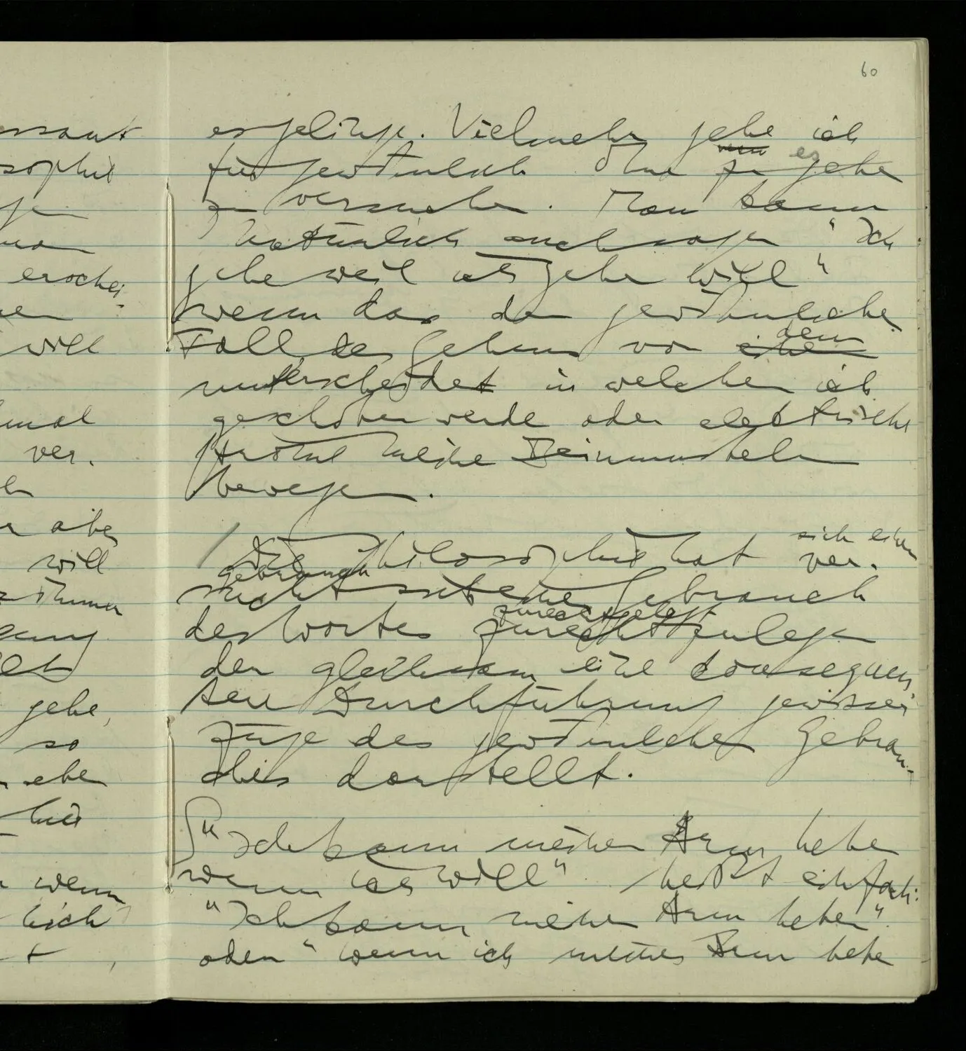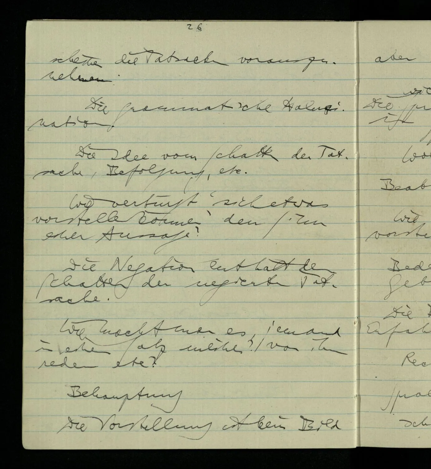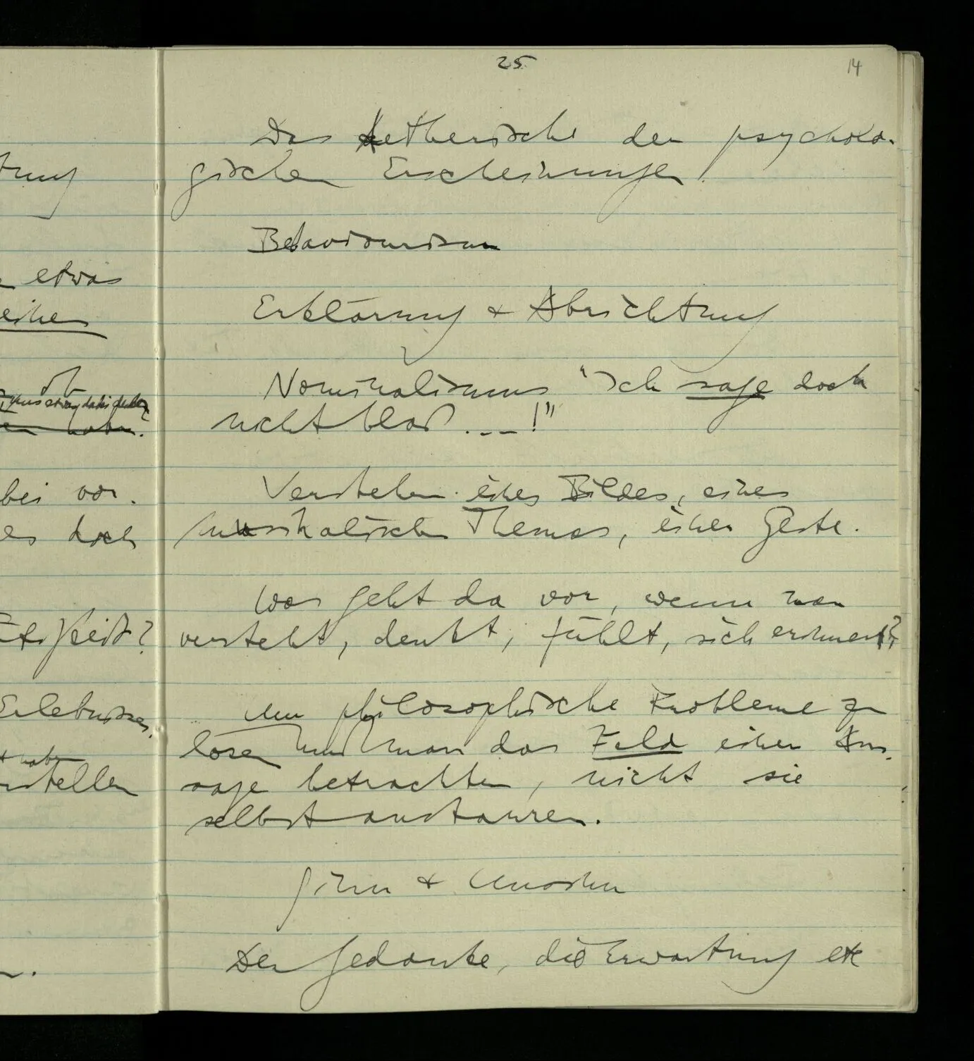 Im Gerichtssaal: “Hatten Sie die Absicht, zu ihm zu gehen, oder gingst Du nur zufällig an seinem Hause vorbei?” Wann hatte ich nun die Absicht? Auf dem ganzen Wege? Oder als ich mir sagte ‘ich will zu ihm gehen’? – Und als ich mir’s sagte, was geschah da in meinem Innern? Oder geschah nichts? – Wie sieht das aus, wenn nichts geschieht?