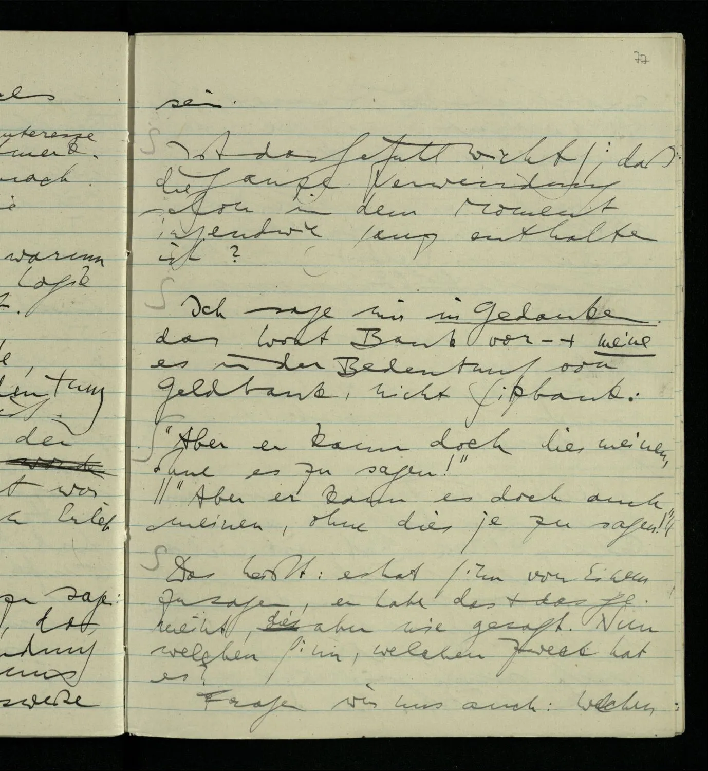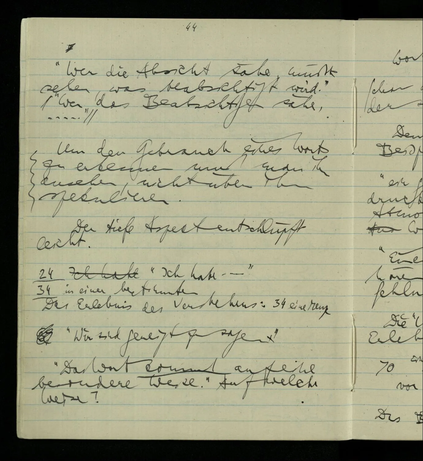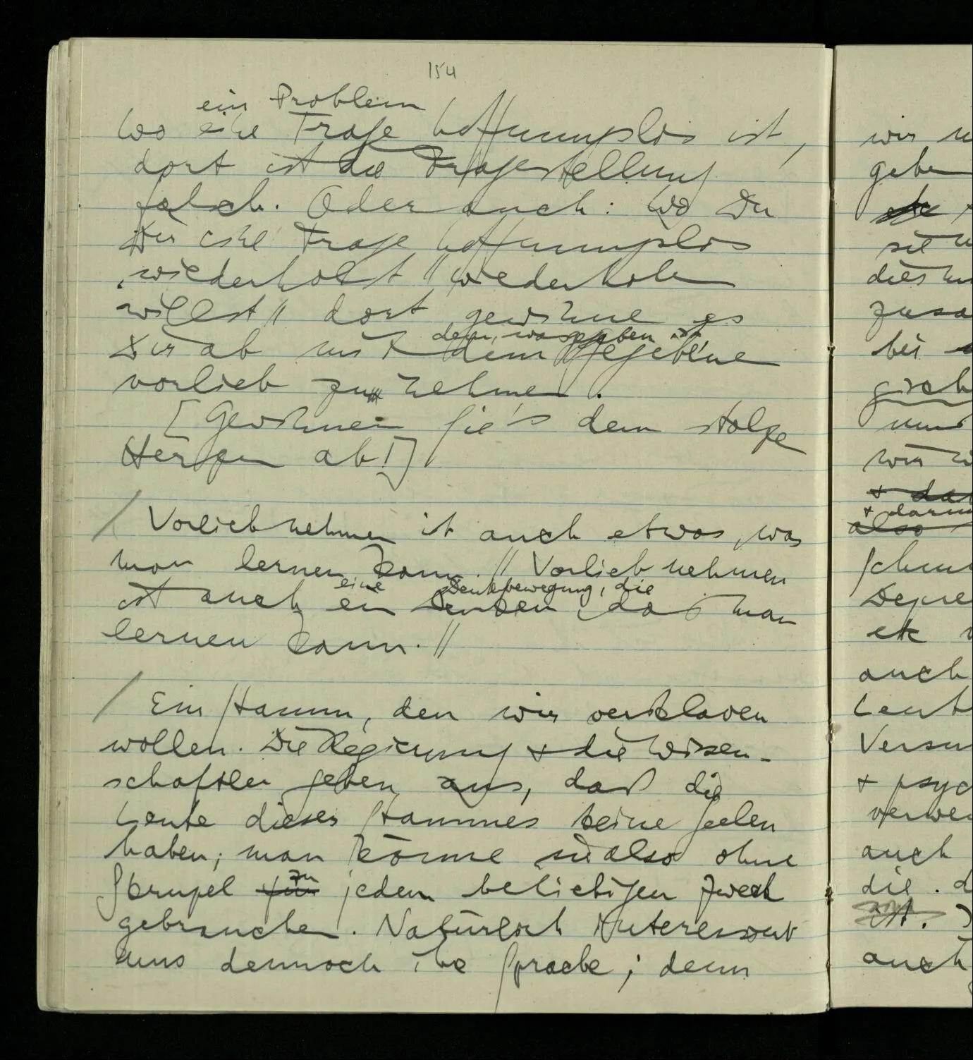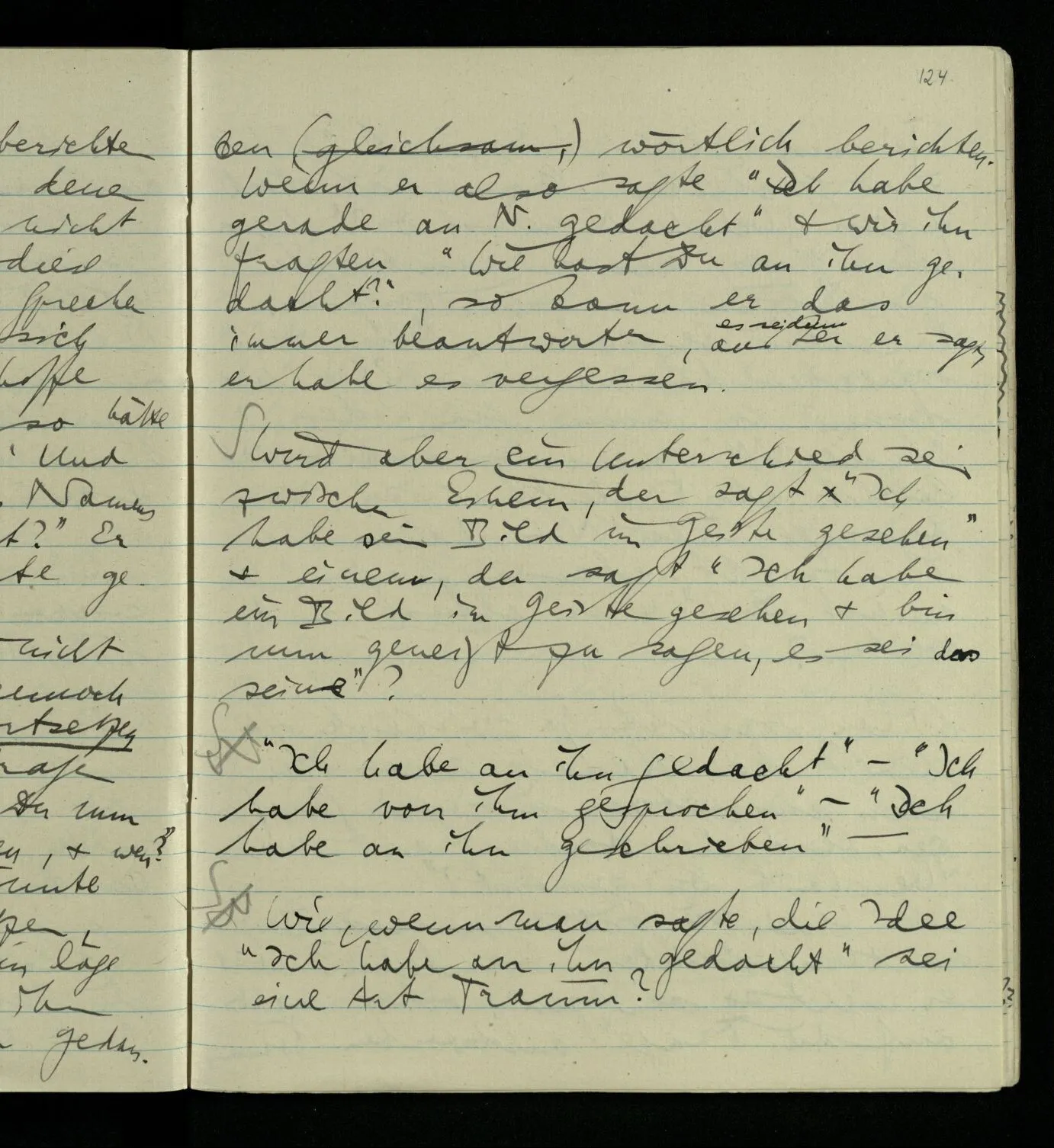 Im Gerichtssaal: “Hatten Sie die Absicht, zu ihm zu gehen, oder gingst Du nur zufällig an seinem Hause vorbei?” Wann hatte ich nun die Absicht? Auf dem ganzen Wege? Oder als ich mir sagte ‘ich will zu ihm gehen’? – Und als ich mir’s sagte, was geschah da in meinem Innern? Oder geschah nichts? – Wie sieht das aus, wenn nichts geschieht?