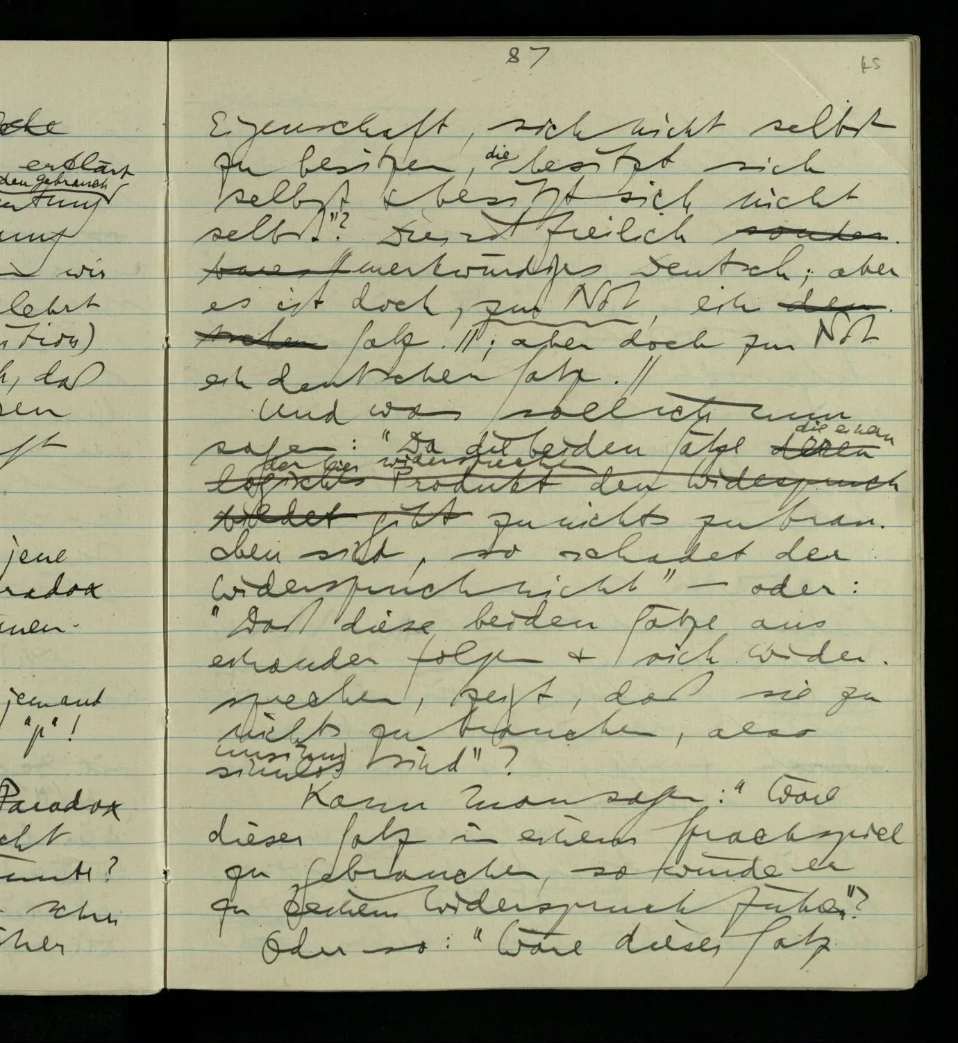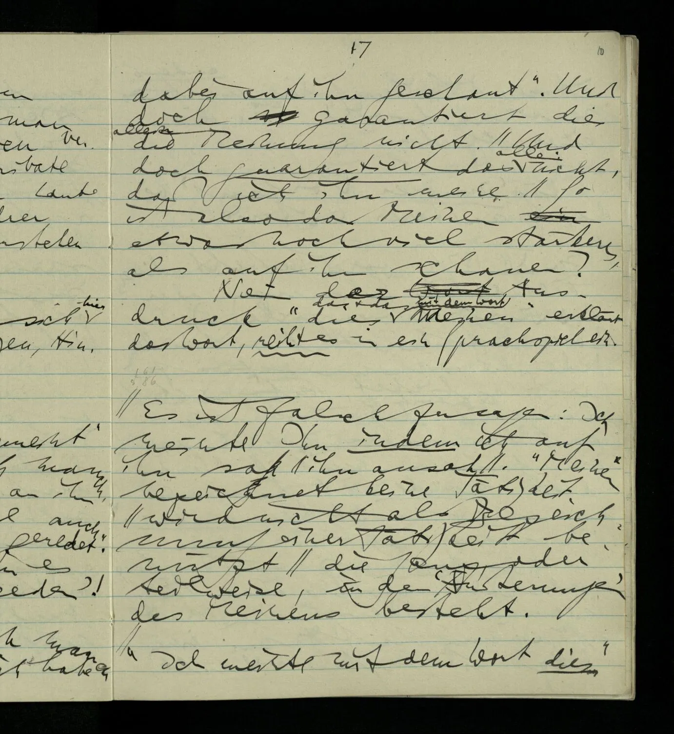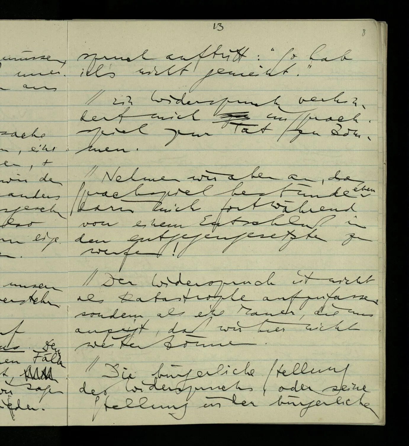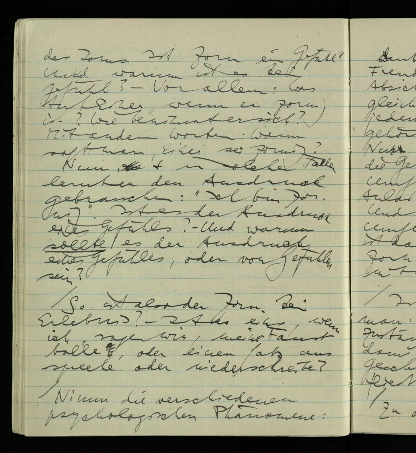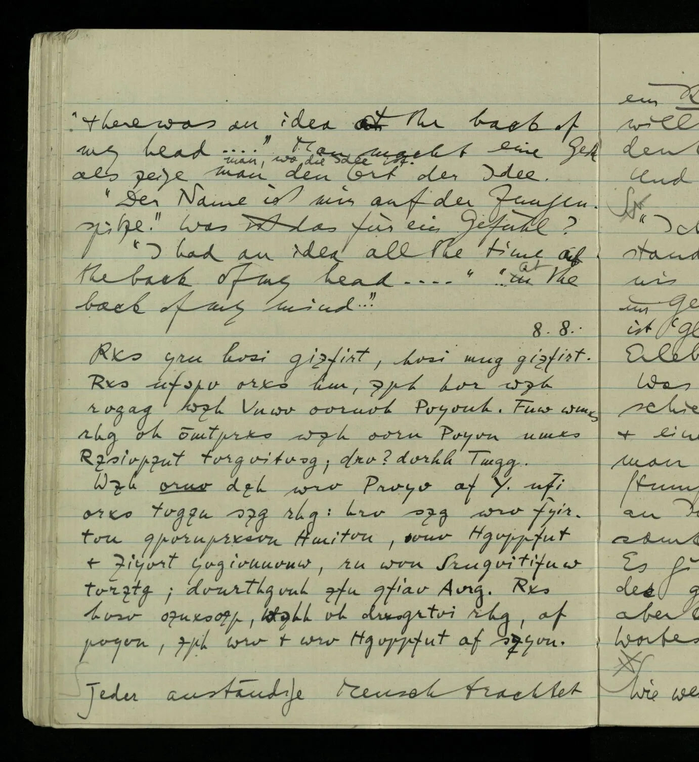 Im Gerichtssaal: “Hatten Sie die Absicht, zu ihm zu gehen, oder gingst Du nur zufällig an seinem Hause vorbei?” Wann hatte ich nun die Absicht? Auf dem ganzen Wege? Oder als ich mir sagte ‘ich will zu ihm gehen’? – Und als ich mir’s sagte, was geschah da in meinem Innern? Oder geschah nichts? – Wie sieht das aus, wenn nichts geschieht?