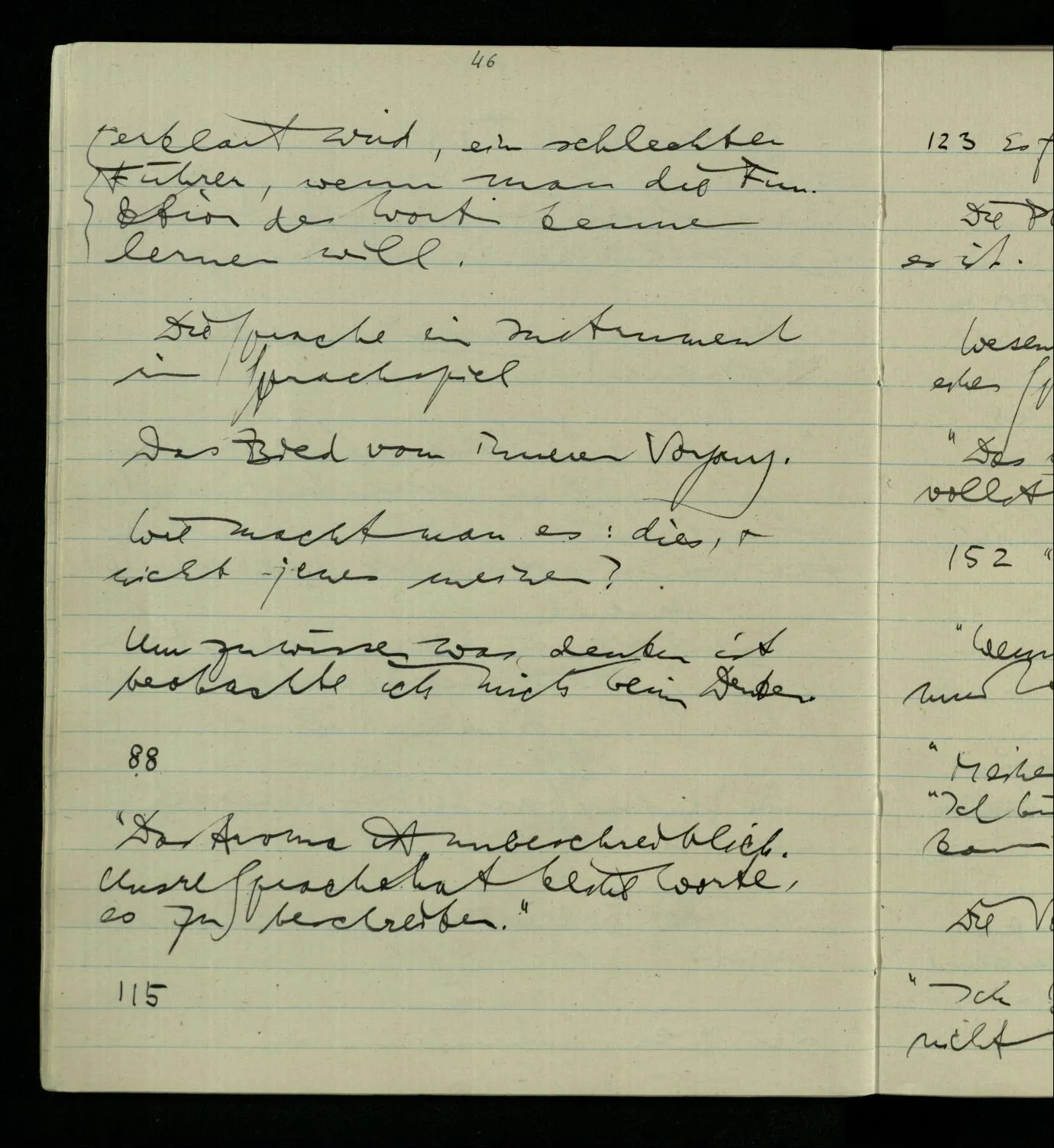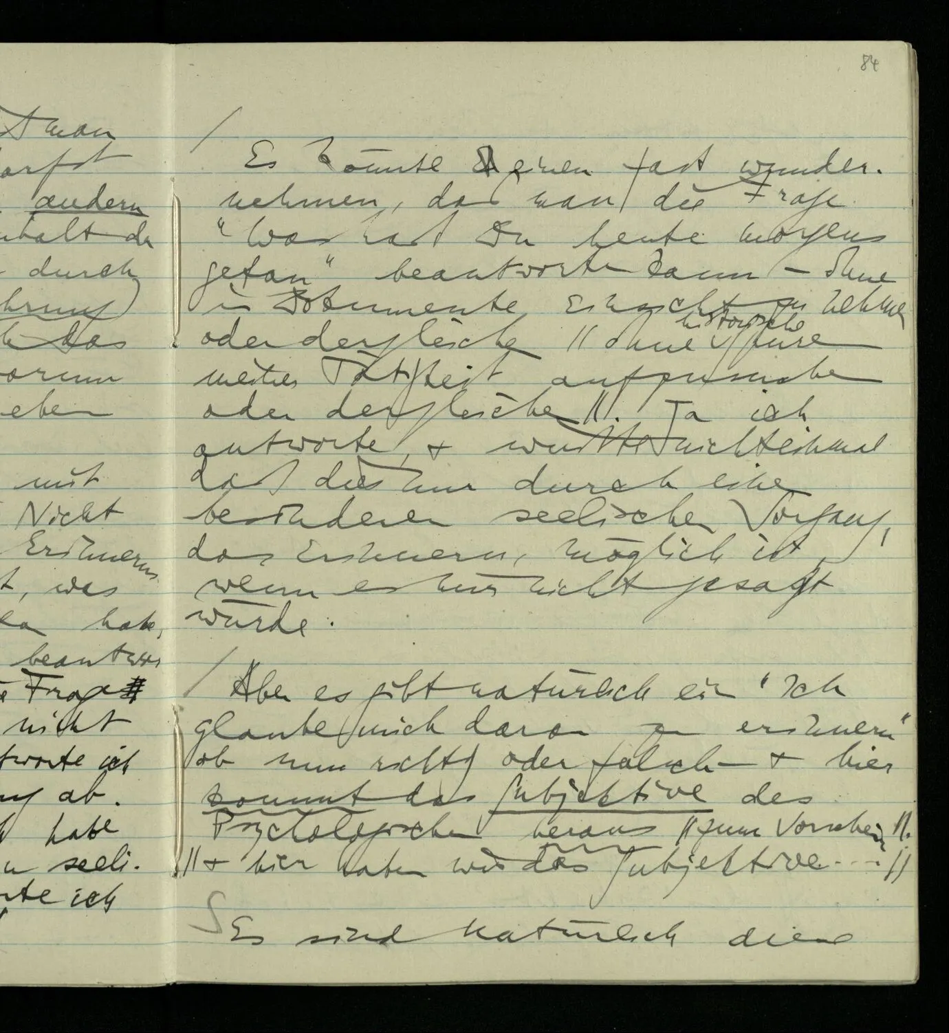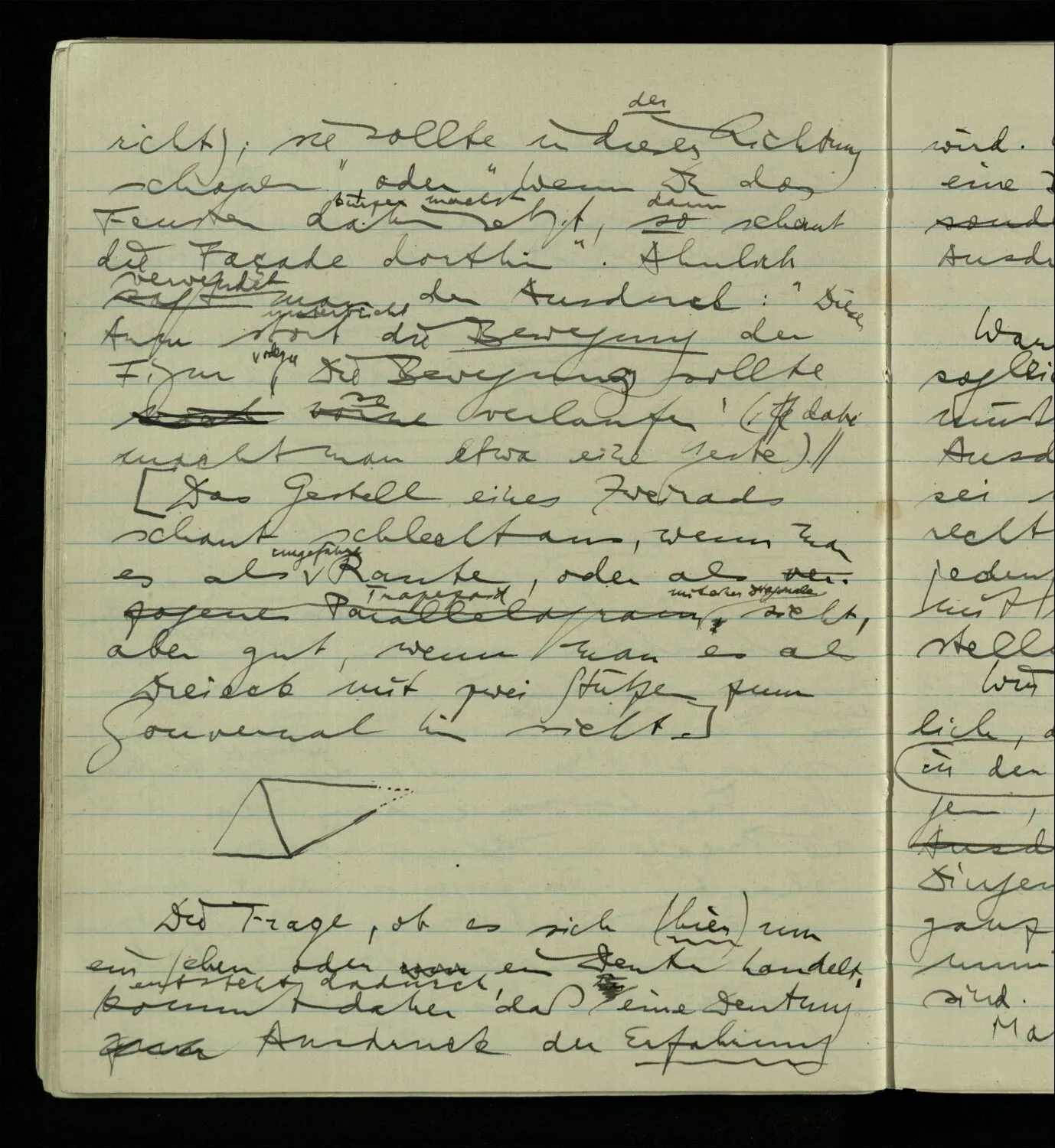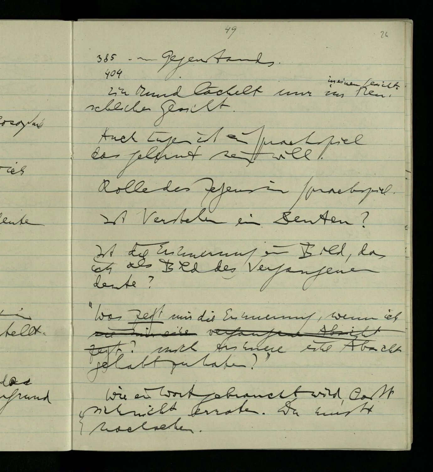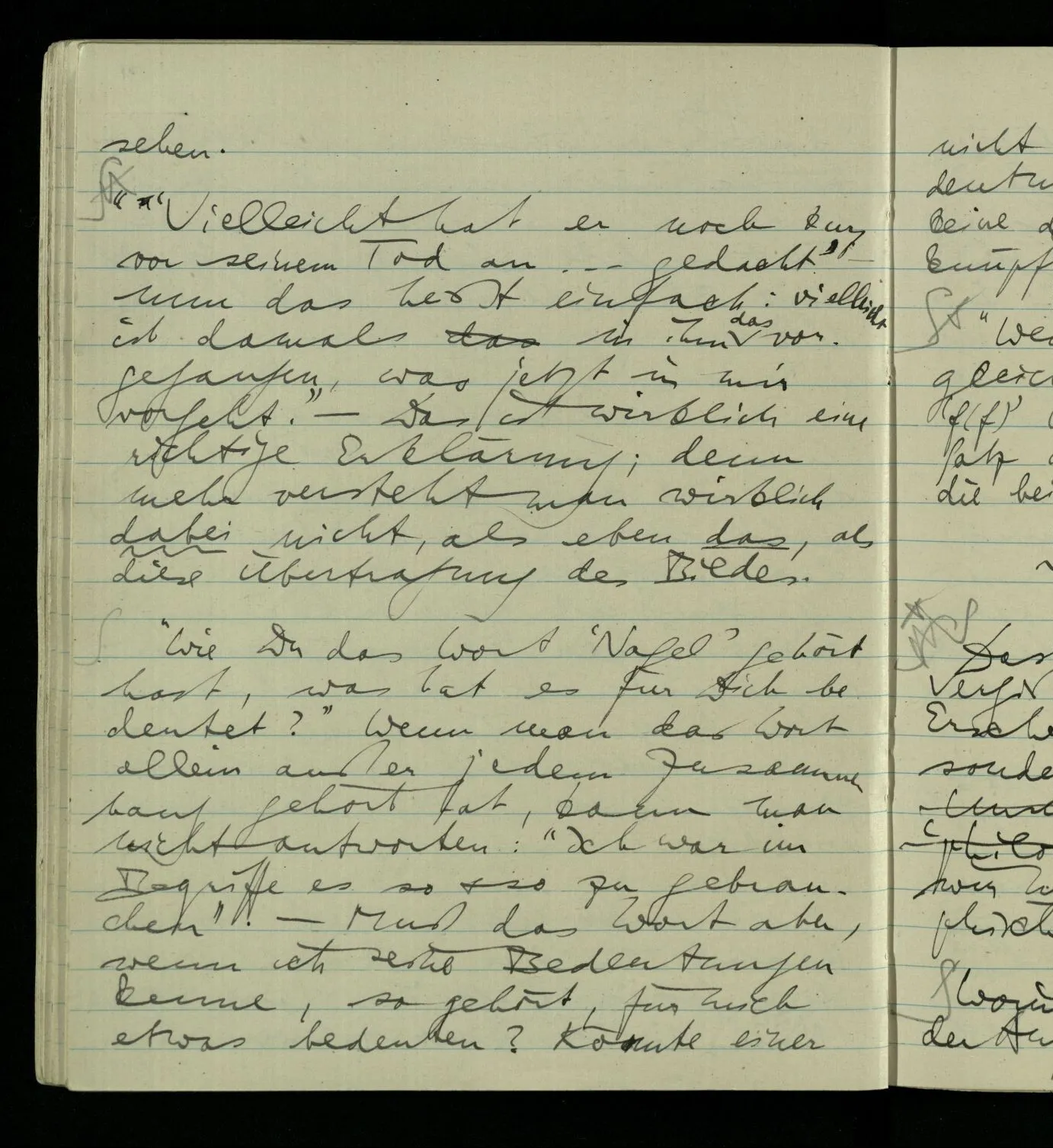Im Gerichtssaal: “Hatten Sie die Absicht, zu ihm zu gehen, oder gingst Du nur zufällig an seinem Hause vorbei?” Wann hatte ich nun die Absicht? Auf dem ganzen Wege? Oder als ich mir sagte ‘ich will zu ihm gehen’? – Und als ich mir’s sagte, was geschah da in meinem Innern? Oder geschah nichts? – Wie sieht das aus, wenn nichts geschieht?