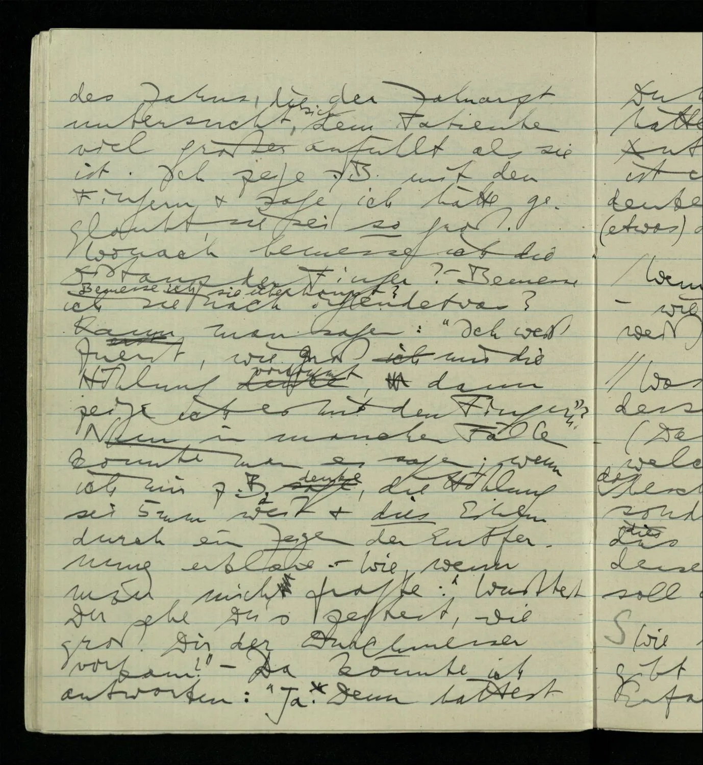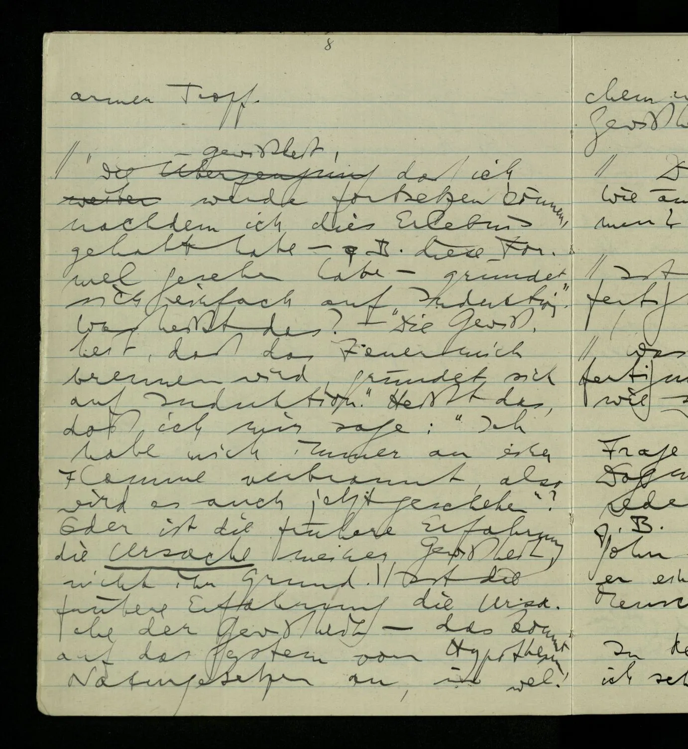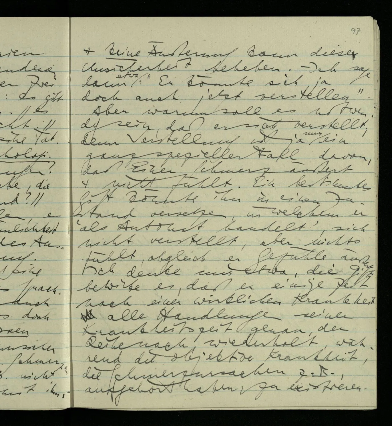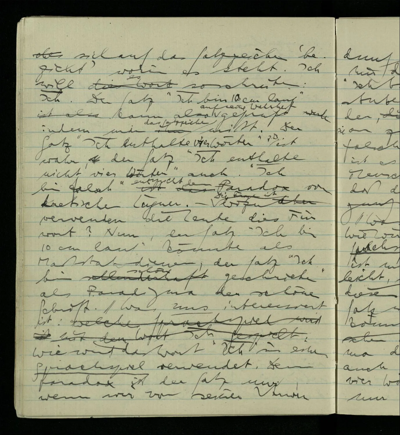 Im Gerichtssaal: “Hatten Sie die Absicht, zu ihm zu gehen, oder gingst Du nur zufällig an seinem Hause vorbei?” Wann hatte ich nun die Absicht? Auf dem ganzen Wege? Oder als ich mir sagte ‘ich will zu ihm gehen’? – Und als ich mir’s sagte, was geschah da in meinem Innern? Oder geschah nichts? – Wie sieht das aus, wenn nichts geschieht?