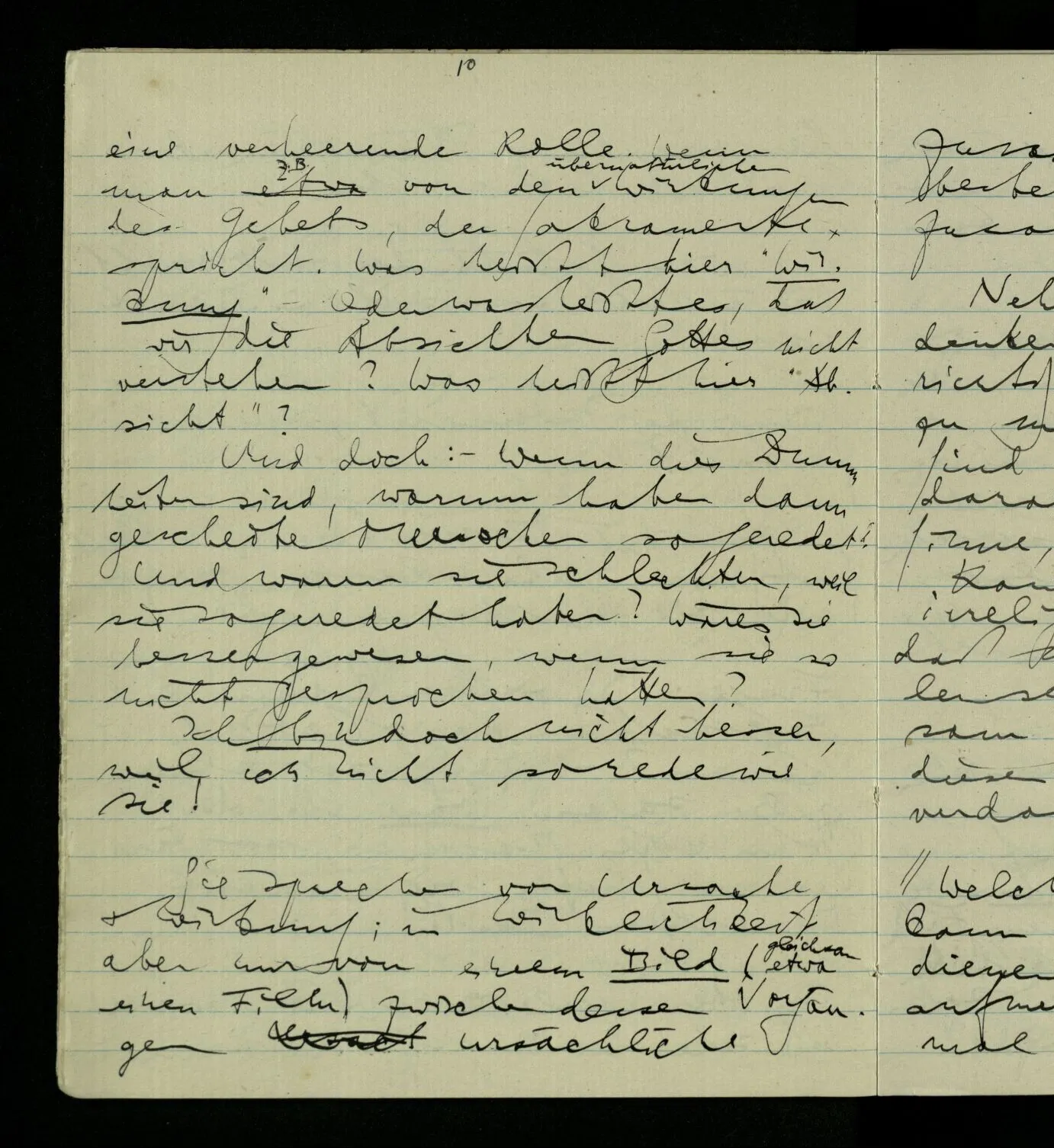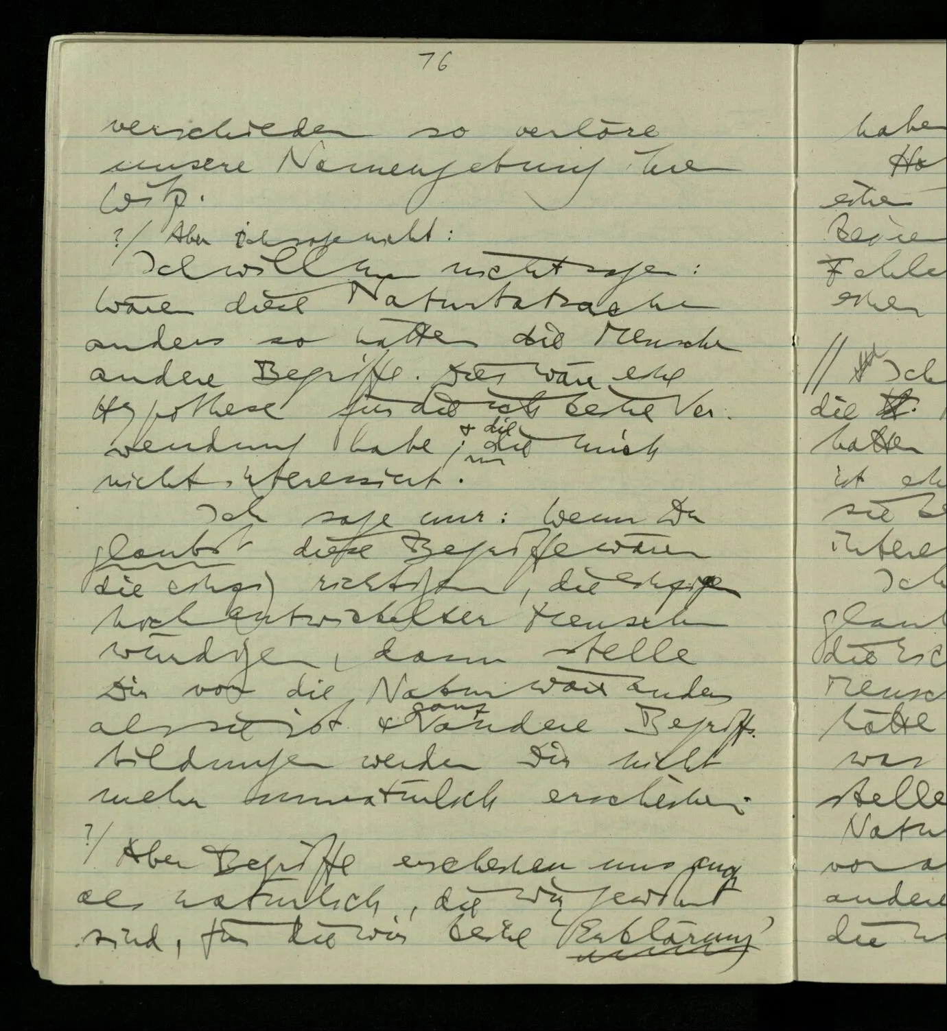 In der Theologie spielt, soviel ich sehe, der Begriff der Kausalität eine verheerende Rolle. Wenn man z.B. von den übernatürlichen Wirkungen des Gebets, der Sakramente spricht. Was heißt hier “Wirkung” – Oder was heißt es, daß wir die Absichten Gottes nicht verstehen? Was heißt hier “Absicht”? Und doch: – Wenn dies Dummheiten sind, warum haben dann gescheite Menschen so geredet? Und waren sie schlechter, weil sie so geredet haben? Wären sie besser gewesen, wenn sie so nicht gesprochen hätten? Ich bin doch nicht besser, weil ich nicht so rede wie sie!