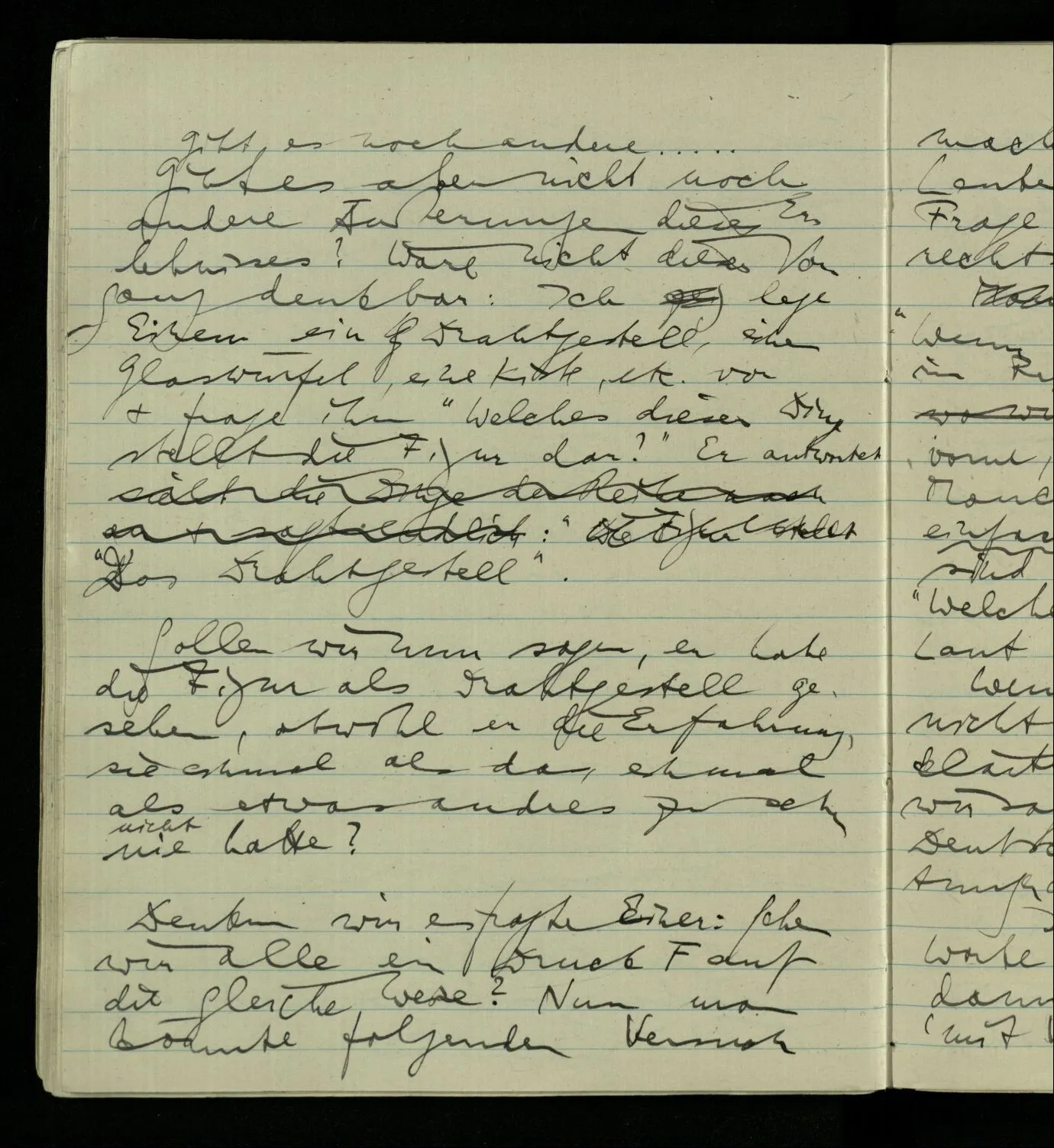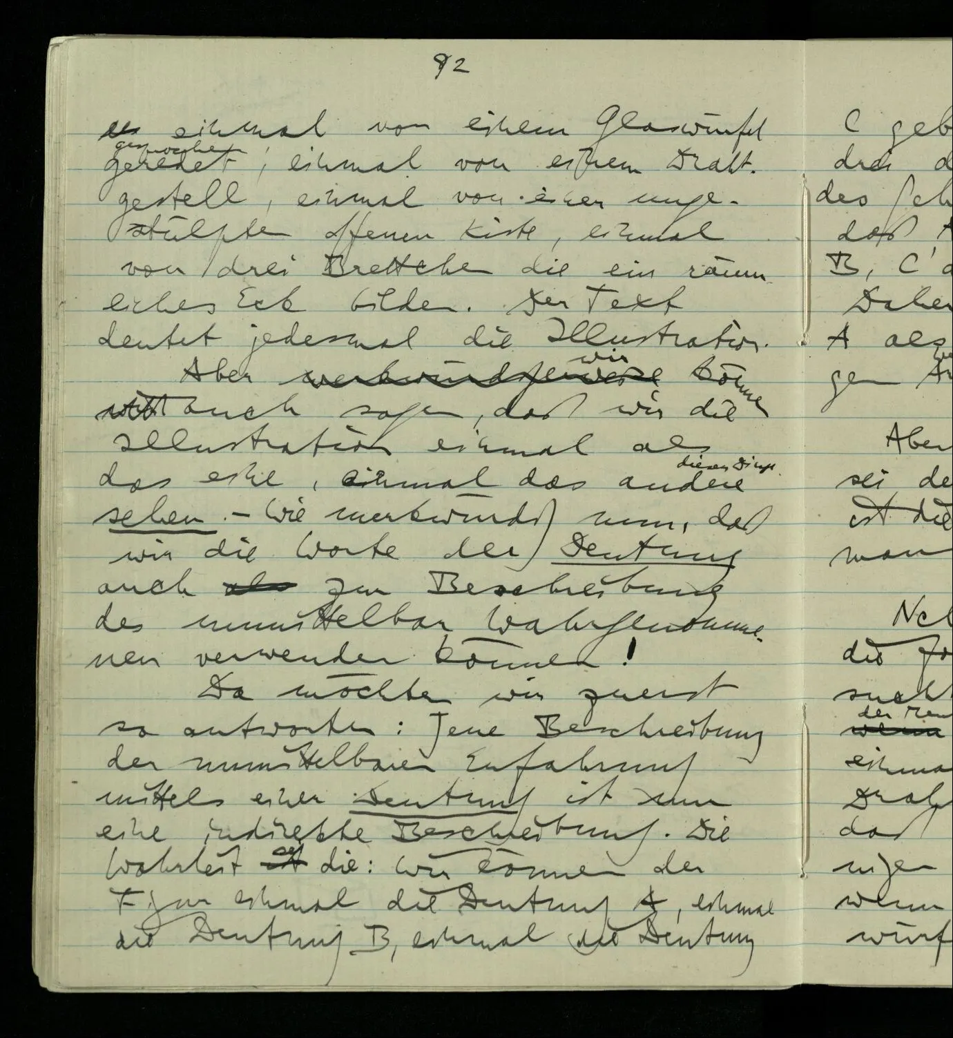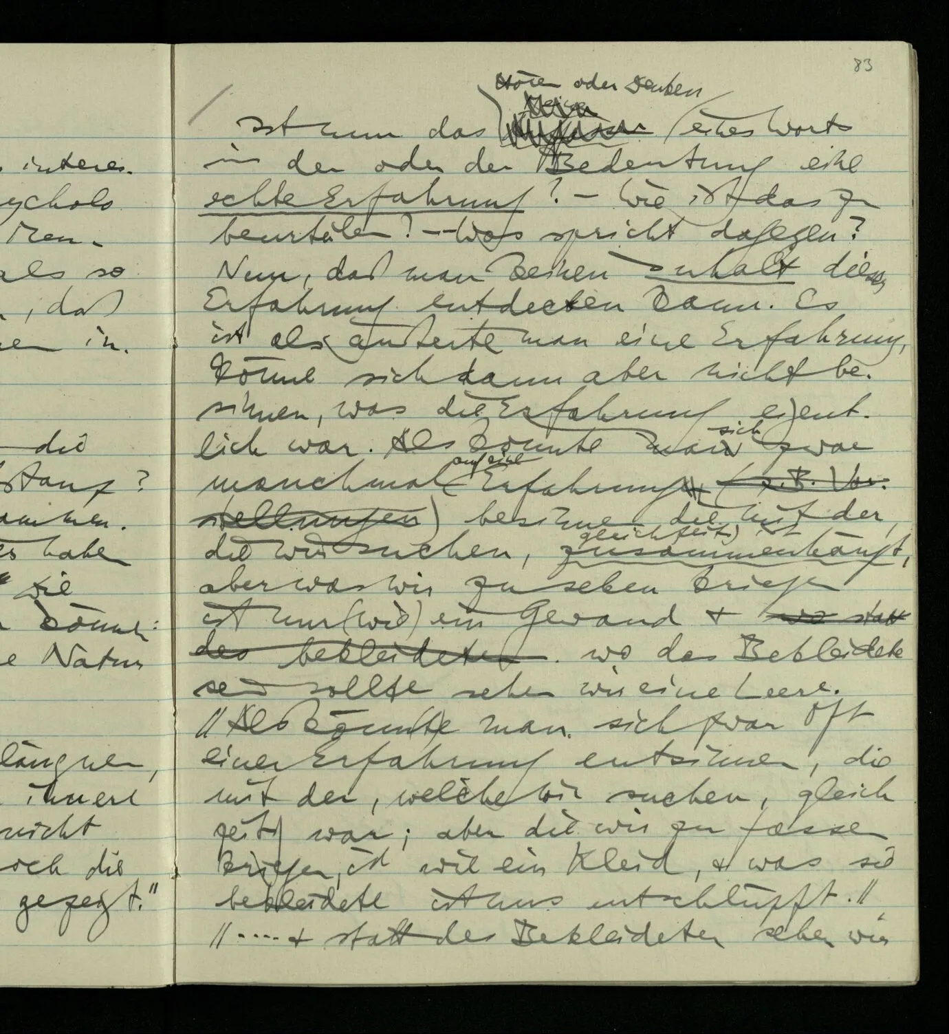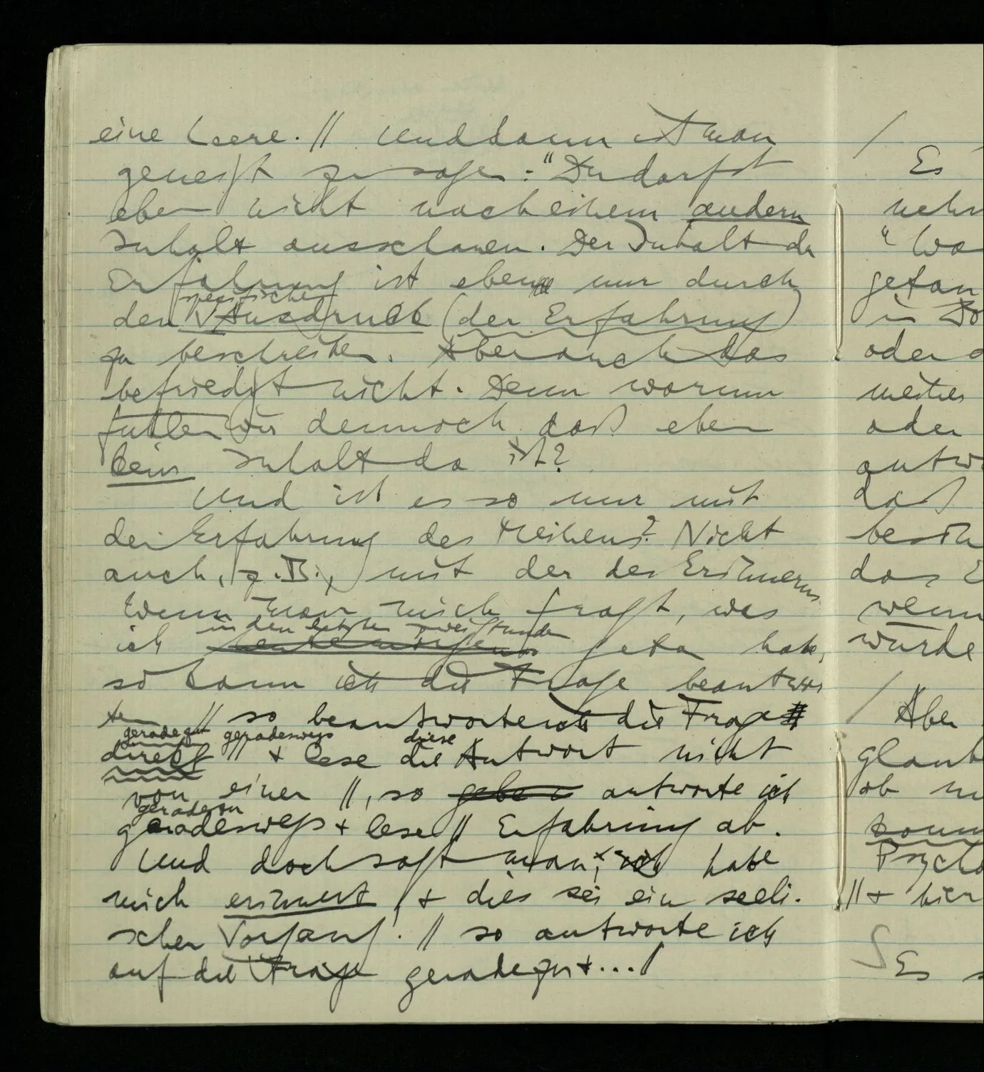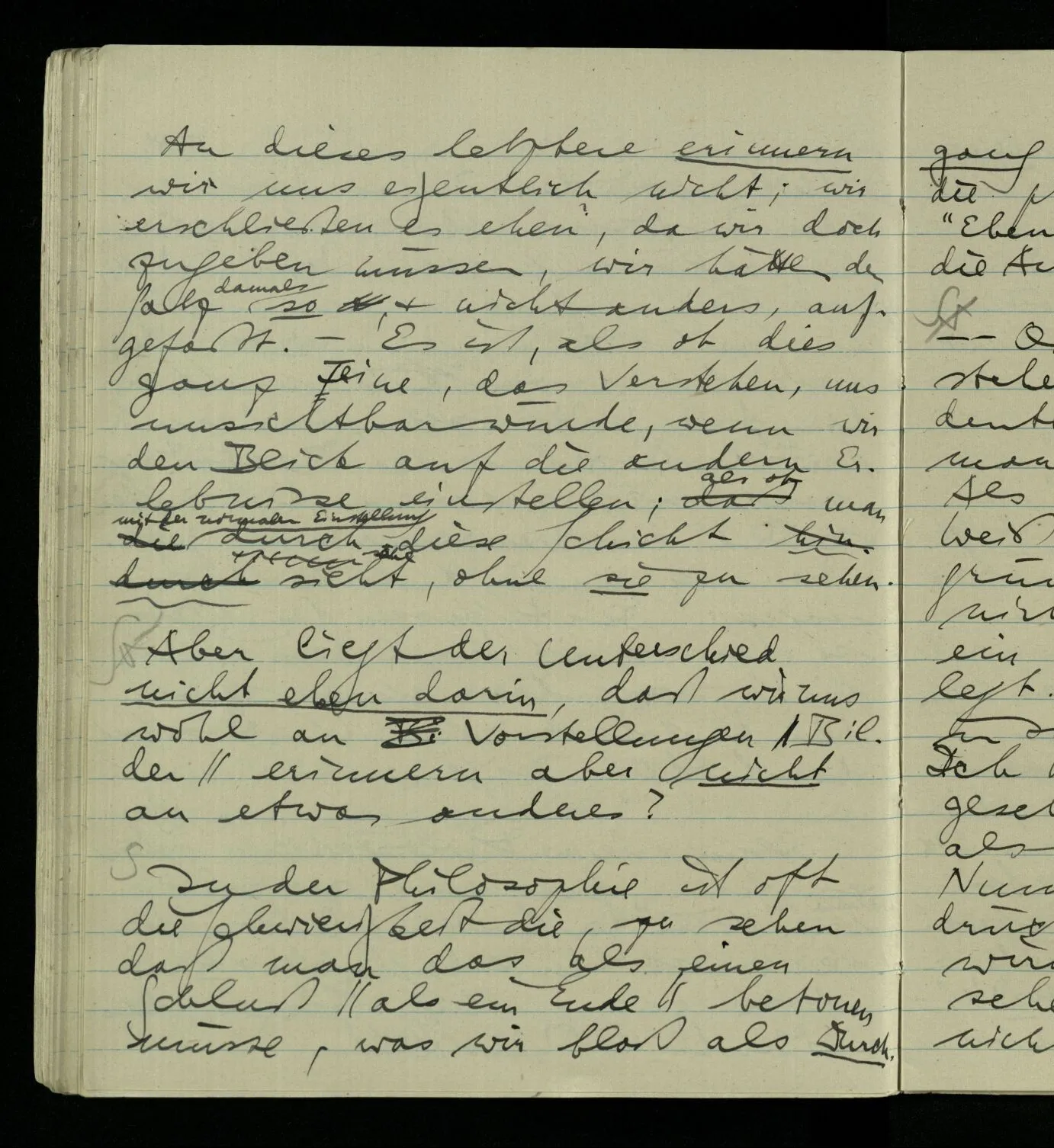 An dieses letztere erinnern wir uns eigentlich nicht; wir erschließen es eben, da wir doch zugeben müssen, wir hätten den Satz damals so, & nicht anders, aufgefaßt. – Es ist, als ob dies ganz Feine, das Verstehen, uns unsichtbar würde, wenn wir den Blick auf die andern Erlebnisse einstellen; als ob man mit der normalen Einstellung durch diese Schicht sieht, ohne sie zu sehen.