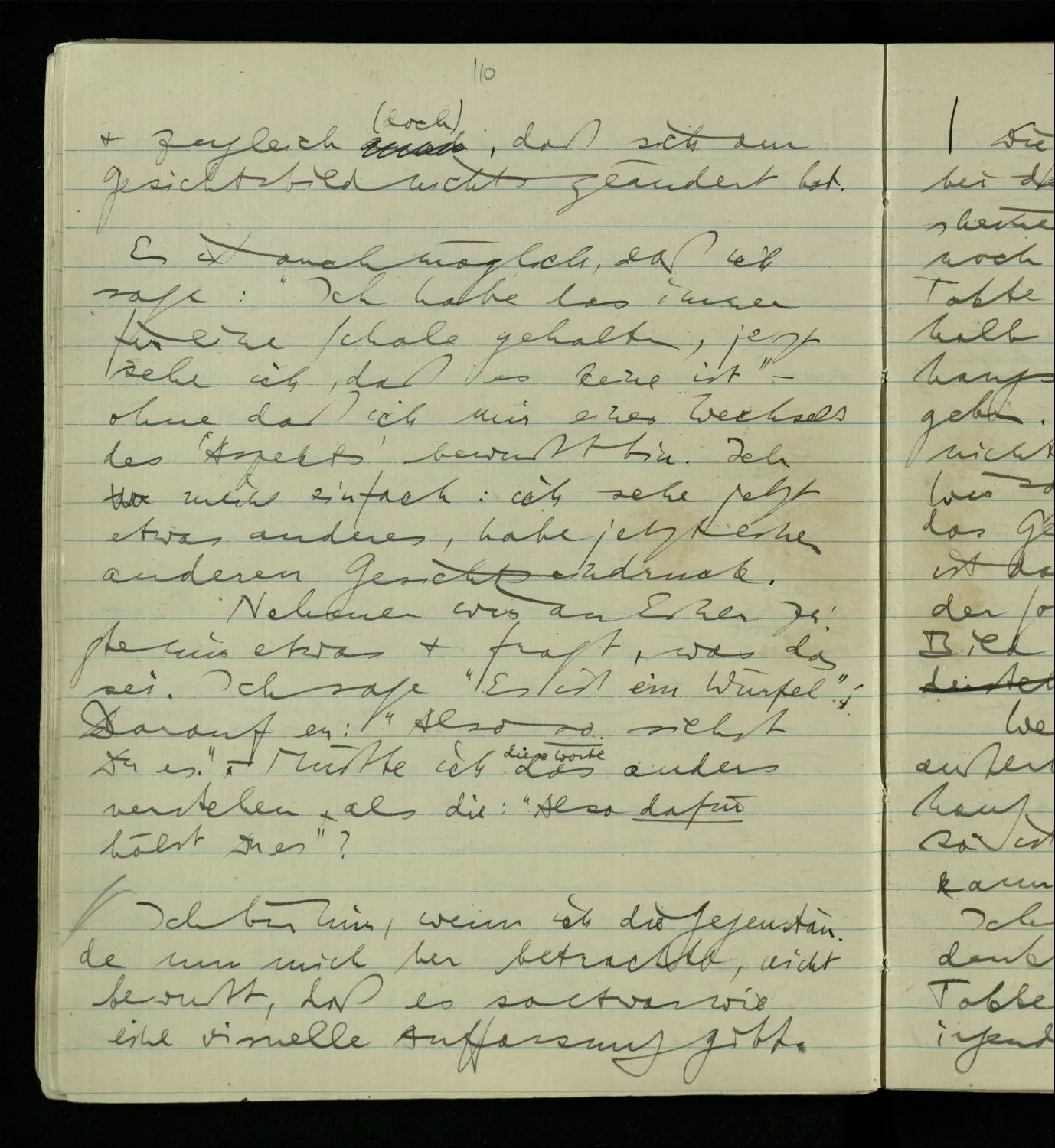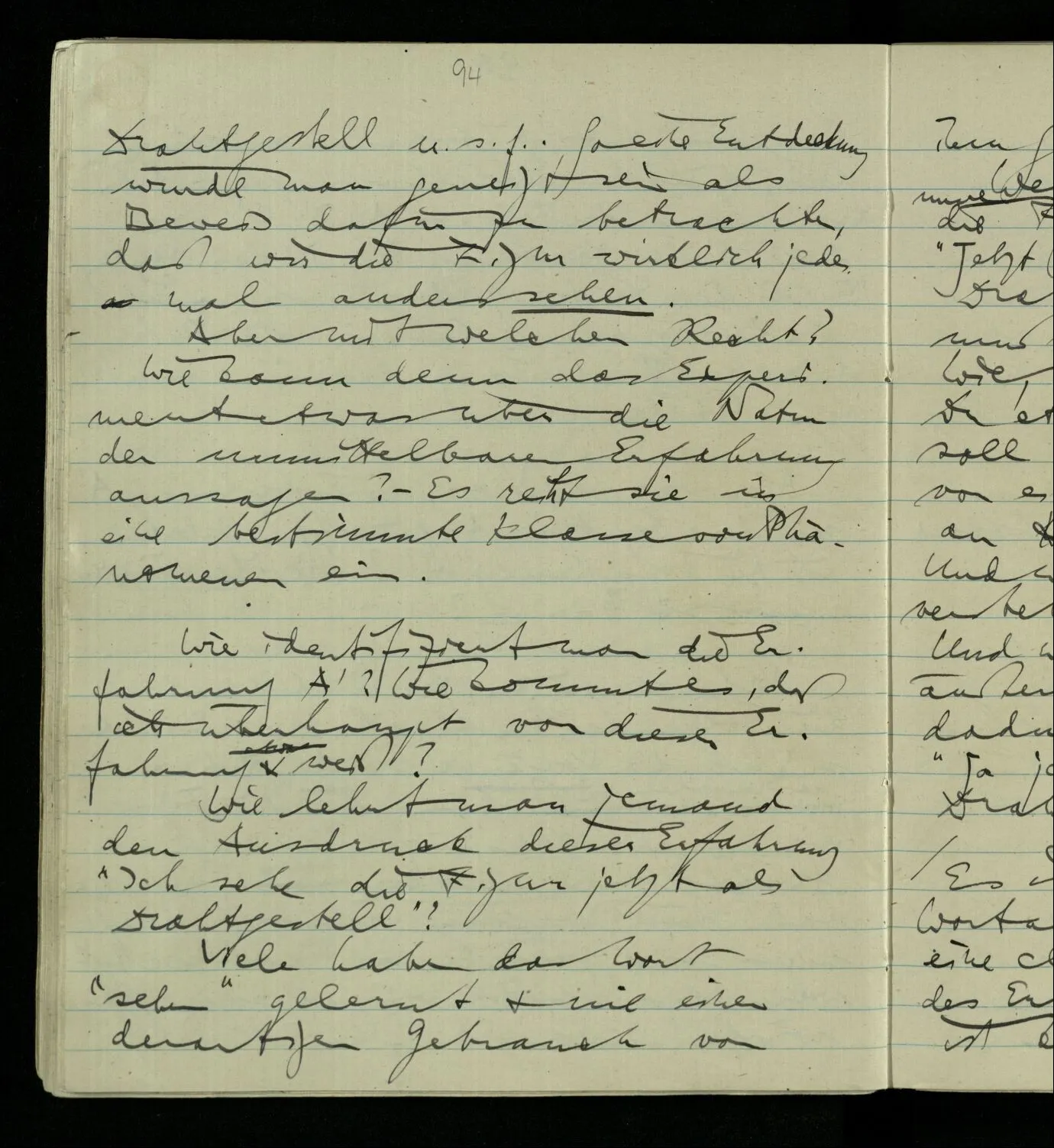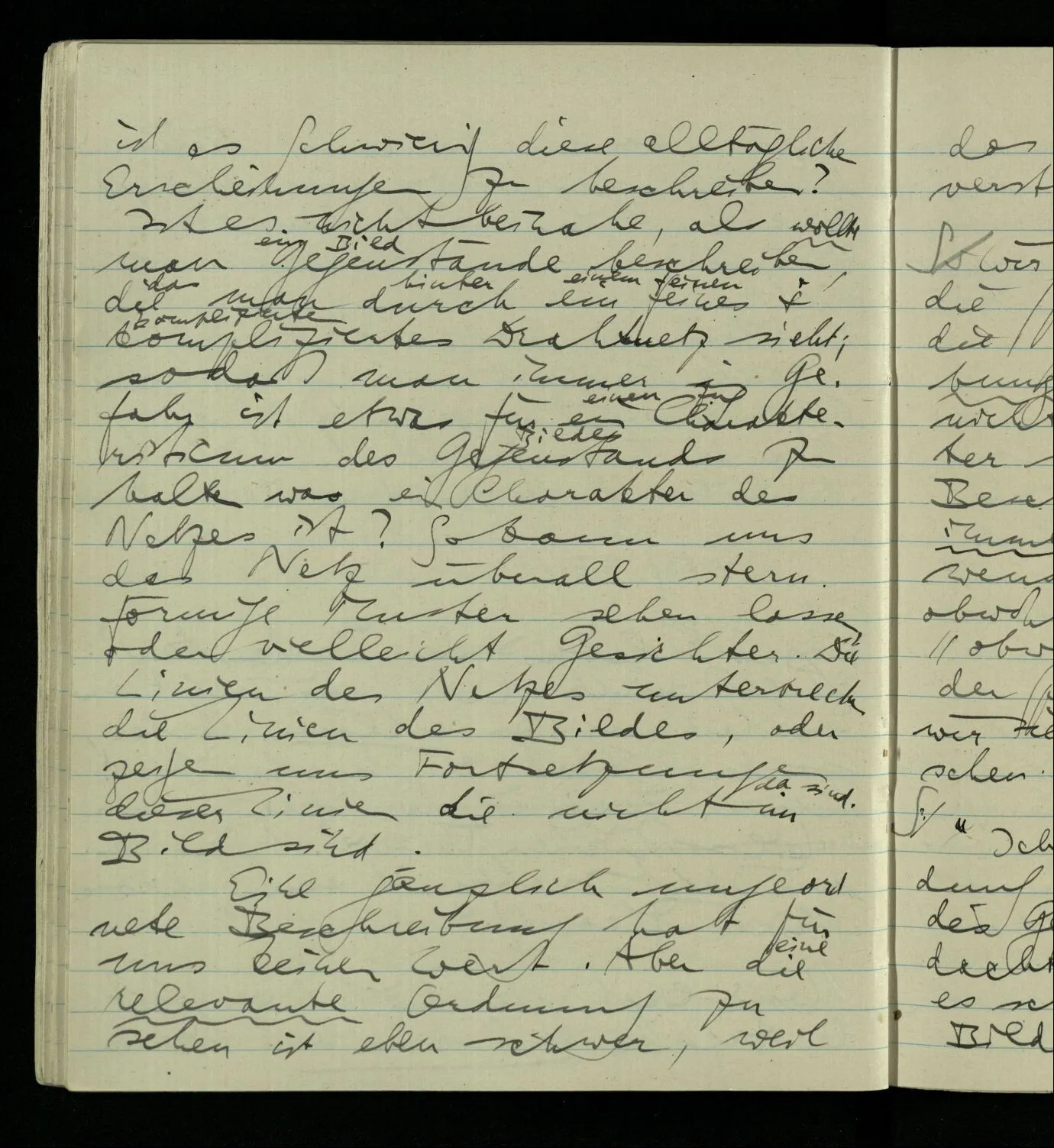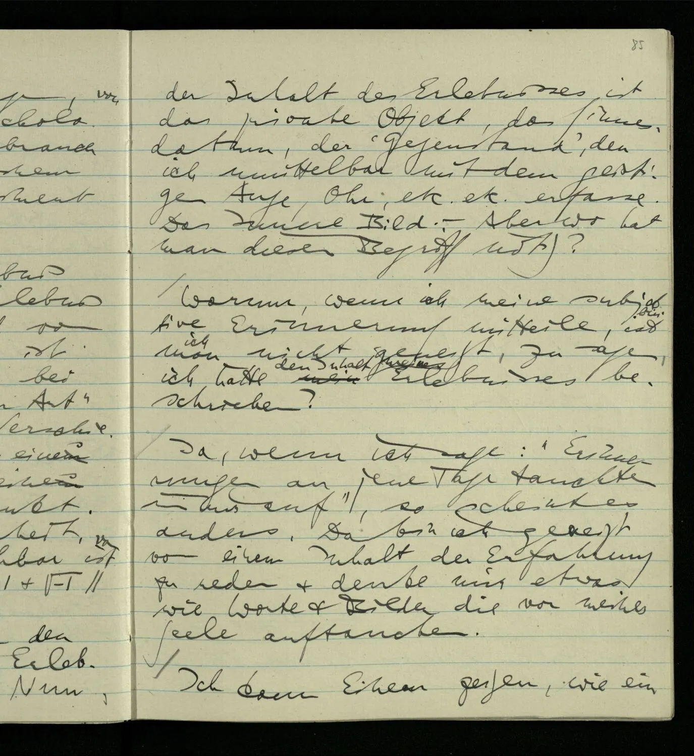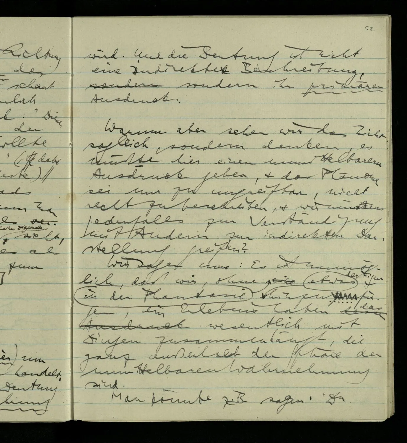 An dieses letztere erinnern wir uns eigentlich nicht; wir erschließen es eben, da wir doch zugeben müssen, wir hätten den Satz damals so, & nicht anders, aufgefaßt. – Es ist, als ob dies ganz Feine, das Verstehen, uns unsichtbar würde, wenn wir den Blick auf die andern Erlebnisse einstellen; als ob man mit der normalen Einstellung durch diese Schicht sieht, ohne sie zu sehen.