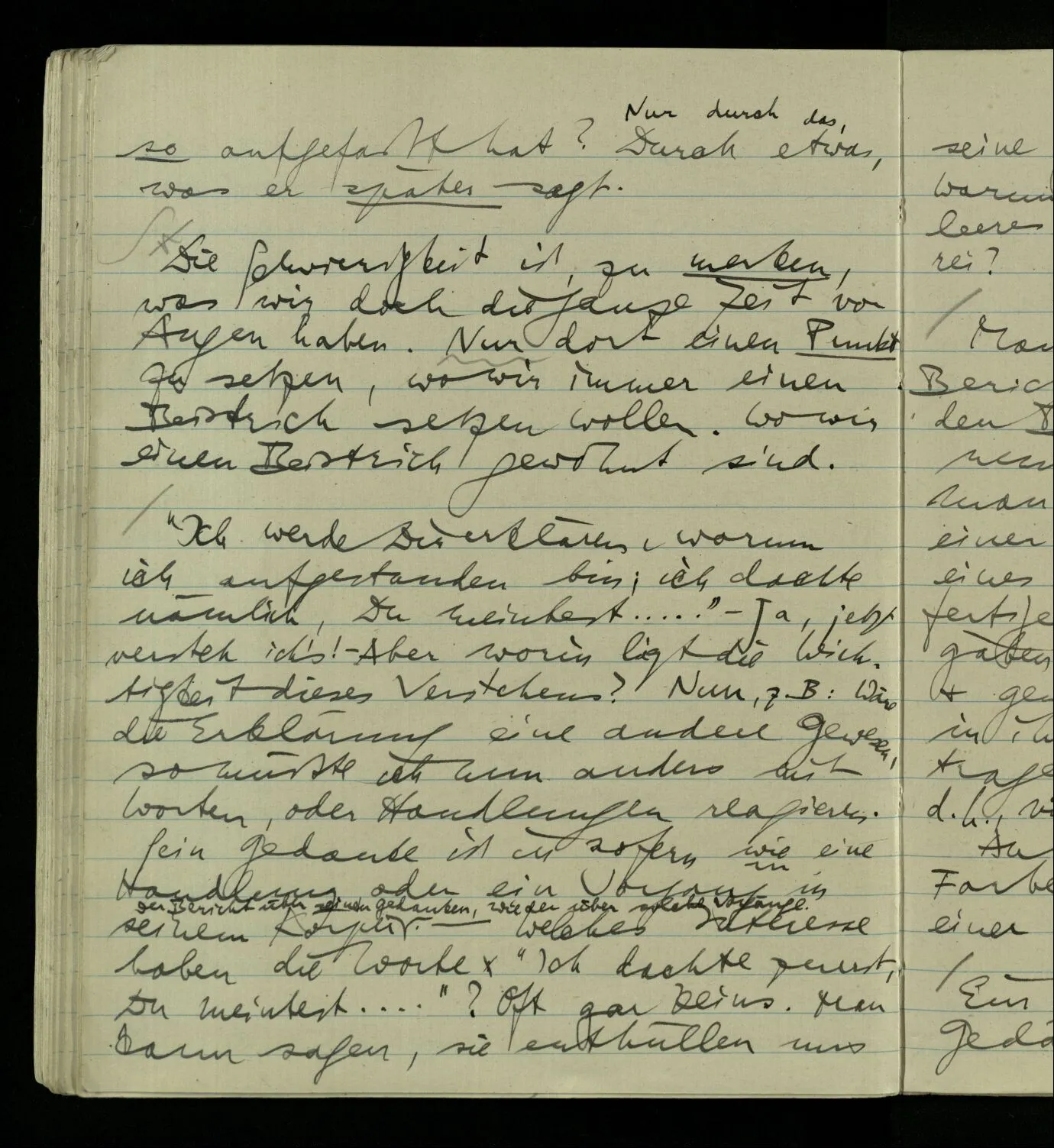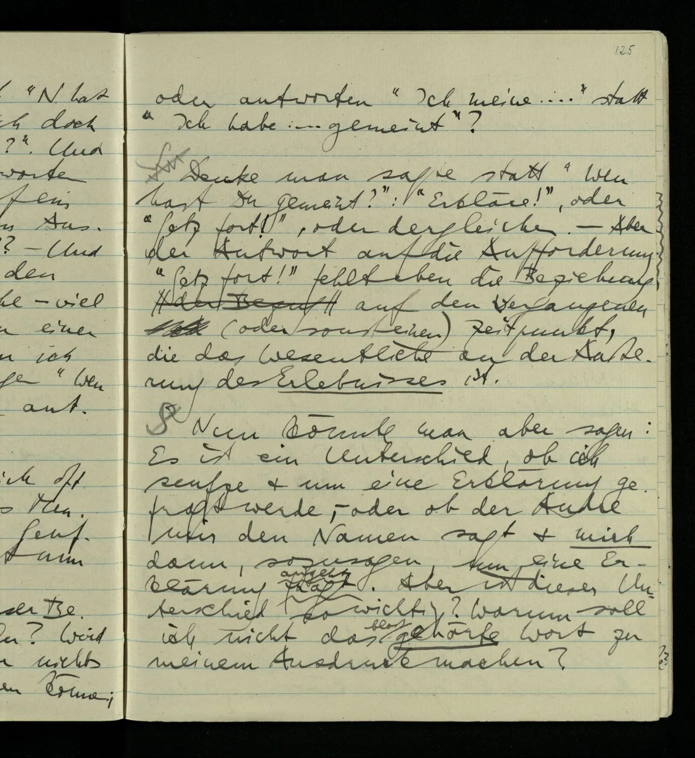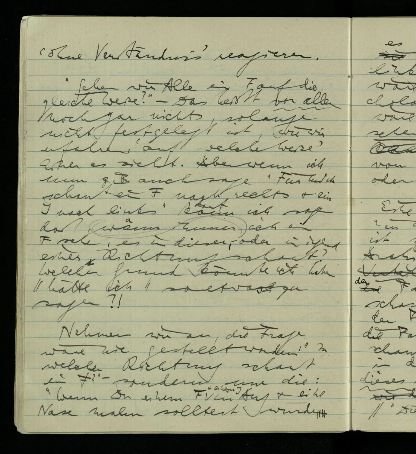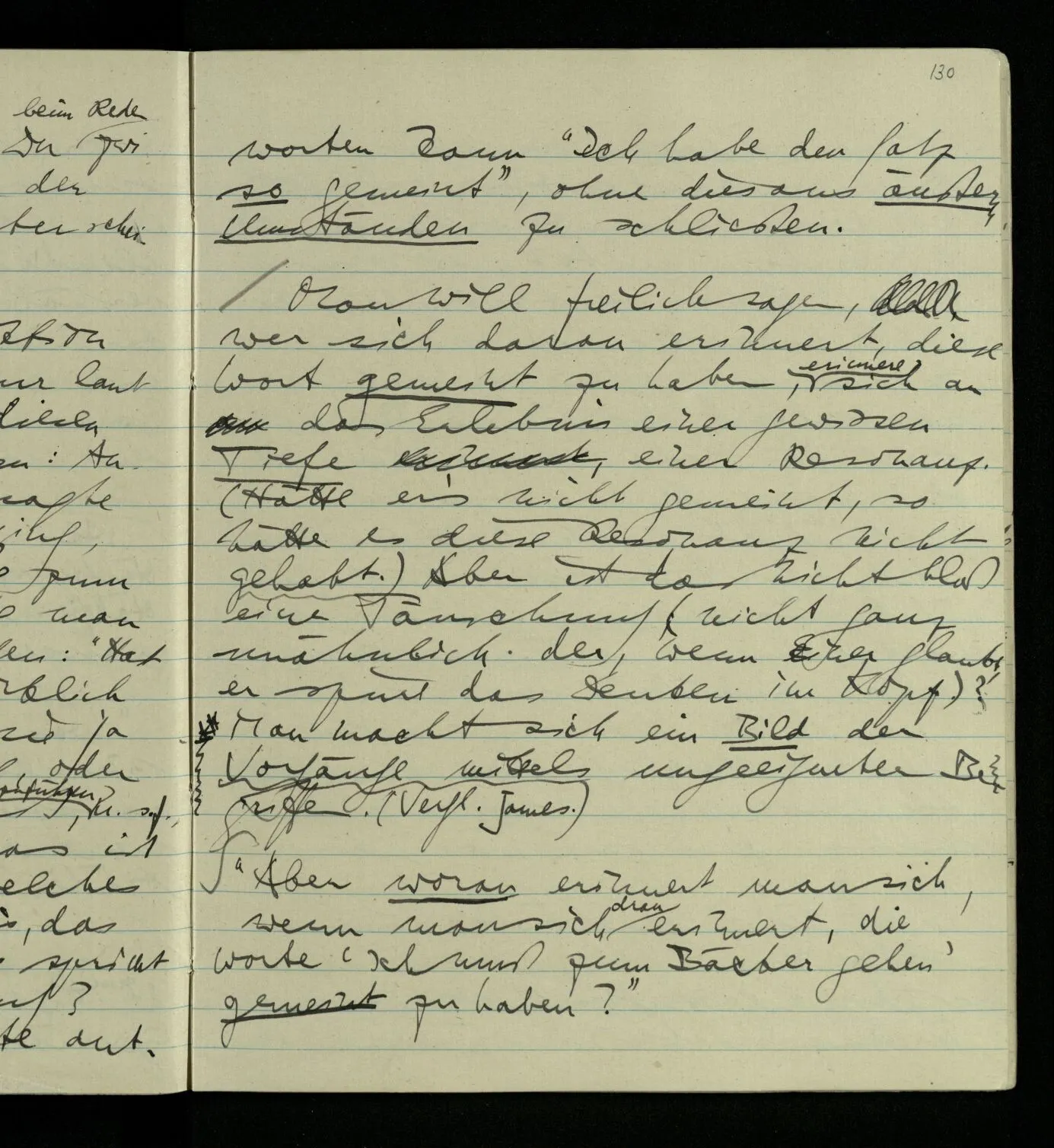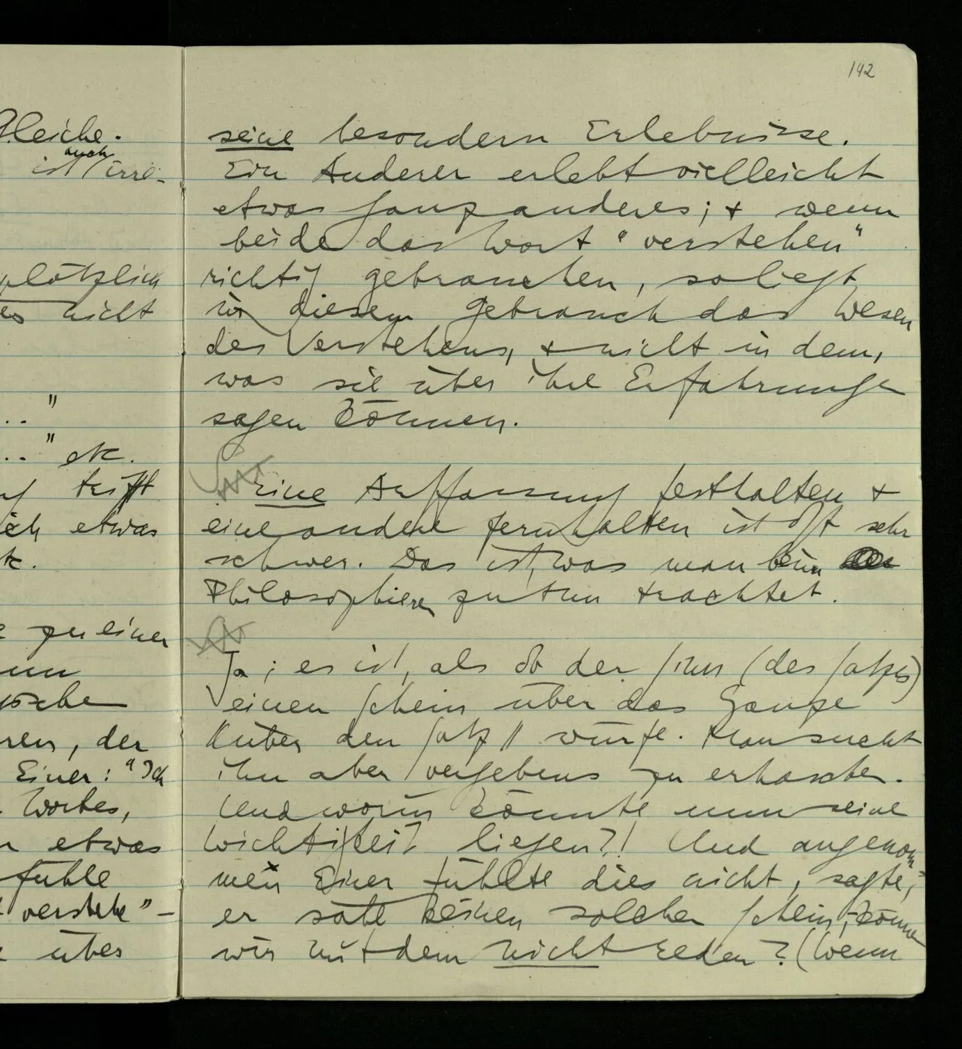 Niemand kümmert sich darum, ob etwas, noch darum, was in mir vorgeht, wenn man zu mir spricht. Man fragt auch für gewöhnlich nicht, wann ich den Satz verstanden habe, & ich merke auch nicht daß es damit einmal so, einmal so beschaffen ist. Außer, wenn ich einmal einen mißverstehe oder dergleichen. Und dann kann die Frage “Wann fingst Du an, ihn zu verstehen” Wichtigkeit erhalten. Aber es ist nun, als ob erst in so einem Falle überhaupt von wichtigen Erlebnissen des Verstehens die Rede wäre. Und könnte man sagen: nur das Erlebnis beim Wechsel der Bedeutungen sei von Wichtigkeit? – Oder auch so: nur das sei das wichtige Erlebnis, das einen gleichzeitigen Ausdruck hat?