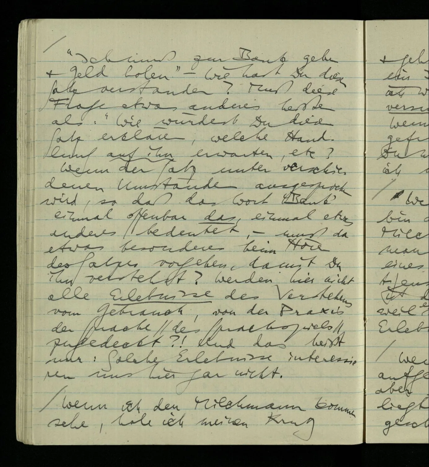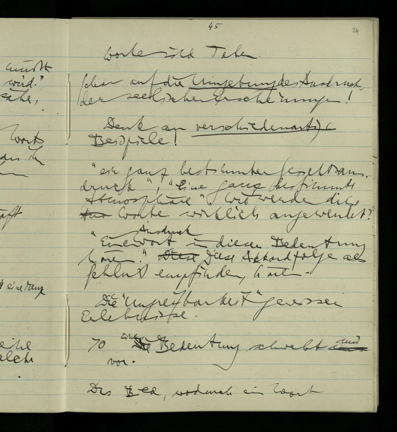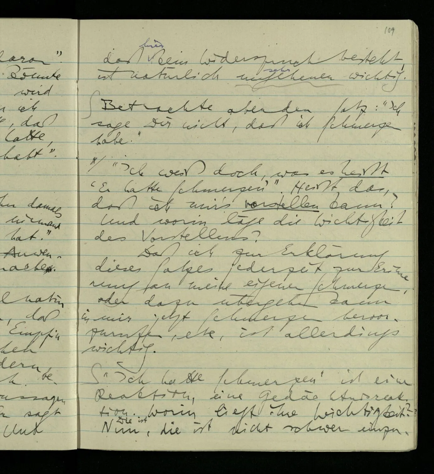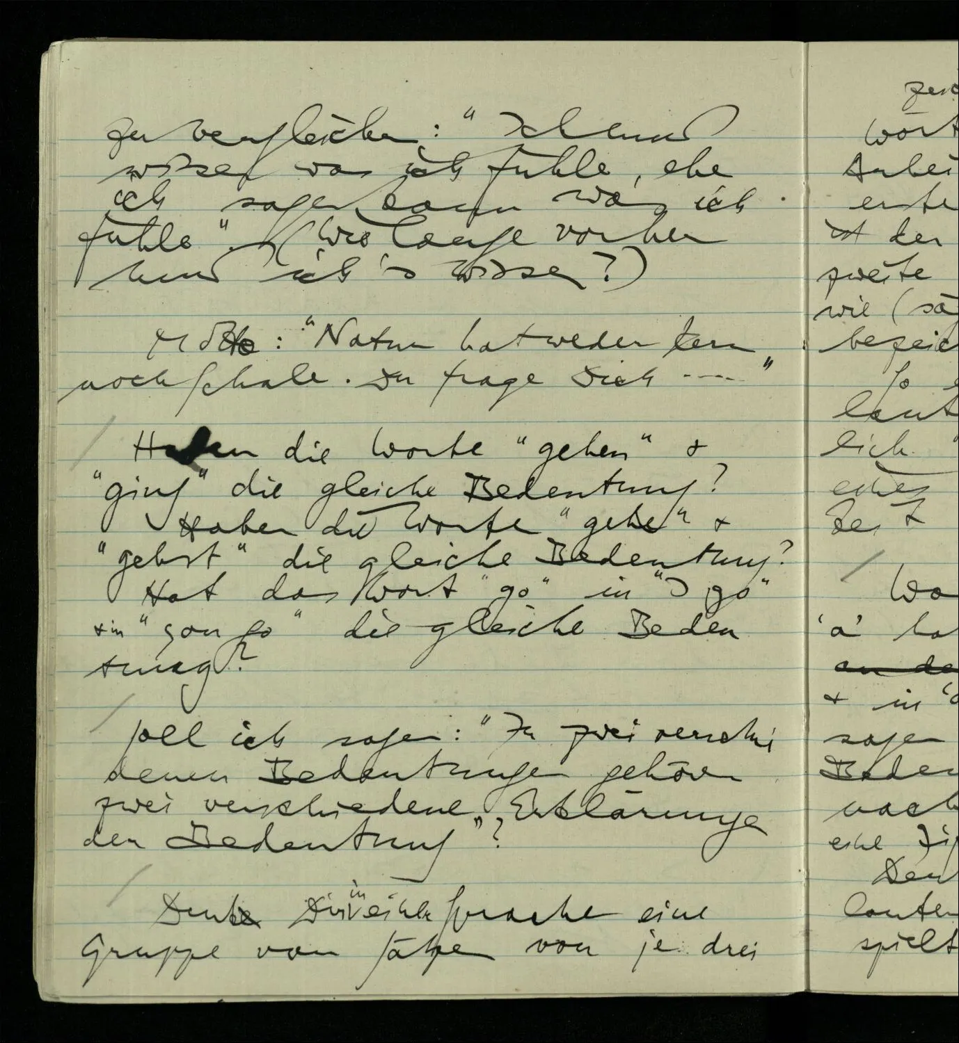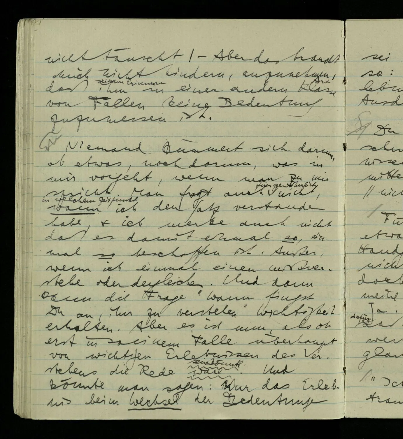 Niemand kümmert sich darum, ob etwas, noch darum, was in mir vorgeht, wenn man zu mir spricht. Man fragt auch für gewöhnlich nicht, wann ich den Satz verstanden habe, & ich merke auch nicht daß es damit einmal so, einmal so beschaffen ist. Außer, wenn ich einmal einen mißverstehe oder dergleichen. Und dann kann die Frage “Wann fingst Du an, ihn zu verstehen” Wichtigkeit erhalten. Aber es ist nun, als ob erst in so einem Falle überhaupt von wichtigen Erlebnissen des Verstehens die Rede wäre. Und könnte man sagen: nur das Erlebnis beim Wechsel der Bedeutungen sei von Wichtigkeit? – Oder auch so: nur das sei das wichtige Erlebnis, das einen gleichzeitigen Ausdruck hat?