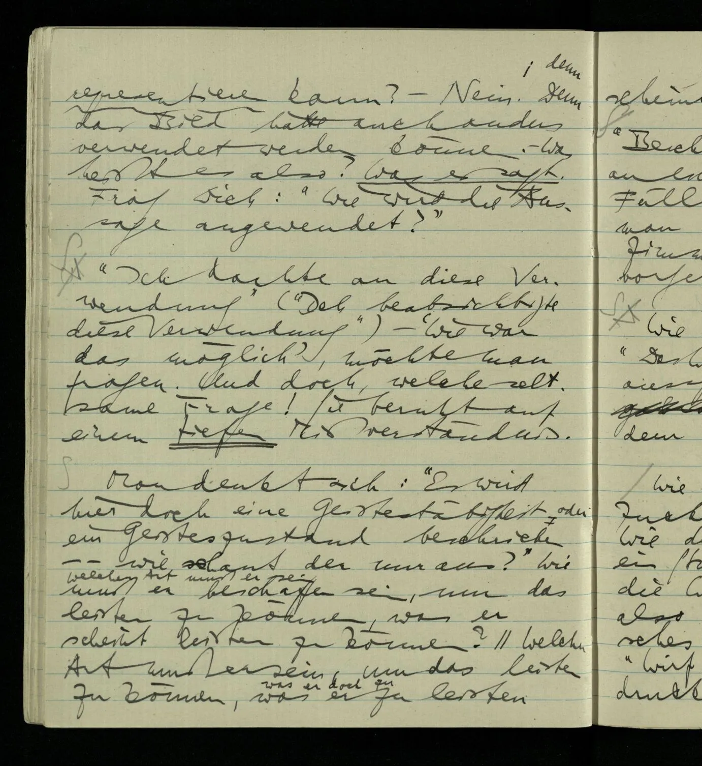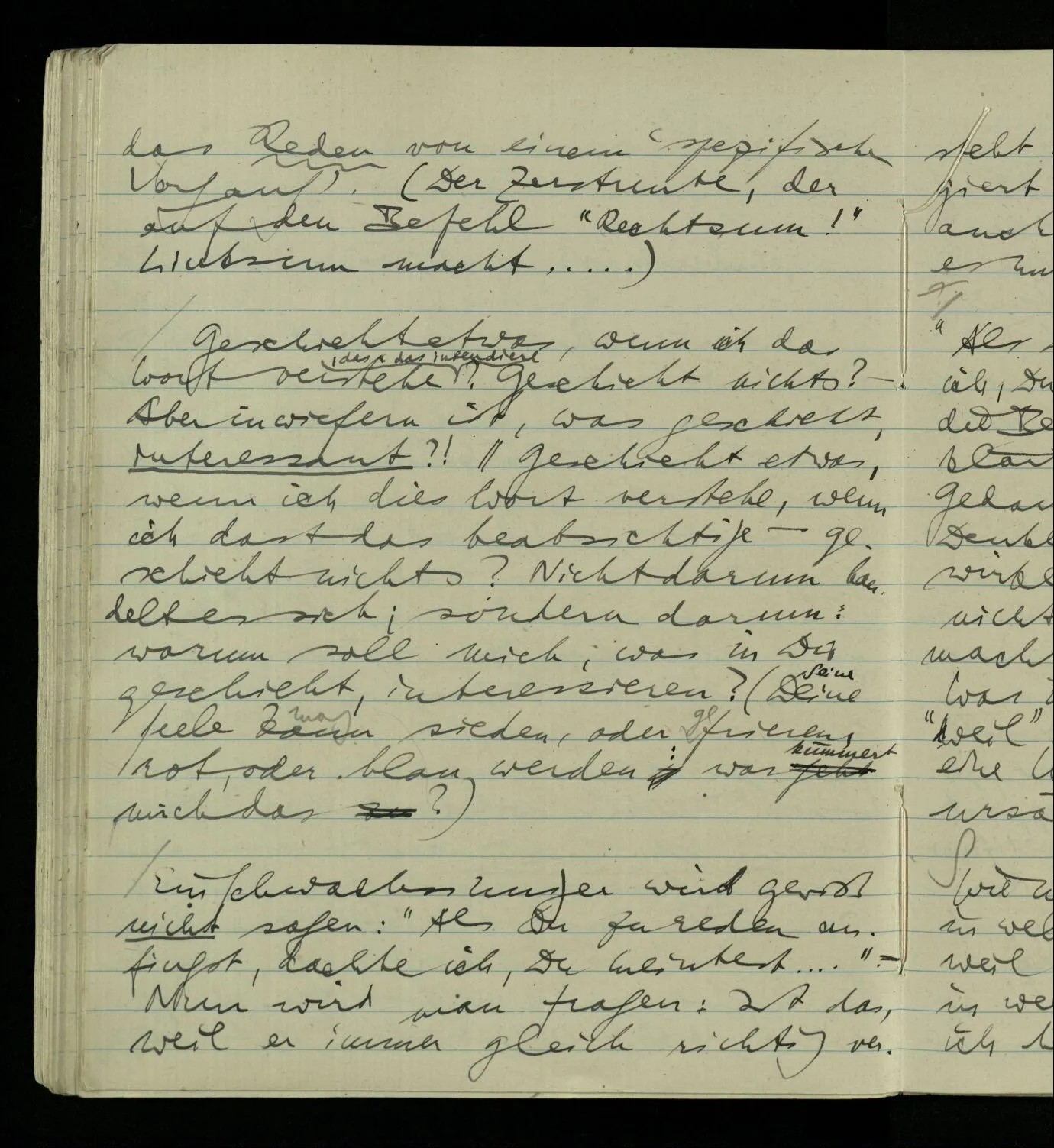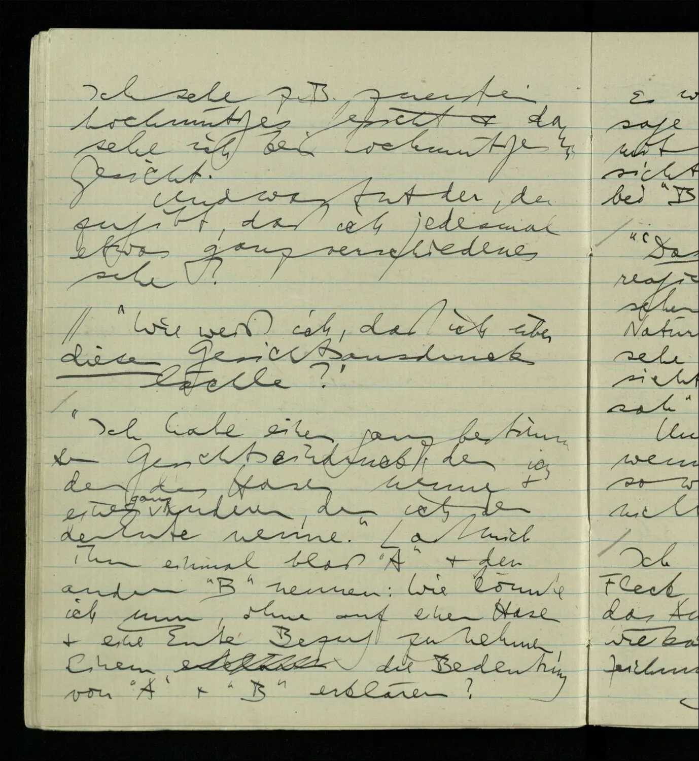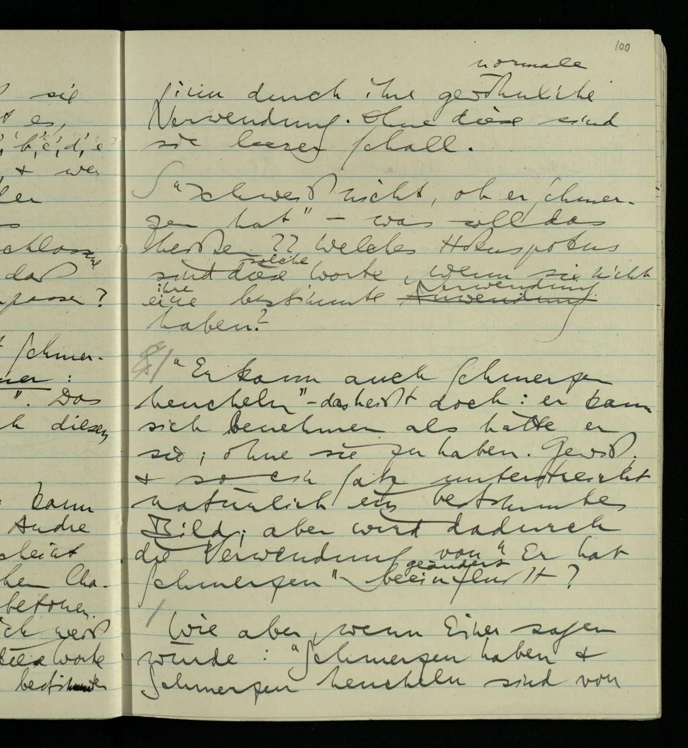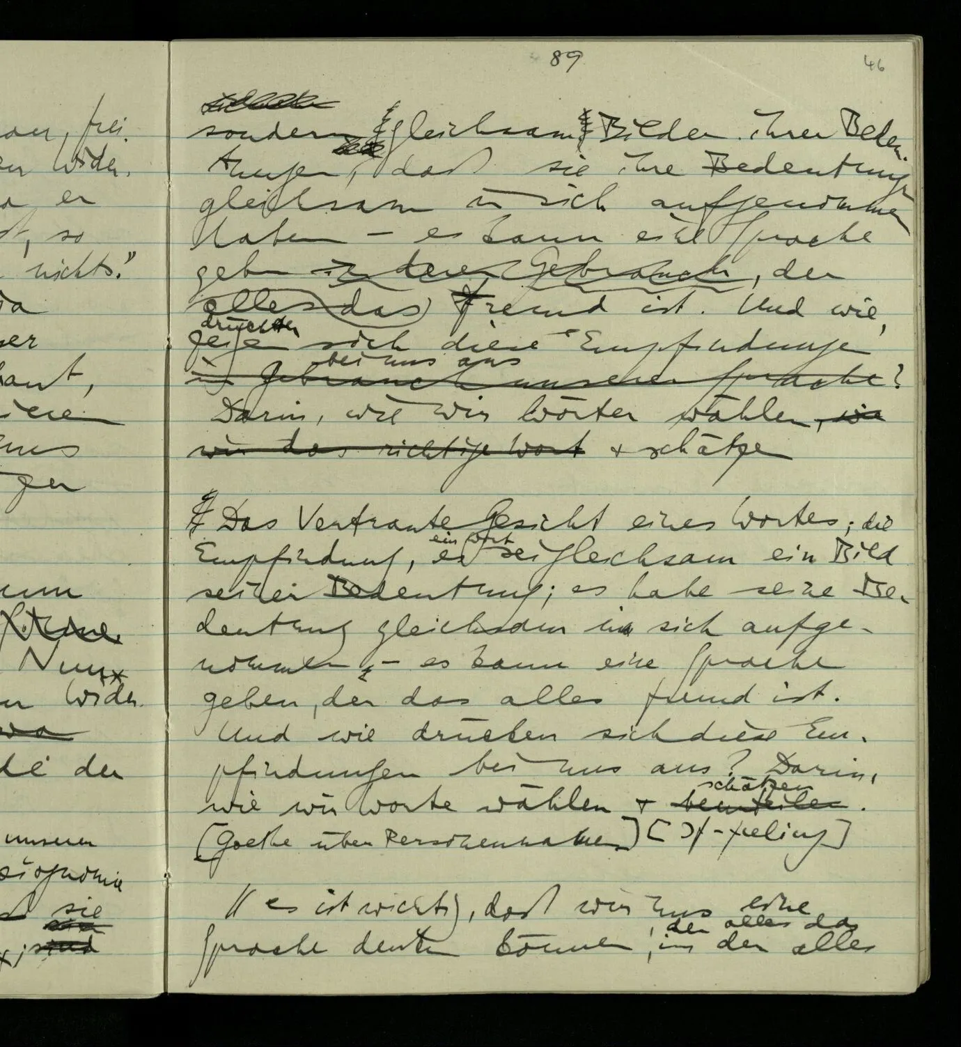 Niemand kümmert sich darum, ob etwas, noch darum, was in mir vorgeht, wenn man zu mir spricht. Man fragt auch für gewöhnlich nicht, wann ich den Satz verstanden habe, & ich merke auch nicht daß es damit einmal so, einmal so beschaffen ist. Außer, wenn ich einmal einen mißverstehe oder dergleichen. Und dann kann die Frage “Wann fingst Du an, ihn zu verstehen” Wichtigkeit erhalten. Aber es ist nun, als ob erst in so einem Falle überhaupt von wichtigen Erlebnissen des Verstehens die Rede wäre. Und könnte man sagen: nur das Erlebnis beim Wechsel der Bedeutungen sei von Wichtigkeit? – Oder auch so: nur das sei das wichtige Erlebnis, das einen gleichzeitigen Ausdruck hat?