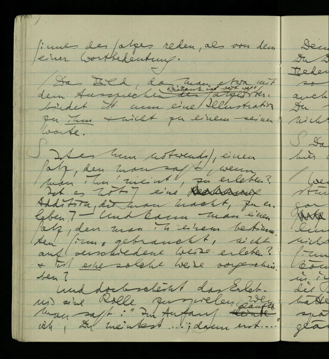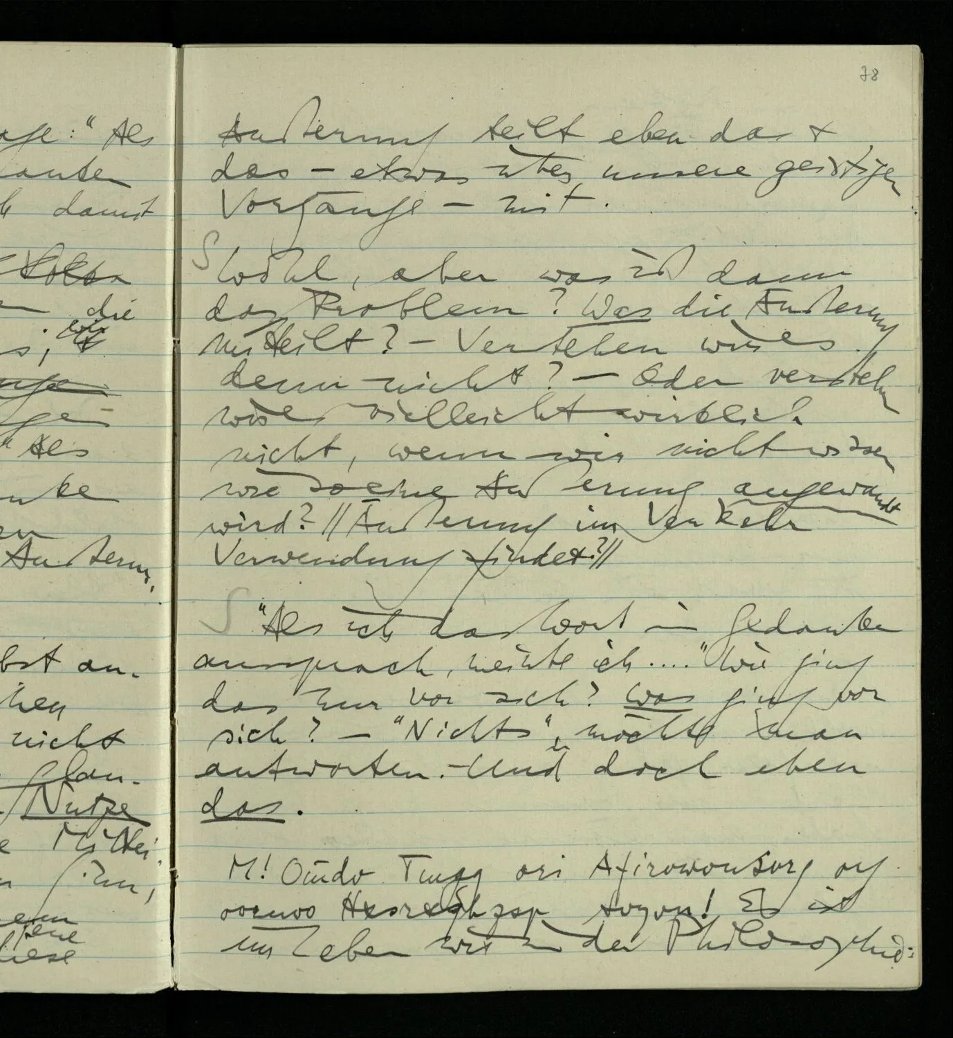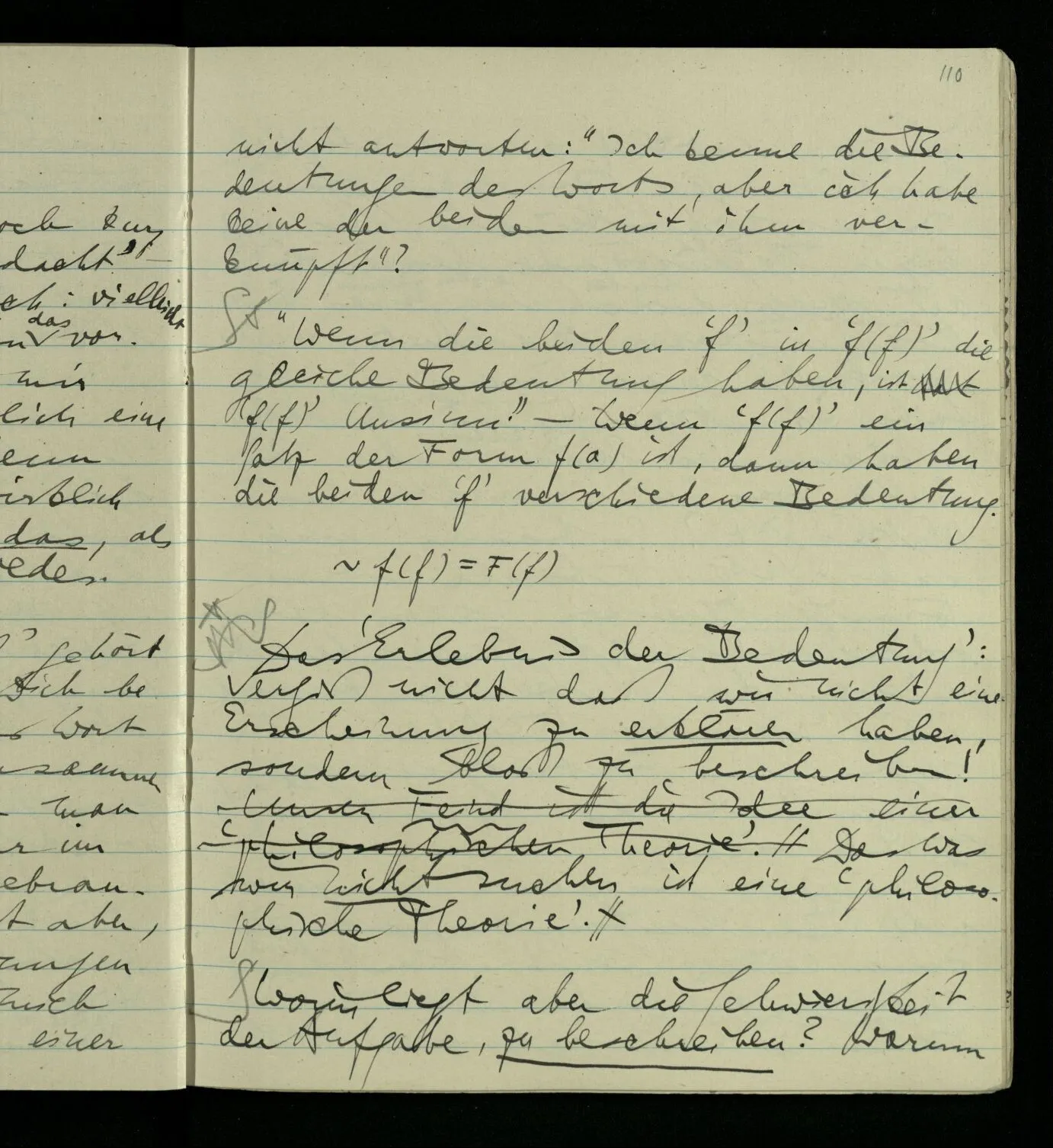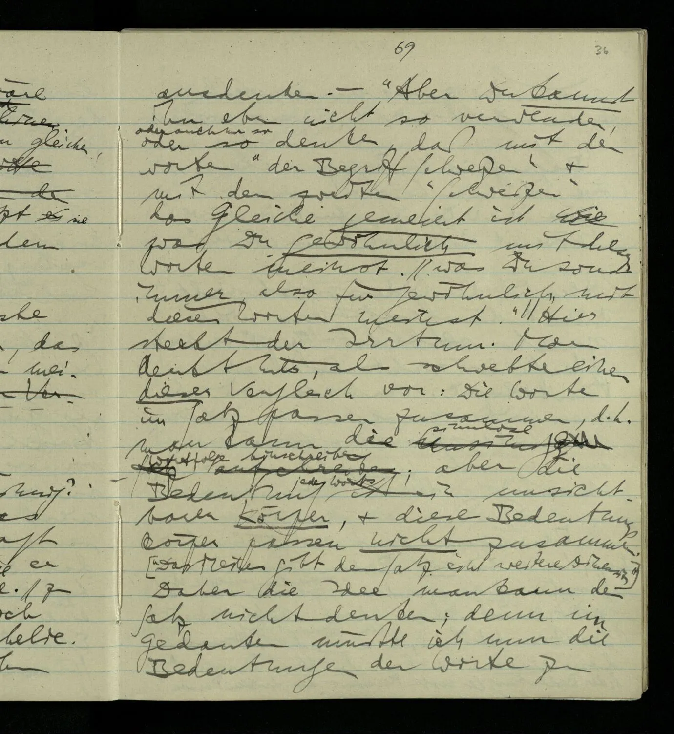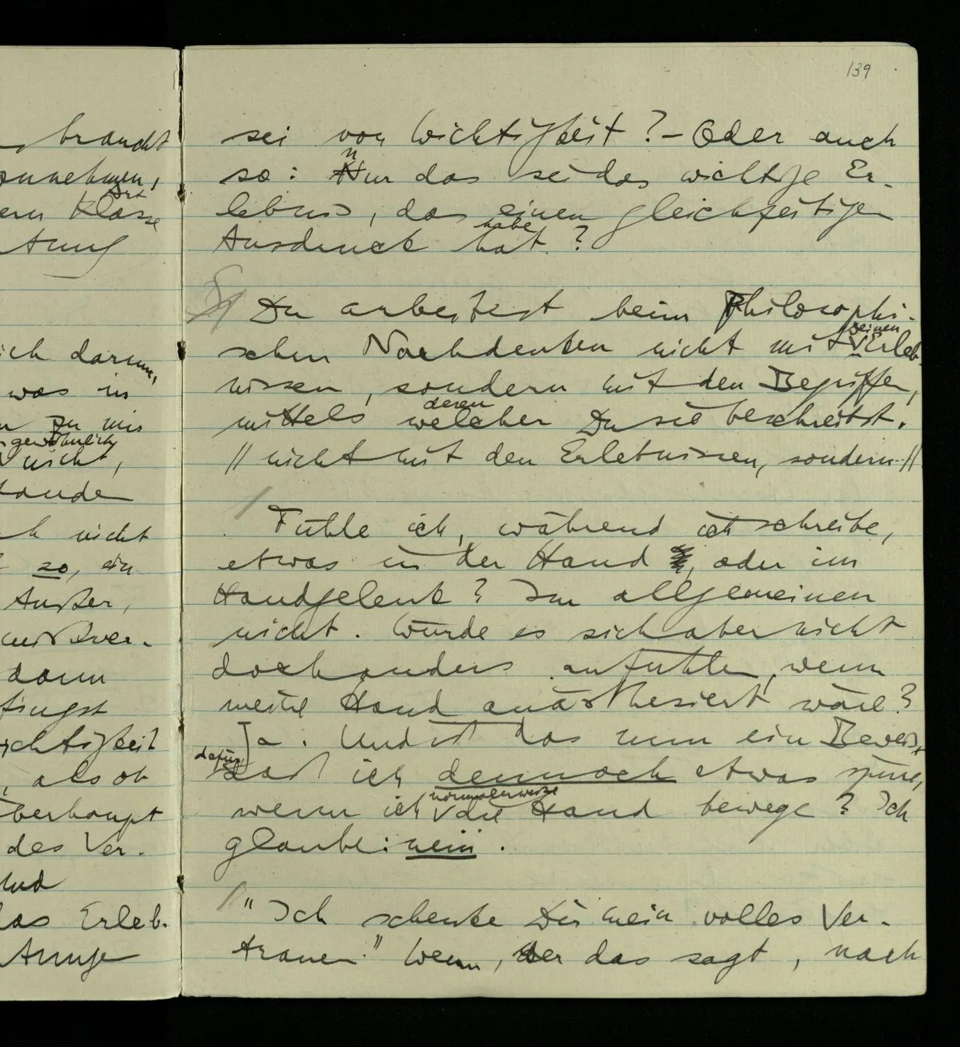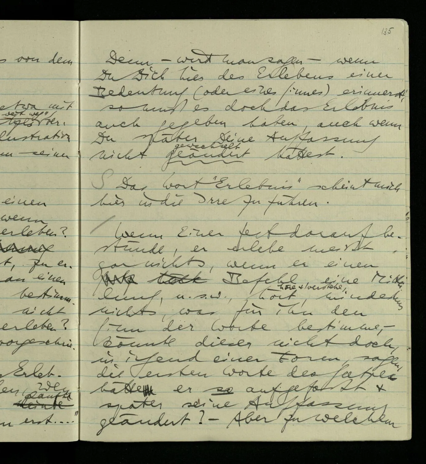 Niemand kümmert sich darum, ob etwas, noch darum, was in mir vorgeht, wenn man zu mir spricht. Man fragt auch für gewöhnlich nicht, wann ich den Satz verstanden habe, & ich merke auch nicht daß es damit einmal so, einmal so beschaffen ist. Außer, wenn ich einmal einen mißverstehe oder dergleichen. Und dann kann die Frage “Wann fingst Du an, ihn zu verstehen” Wichtigkeit erhalten. Aber es ist nun, als ob erst in so einem Falle überhaupt von wichtigen Erlebnissen des Verstehens die Rede wäre. Und könnte man sagen: nur das Erlebnis beim Wechsel der Bedeutungen sei von Wichtigkeit? – Oder auch so: nur das sei das wichtige Erlebnis, das einen gleichzeitigen Ausdruck hat?