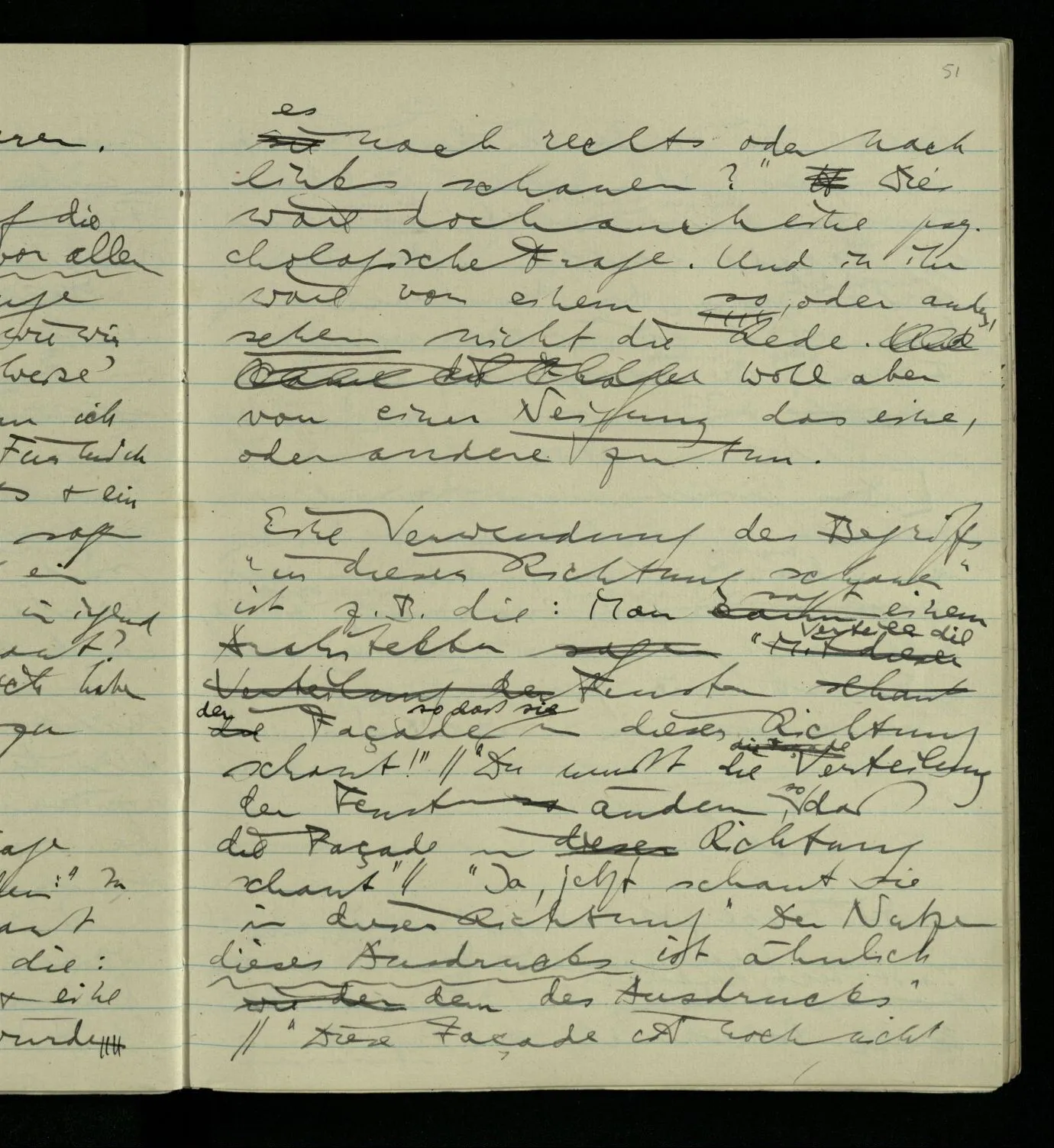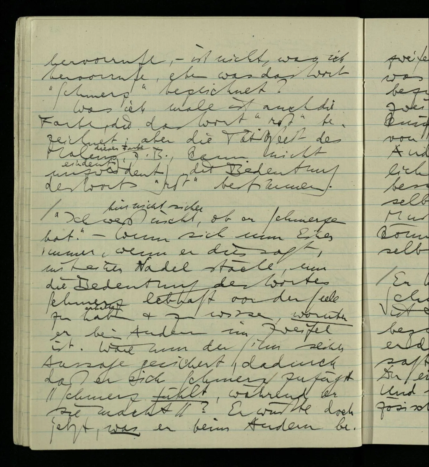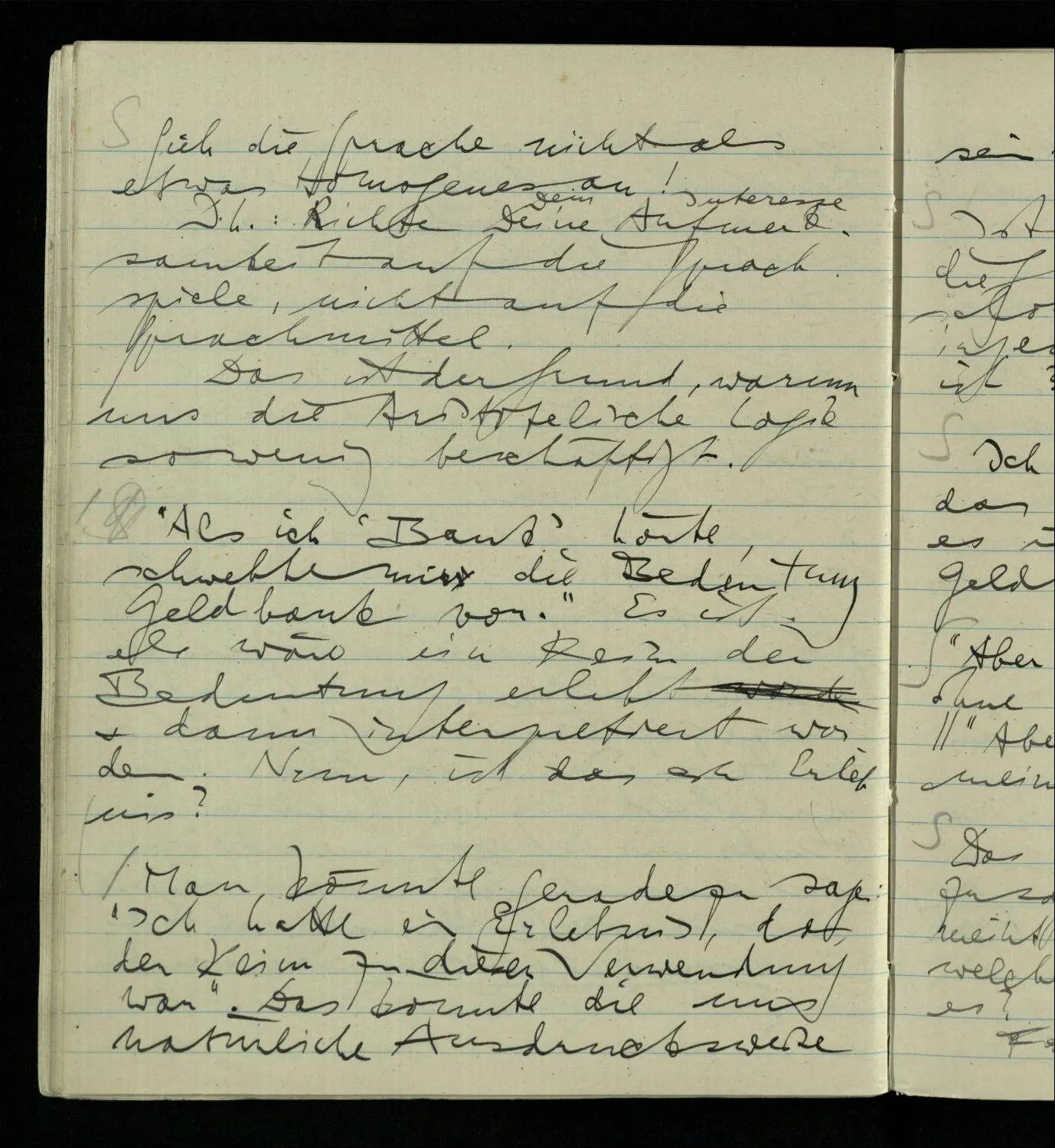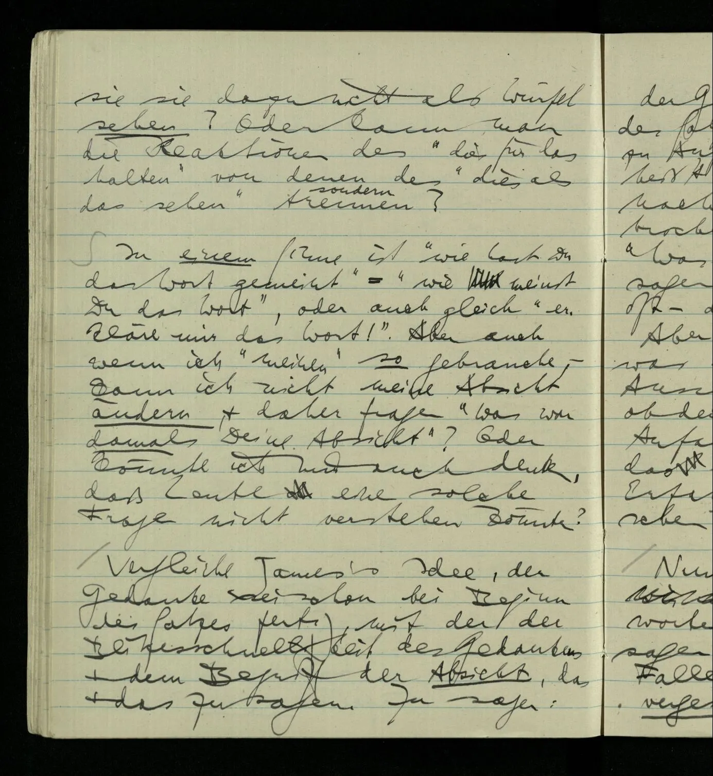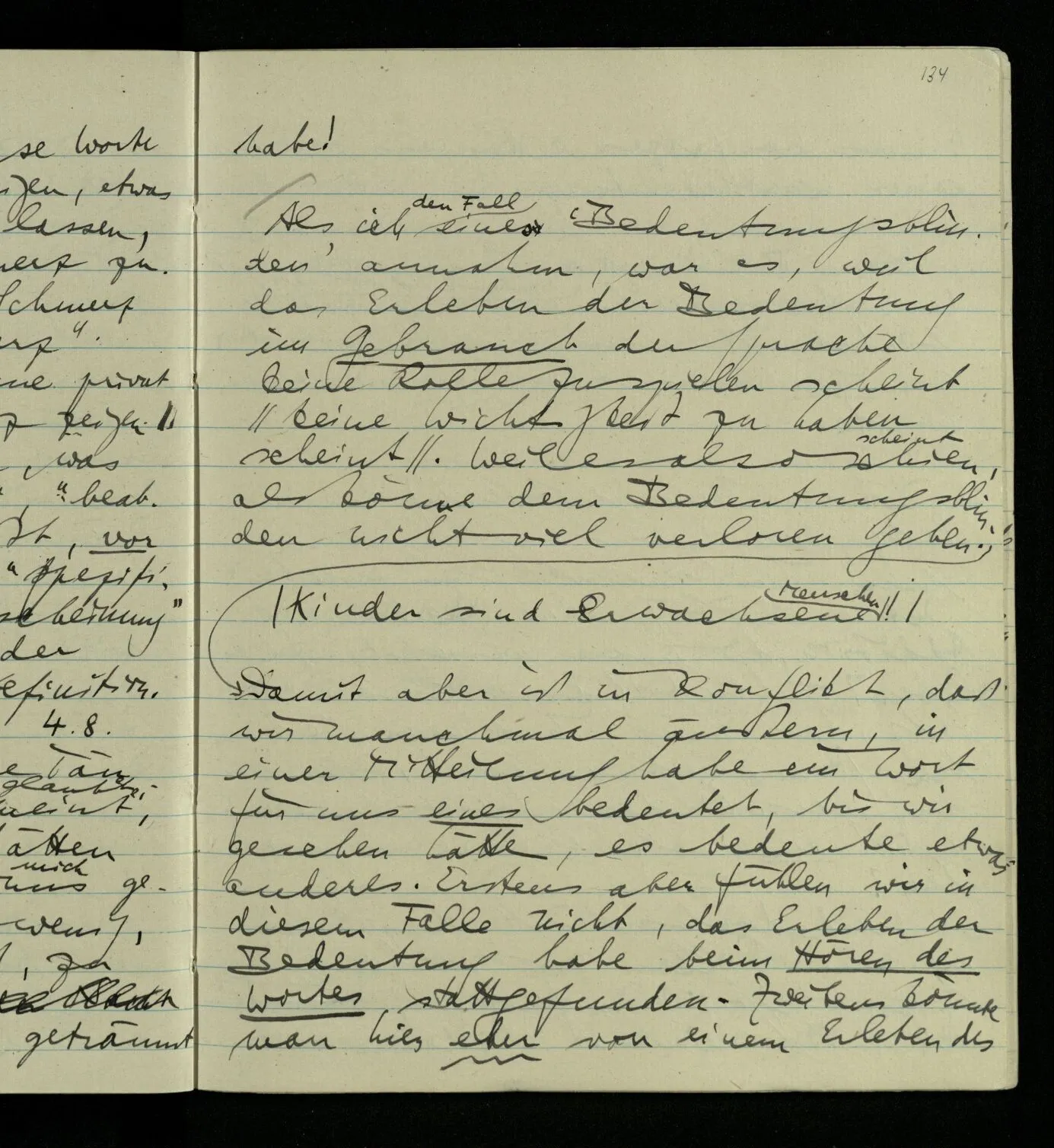 Niemand kümmert sich darum, ob etwas, noch darum, was in mir vorgeht, wenn man zu mir spricht. Man fragt auch für gewöhnlich nicht, wann ich den Satz verstanden habe, & ich merke auch nicht daß es damit einmal so, einmal so beschaffen ist. Außer, wenn ich einmal einen mißverstehe oder dergleichen. Und dann kann die Frage “Wann fingst Du an, ihn zu verstehen” Wichtigkeit erhalten. Aber es ist nun, als ob erst in so einem Falle überhaupt von wichtigen Erlebnissen des Verstehens die Rede wäre. Und könnte man sagen: nur das Erlebnis beim Wechsel der Bedeutungen sei von Wichtigkeit? – Oder auch so: nur das sei das wichtige Erlebnis, das einen gleichzeitigen Ausdruck hat?