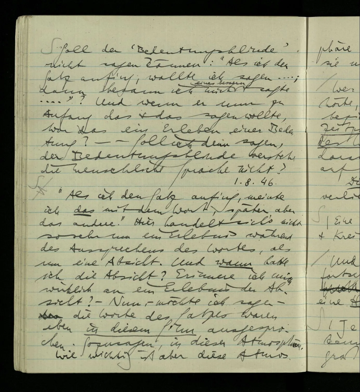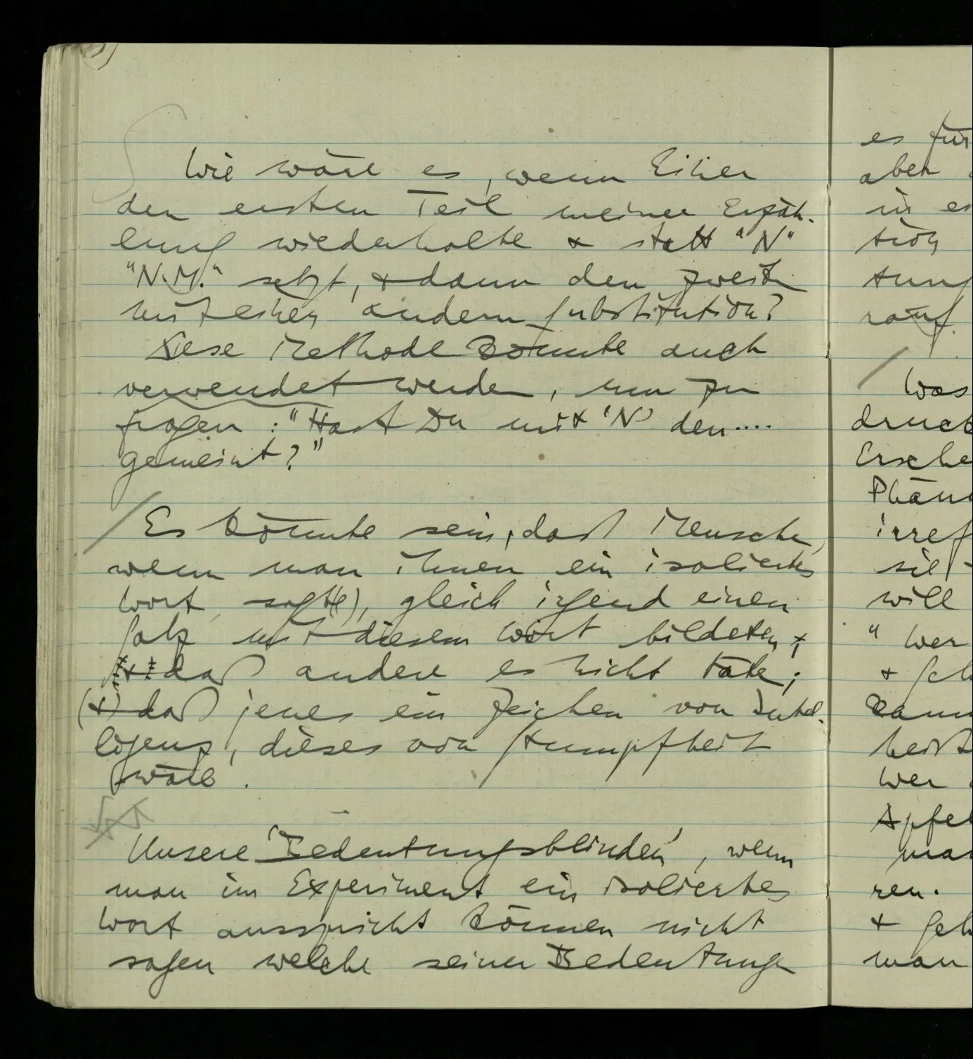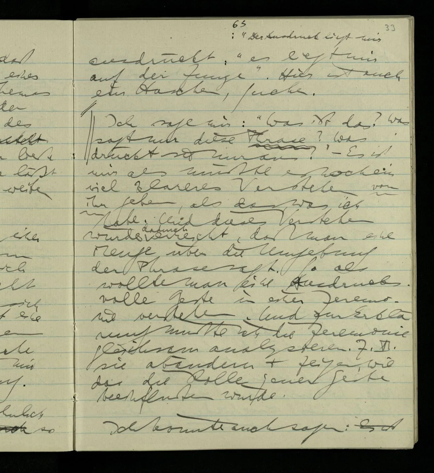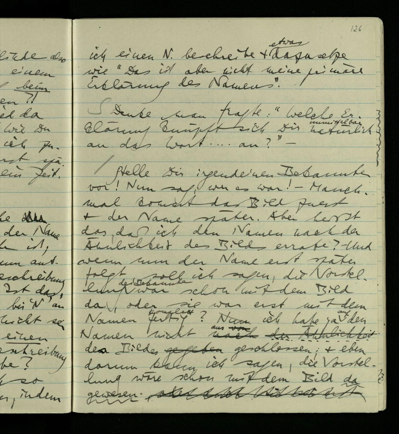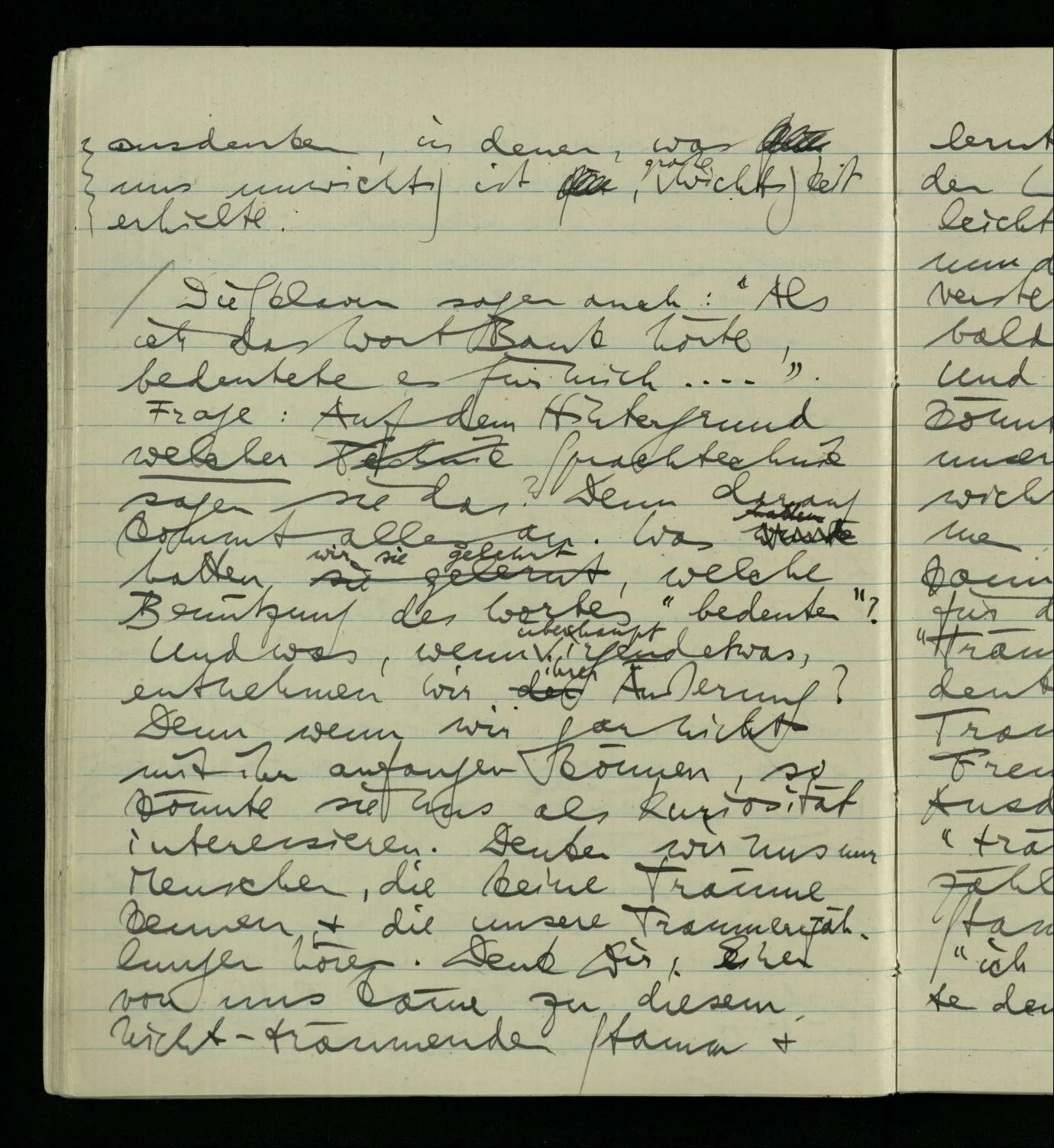 Niemand kümmert sich darum, ob etwas, noch darum, was in mir vorgeht, wenn man zu mir spricht. Man fragt auch für gewöhnlich nicht, wann ich den Satz verstanden habe, & ich merke auch nicht daß es damit einmal so, einmal so beschaffen ist. Außer, wenn ich einmal einen mißverstehe oder dergleichen. Und dann kann die Frage “Wann fingst Du an, ihn zu verstehen” Wichtigkeit erhalten. Aber es ist nun, als ob erst in so einem Falle überhaupt von wichtigen Erlebnissen des Verstehens die Rede wäre. Und könnte man sagen: nur das Erlebnis beim Wechsel der Bedeutungen sei von Wichtigkeit? – Oder auch so: nur das sei das wichtige Erlebnis, das einen gleichzeitigen Ausdruck hat?