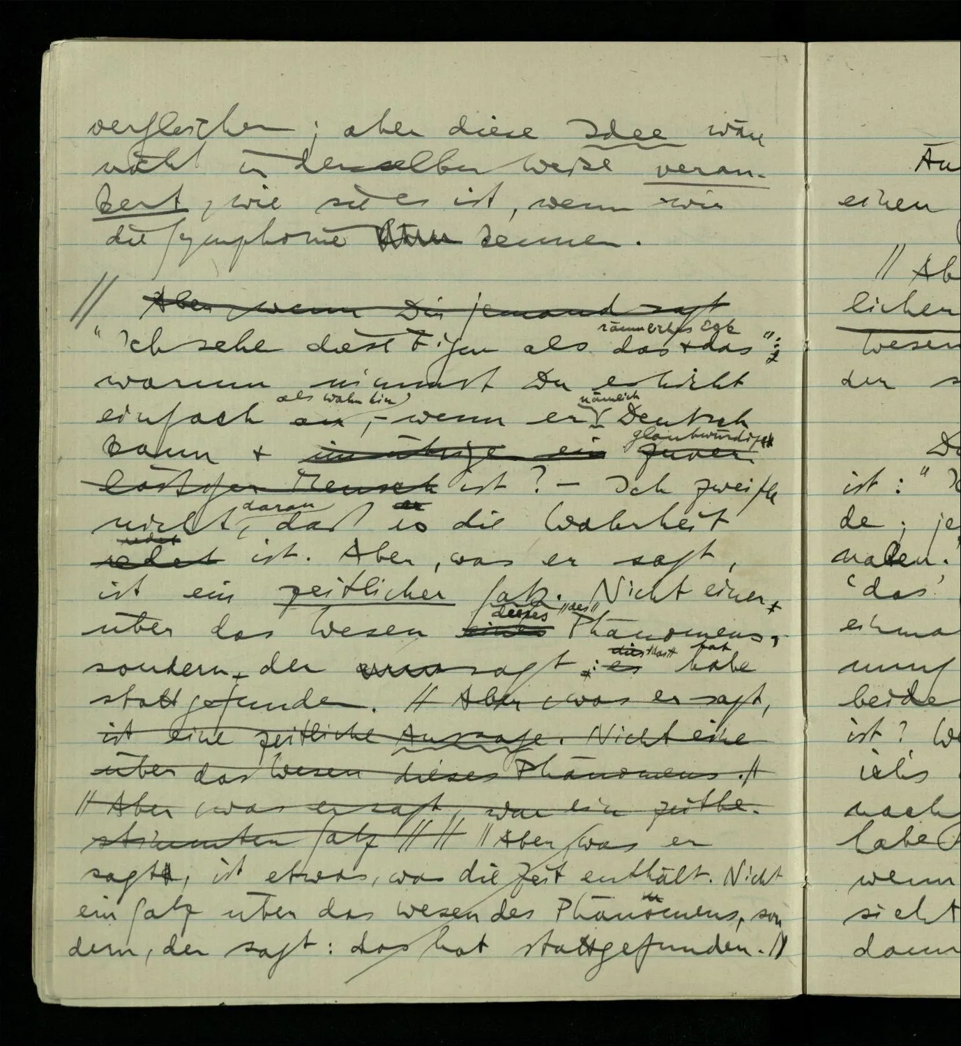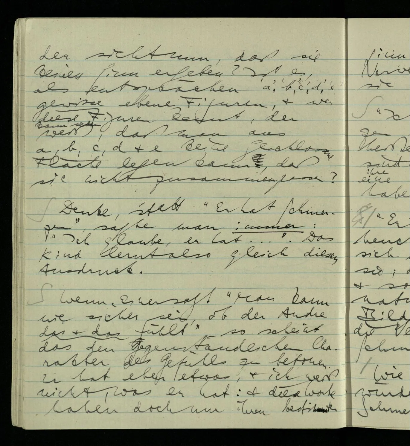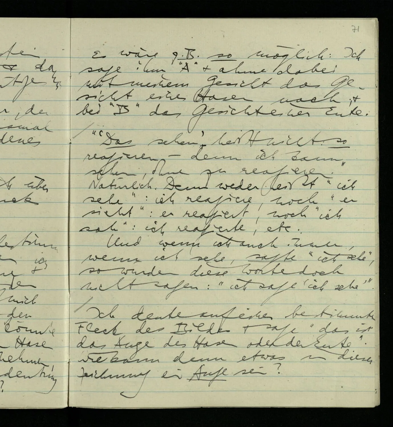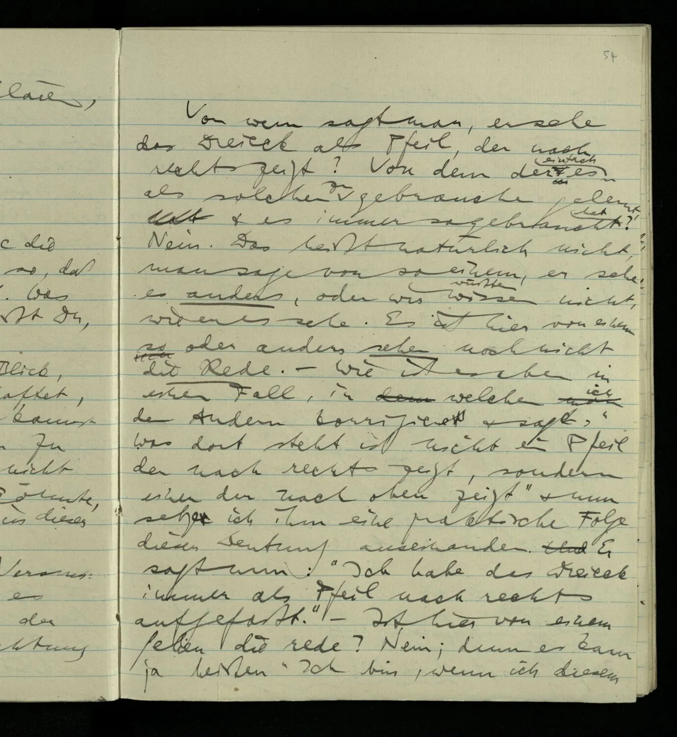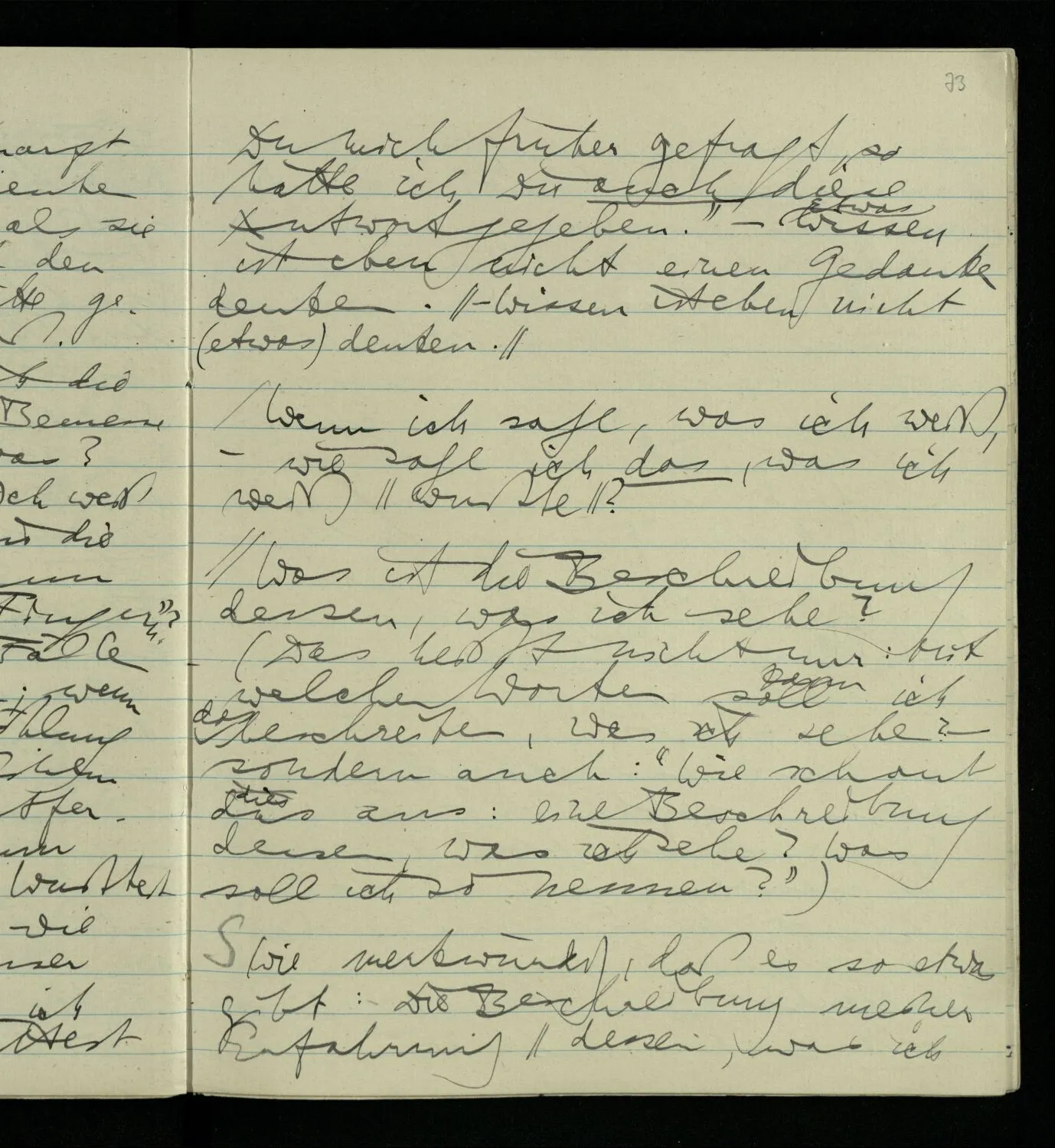 Niemand kümmert sich darum, ob etwas, noch darum, was in mir vorgeht, wenn man zu mir spricht. Man fragt auch für gewöhnlich nicht, wann ich den Satz verstanden habe, & ich merke auch nicht daß es damit einmal so, einmal so beschaffen ist. Außer, wenn ich einmal einen mißverstehe oder dergleichen. Und dann kann die Frage “Wann fingst Du an, ihn zu verstehen” Wichtigkeit erhalten. Aber es ist nun, als ob erst in so einem Falle überhaupt von wichtigen Erlebnissen des Verstehens die Rede wäre. Und könnte man sagen: nur das Erlebnis beim Wechsel der Bedeutungen sei von Wichtigkeit? – Oder auch so: nur das sei das wichtige Erlebnis, das einen gleichzeitigen Ausdruck hat?