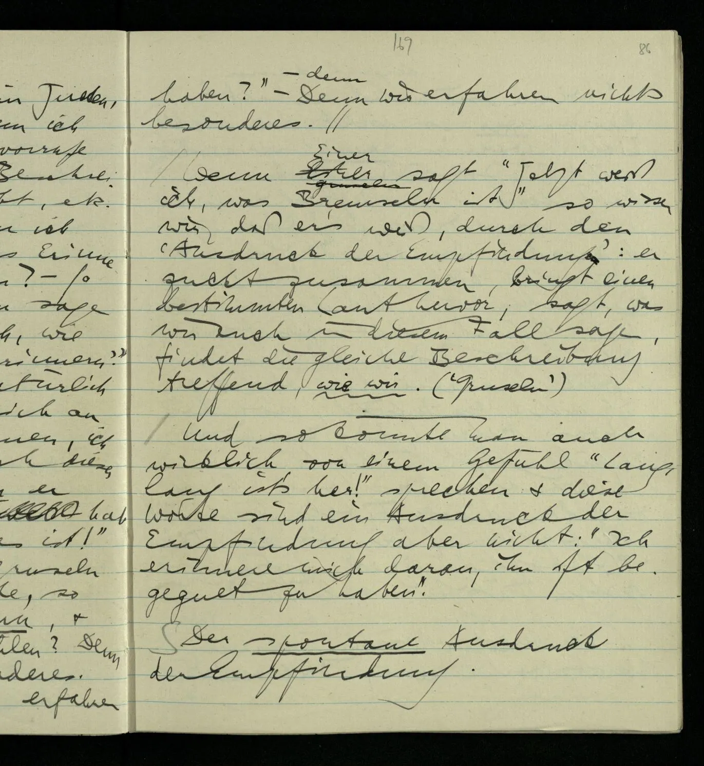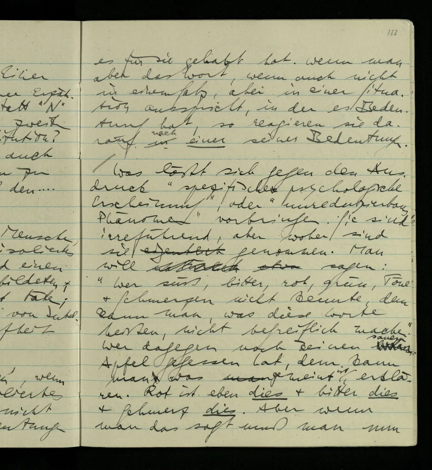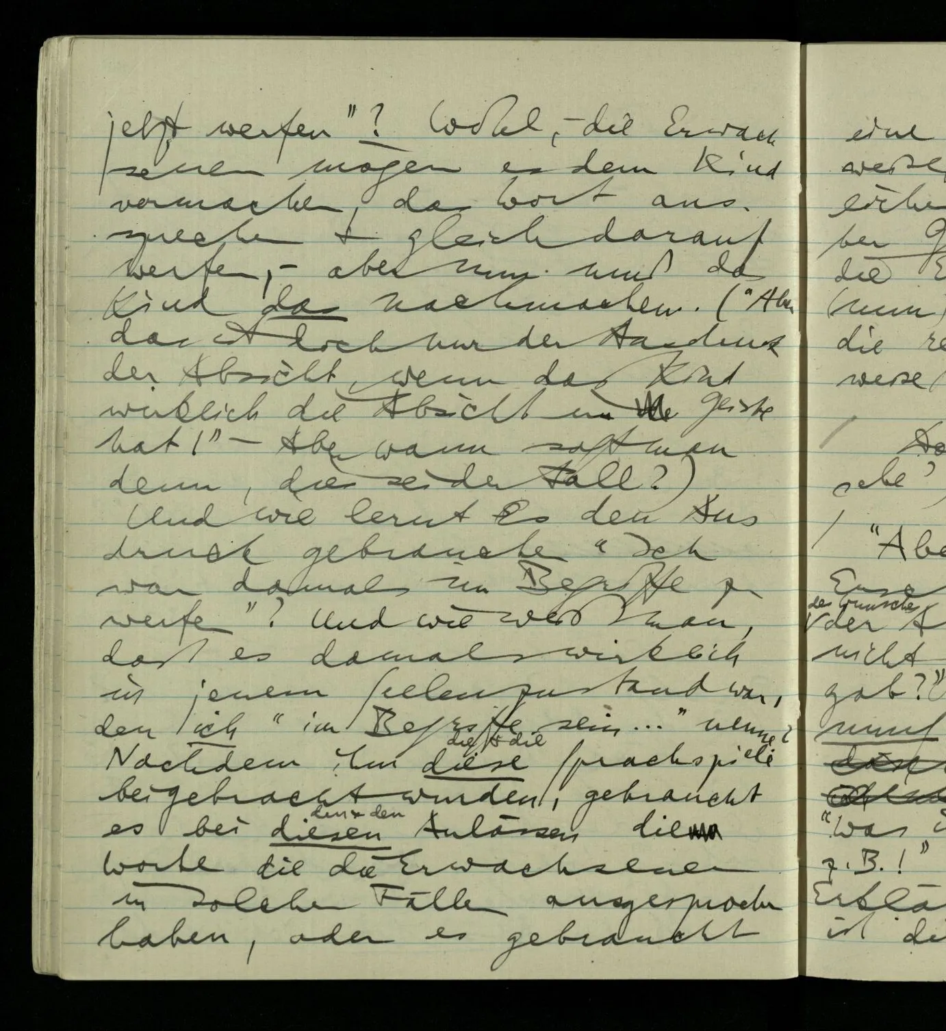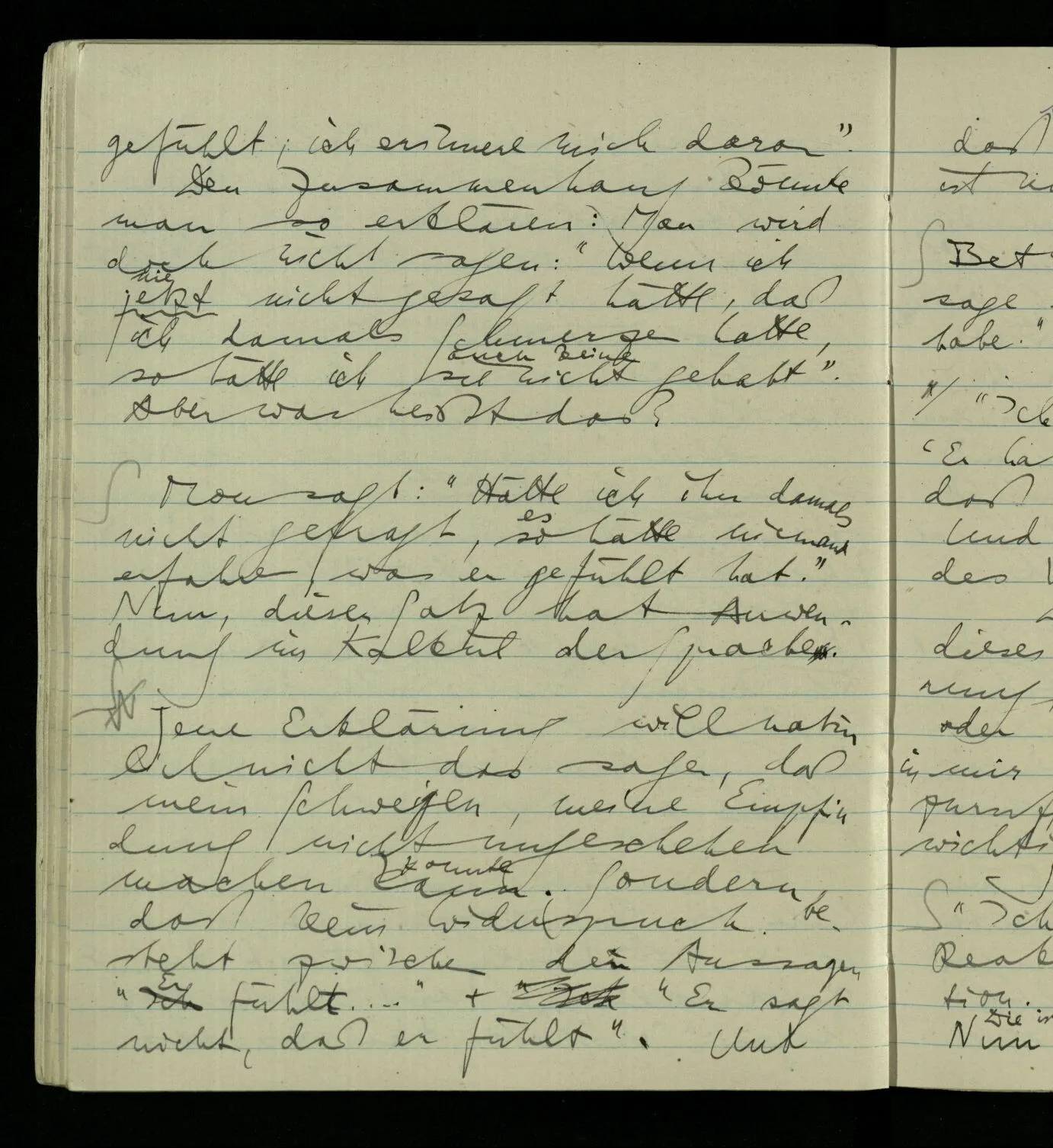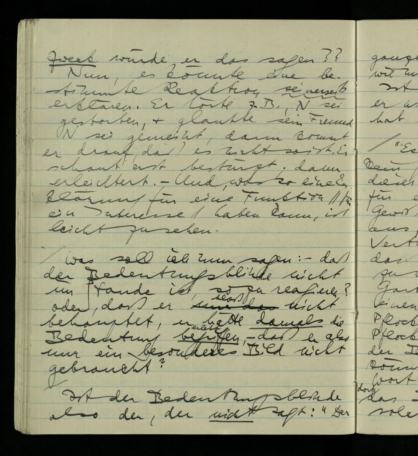 Niemand kümmert sich darum, ob etwas, noch darum, was in mir vorgeht, wenn man zu mir spricht. Man fragt auch für gewöhnlich nicht, wann ich den Satz verstanden habe, & ich merke auch nicht daß es damit einmal so, einmal so beschaffen ist. Außer, wenn ich einmal einen mißverstehe oder dergleichen. Und dann kann die Frage “Wann fingst Du an, ihn zu verstehen” Wichtigkeit erhalten. Aber es ist nun, als ob erst in so einem Falle überhaupt von wichtigen Erlebnissen des Verstehens die Rede wäre. Und könnte man sagen: nur das Erlebnis beim Wechsel der Bedeutungen sei von Wichtigkeit? – Oder auch so: nur das sei das wichtige Erlebnis, das einen gleichzeitigen Ausdruck hat?