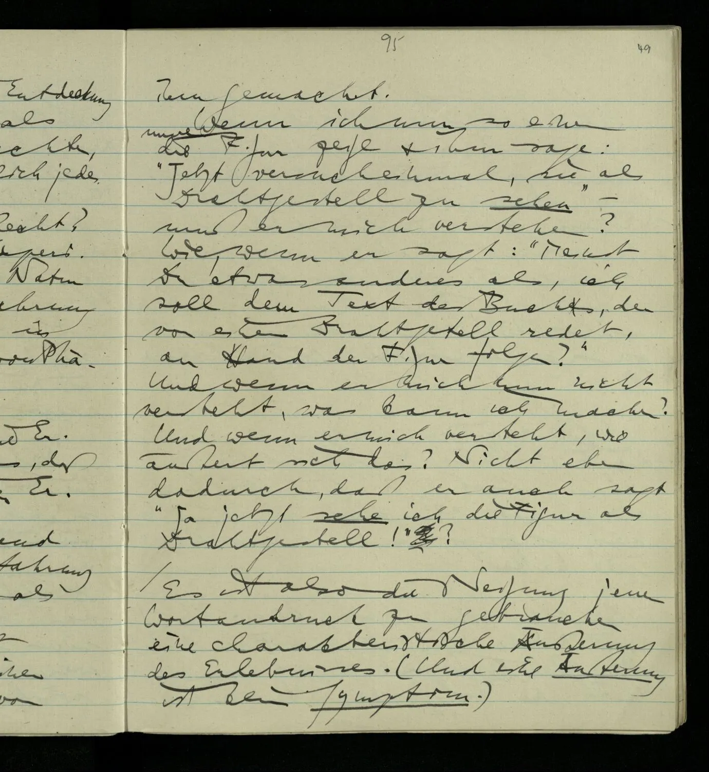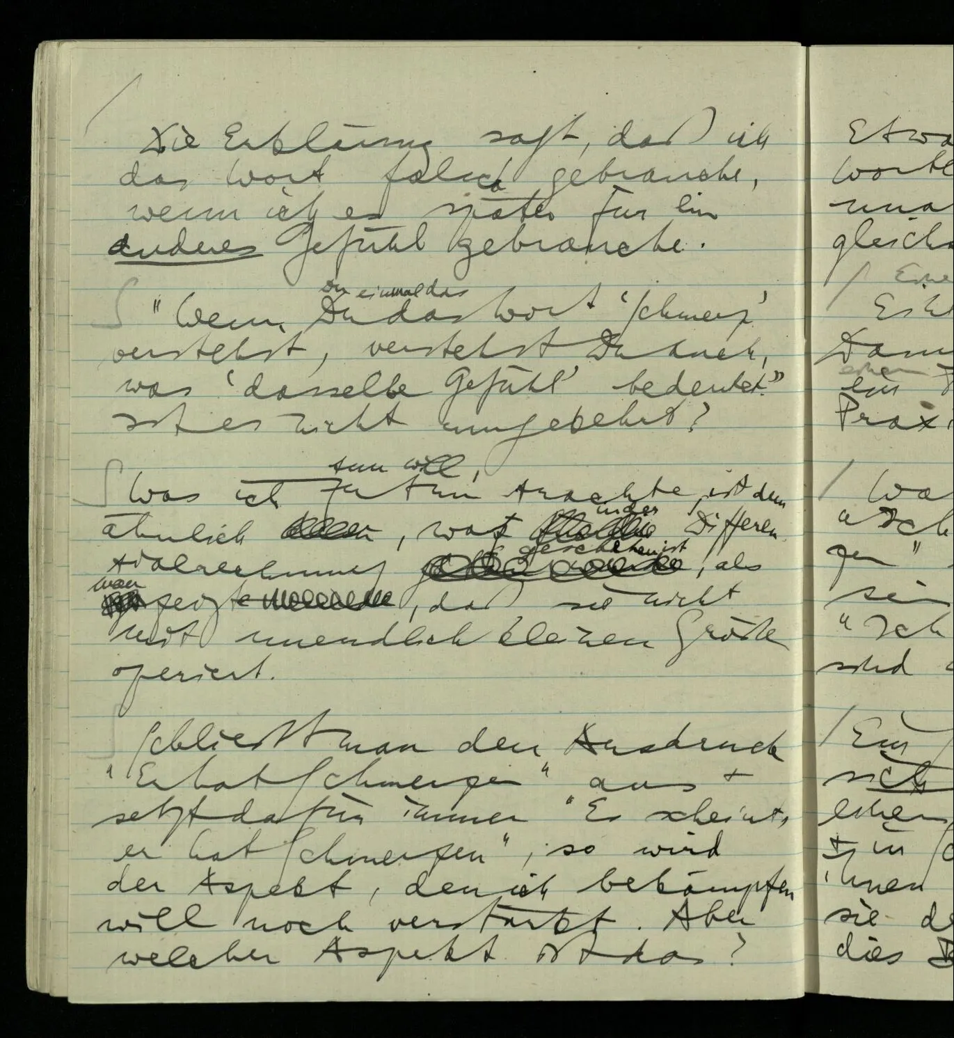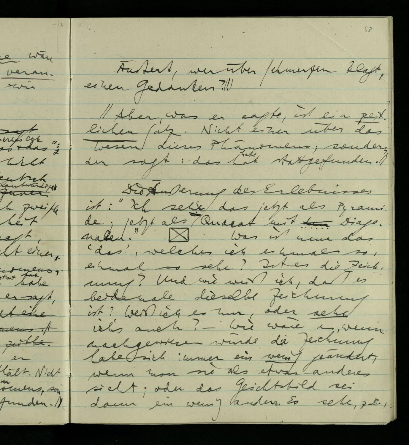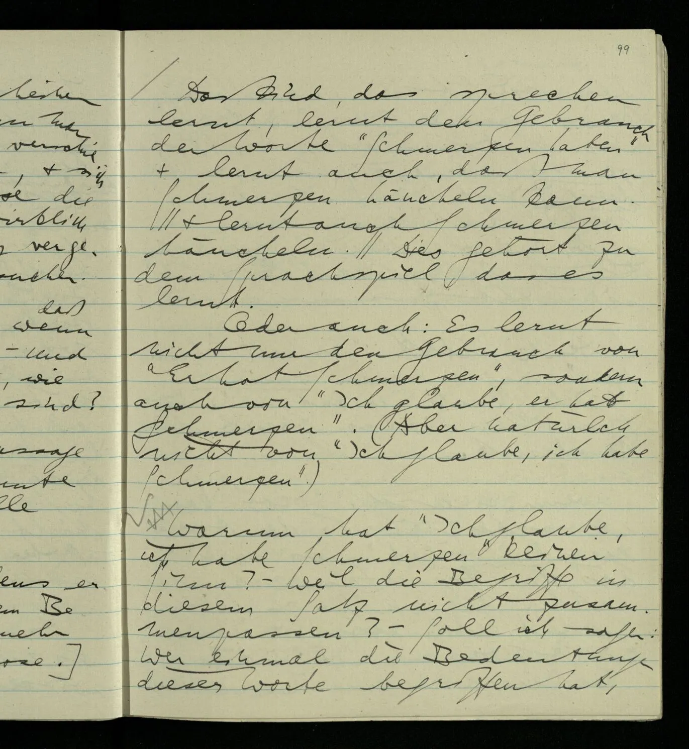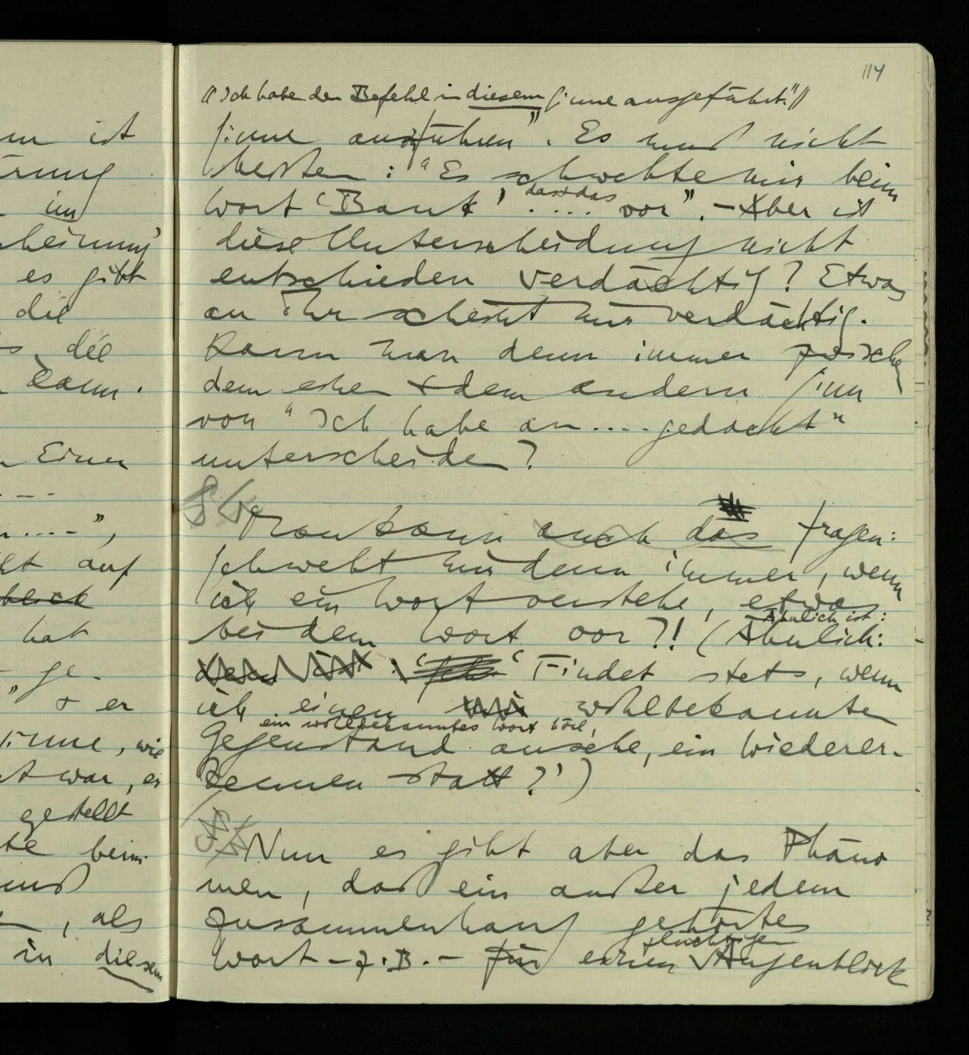 Niemand kümmert sich darum, ob etwas, noch darum, was in mir vorgeht, wenn man zu mir spricht. Man fragt auch für gewöhnlich nicht, wann ich den Satz verstanden habe, & ich merke auch nicht daß es damit einmal so, einmal so beschaffen ist. Außer, wenn ich einmal einen mißverstehe oder dergleichen. Und dann kann die Frage “Wann fingst Du an, ihn zu verstehen” Wichtigkeit erhalten. Aber es ist nun, als ob erst in so einem Falle überhaupt von wichtigen Erlebnissen des Verstehens die Rede wäre. Und könnte man sagen: nur das Erlebnis beim Wechsel der Bedeutungen sei von Wichtigkeit? – Oder auch so: nur das sei das wichtige Erlebnis, das einen gleichzeitigen Ausdruck hat?