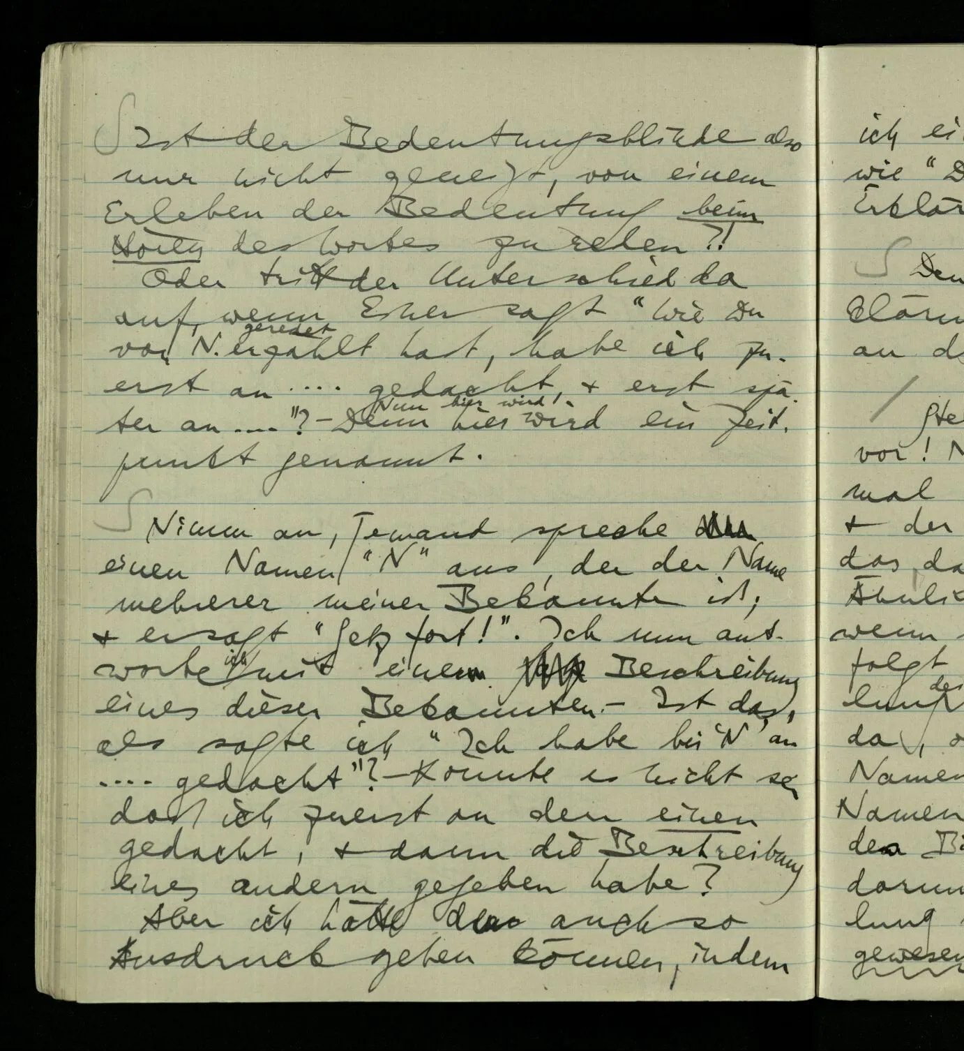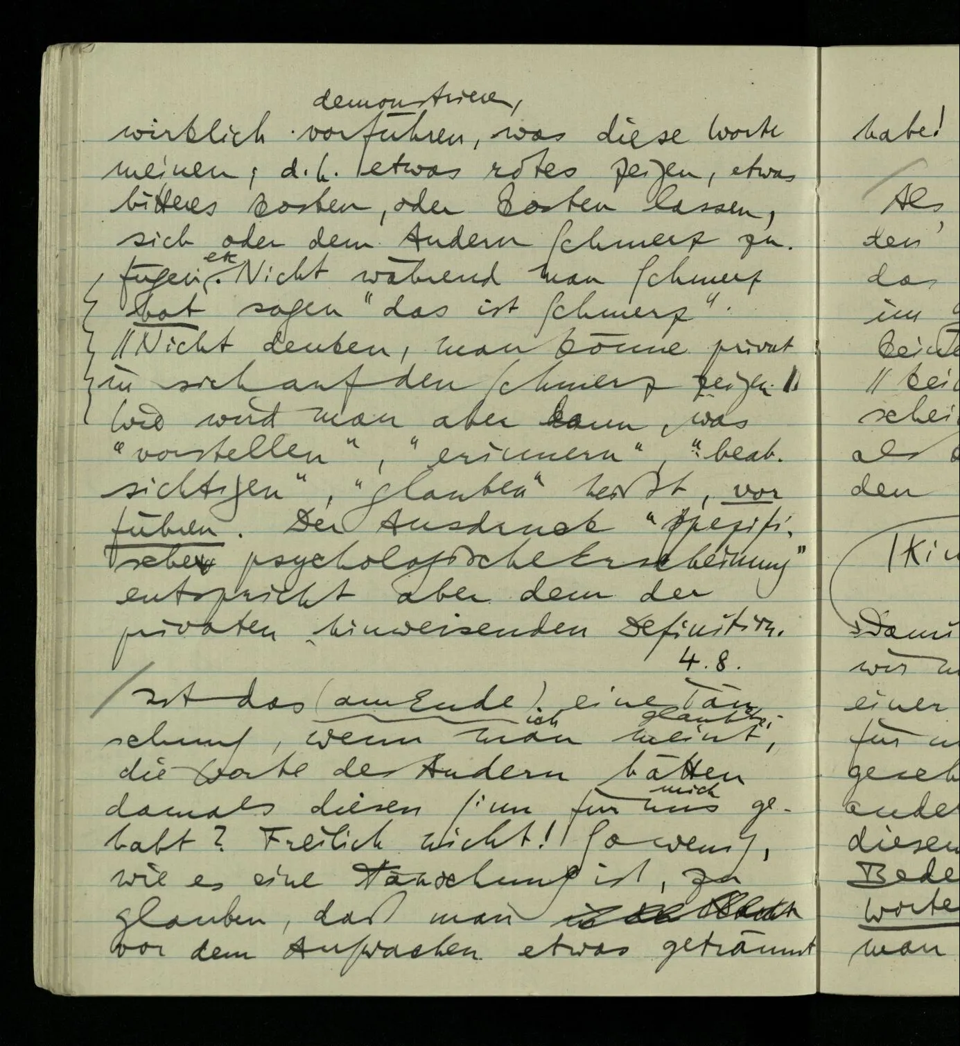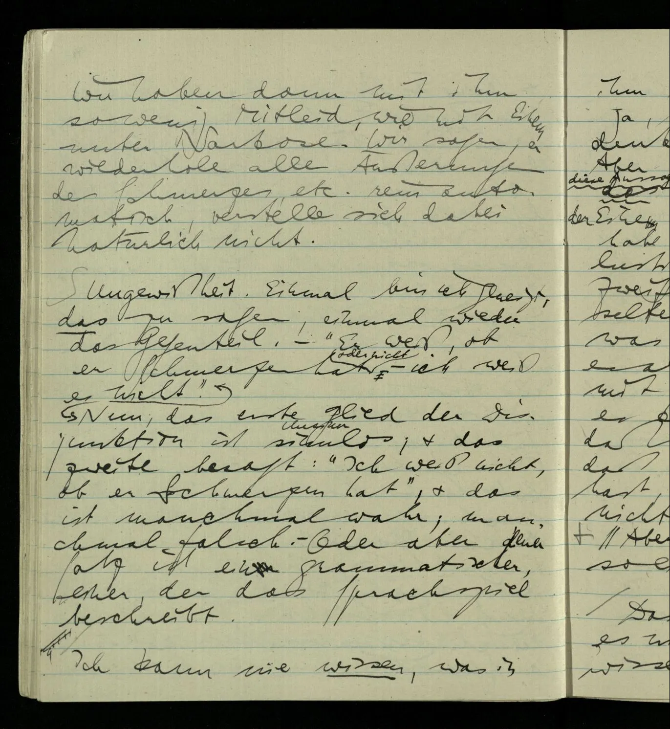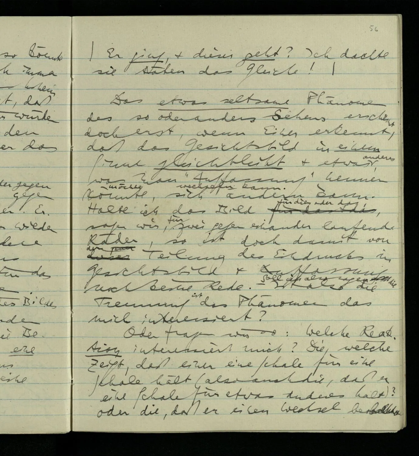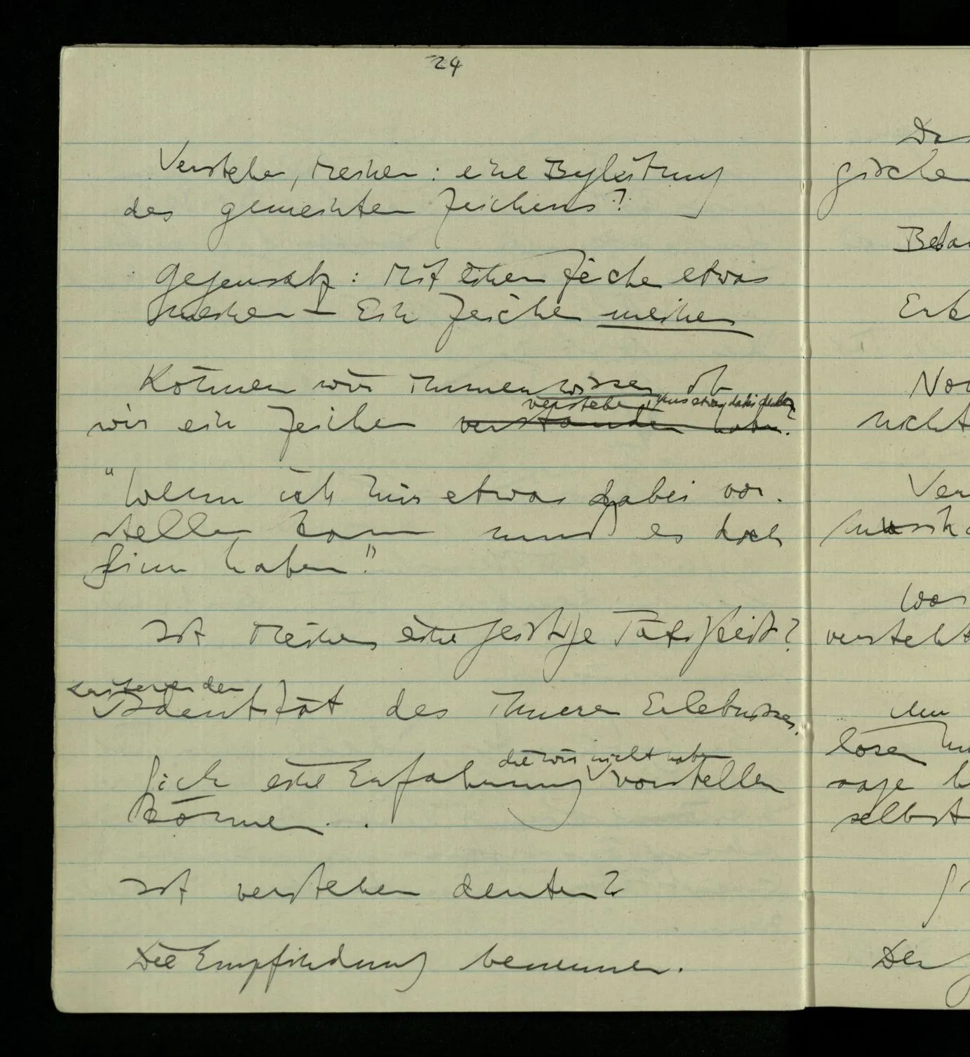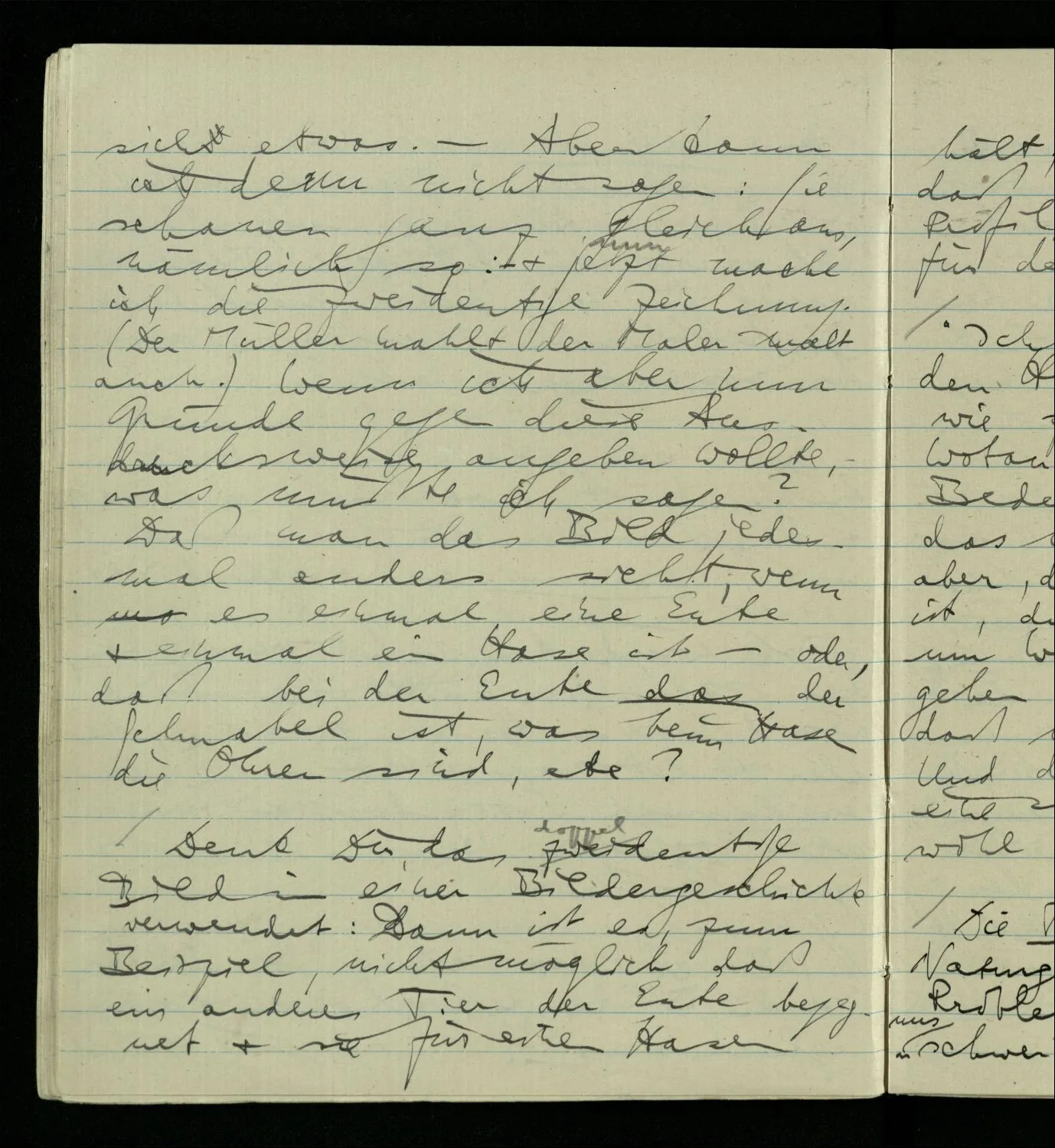 Niemand kümmert sich darum, ob etwas, noch darum, was in mir vorgeht, wenn man zu mir spricht. Man fragt auch für gewöhnlich nicht, wann ich den Satz verstanden habe, & ich merke auch nicht daß es damit einmal so, einmal so beschaffen ist. Außer, wenn ich einmal einen mißverstehe oder dergleichen. Und dann kann die Frage “Wann fingst Du an, ihn zu verstehen” Wichtigkeit erhalten. Aber es ist nun, als ob erst in so einem Falle überhaupt von wichtigen Erlebnissen des Verstehens die Rede wäre. Und könnte man sagen: nur das Erlebnis beim Wechsel der Bedeutungen sei von Wichtigkeit? – Oder auch so: nur das sei das wichtige Erlebnis, das einen gleichzeitigen Ausdruck hat?