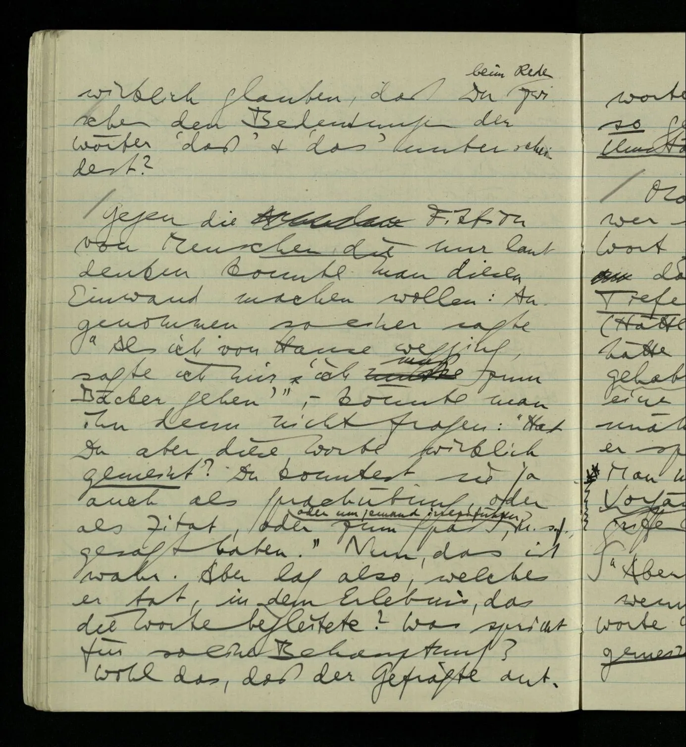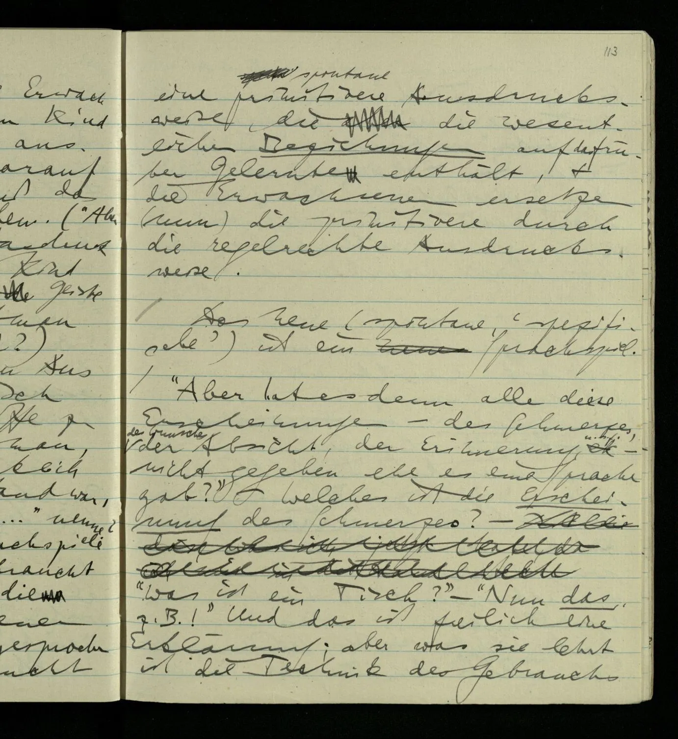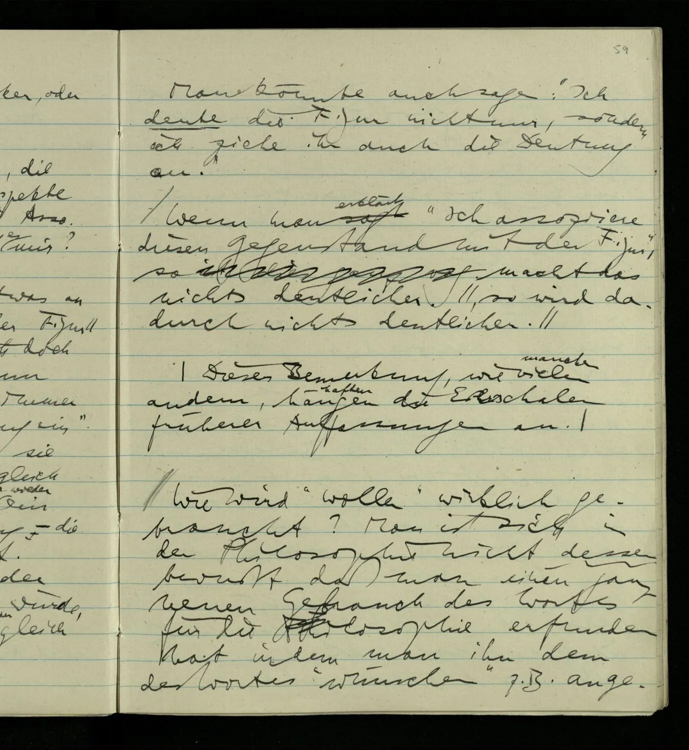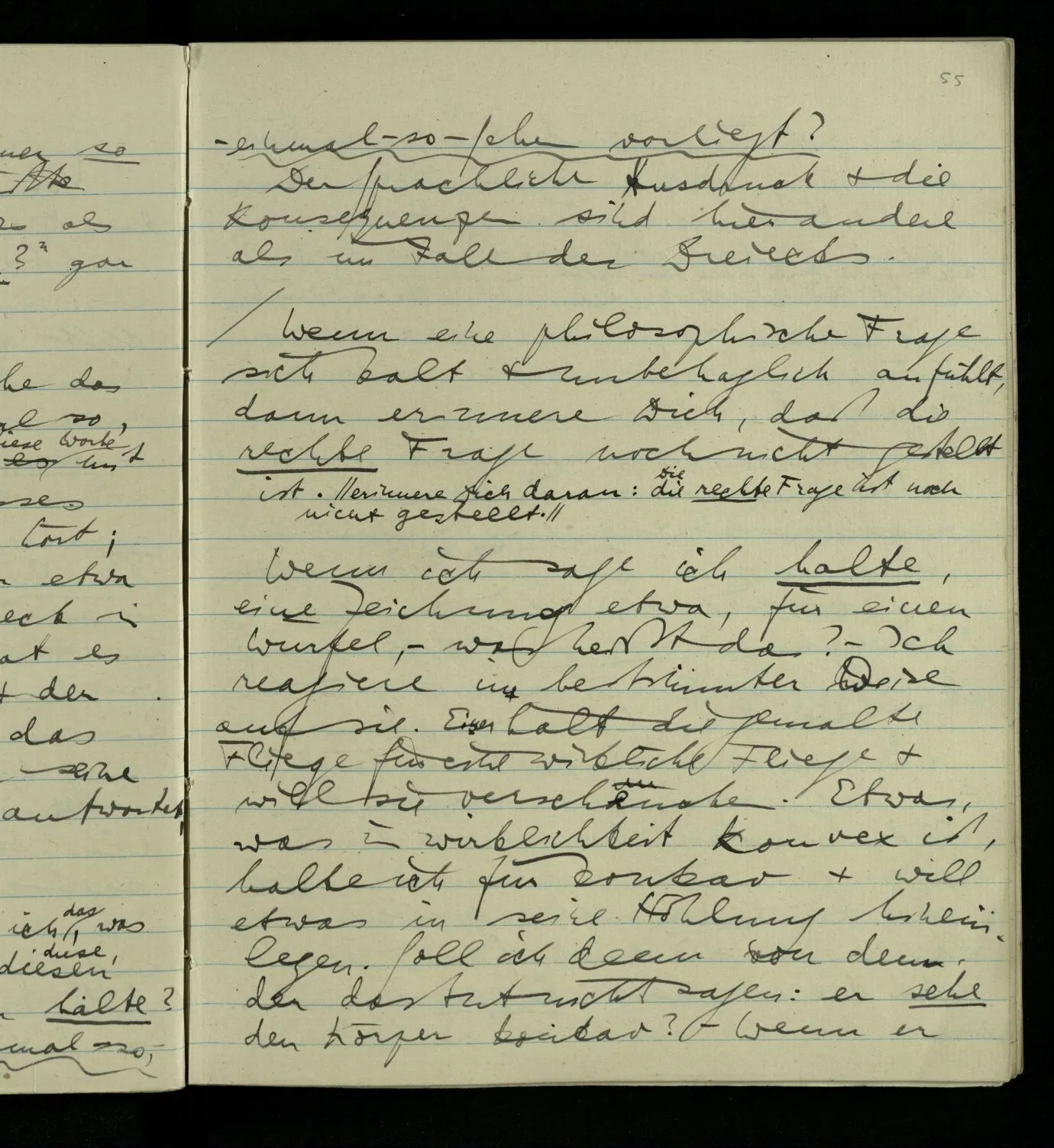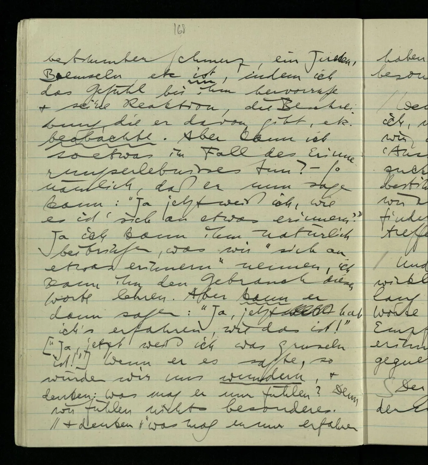 Niemand kümmert sich darum, ob etwas, noch darum, was in mir vorgeht, wenn man zu mir spricht. Man fragt auch für gewöhnlich nicht, wann ich den Satz verstanden habe, & ich merke auch nicht daß es damit einmal so, einmal so beschaffen ist. Außer, wenn ich einmal einen mißverstehe oder dergleichen. Und dann kann die Frage “Wann fingst Du an, ihn zu verstehen” Wichtigkeit erhalten. Aber es ist nun, als ob erst in so einem Falle überhaupt von wichtigen Erlebnissen des Verstehens die Rede wäre. Und könnte man sagen: nur das Erlebnis beim Wechsel der Bedeutungen sei von Wichtigkeit? – Oder auch so: nur das sei das wichtige Erlebnis, das einen gleichzeitigen Ausdruck hat?