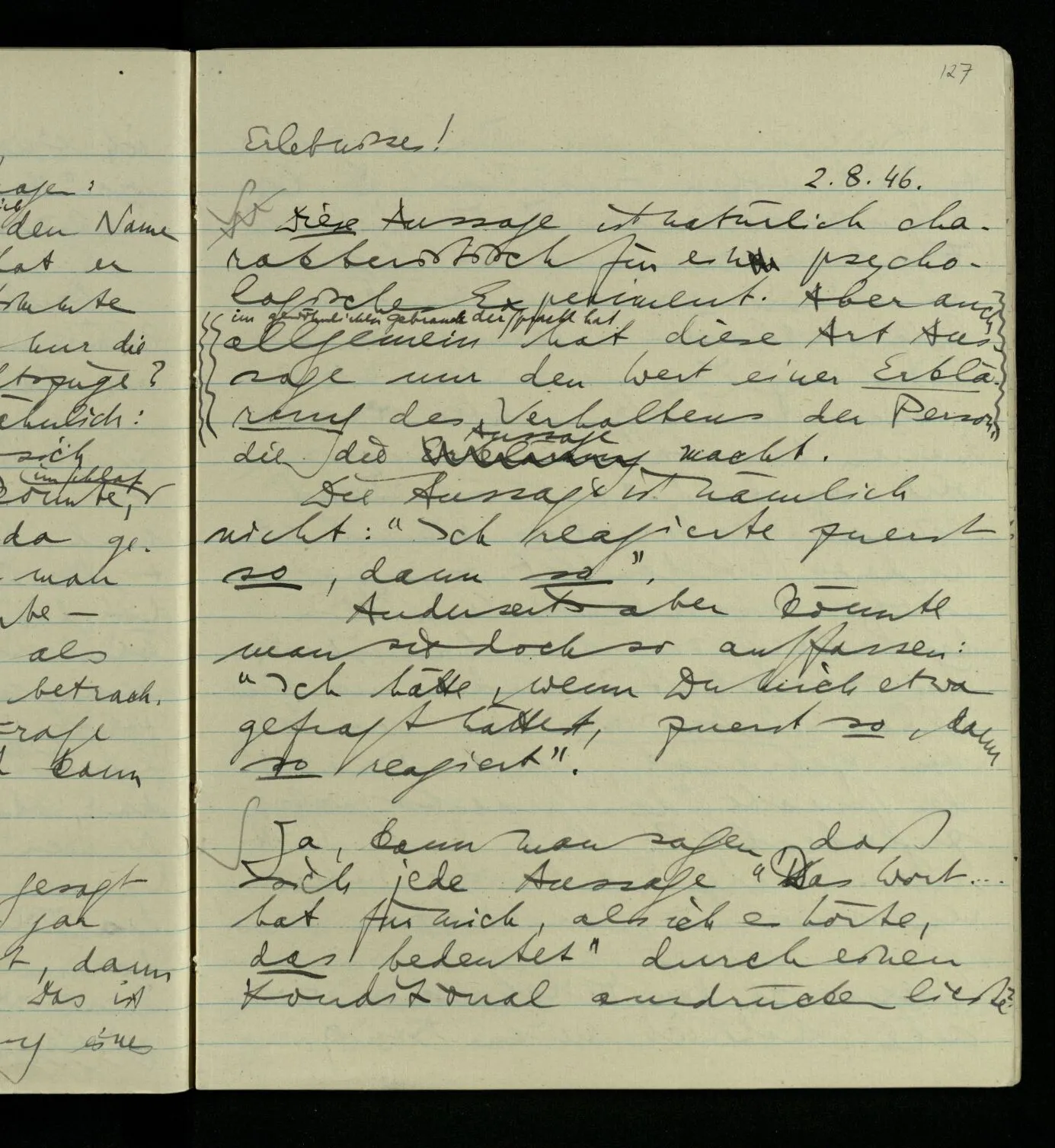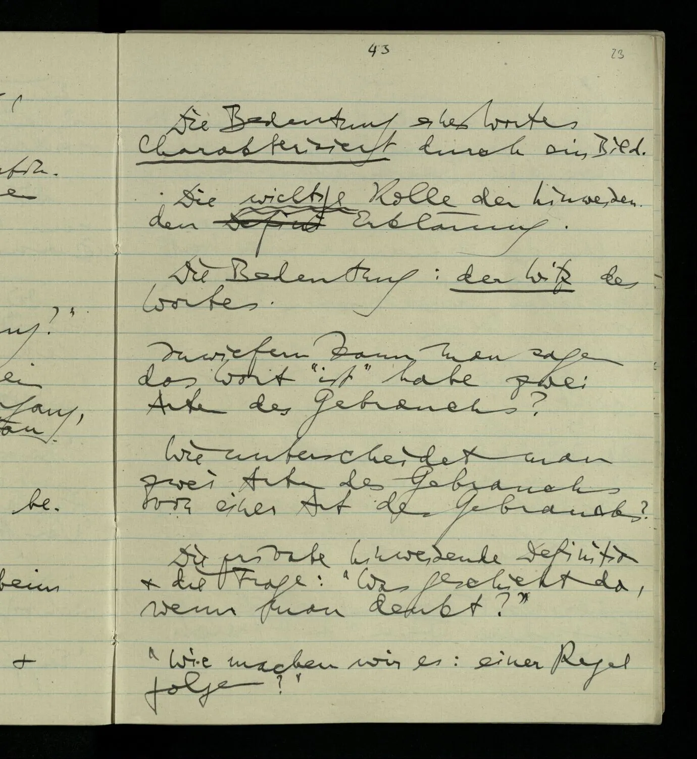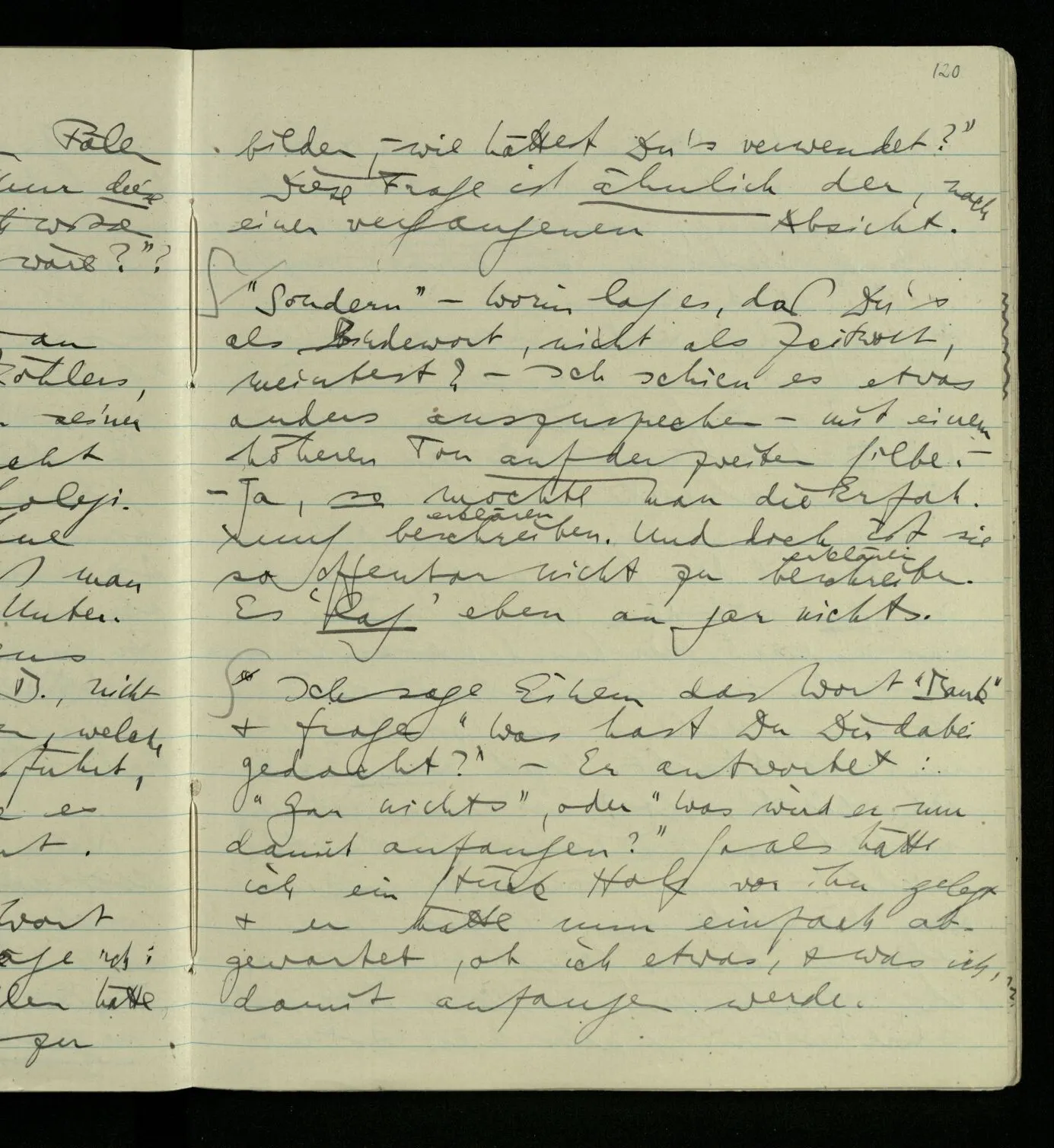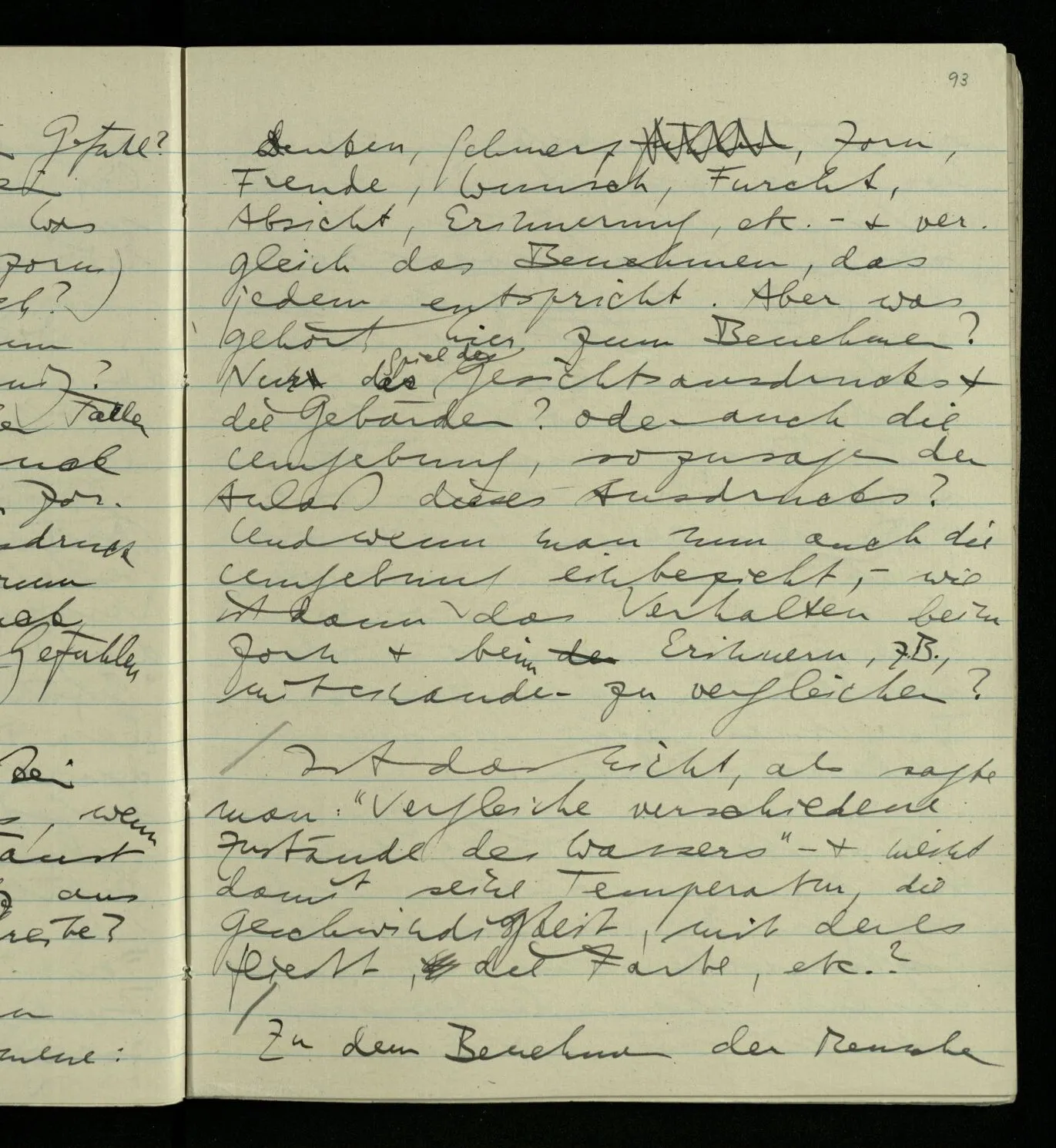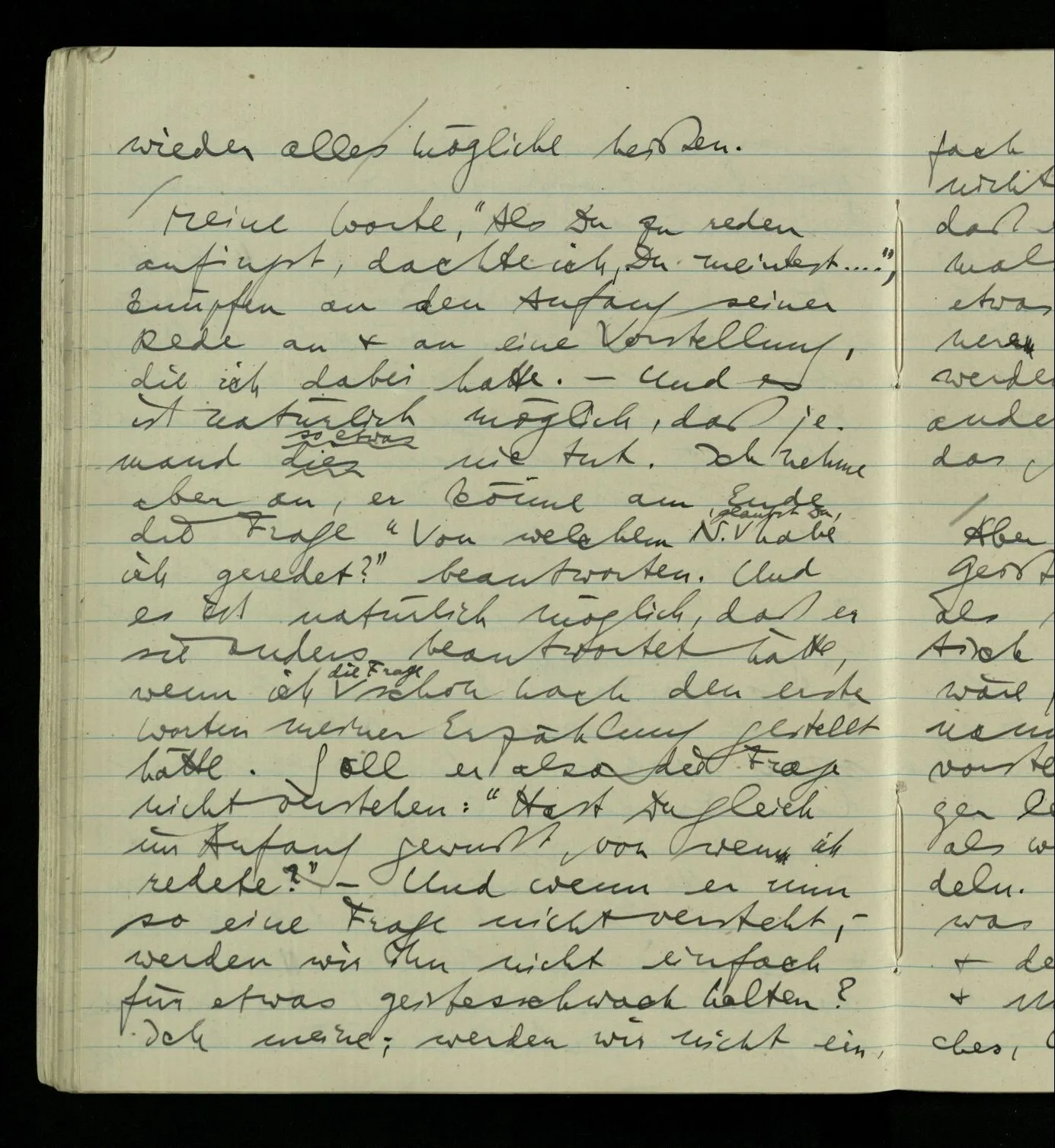 Niemand kümmert sich darum, ob etwas, noch darum, was in mir vorgeht, wenn man zu mir spricht. Man fragt auch für gewöhnlich nicht, wann ich den Satz verstanden habe, & ich merke auch nicht daß es damit einmal so, einmal so beschaffen ist. Außer, wenn ich einmal einen mißverstehe oder dergleichen. Und dann kann die Frage “Wann fingst Du an, ihn zu verstehen” Wichtigkeit erhalten. Aber es ist nun, als ob erst in so einem Falle überhaupt von wichtigen Erlebnissen des Verstehens die Rede wäre. Und könnte man sagen: nur das Erlebnis beim Wechsel der Bedeutungen sei von Wichtigkeit? – Oder auch so: nur das sei das wichtige Erlebnis, das einen gleichzeitigen Ausdruck hat?