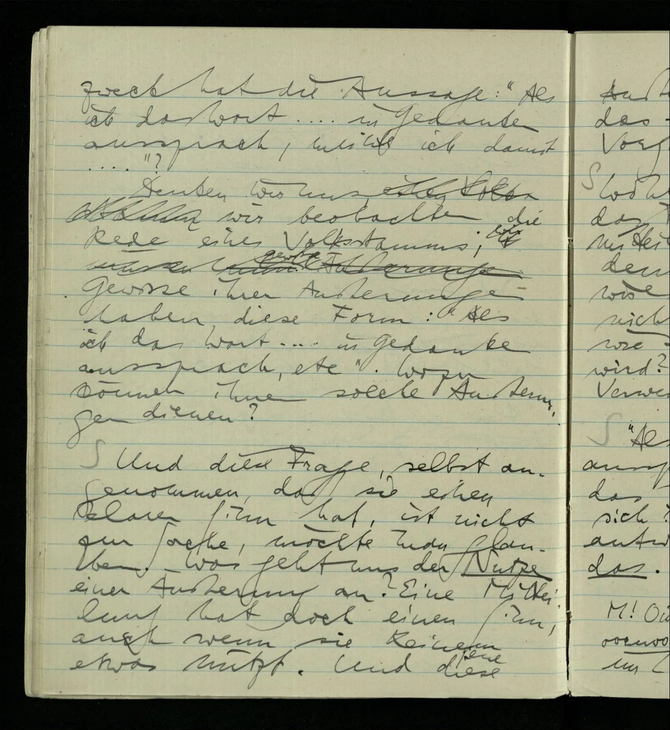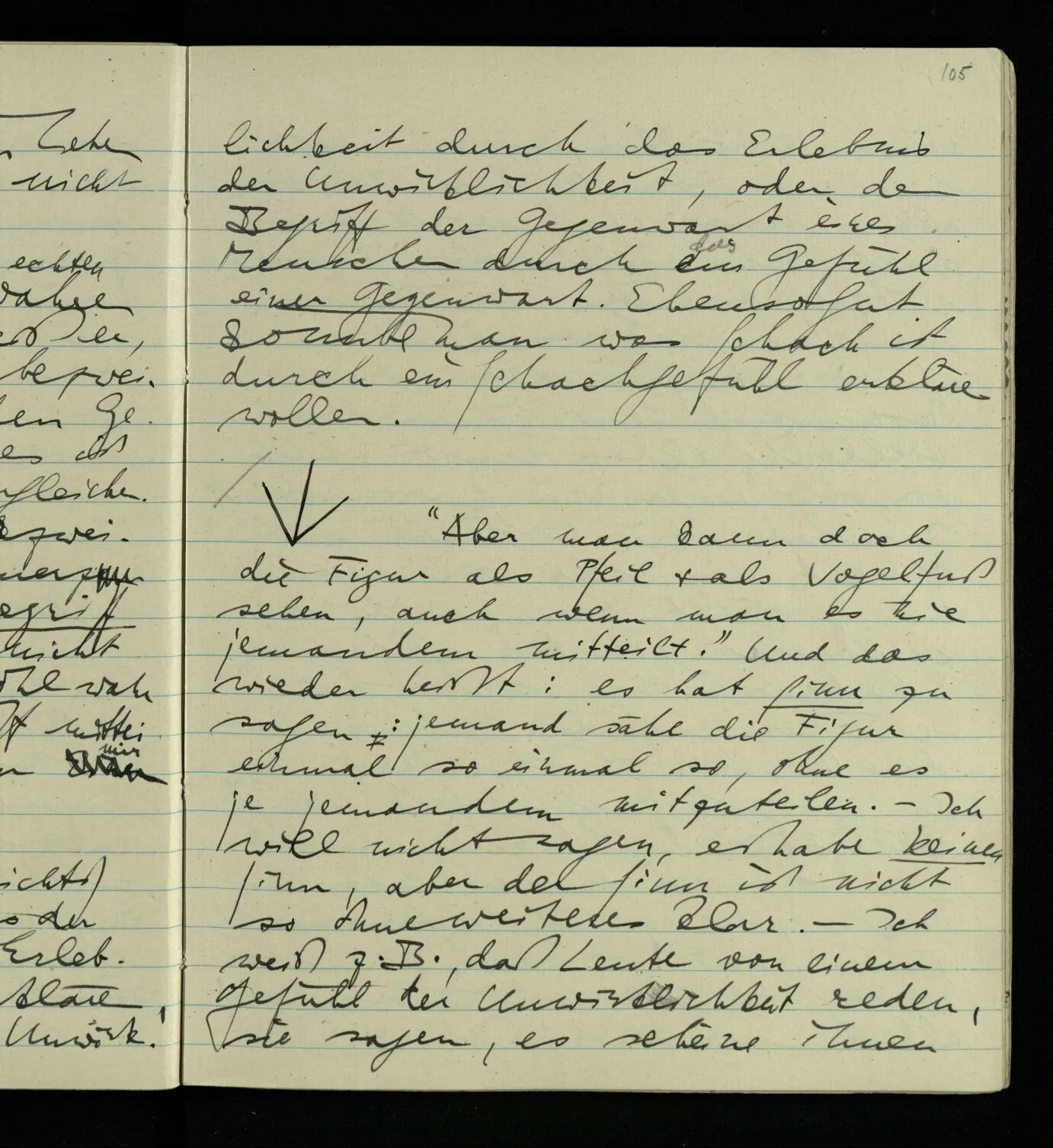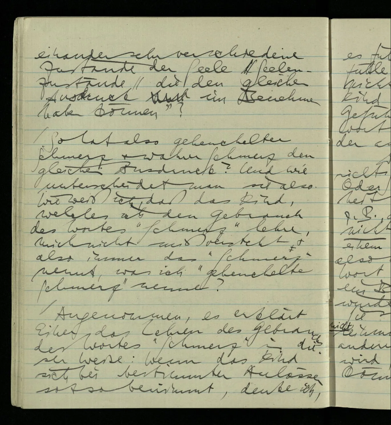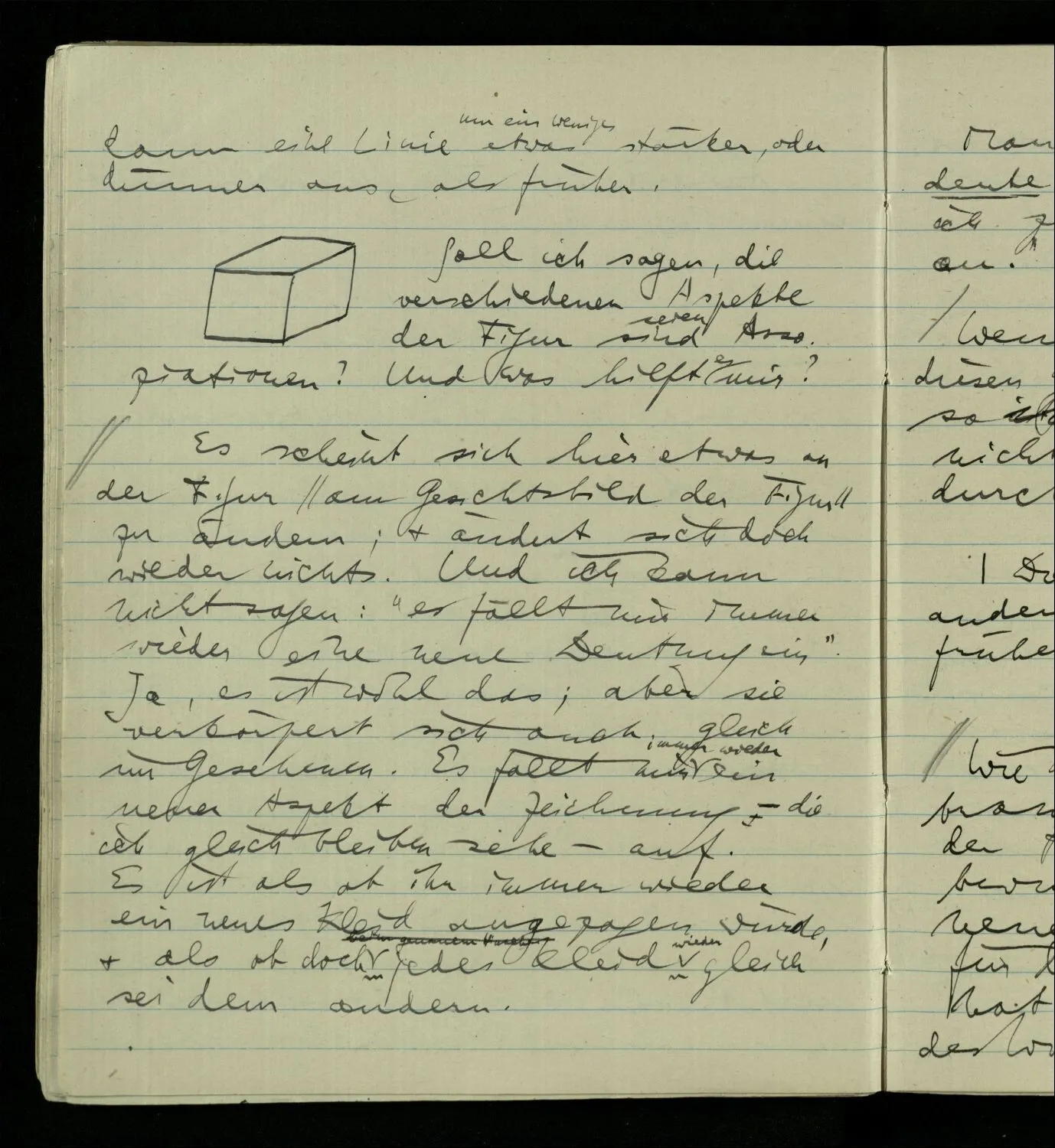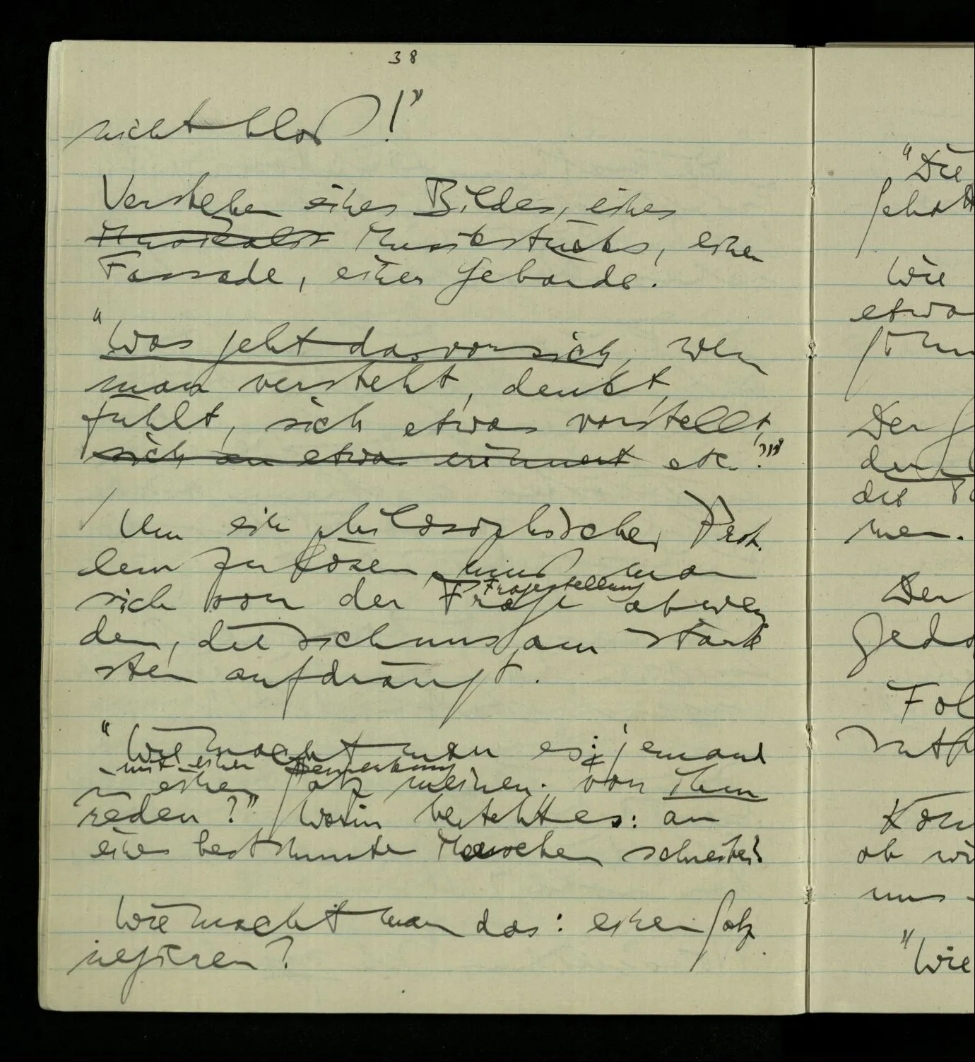 Niemand kümmert sich darum, ob etwas, noch darum, was in mir vorgeht, wenn man zu mir spricht. Man fragt auch für gewöhnlich nicht, wann ich den Satz verstanden habe, & ich merke auch nicht daß es damit einmal so, einmal so beschaffen ist. Außer, wenn ich einmal einen mißverstehe oder dergleichen. Und dann kann die Frage “Wann fingst Du an, ihn zu verstehen” Wichtigkeit erhalten. Aber es ist nun, als ob erst in so einem Falle überhaupt von wichtigen Erlebnissen des Verstehens die Rede wäre. Und könnte man sagen: nur das Erlebnis beim Wechsel der Bedeutungen sei von Wichtigkeit? – Oder auch so: nur das sei das wichtige Erlebnis, das einen gleichzeitigen Ausdruck hat?