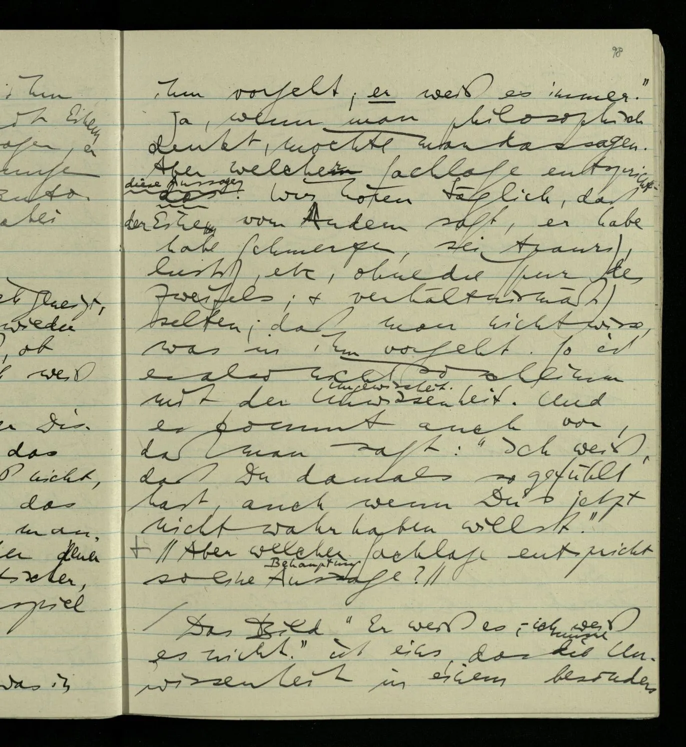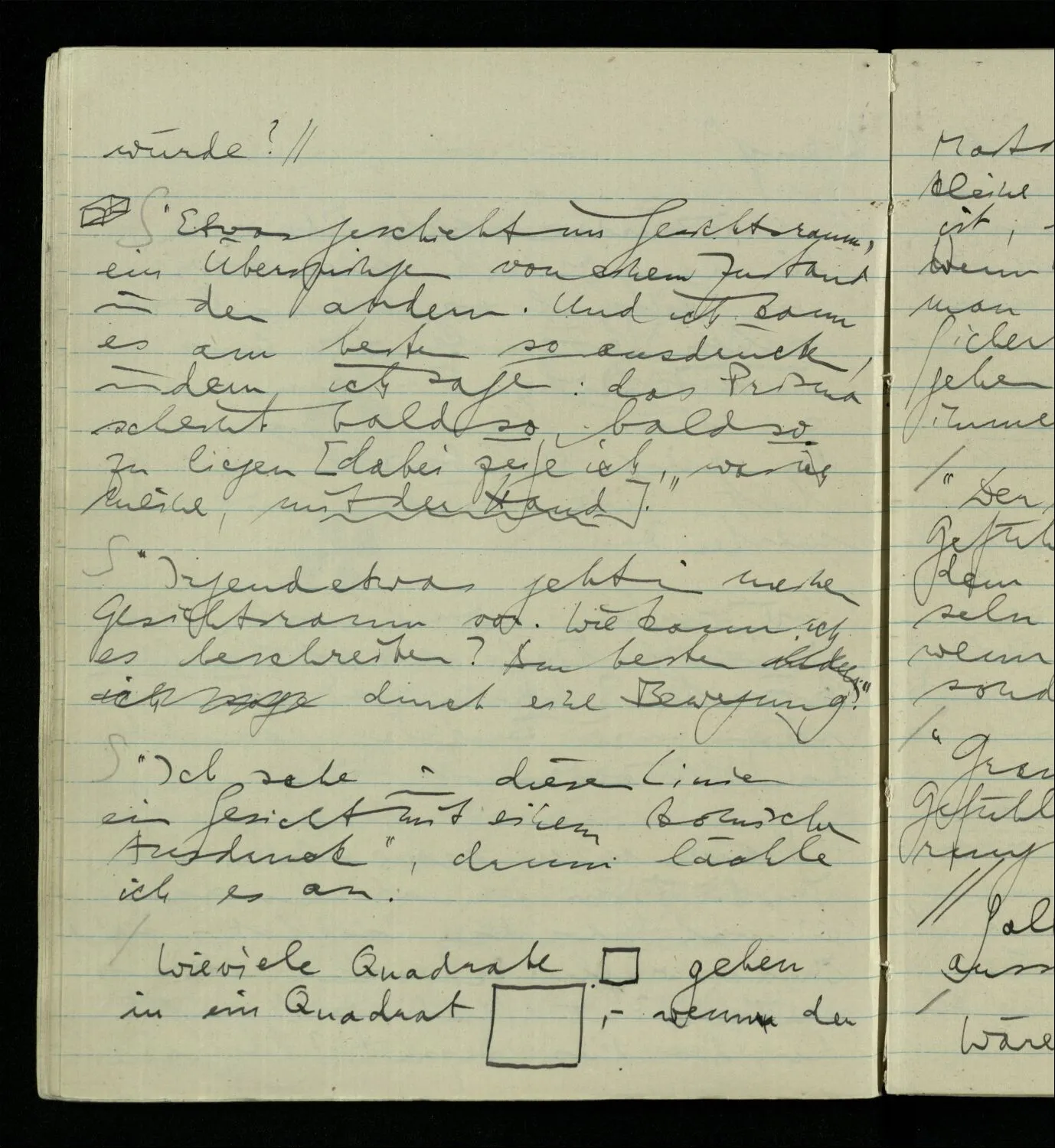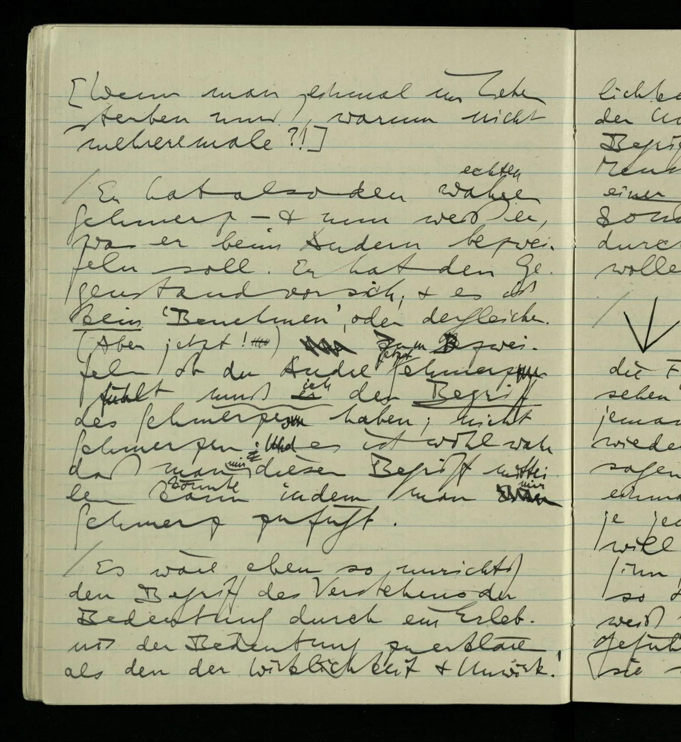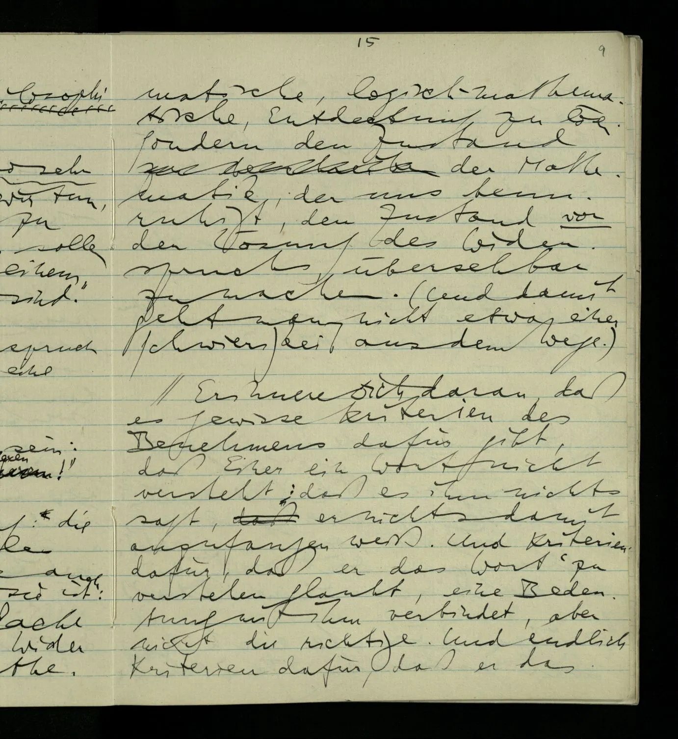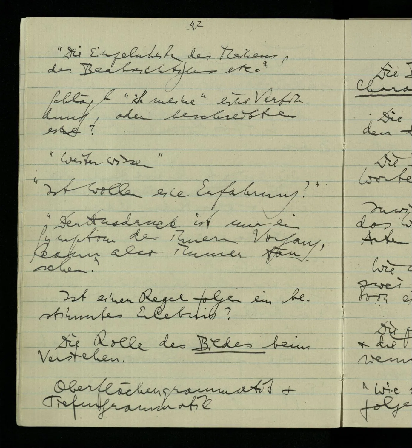 Niemand kümmert sich darum, ob etwas, noch darum, was in mir vorgeht, wenn man zu mir spricht. Man fragt auch für gewöhnlich nicht, wann ich den Satz verstanden habe, & ich merke auch nicht daß es damit einmal so, einmal so beschaffen ist. Außer, wenn ich einmal einen mißverstehe oder dergleichen. Und dann kann die Frage “Wann fingst Du an, ihn zu verstehen” Wichtigkeit erhalten. Aber es ist nun, als ob erst in so einem Falle überhaupt von wichtigen Erlebnissen des Verstehens die Rede wäre. Und könnte man sagen: nur das Erlebnis beim Wechsel der Bedeutungen sei von Wichtigkeit? – Oder auch so: nur das sei das wichtige Erlebnis, das einen gleichzeitigen Ausdruck hat?