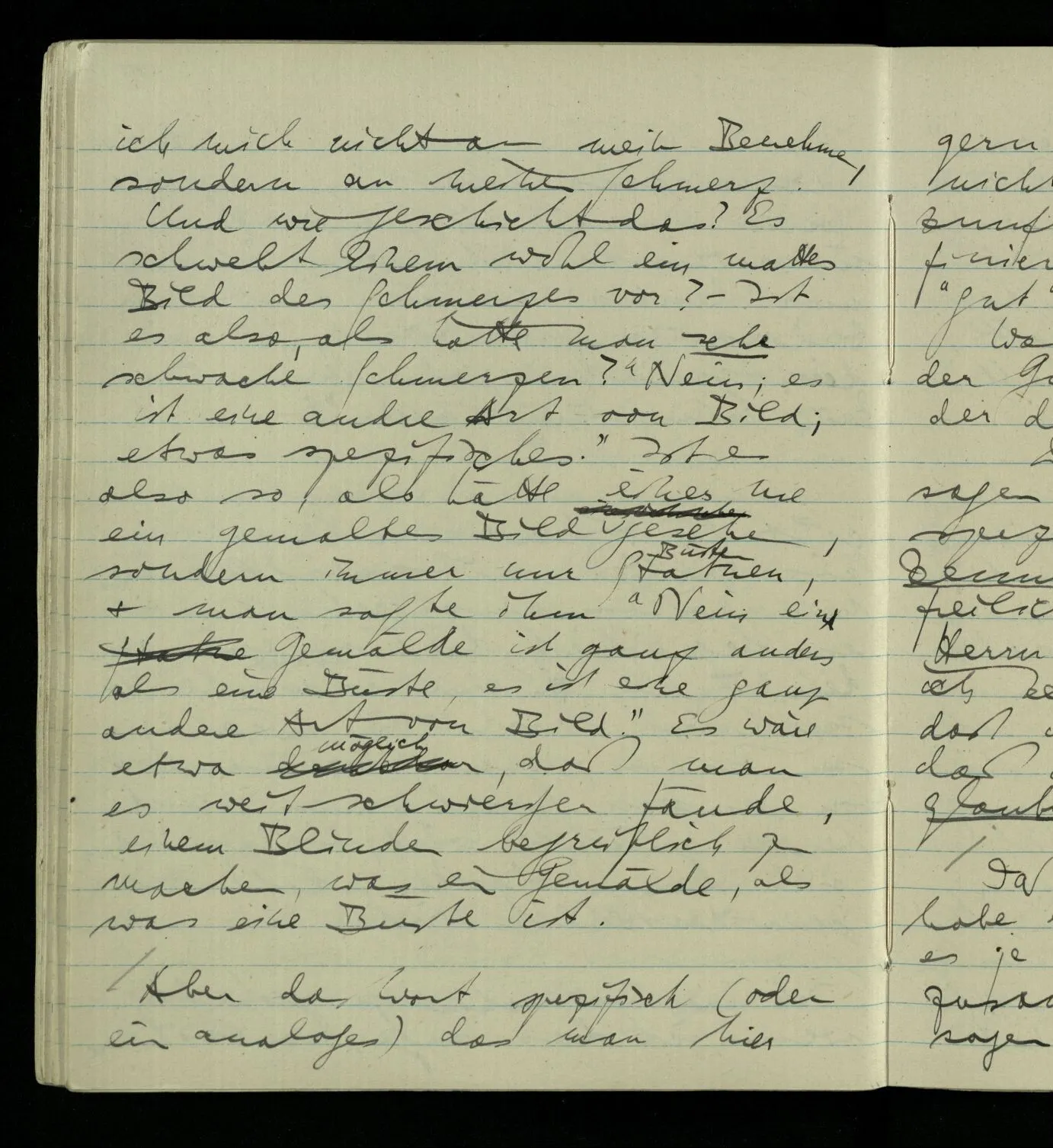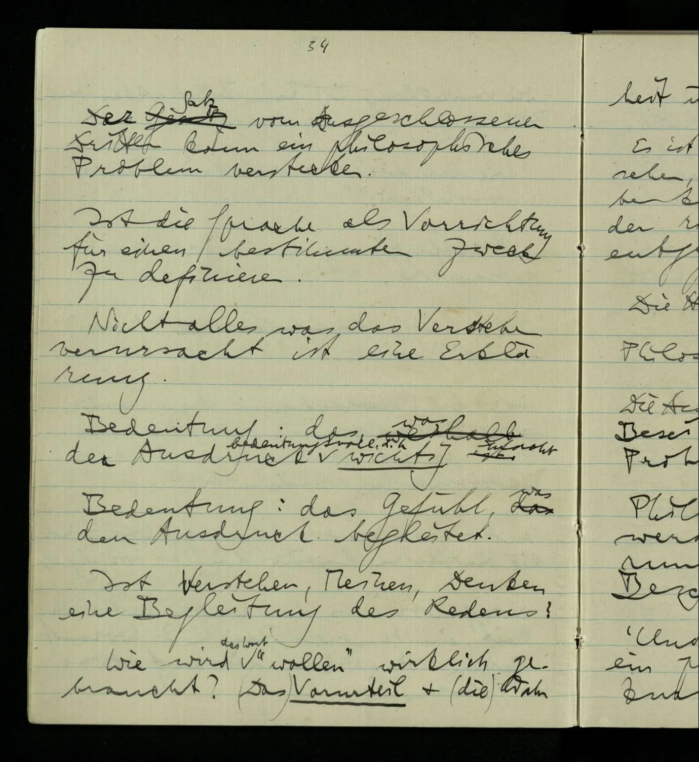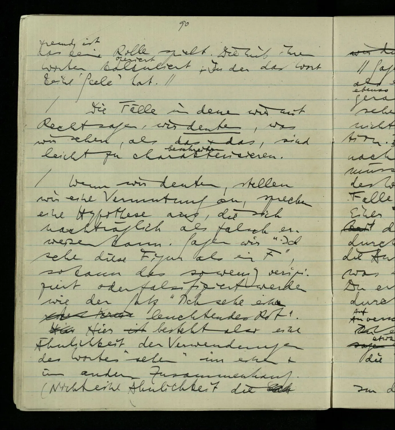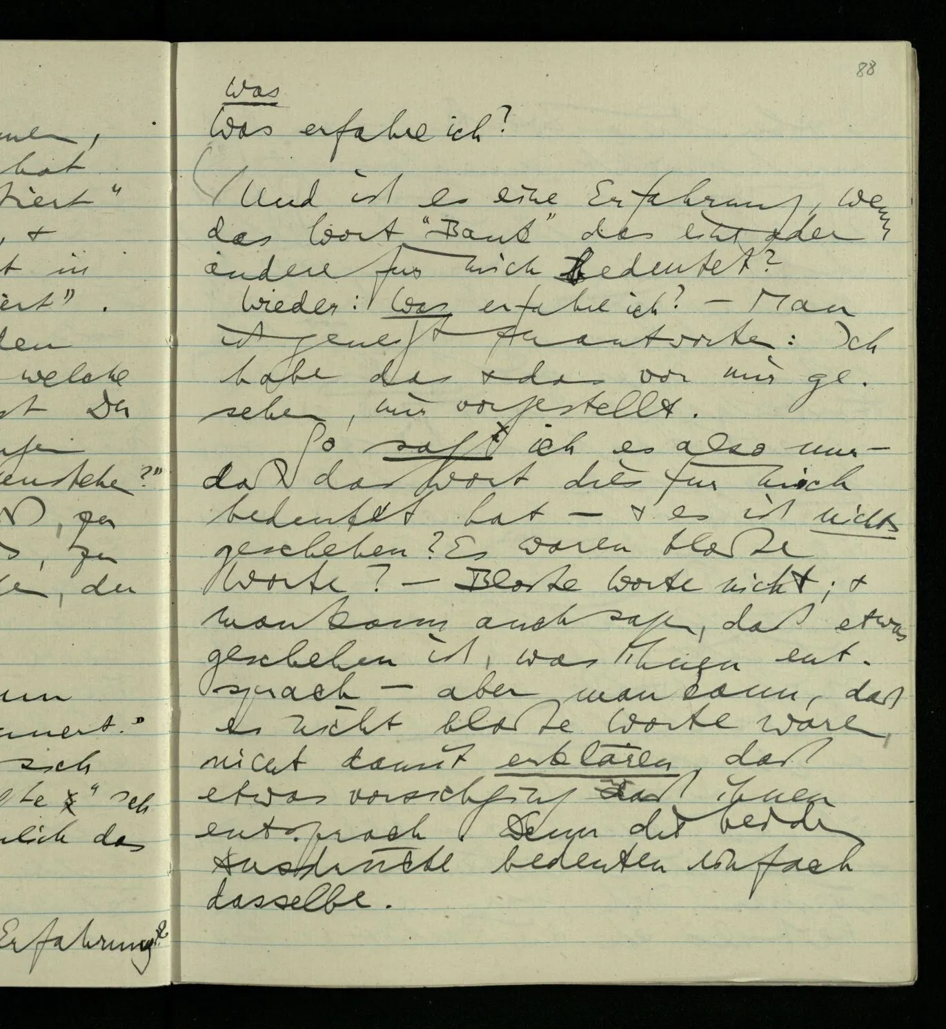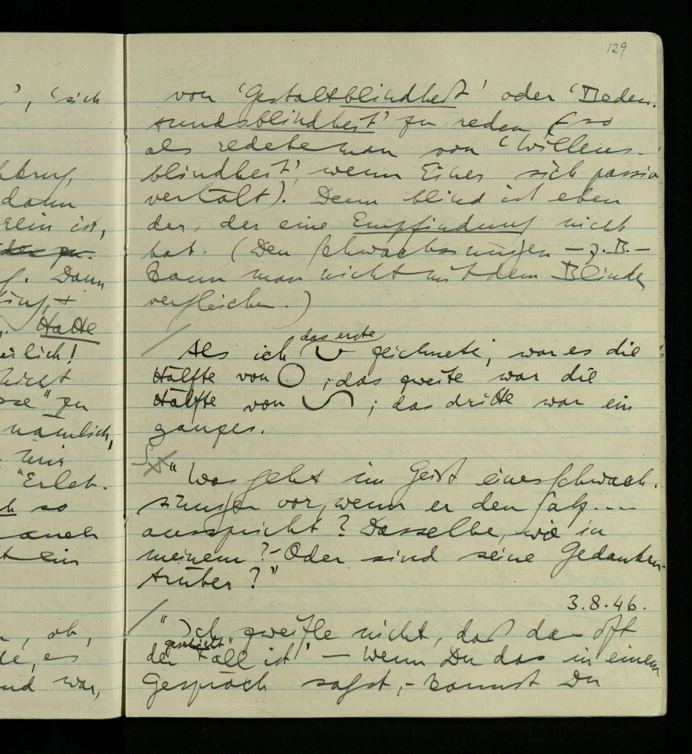 Niemand kümmert sich darum, ob etwas, noch darum, was in mir vorgeht, wenn man zu mir spricht. Man fragt auch für gewöhnlich nicht, wann ich den Satz verstanden habe, & ich merke auch nicht daß es damit einmal so, einmal so beschaffen ist. Außer, wenn ich einmal einen mißverstehe oder dergleichen. Und dann kann die Frage “Wann fingst Du an, ihn zu verstehen” Wichtigkeit erhalten. Aber es ist nun, als ob erst in so einem Falle überhaupt von wichtigen Erlebnissen des Verstehens die Rede wäre. Und könnte man sagen: nur das Erlebnis beim Wechsel der Bedeutungen sei von Wichtigkeit? – Oder auch so: nur das sei das wichtige Erlebnis, das einen gleichzeitigen Ausdruck hat?