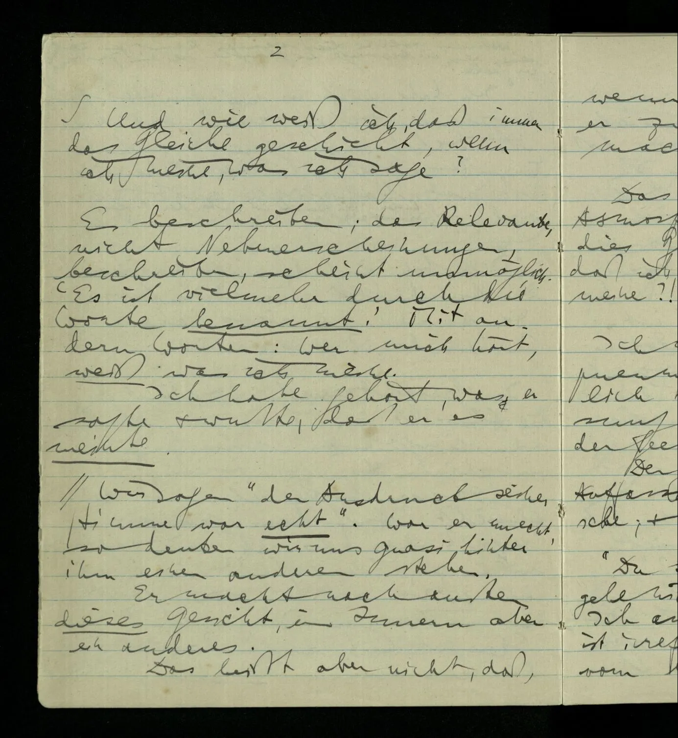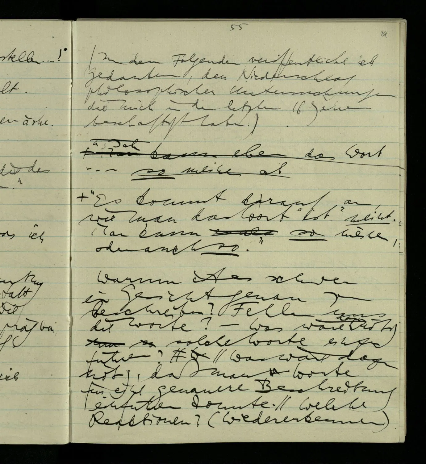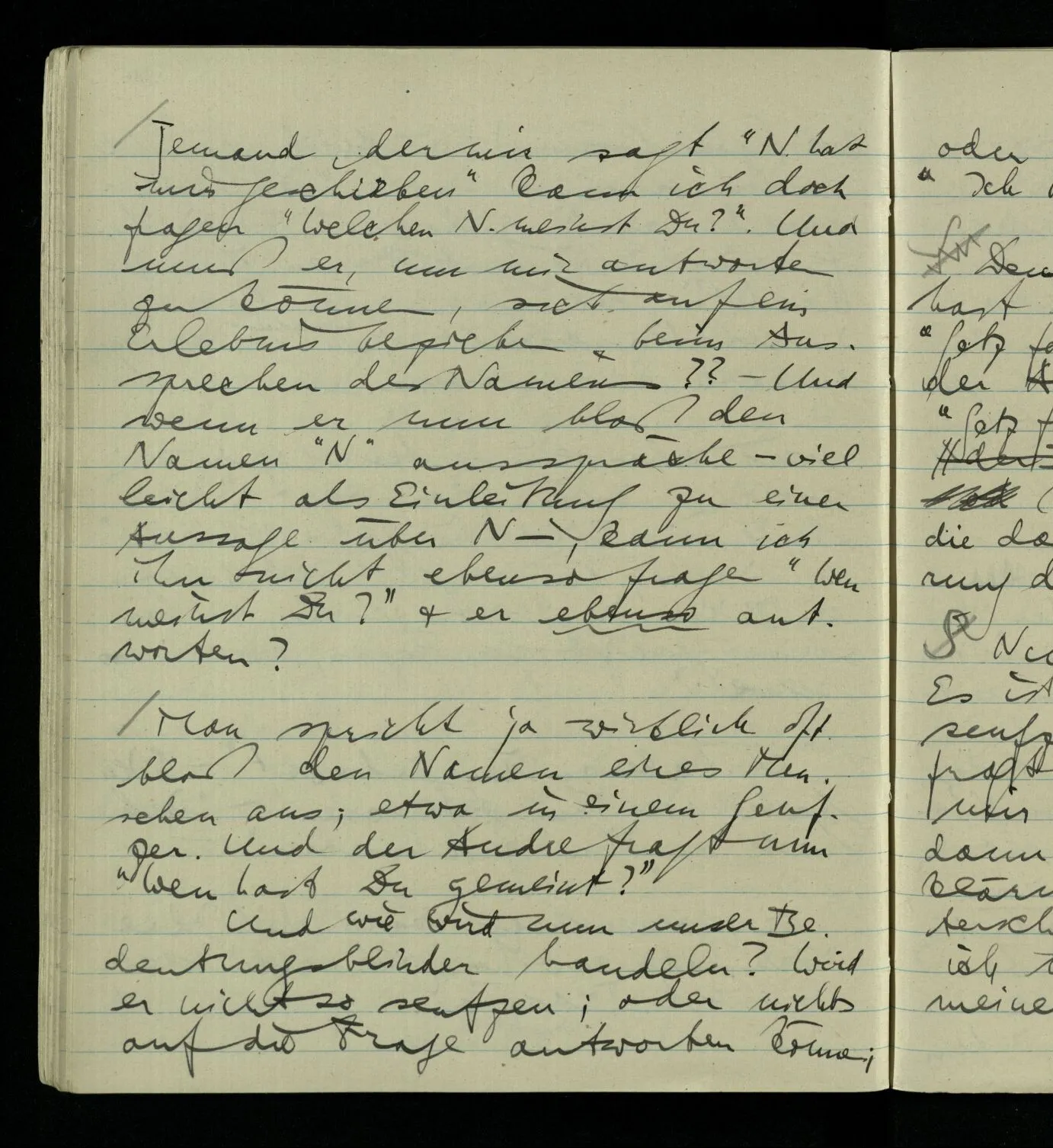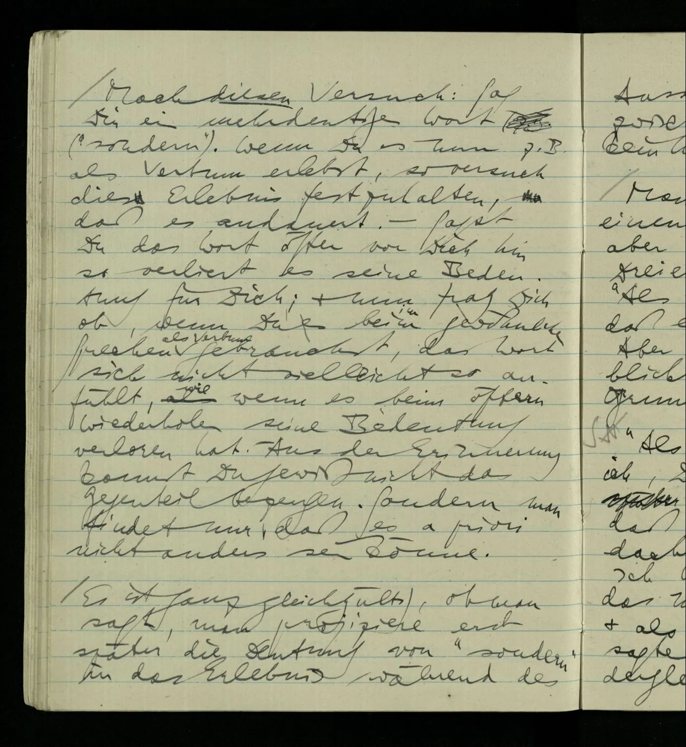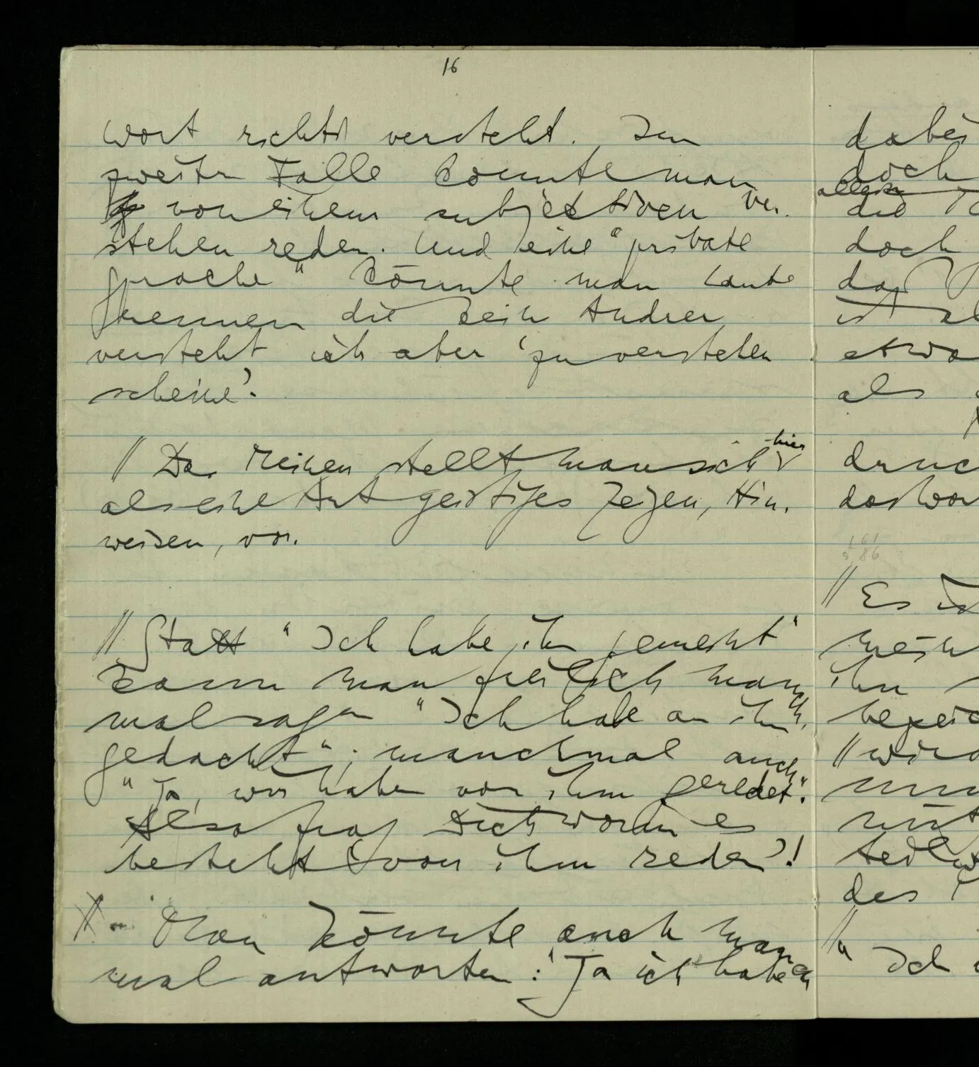 Niemand kümmert sich darum, ob etwas, noch darum, was in mir vorgeht, wenn man zu mir spricht. Man fragt auch für gewöhnlich nicht, wann ich den Satz verstanden habe, & ich merke auch nicht daß es damit einmal so, einmal so beschaffen ist. Außer, wenn ich einmal einen mißverstehe oder dergleichen. Und dann kann die Frage “Wann fingst Du an, ihn zu verstehen” Wichtigkeit erhalten. Aber es ist nun, als ob erst in so einem Falle überhaupt von wichtigen Erlebnissen des Verstehens die Rede wäre. Und könnte man sagen: nur das Erlebnis beim Wechsel der Bedeutungen sei von Wichtigkeit? – Oder auch so: nur das sei das wichtige Erlebnis, das einen gleichzeitigen Ausdruck hat?