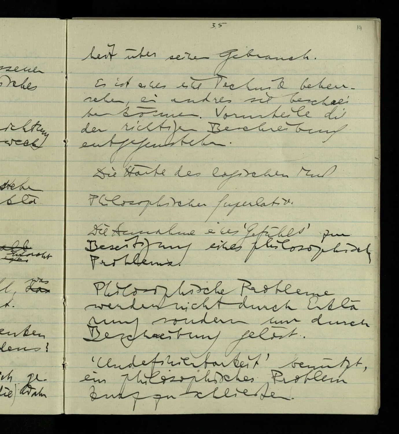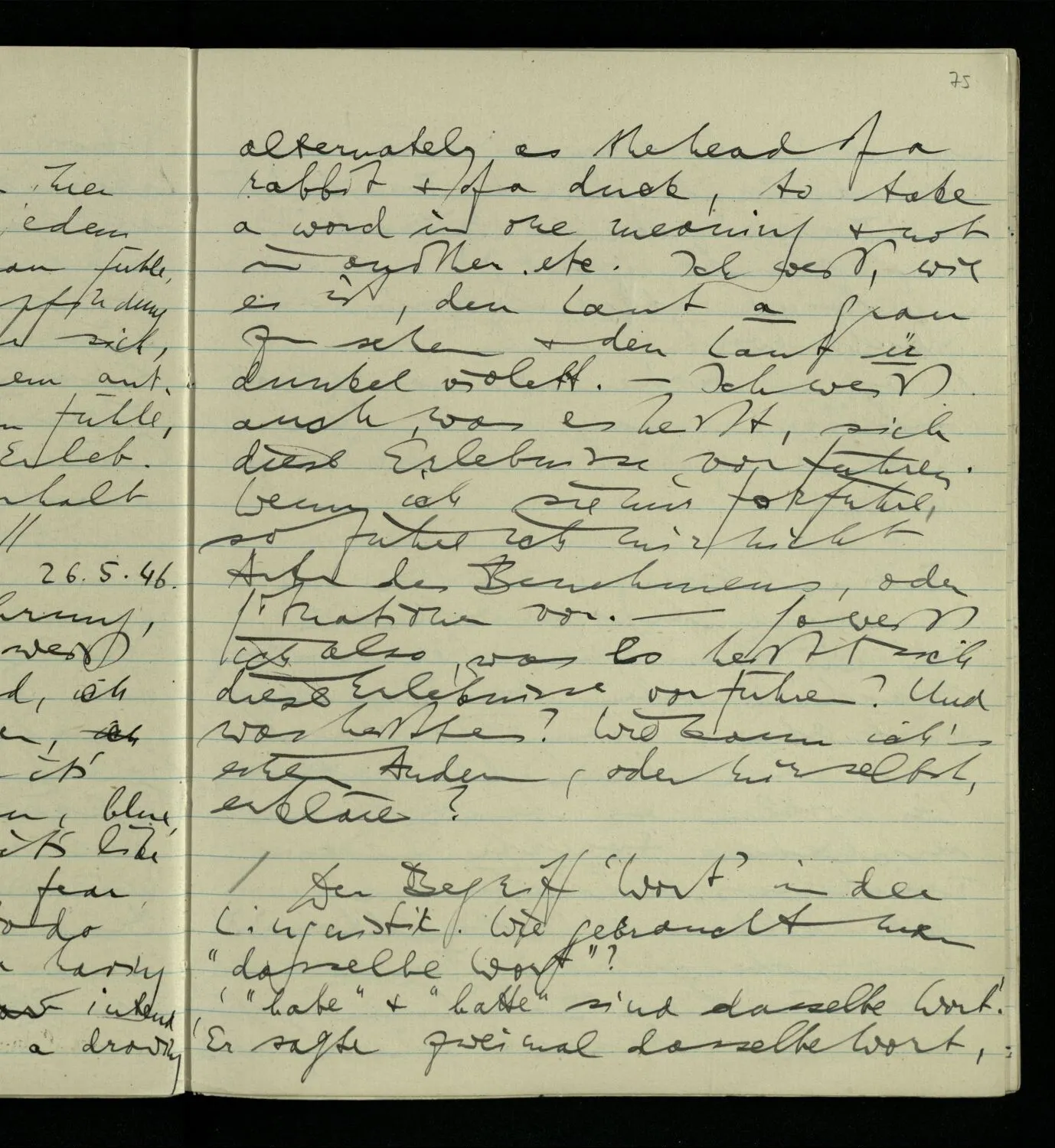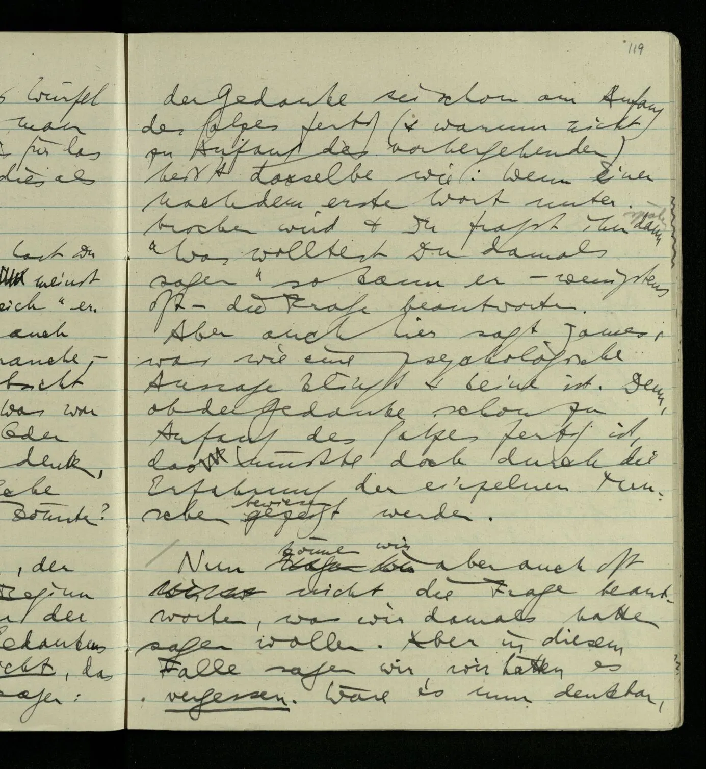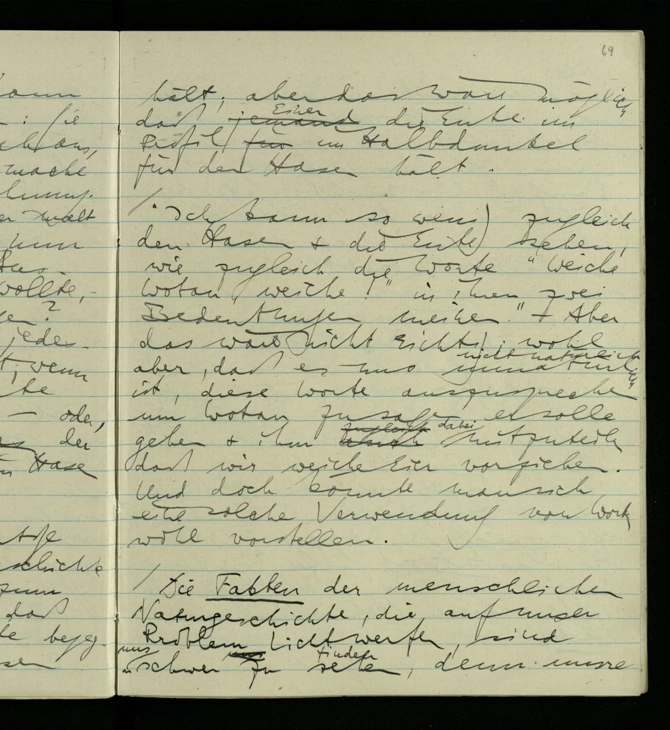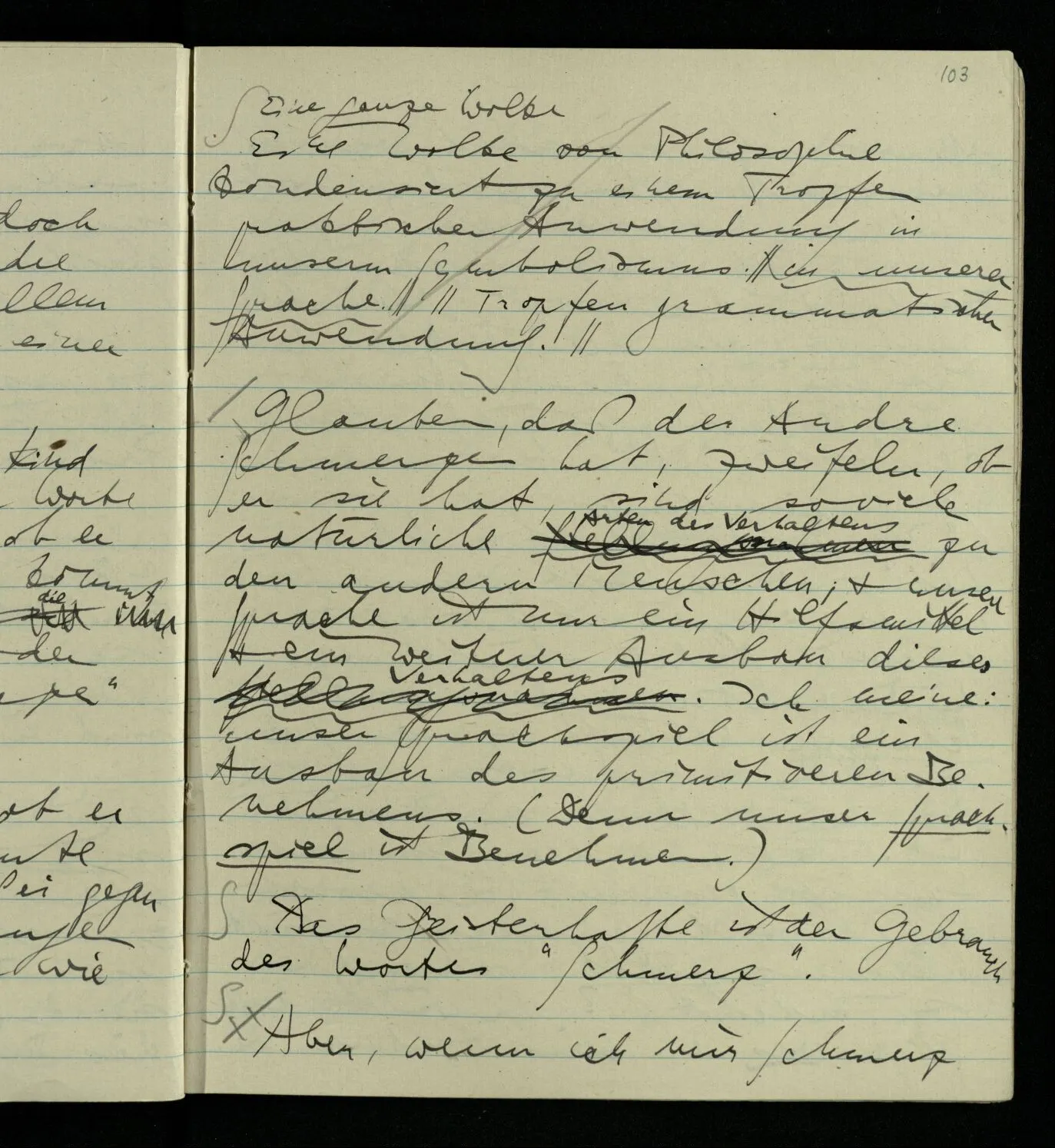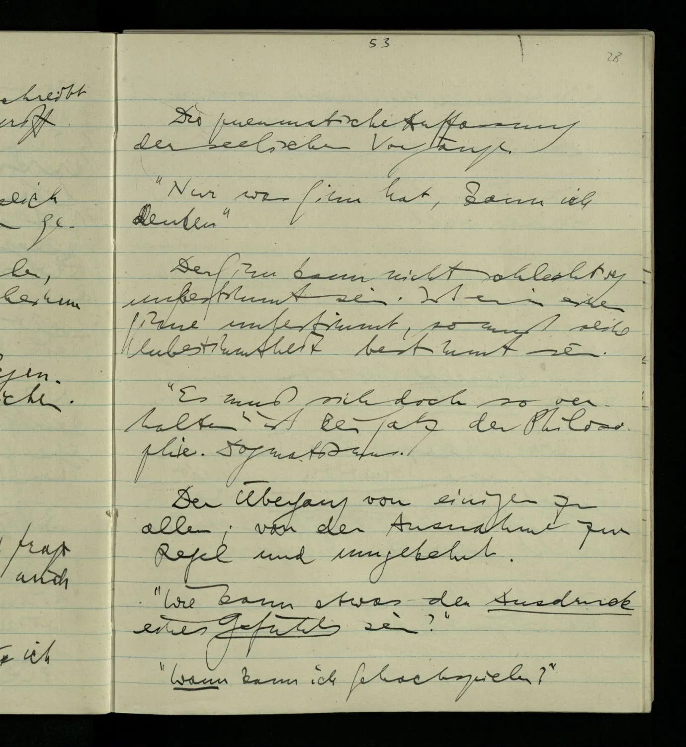 Niemand kümmert sich darum, ob etwas, noch darum, was in mir vorgeht, wenn man zu mir spricht. Man fragt auch für gewöhnlich nicht, wann ich den Satz verstanden habe, & ich merke auch nicht daß es damit einmal so, einmal so beschaffen ist. Außer, wenn ich einmal einen mißverstehe oder dergleichen. Und dann kann die Frage “Wann fingst Du an, ihn zu verstehen” Wichtigkeit erhalten. Aber es ist nun, als ob erst in so einem Falle überhaupt von wichtigen Erlebnissen des Verstehens die Rede wäre. Und könnte man sagen: nur das Erlebnis beim Wechsel der Bedeutungen sei von Wichtigkeit? – Oder auch so: nur das sei das wichtige Erlebnis, das einen gleichzeitigen Ausdruck hat?