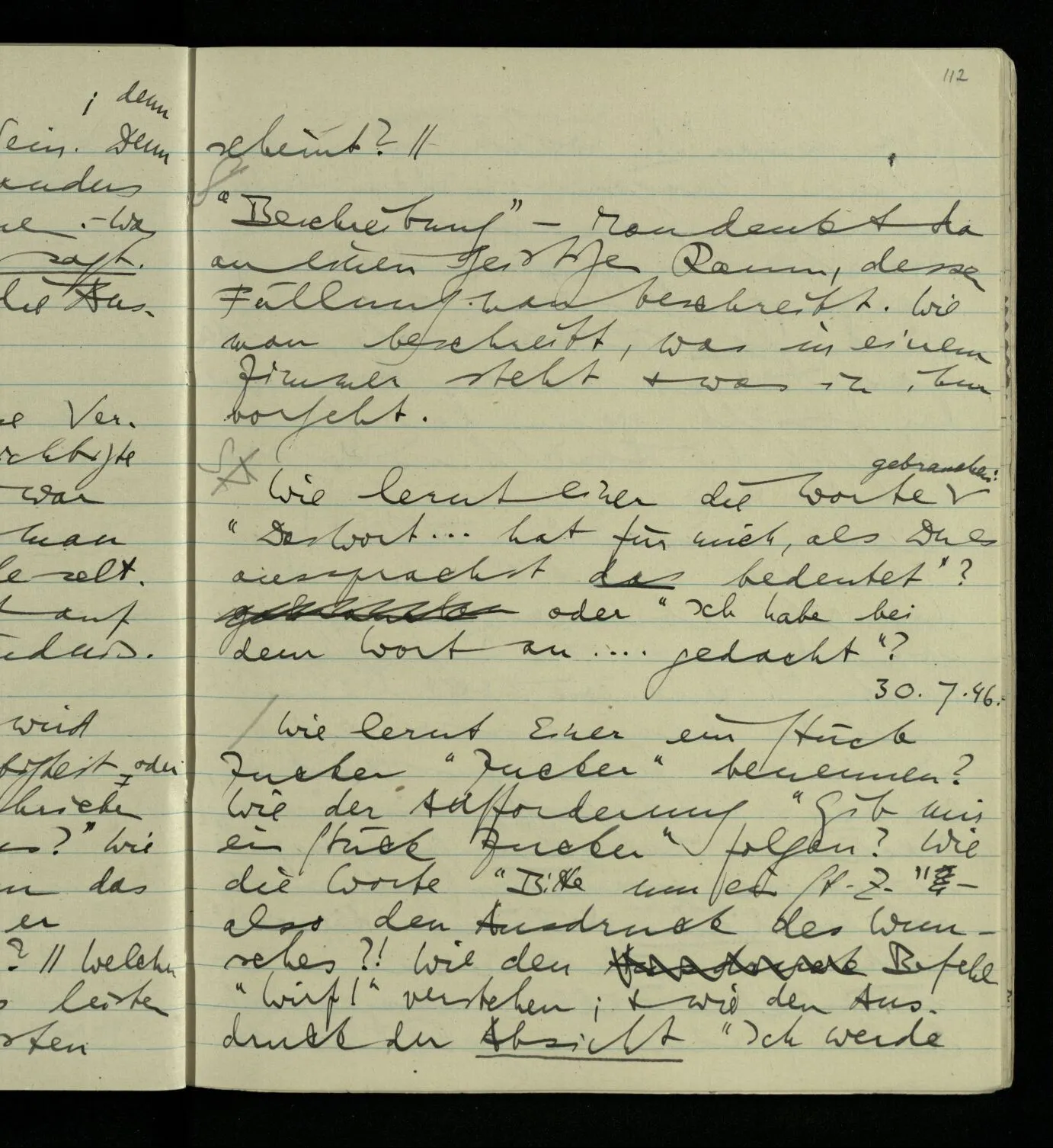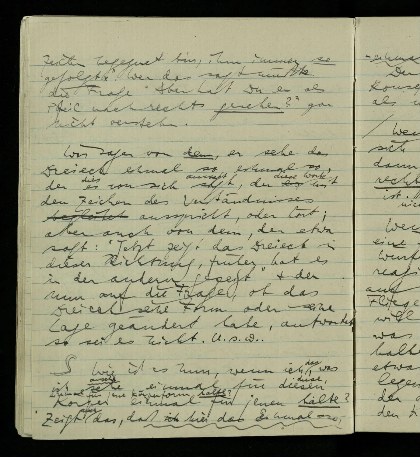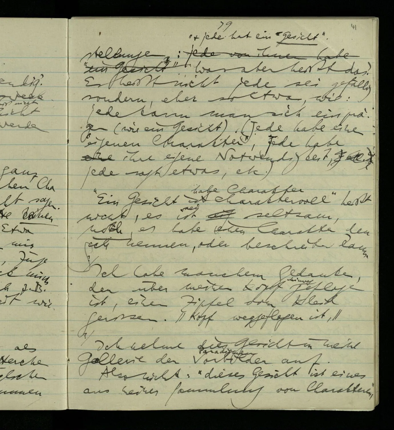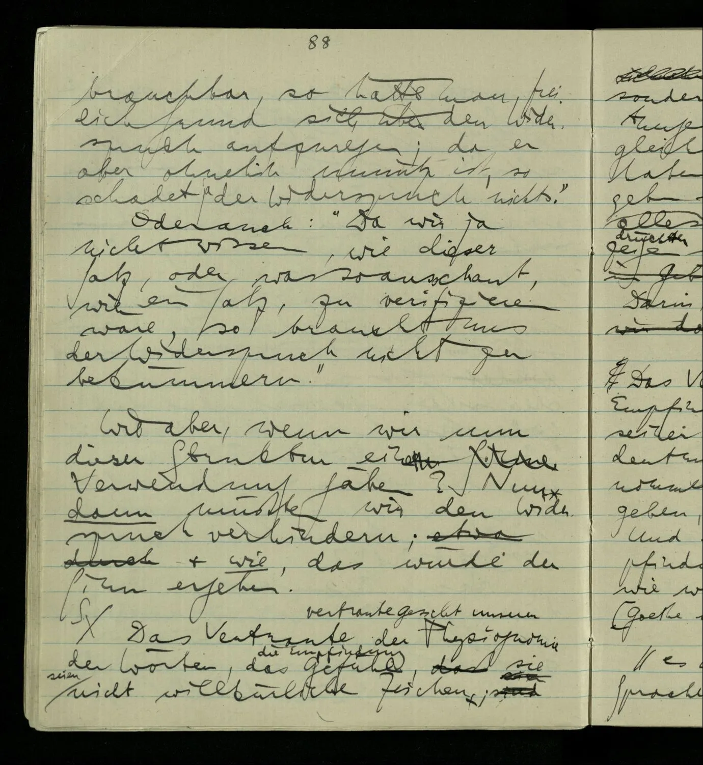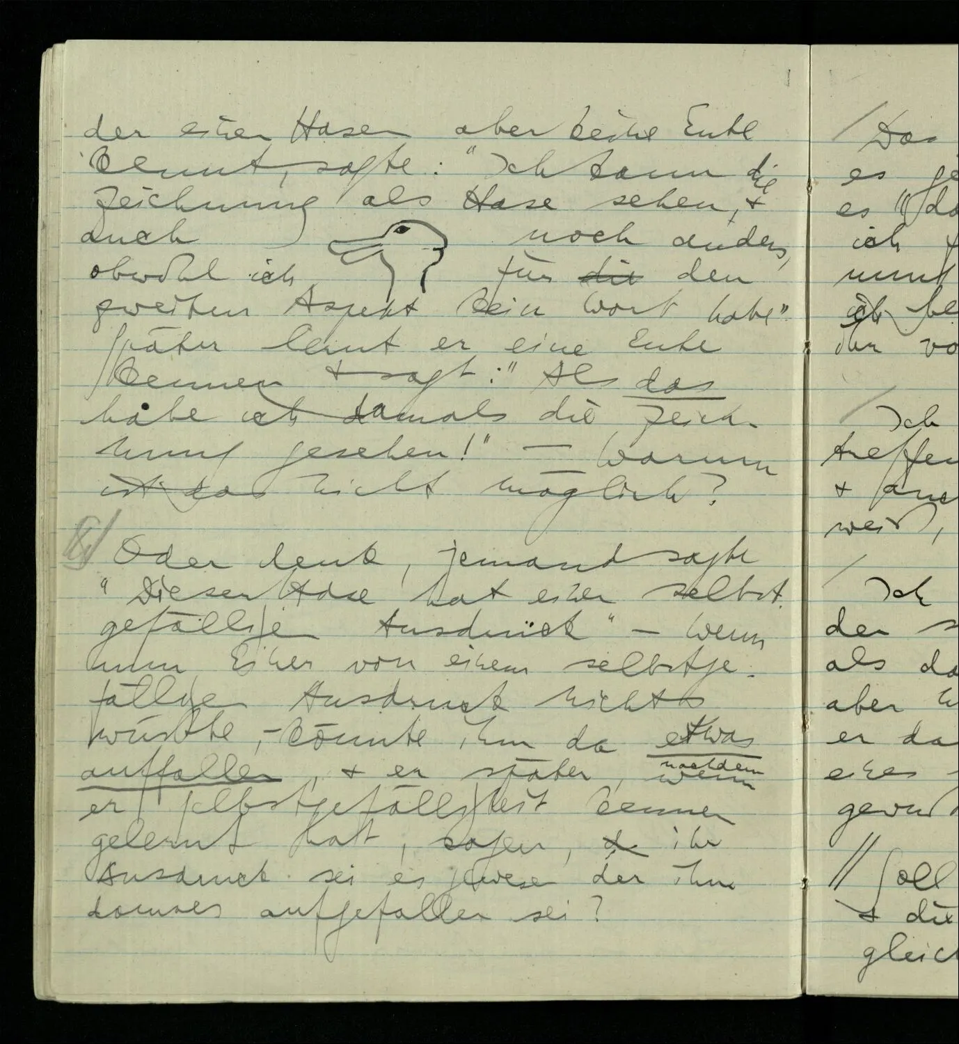 Niemand kümmert sich darum, ob etwas, noch darum, was in mir vorgeht, wenn man zu mir spricht. Man fragt auch für gewöhnlich nicht, wann ich den Satz verstanden habe, & ich merke auch nicht daß es damit einmal so, einmal so beschaffen ist. Außer, wenn ich einmal einen mißverstehe oder dergleichen. Und dann kann die Frage “Wann fingst Du an, ihn zu verstehen” Wichtigkeit erhalten. Aber es ist nun, als ob erst in so einem Falle überhaupt von wichtigen Erlebnissen des Verstehens die Rede wäre. Und könnte man sagen: nur das Erlebnis beim Wechsel der Bedeutungen sei von Wichtigkeit? – Oder auch so: nur das sei das wichtige Erlebnis, das einen gleichzeitigen Ausdruck hat?