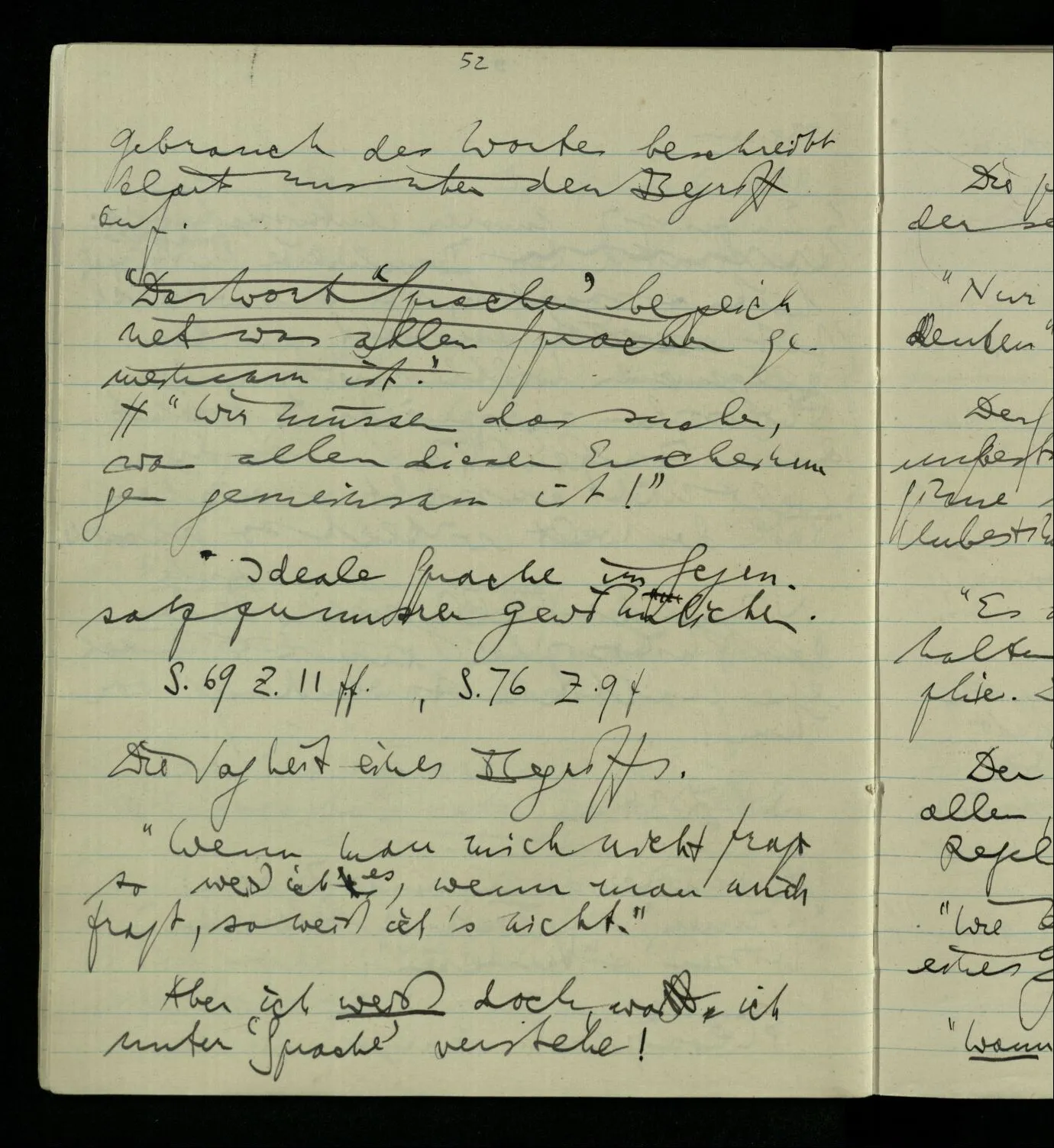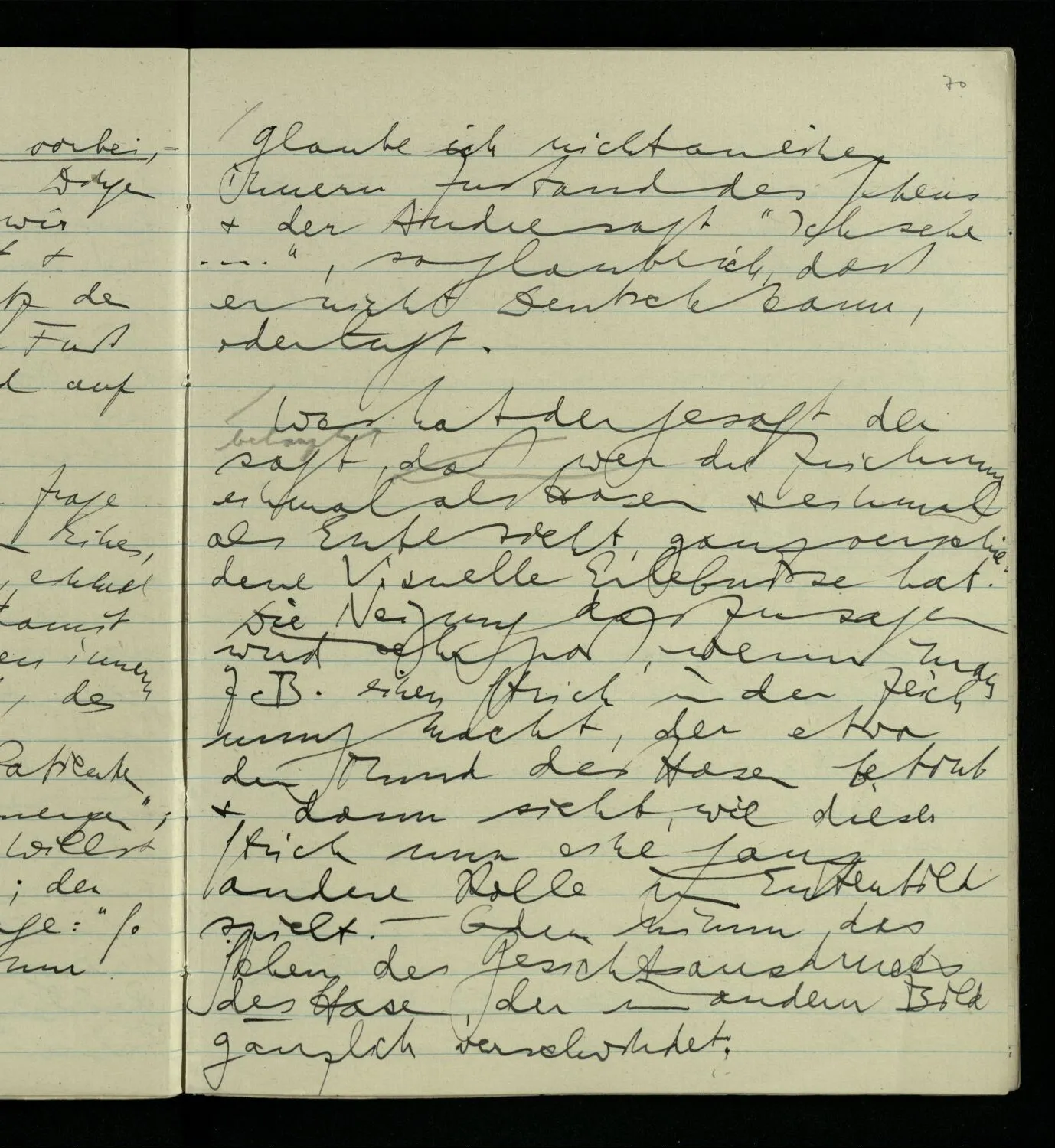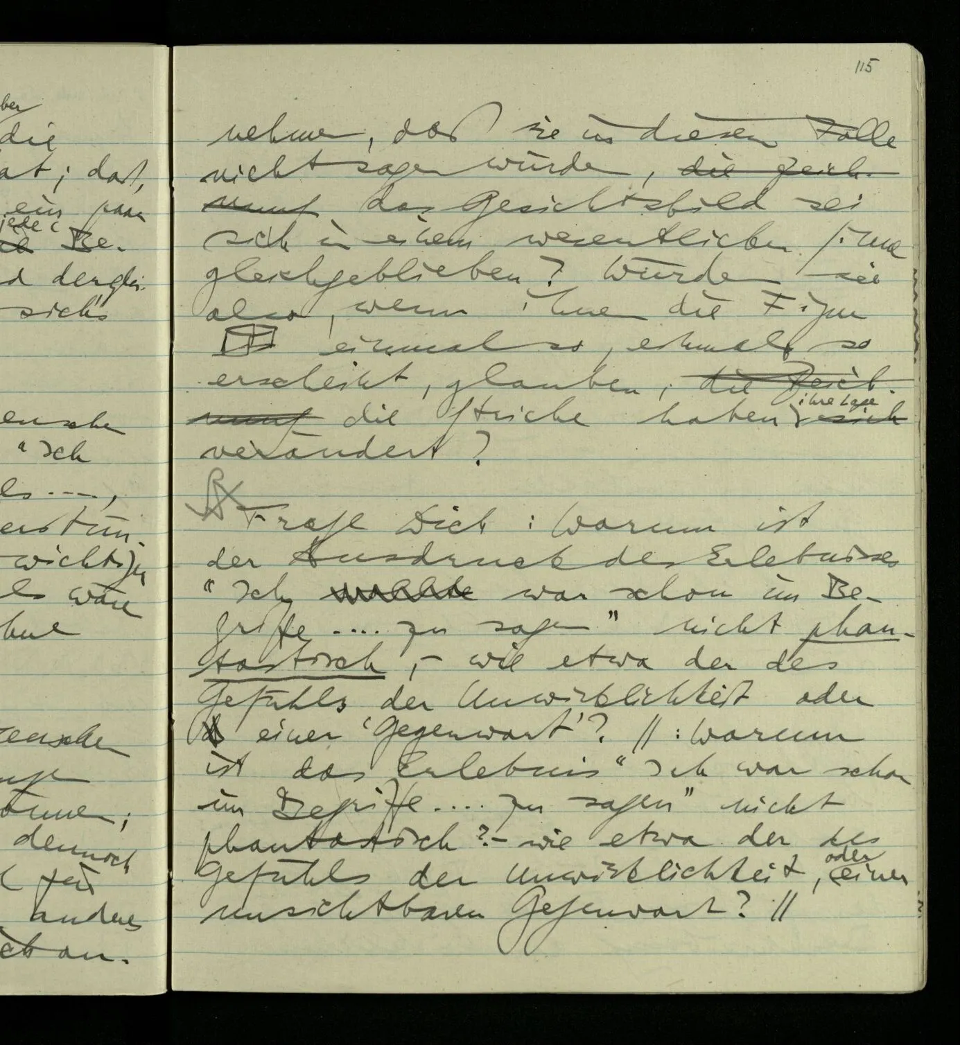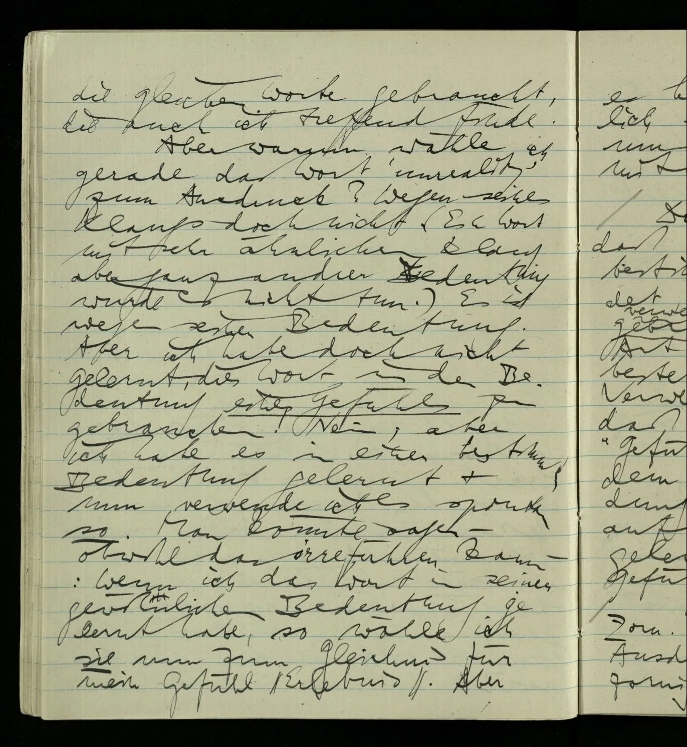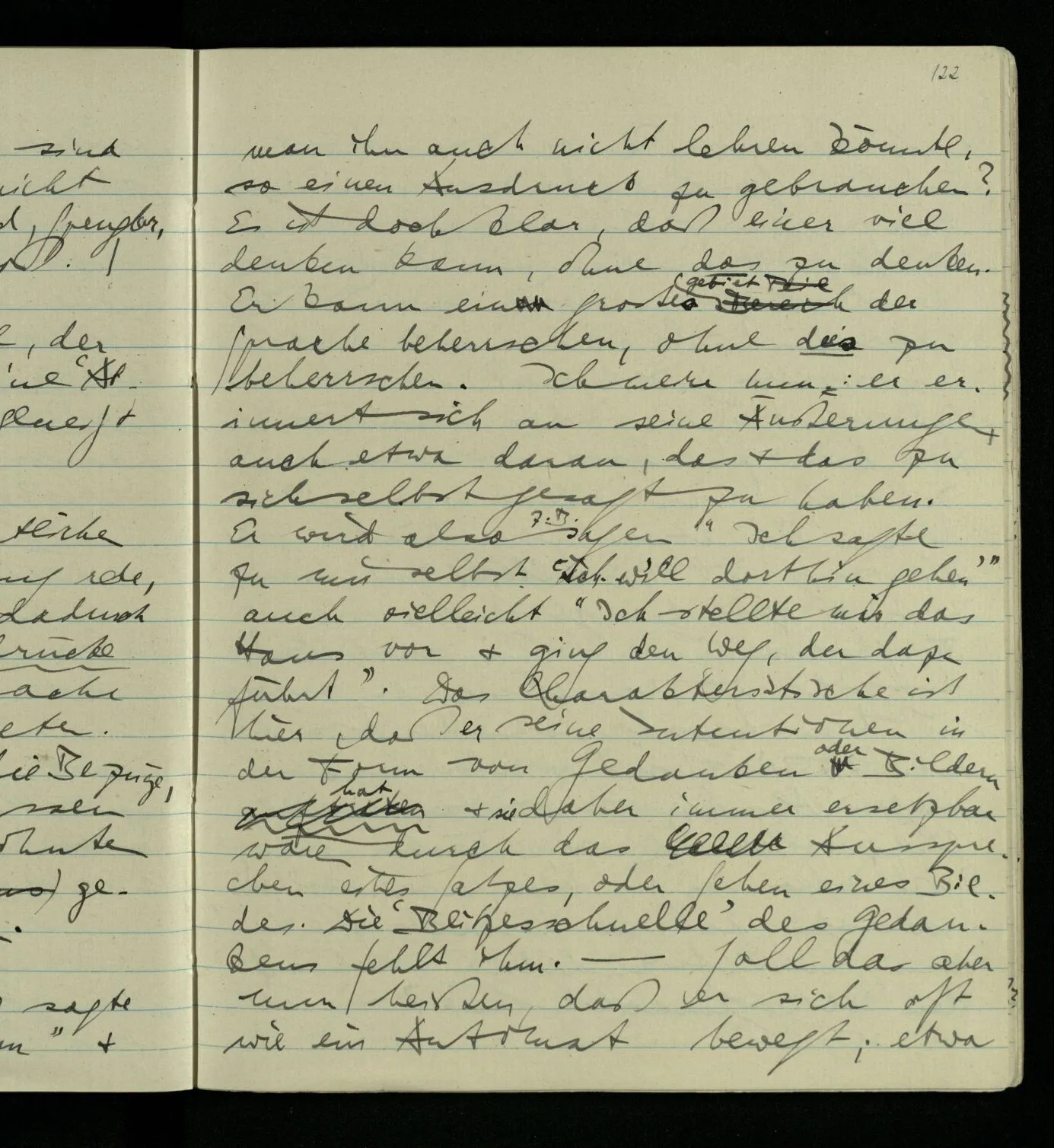 Niemand kümmert sich darum, ob etwas, noch darum, was in mir vorgeht, wenn man zu mir spricht. Man fragt auch für gewöhnlich nicht, wann ich den Satz verstanden habe, & ich merke auch nicht daß es damit einmal so, einmal so beschaffen ist. Außer, wenn ich einmal einen mißverstehe oder dergleichen. Und dann kann die Frage “Wann fingst Du an, ihn zu verstehen” Wichtigkeit erhalten. Aber es ist nun, als ob erst in so einem Falle überhaupt von wichtigen Erlebnissen des Verstehens die Rede wäre. Und könnte man sagen: nur das Erlebnis beim Wechsel der Bedeutungen sei von Wichtigkeit? – Oder auch so: nur das sei das wichtige Erlebnis, das einen gleichzeitigen Ausdruck hat?