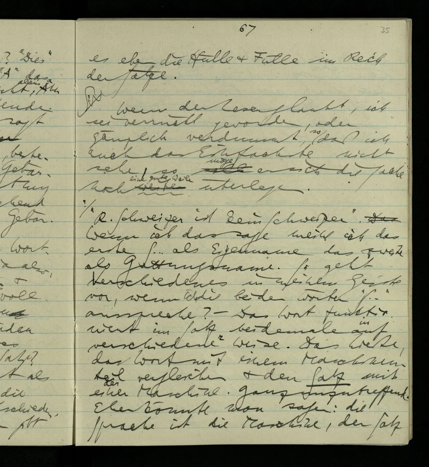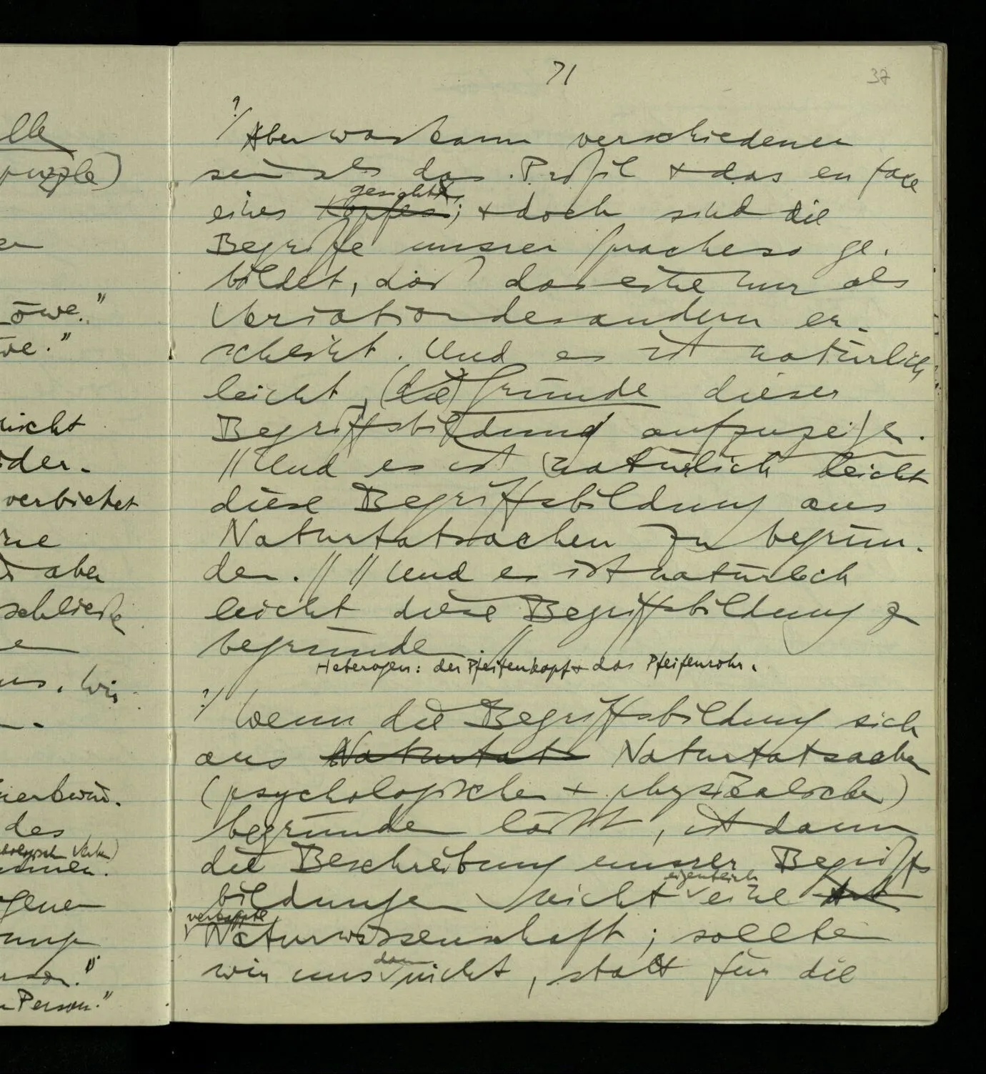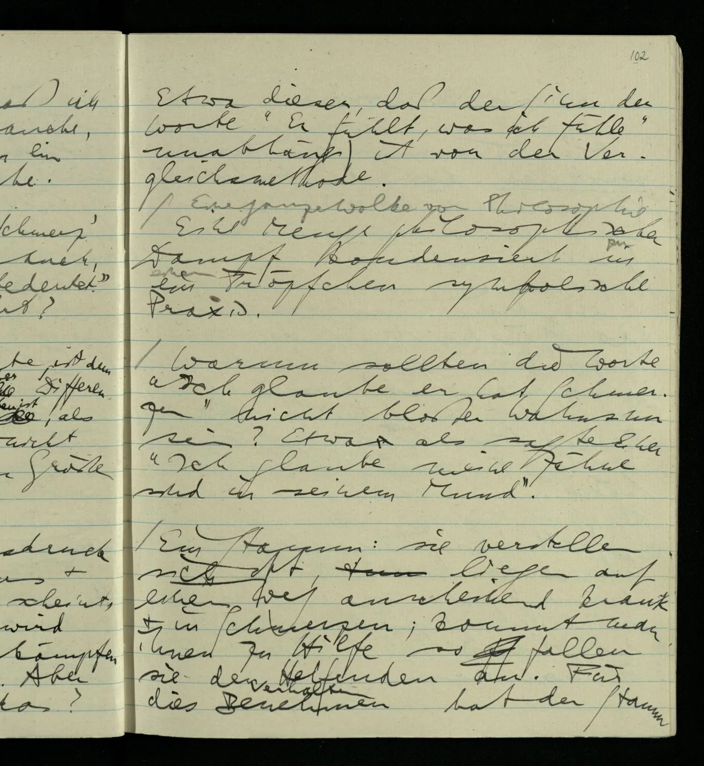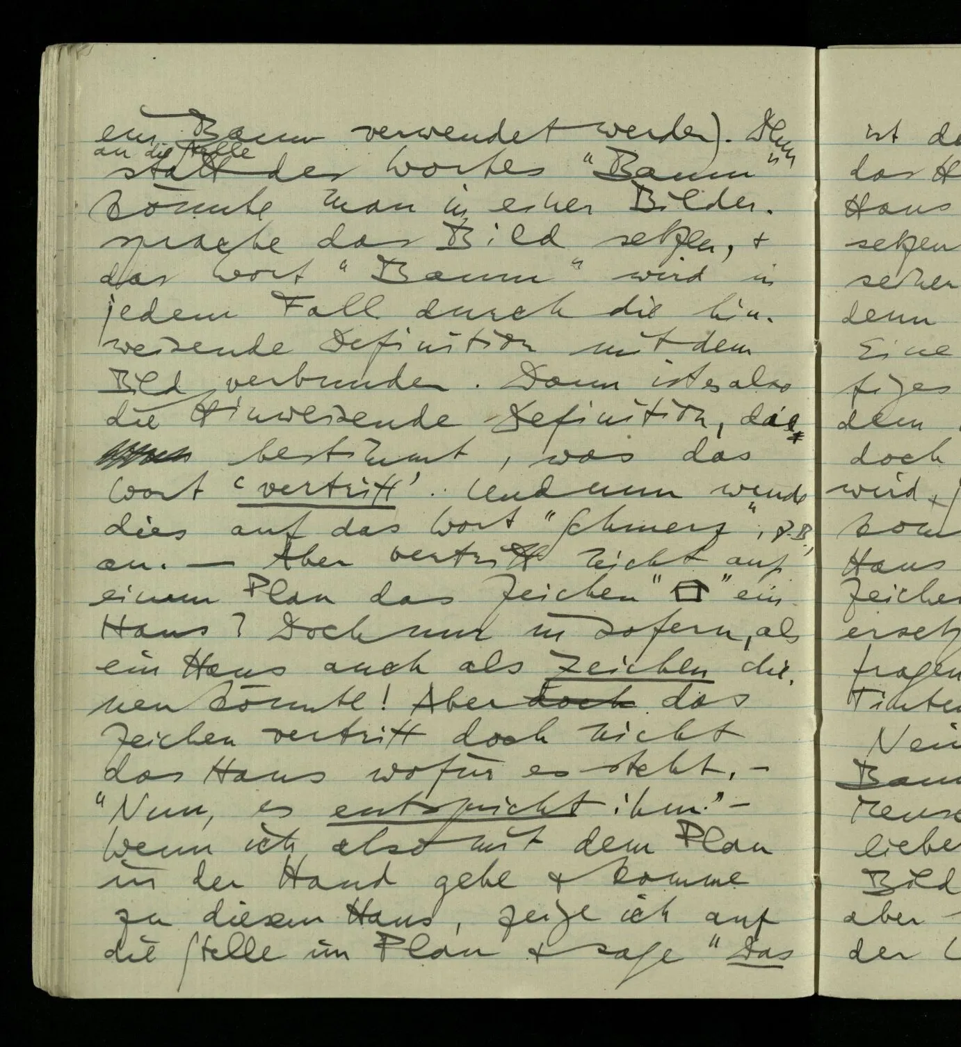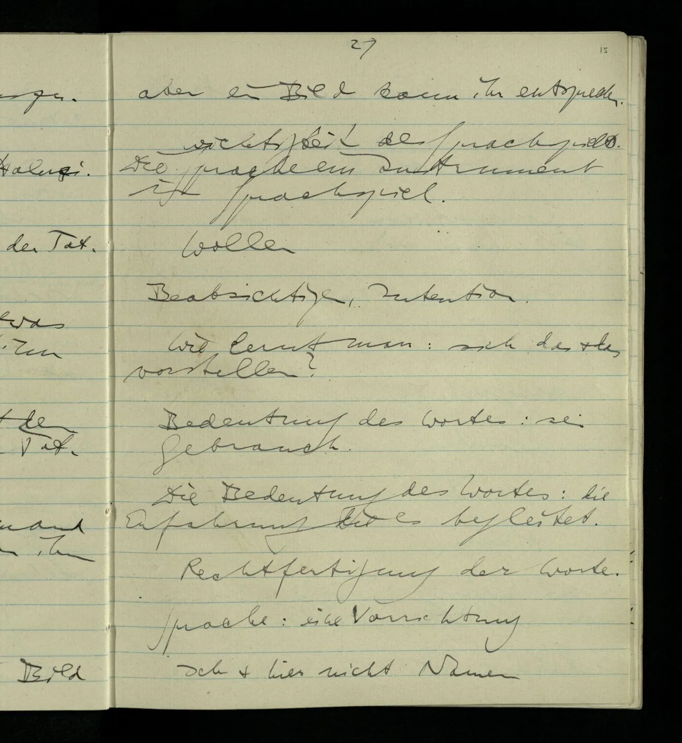 Niemand kümmert sich darum, ob etwas, noch darum, was in mir vorgeht, wenn man zu mir spricht. Man fragt auch für gewöhnlich nicht, wann ich den Satz verstanden habe, & ich merke auch nicht daß es damit einmal so, einmal so beschaffen ist. Außer, wenn ich einmal einen mißverstehe oder dergleichen. Und dann kann die Frage “Wann fingst Du an, ihn zu verstehen” Wichtigkeit erhalten. Aber es ist nun, als ob erst in so einem Falle überhaupt von wichtigen Erlebnissen des Verstehens die Rede wäre. Und könnte man sagen: nur das Erlebnis beim Wechsel der Bedeutungen sei von Wichtigkeit? – Oder auch so: nur das sei das wichtige Erlebnis, das einen gleichzeitigen Ausdruck hat?