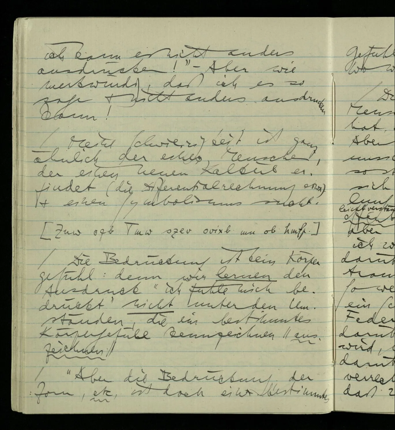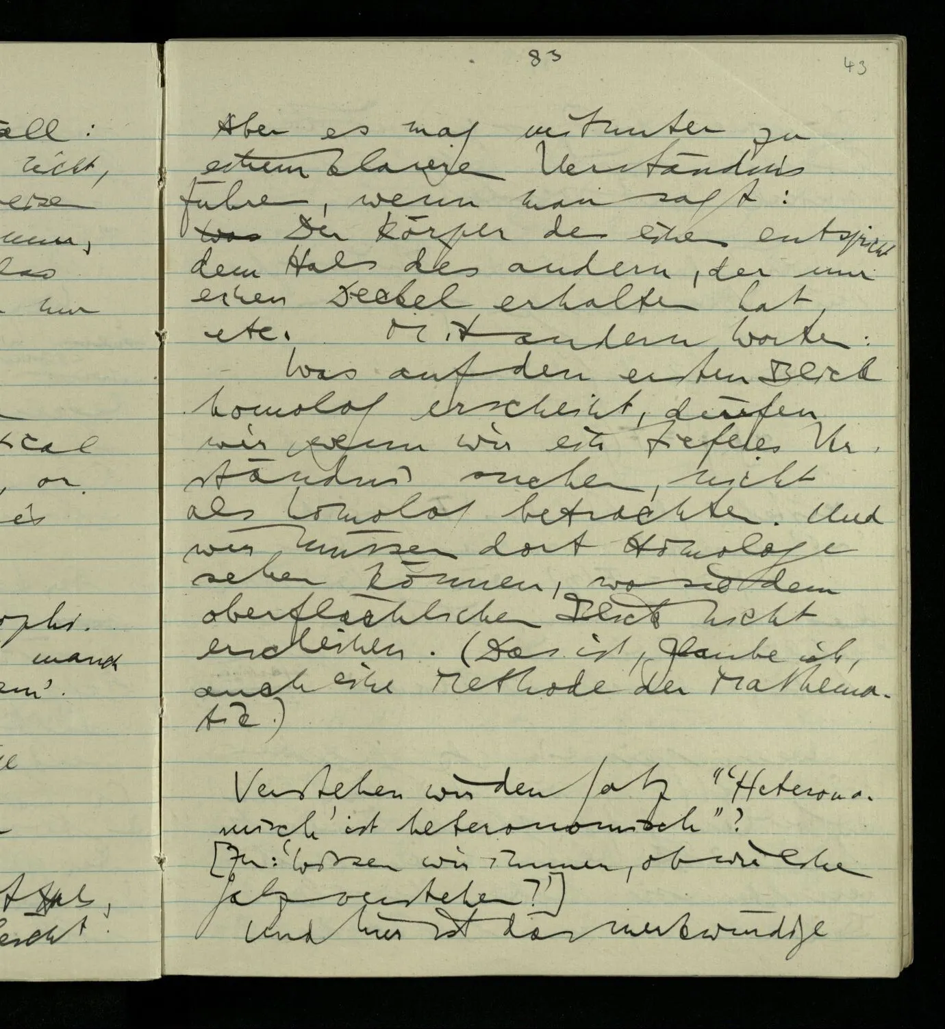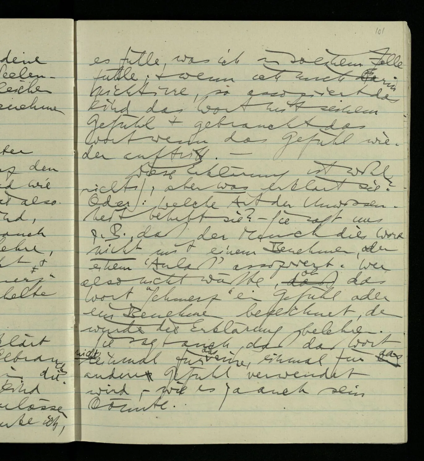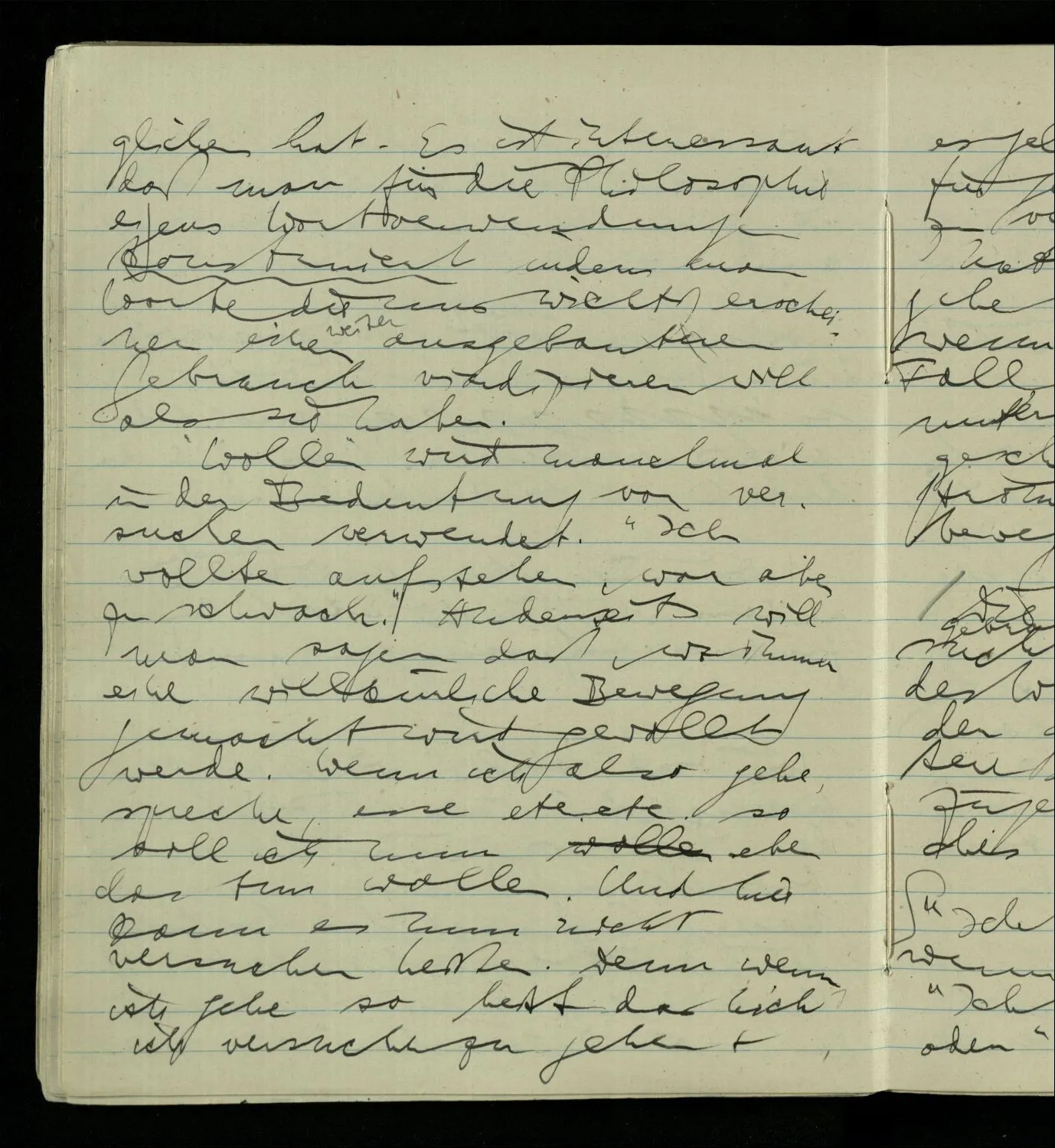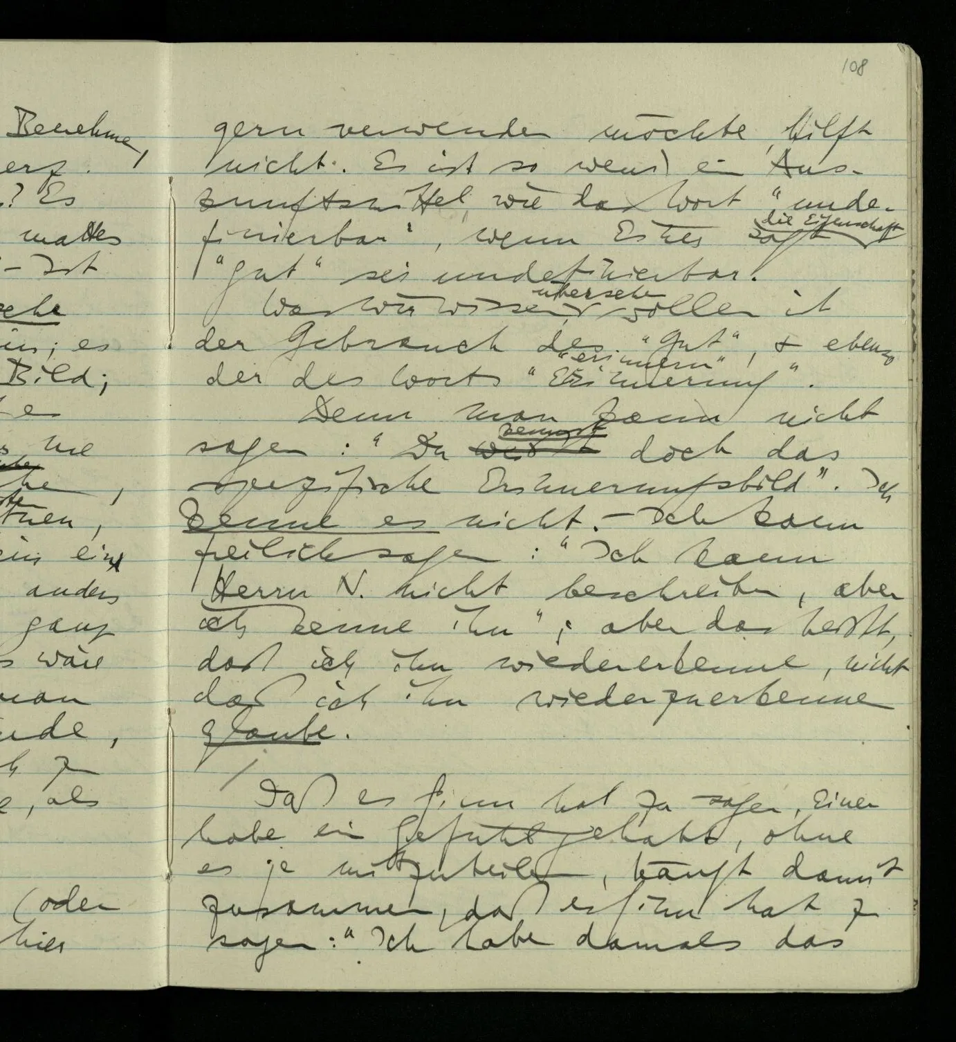 Niemand kümmert sich darum, ob etwas, noch darum, was in mir vorgeht, wenn man zu mir spricht. Man fragt auch für gewöhnlich nicht, wann ich den Satz verstanden habe, & ich merke auch nicht daß es damit einmal so, einmal so beschaffen ist. Außer, wenn ich einmal einen mißverstehe oder dergleichen. Und dann kann die Frage “Wann fingst Du an, ihn zu verstehen” Wichtigkeit erhalten. Aber es ist nun, als ob erst in so einem Falle überhaupt von wichtigen Erlebnissen des Verstehens die Rede wäre. Und könnte man sagen: nur das Erlebnis beim Wechsel der Bedeutungen sei von Wichtigkeit? – Oder auch so: nur das sei das wichtige Erlebnis, das einen gleichzeitigen Ausdruck hat?