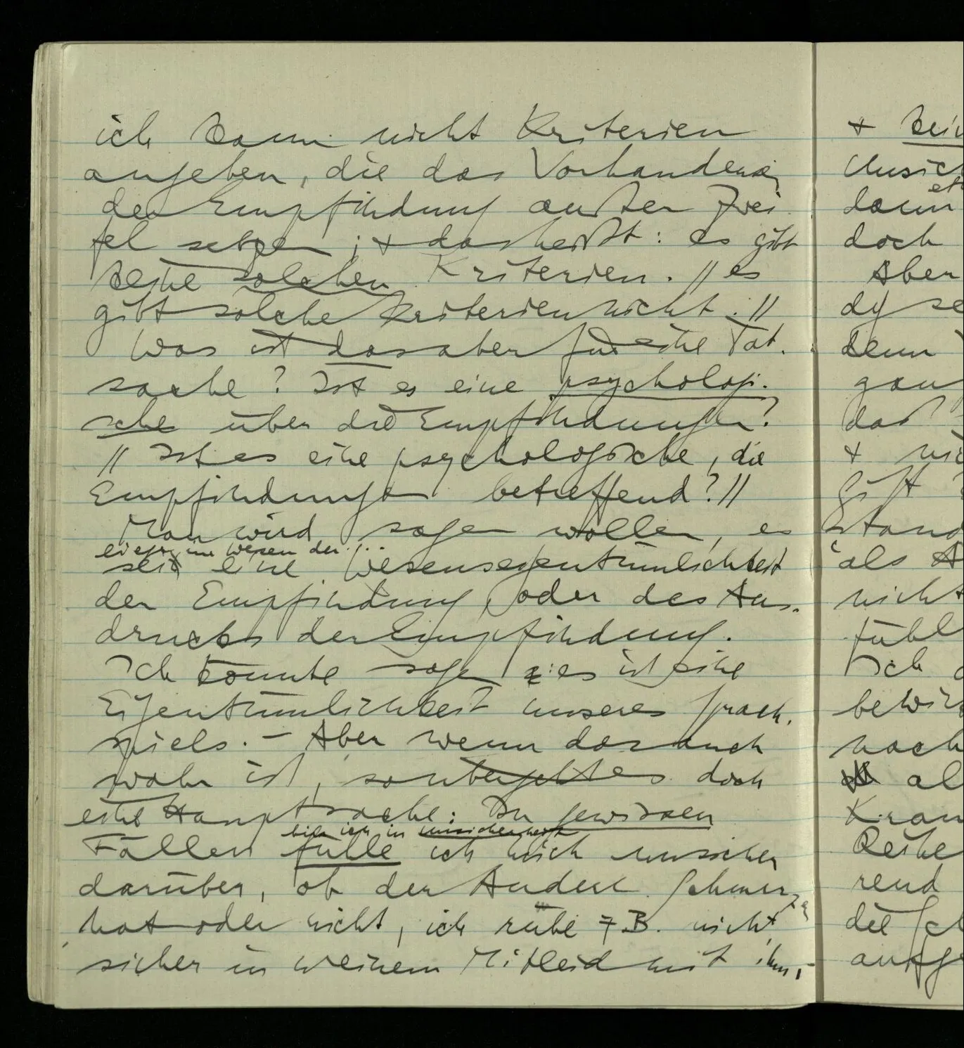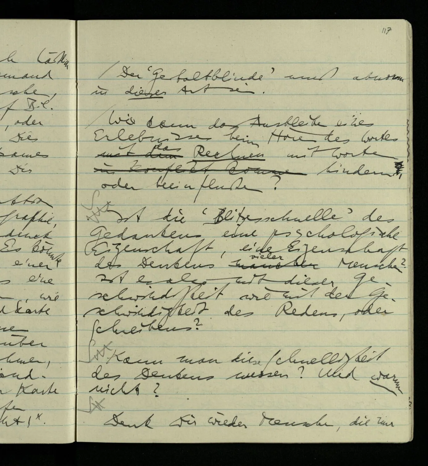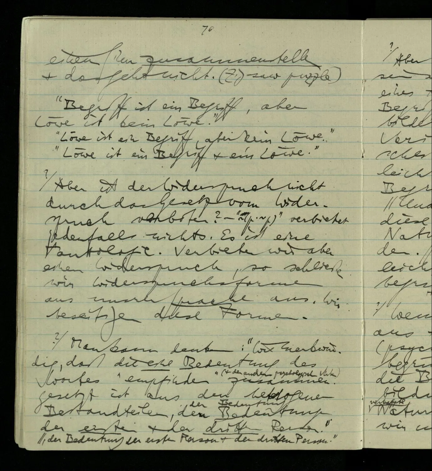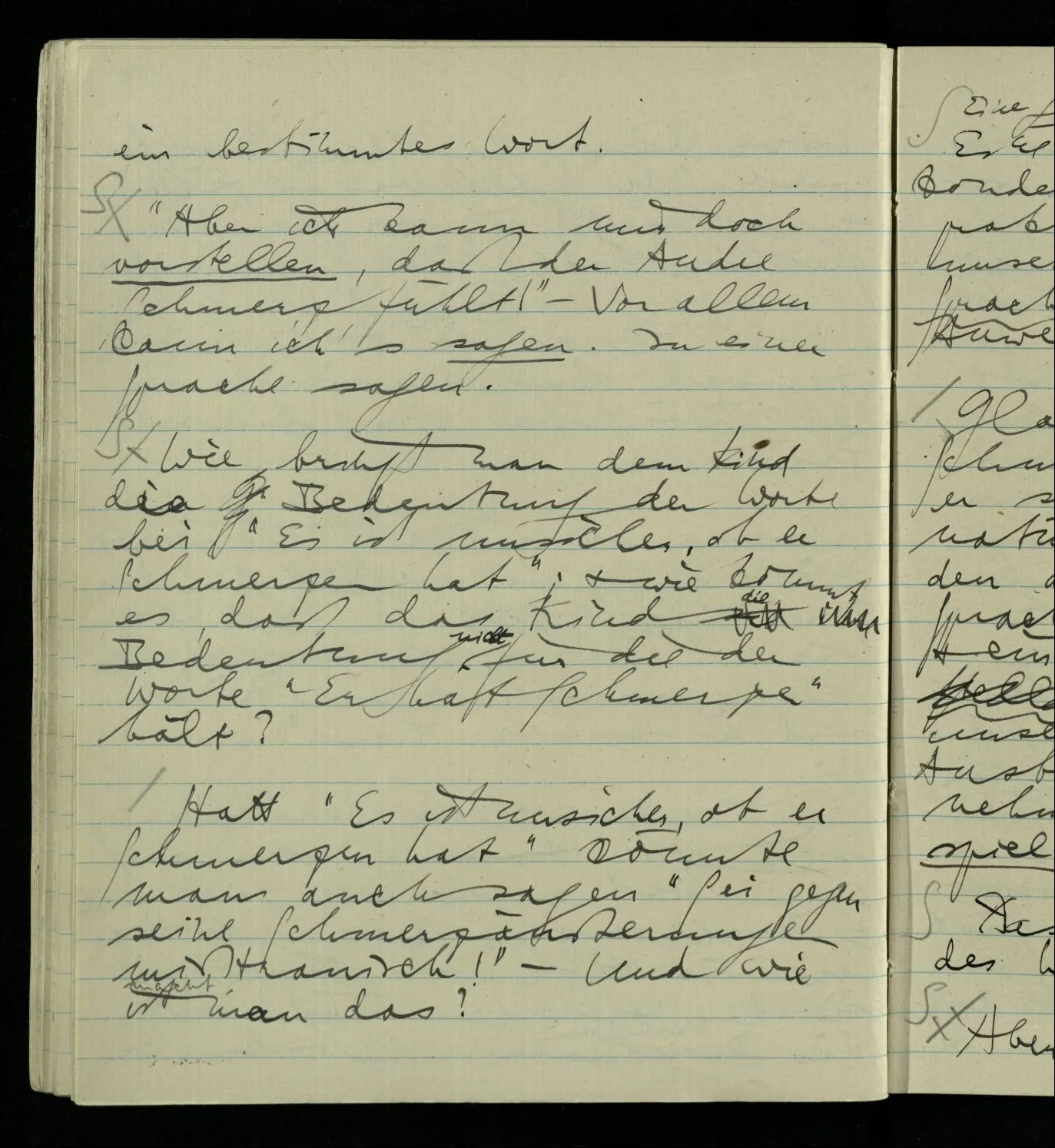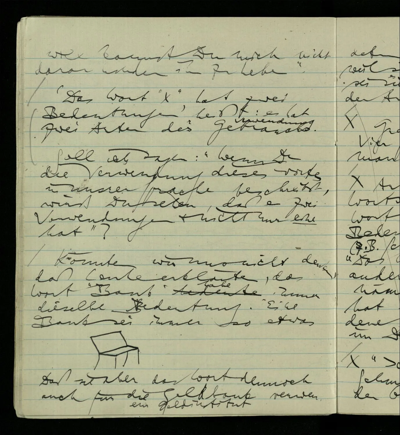 Niemand kümmert sich darum, ob etwas, noch darum, was in mir vorgeht, wenn man zu mir spricht. Man fragt auch für gewöhnlich nicht, wann ich den Satz verstanden habe, & ich merke auch nicht daß es damit einmal so, einmal so beschaffen ist. Außer, wenn ich einmal einen mißverstehe oder dergleichen. Und dann kann die Frage “Wann fingst Du an, ihn zu verstehen” Wichtigkeit erhalten. Aber es ist nun, als ob erst in so einem Falle überhaupt von wichtigen Erlebnissen des Verstehens die Rede wäre. Und könnte man sagen: nur das Erlebnis beim Wechsel der Bedeutungen sei von Wichtigkeit? – Oder auch so: nur das sei das wichtige Erlebnis, das einen gleichzeitigen Ausdruck hat?