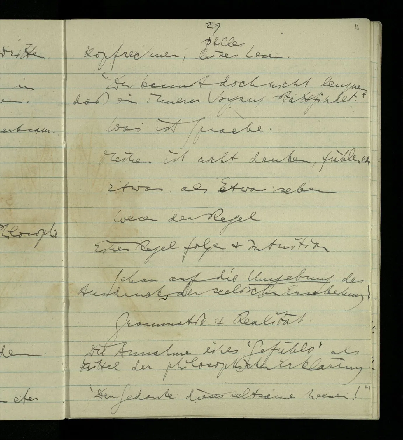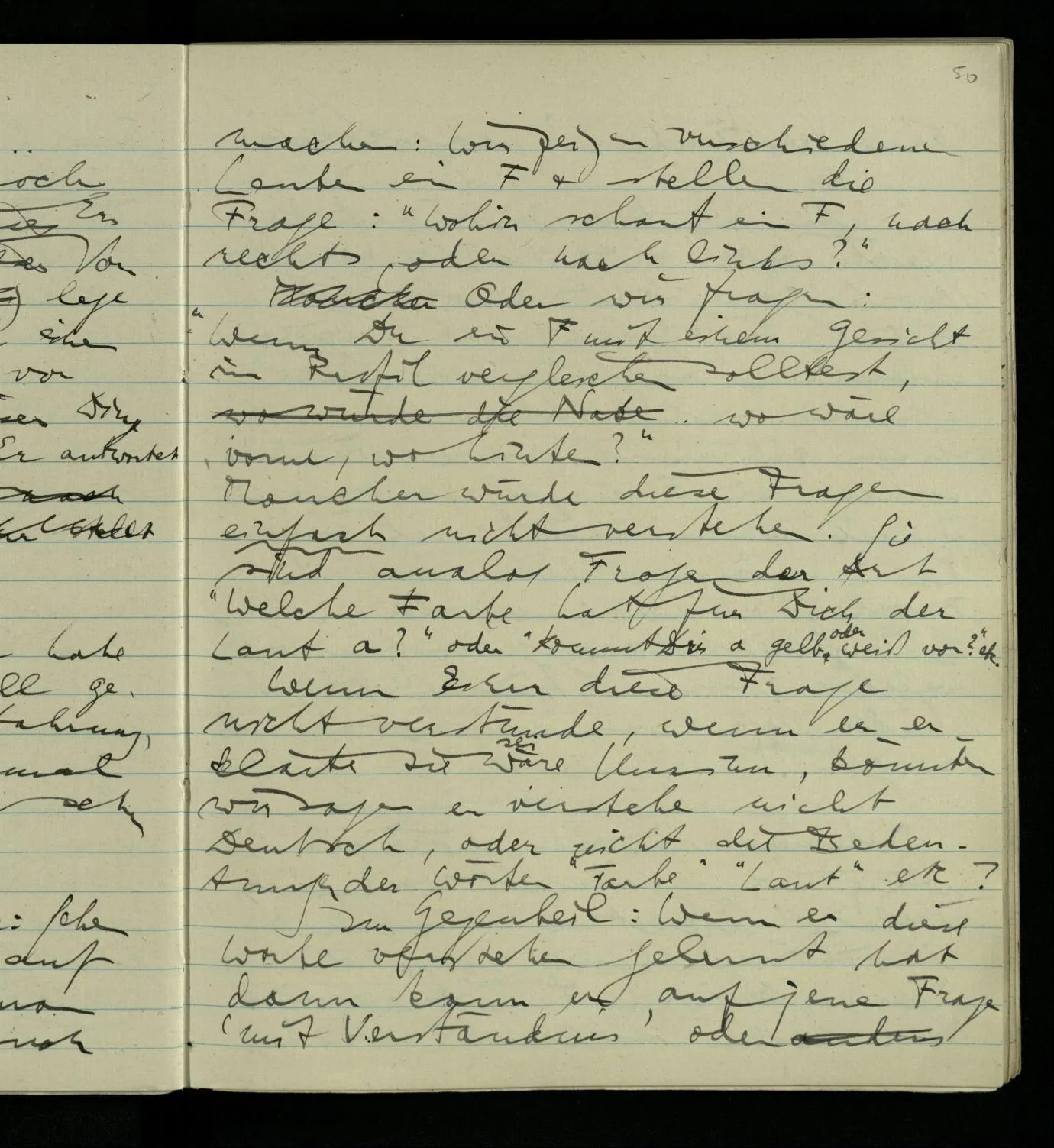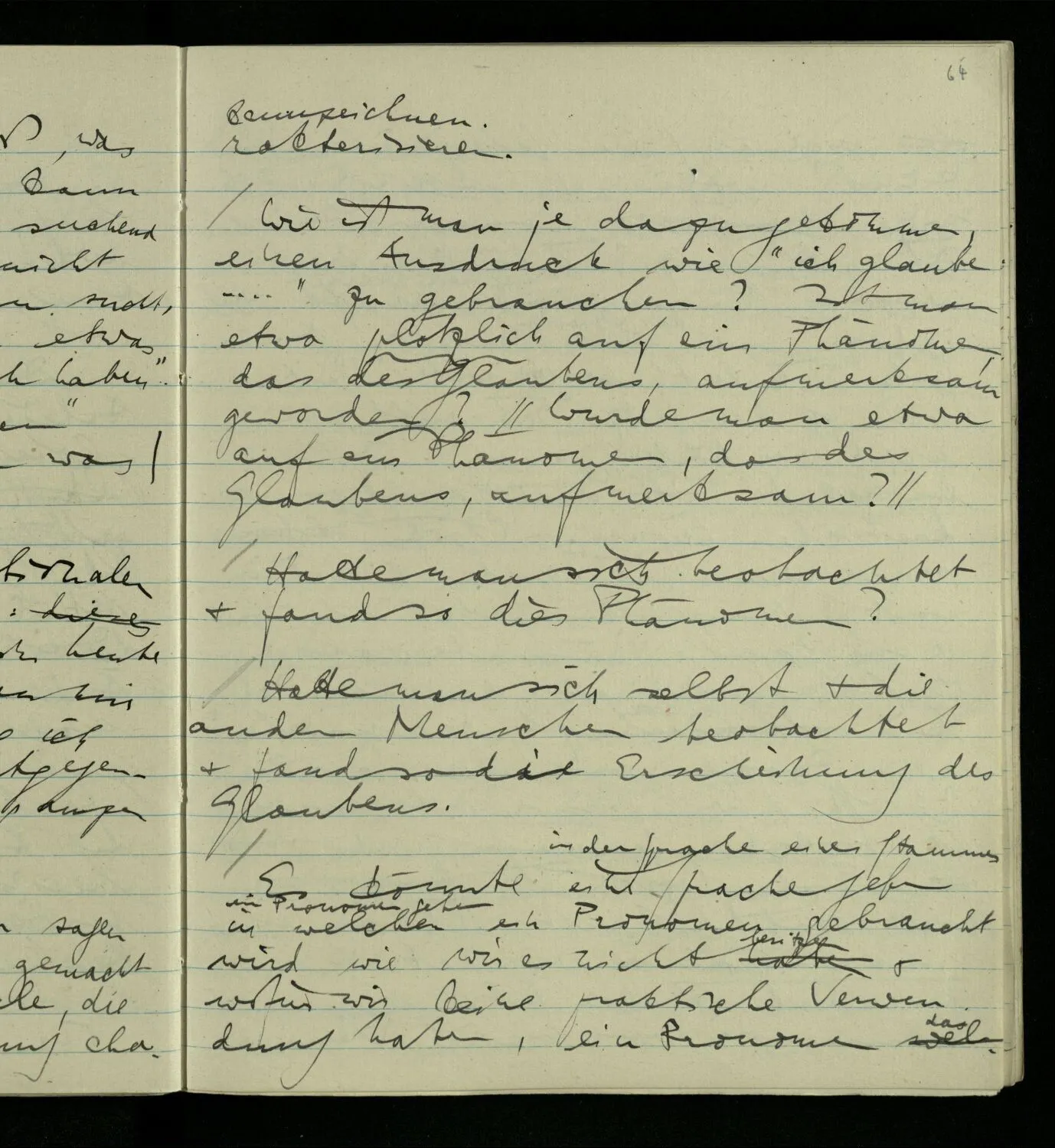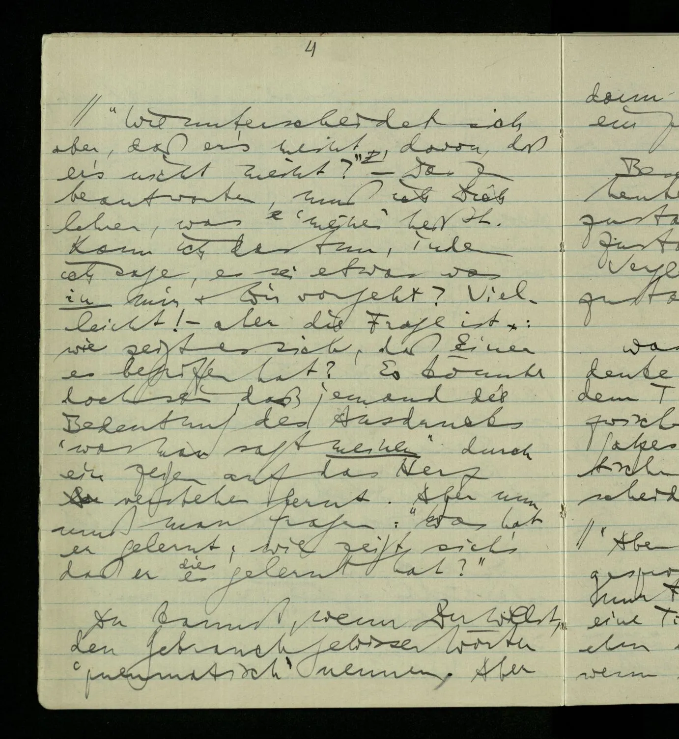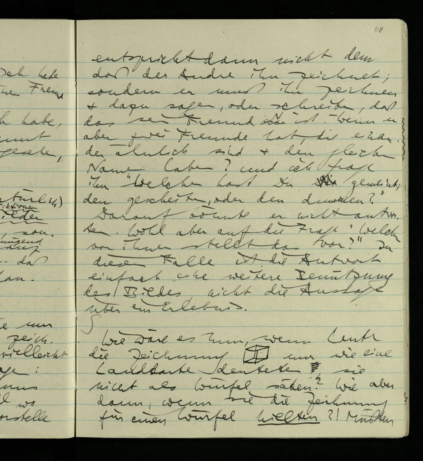 Niemand kümmert sich darum, ob etwas, noch darum, was in mir vorgeht, wenn man zu mir spricht. Man fragt auch für gewöhnlich nicht, wann ich den Satz verstanden habe, & ich merke auch nicht daß es damit einmal so, einmal so beschaffen ist. Außer, wenn ich einmal einen mißverstehe oder dergleichen. Und dann kann die Frage “Wann fingst Du an, ihn zu verstehen” Wichtigkeit erhalten. Aber es ist nun, als ob erst in so einem Falle überhaupt von wichtigen Erlebnissen des Verstehens die Rede wäre. Und könnte man sagen: nur das Erlebnis beim Wechsel der Bedeutungen sei von Wichtigkeit? – Oder auch so: nur das sei das wichtige Erlebnis, das einen gleichzeitigen Ausdruck hat?