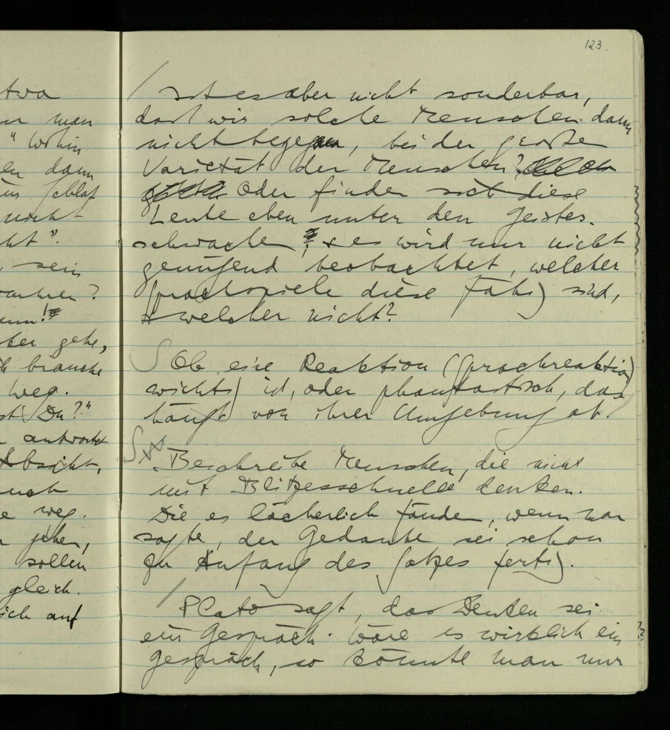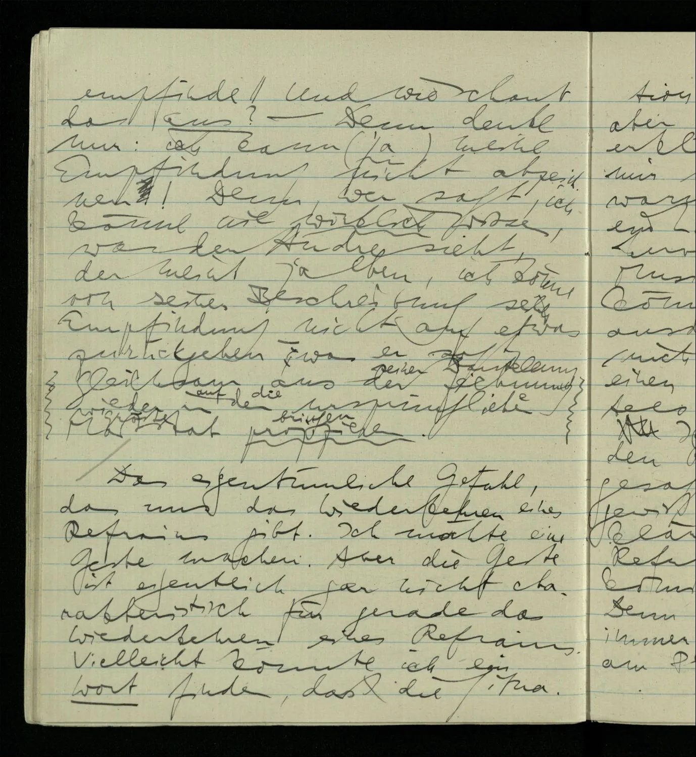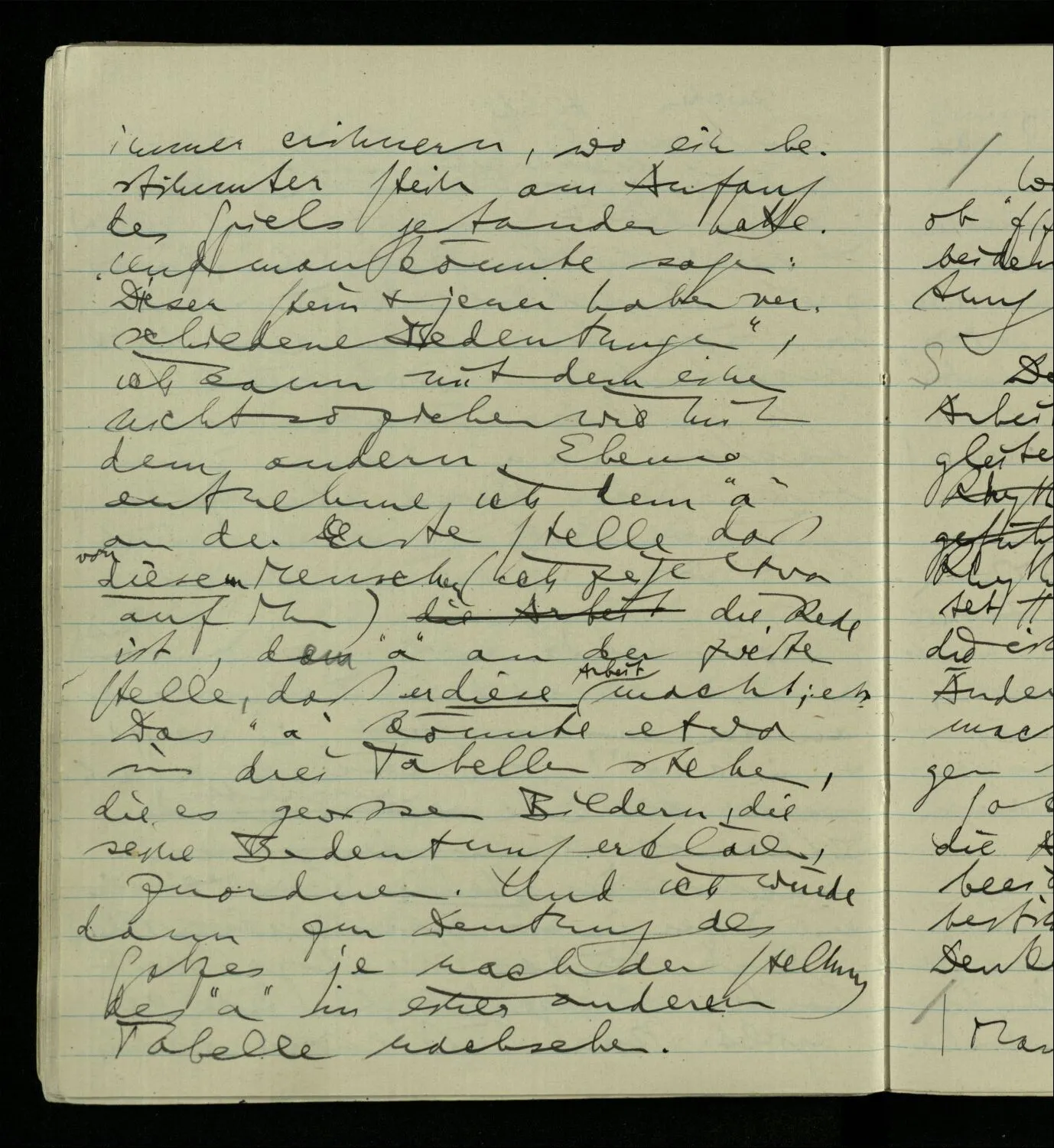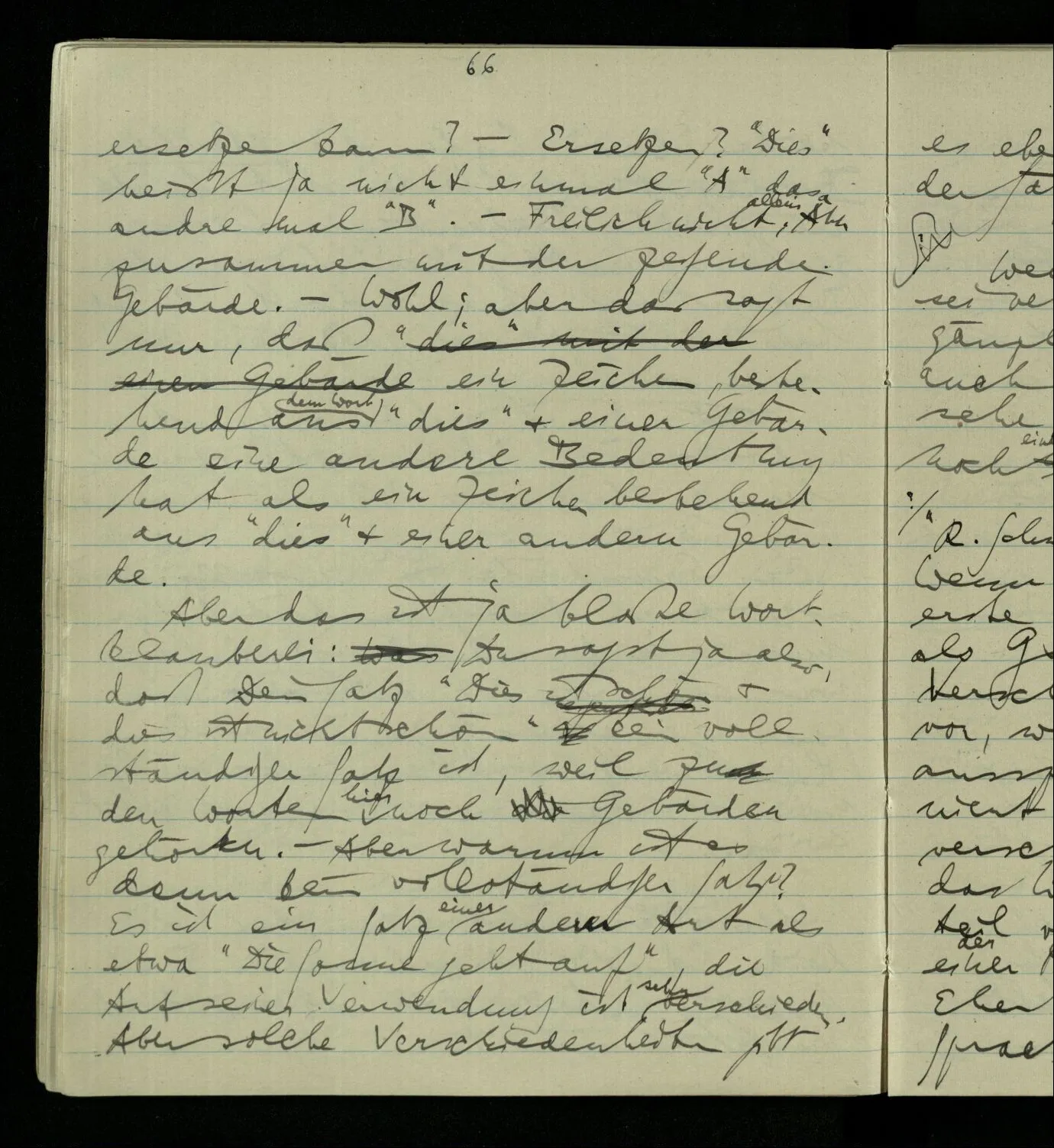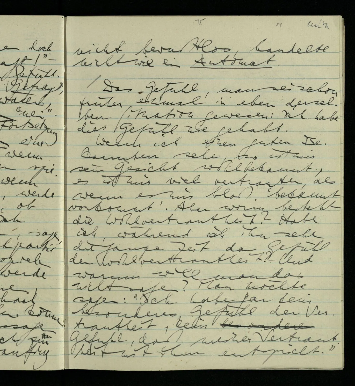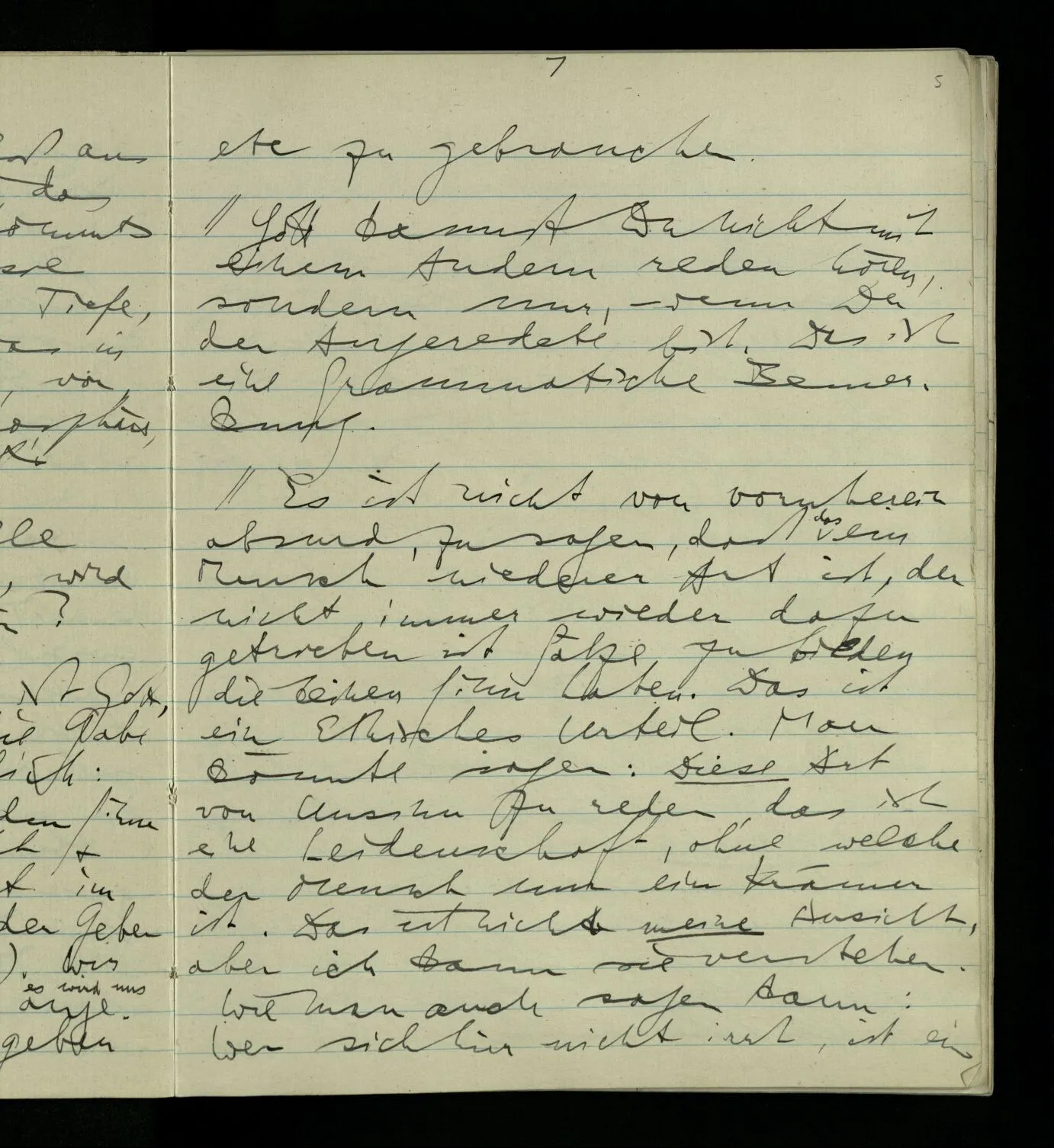 Niemand kümmert sich darum, ob etwas, noch darum, was in mir vorgeht, wenn man zu mir spricht. Man fragt auch für gewöhnlich nicht, wann ich den Satz verstanden habe, & ich merke auch nicht daß es damit einmal so, einmal so beschaffen ist. Außer, wenn ich einmal einen mißverstehe oder dergleichen. Und dann kann die Frage “Wann fingst Du an, ihn zu verstehen” Wichtigkeit erhalten. Aber es ist nun, als ob erst in so einem Falle überhaupt von wichtigen Erlebnissen des Verstehens die Rede wäre. Und könnte man sagen: nur das Erlebnis beim Wechsel der Bedeutungen sei von Wichtigkeit? – Oder auch so: nur das sei das wichtige Erlebnis, das einen gleichzeitigen Ausdruck hat?