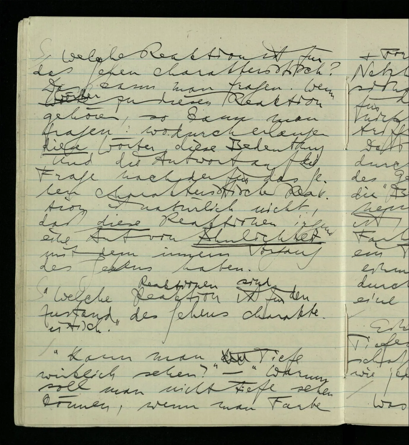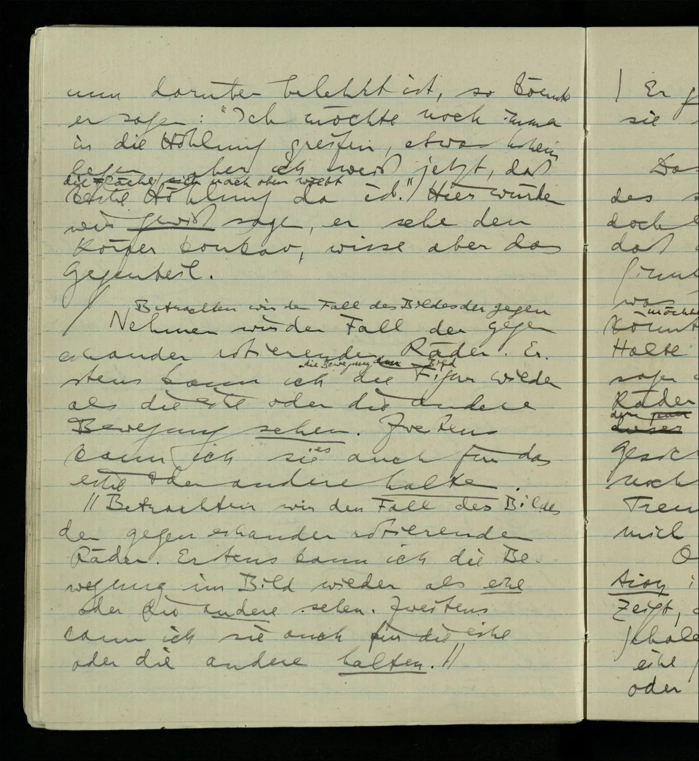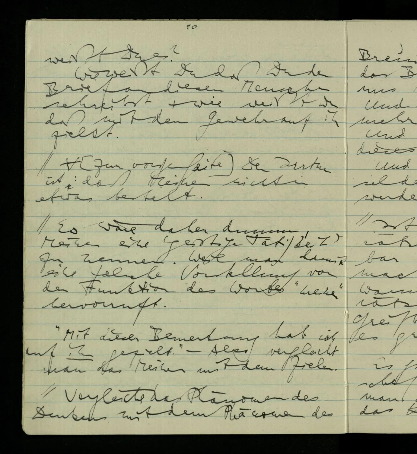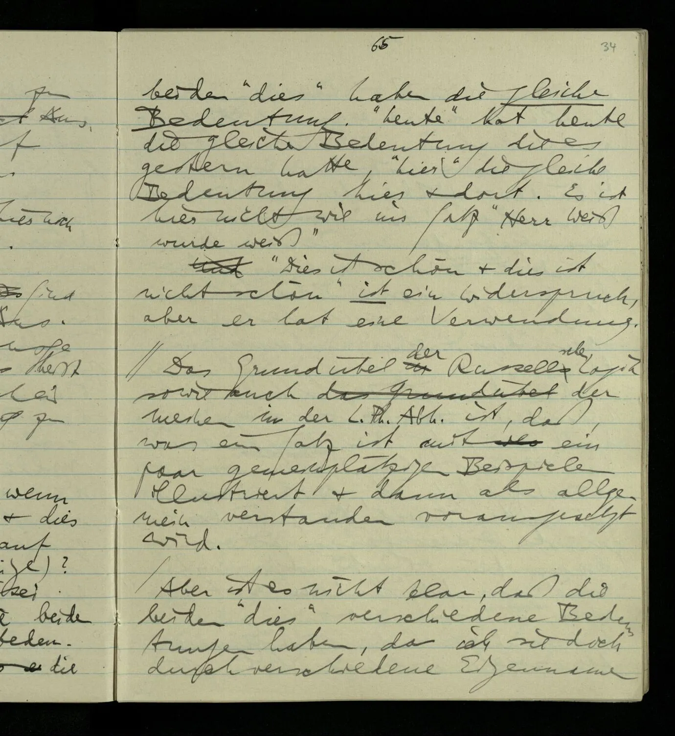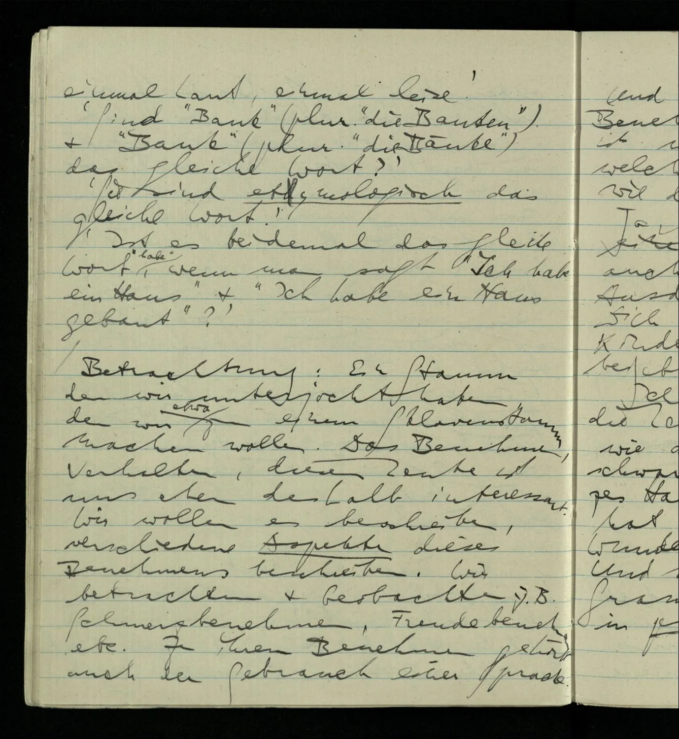 Niemand kümmert sich darum, ob etwas, noch darum, was in mir vorgeht, wenn man zu mir spricht. Man fragt auch für gewöhnlich nicht, wann ich den Satz verstanden habe, & ich merke auch nicht daß es damit einmal so, einmal so beschaffen ist. Außer, wenn ich einmal einen mißverstehe oder dergleichen. Und dann kann die Frage “Wann fingst Du an, ihn zu verstehen” Wichtigkeit erhalten. Aber es ist nun, als ob erst in so einem Falle überhaupt von wichtigen Erlebnissen des Verstehens die Rede wäre. Und könnte man sagen: nur das Erlebnis beim Wechsel der Bedeutungen sei von Wichtigkeit? – Oder auch so: nur das sei das wichtige Erlebnis, das einen gleichzeitigen Ausdruck hat?