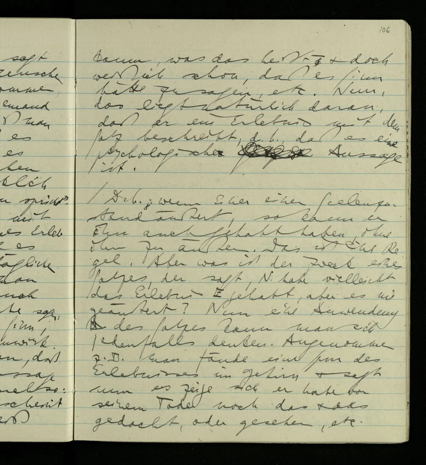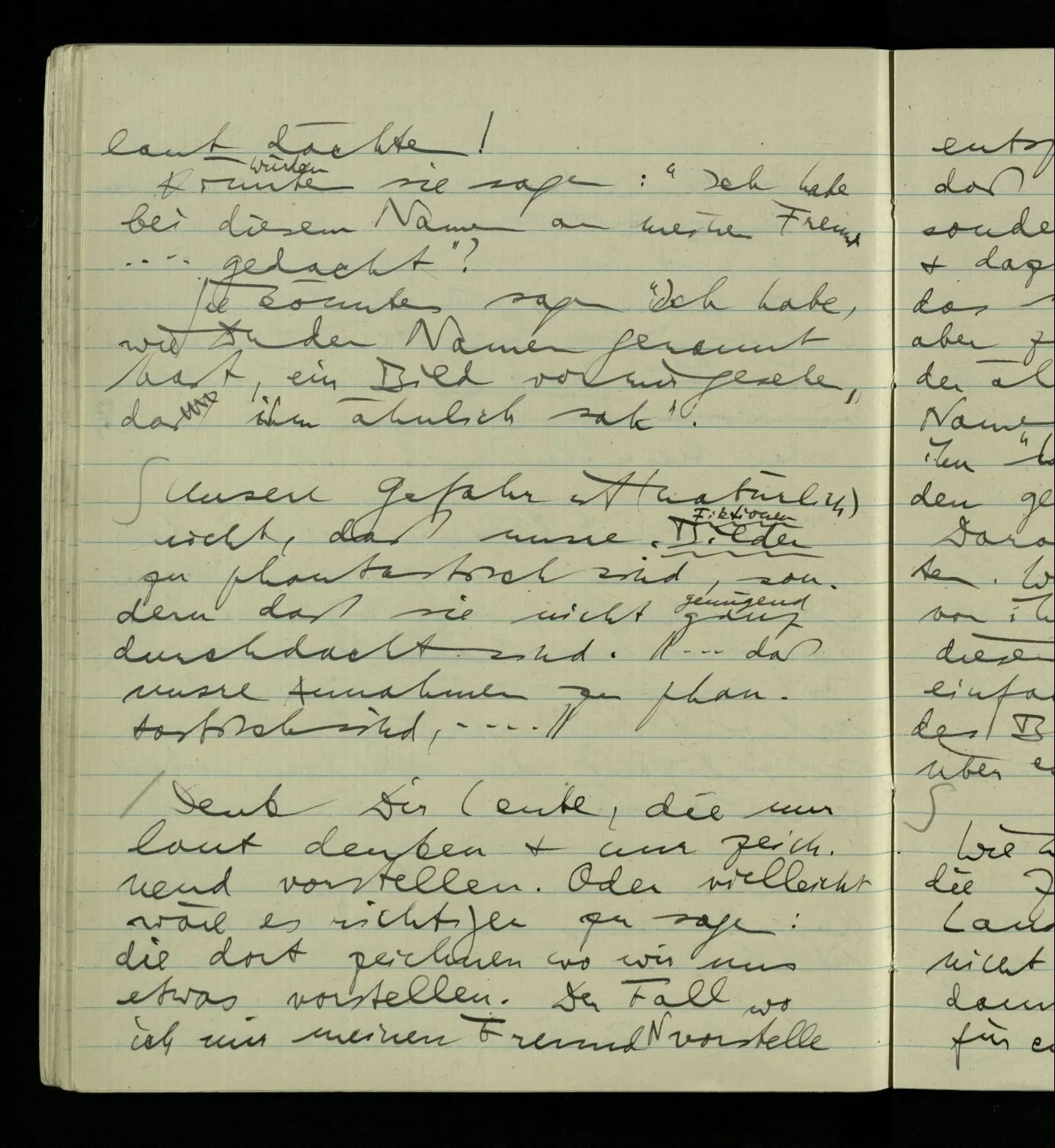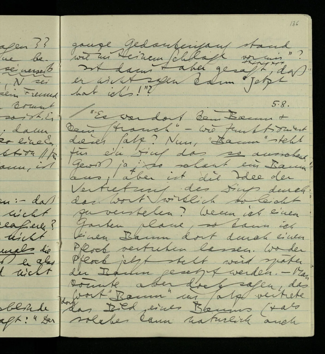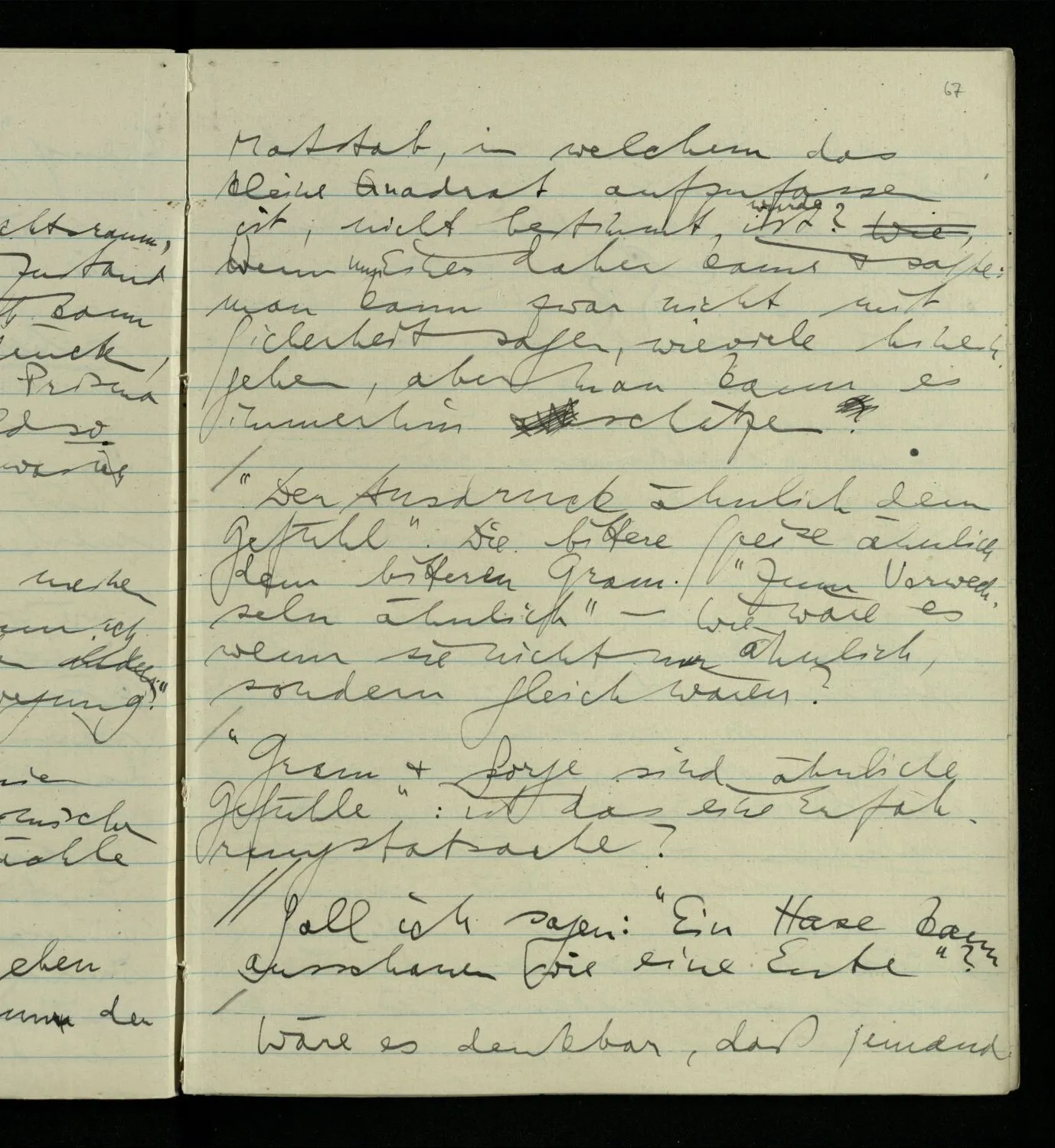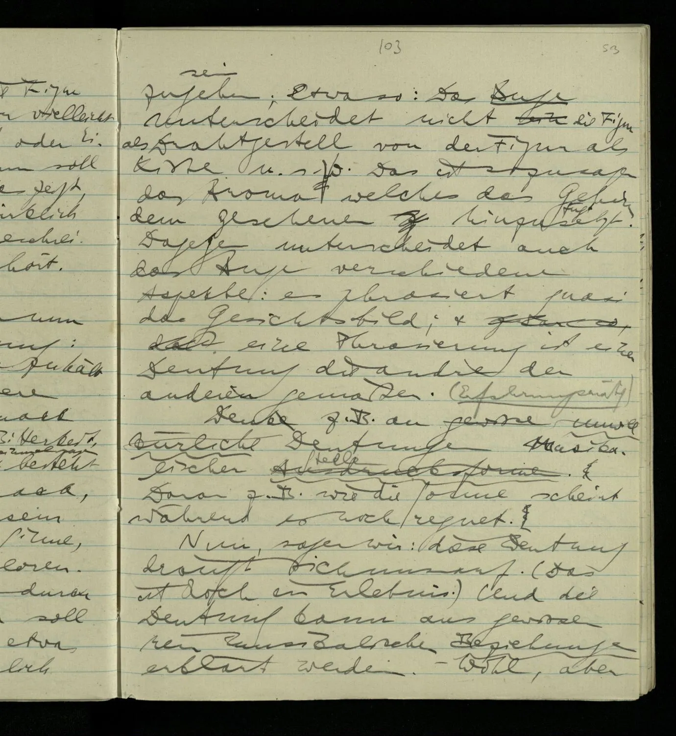 Niemand kümmert sich darum, ob etwas, noch darum, was in mir vorgeht, wenn man zu mir spricht. Man fragt auch für gewöhnlich nicht, wann ich den Satz verstanden habe, & ich merke auch nicht daß es damit einmal so, einmal so beschaffen ist. Außer, wenn ich einmal einen mißverstehe oder dergleichen. Und dann kann die Frage “Wann fingst Du an, ihn zu verstehen” Wichtigkeit erhalten. Aber es ist nun, als ob erst in so einem Falle überhaupt von wichtigen Erlebnissen des Verstehens die Rede wäre. Und könnte man sagen: nur das Erlebnis beim Wechsel der Bedeutungen sei von Wichtigkeit? – Oder auch so: nur das sei das wichtige Erlebnis, das einen gleichzeitigen Ausdruck hat?
